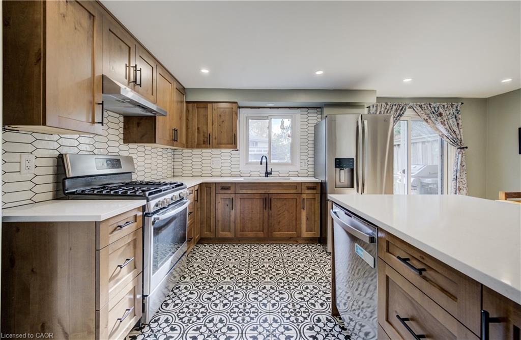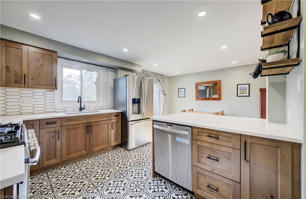 Welcome to 215 Preston Parkway, a move-in ready, updated townhouse in a convenient Cambridge location. This nicely finished 3-bedroom, 2-bath home offers over 1,100 sq ft of stylish living space. Enjoy a beautifully renovated kitchen (2023) featuring warm wood cabinetry, quartz counters, modern backsplash, and stainless steel appliances. The main level also showcases refinished hardwood floors, a spacious living room with large front-facing windows, and a dining area with walkout to a private deck and fenced backyard. Upstairs, all bedrooms are bright and generously sized. The home includes an updated main bathroom, bonus powder room, and a finished basement with extra storage. Located close to schools, parks, shopping, and Highway 401 for commuters.