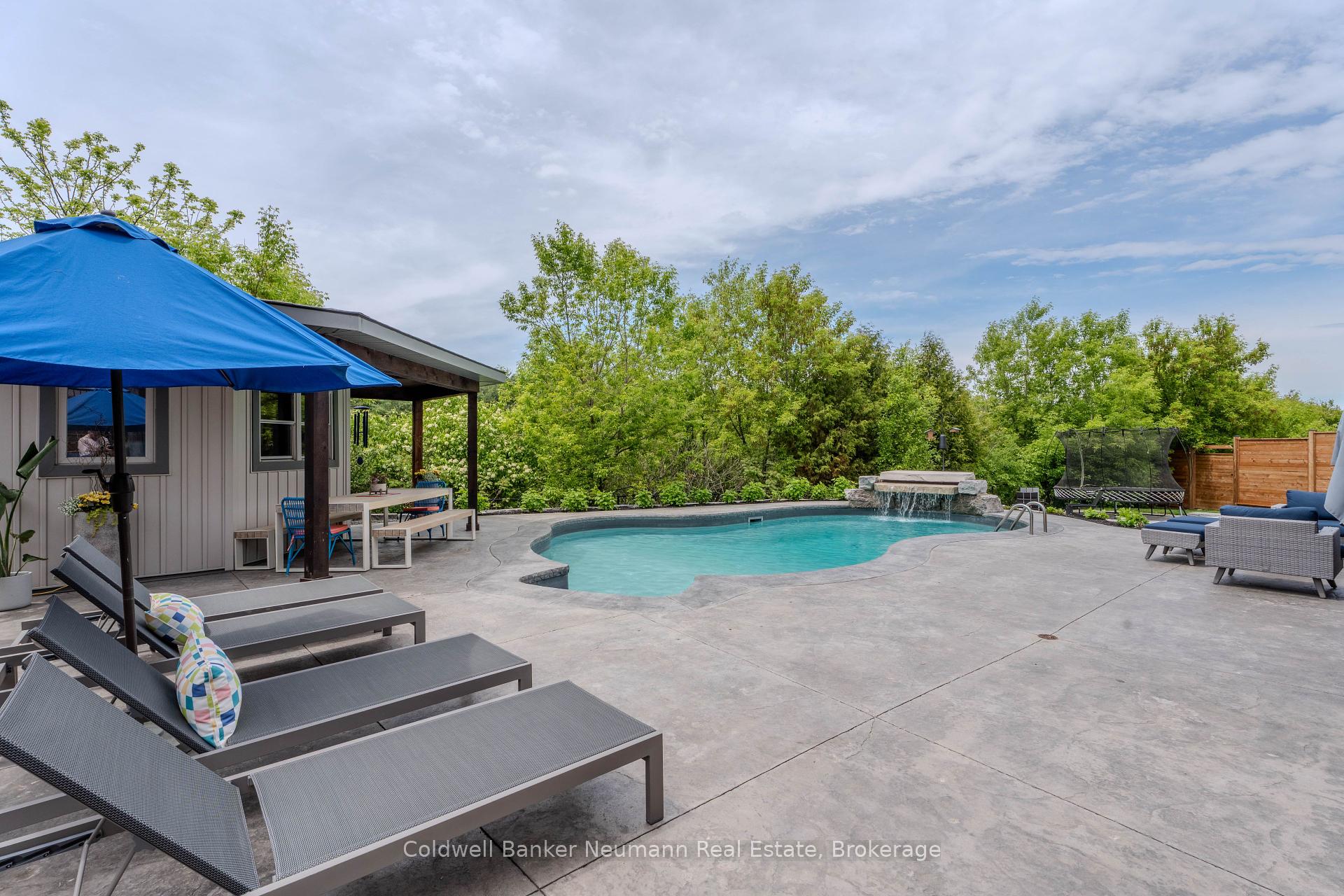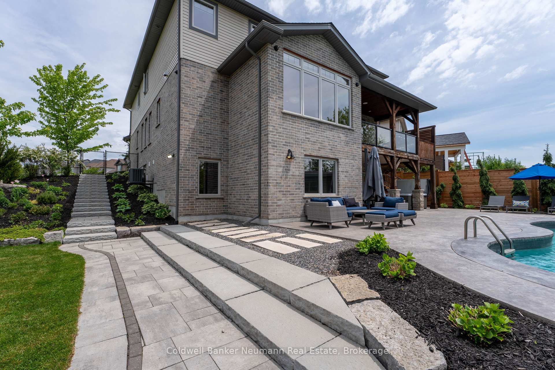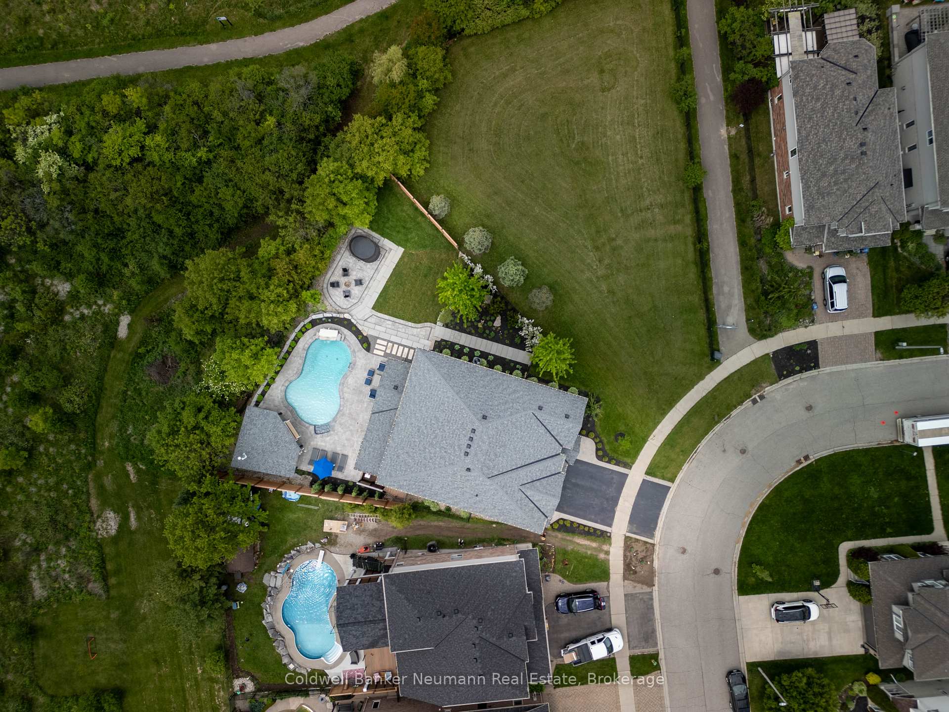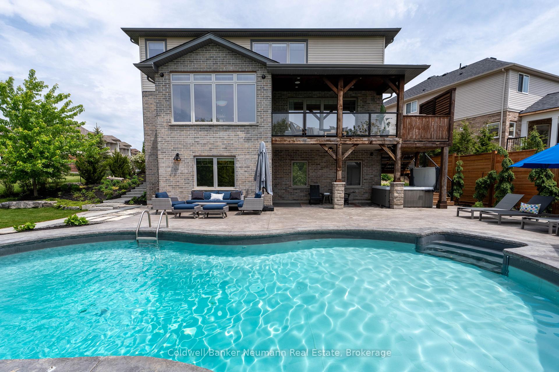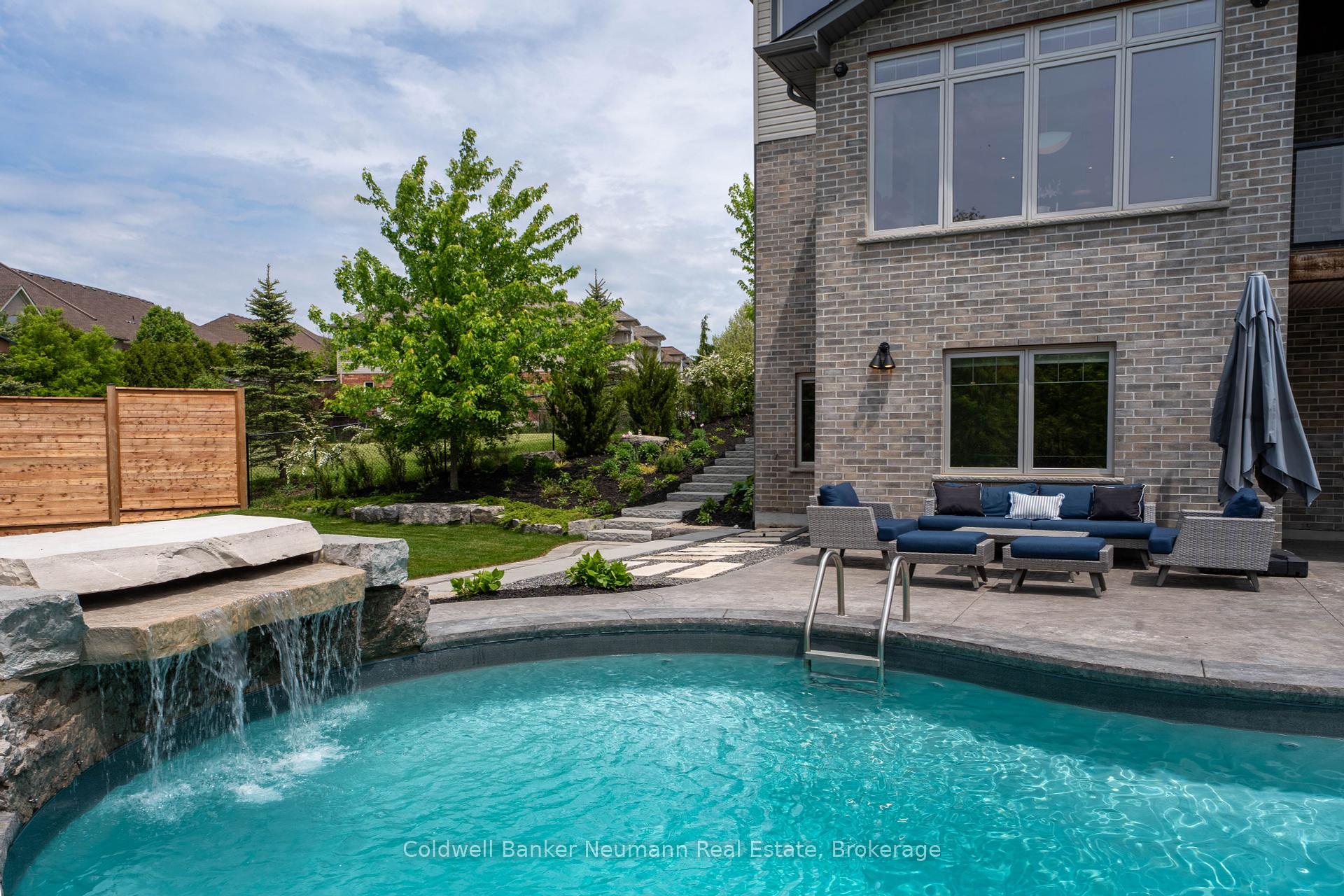 Situated on an expansive pie-shaped lot surrounded by nature, this stunning residence is thoughtfully crafted with every detail in mind. This isnt a home; its a designer resort perfect for single or multi-generational families who want to live a full life of activities and luxury. The backyard oasis features a luxurious free-form saltwater pool complete with a natural jump rock and cascading waterfall, an extensive stamped concrete patio, a grand timber-framed cabana, and a 6-person hot tub, all surrounded by professionally landscaped gardens. A stone staircase leads to a sunken interlock patio, creating multiple spaces for entertaining, alongside an activity lawn for games and sports. The bright, modern kitchen offers west-facing sunset views from the island, a functional and stylish butlers pantry, top-of-the-line appliances, and flows to the living room and balcony, creating a warm atmosphere to spend hours with your family. High ceilings and oversized windows maximize the space and light, delivering peaceful comfort as you enjoy each room. The primary bedroom feels like a five-star hotel suite with a sitting area, forest views, and an ensuite of serenity. The fully finished lower level provides secondary accommodations ideal for your family or guests, and a large space offering versatility for additional living space, or a gym/games room. With a theatre room, walkout to the stunning backyard and an additional large bedroom with ensuite, the lower level is an entertainment space friends and family will want to enjoy. Beyond your backyard is an extensive trail network for hiking, dog walking, cross country skiing or world-class mountain biking, with the entrance directly beside your home. Downtown Guelph is a 15 minute ride via bike trail, with Riverside Park and Guelph Lake a short walk away. A showcase of luxury, nature and design, this calibre of home promises to impress at every turn and is a rare turnkey offering in the Guelph luxury market.