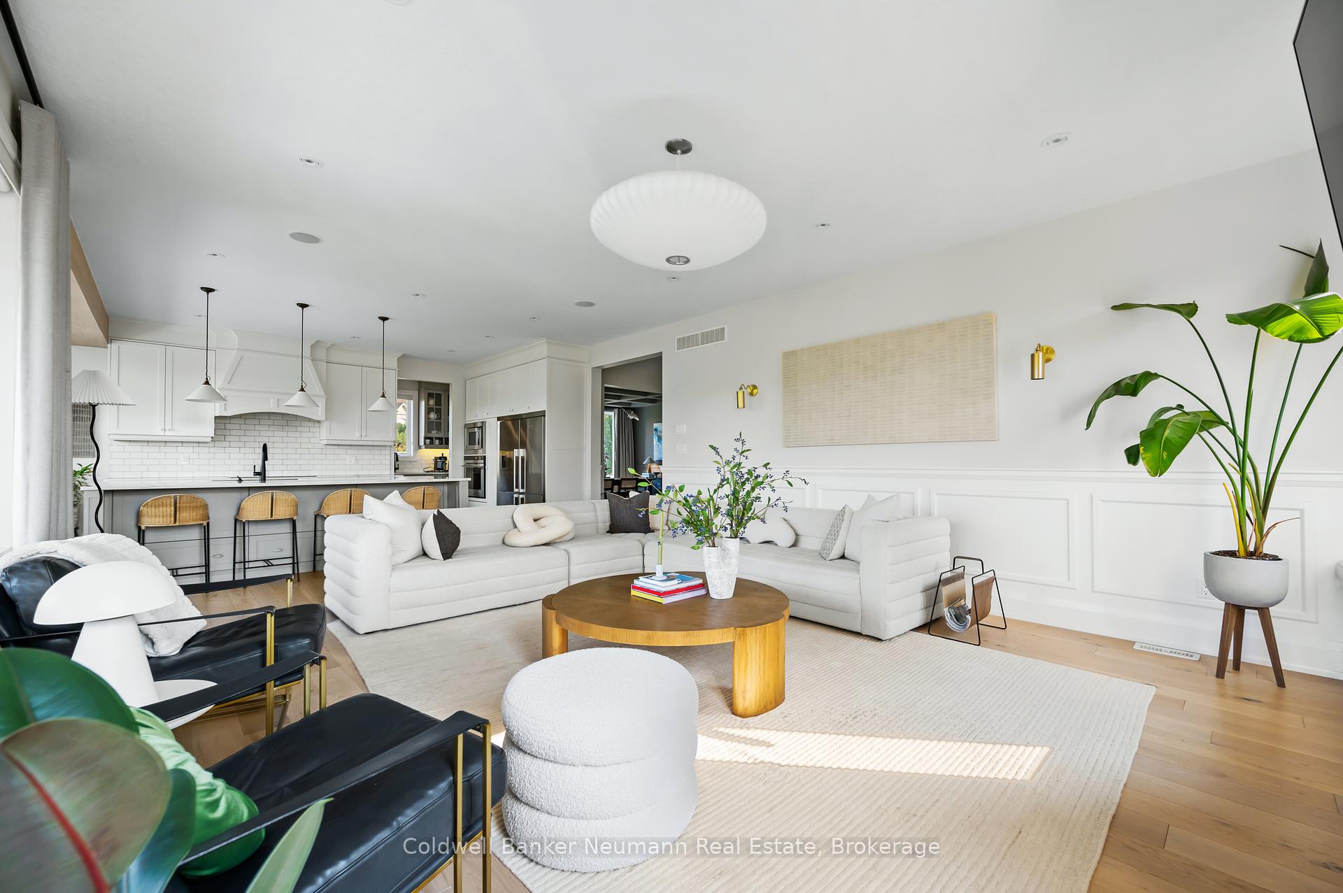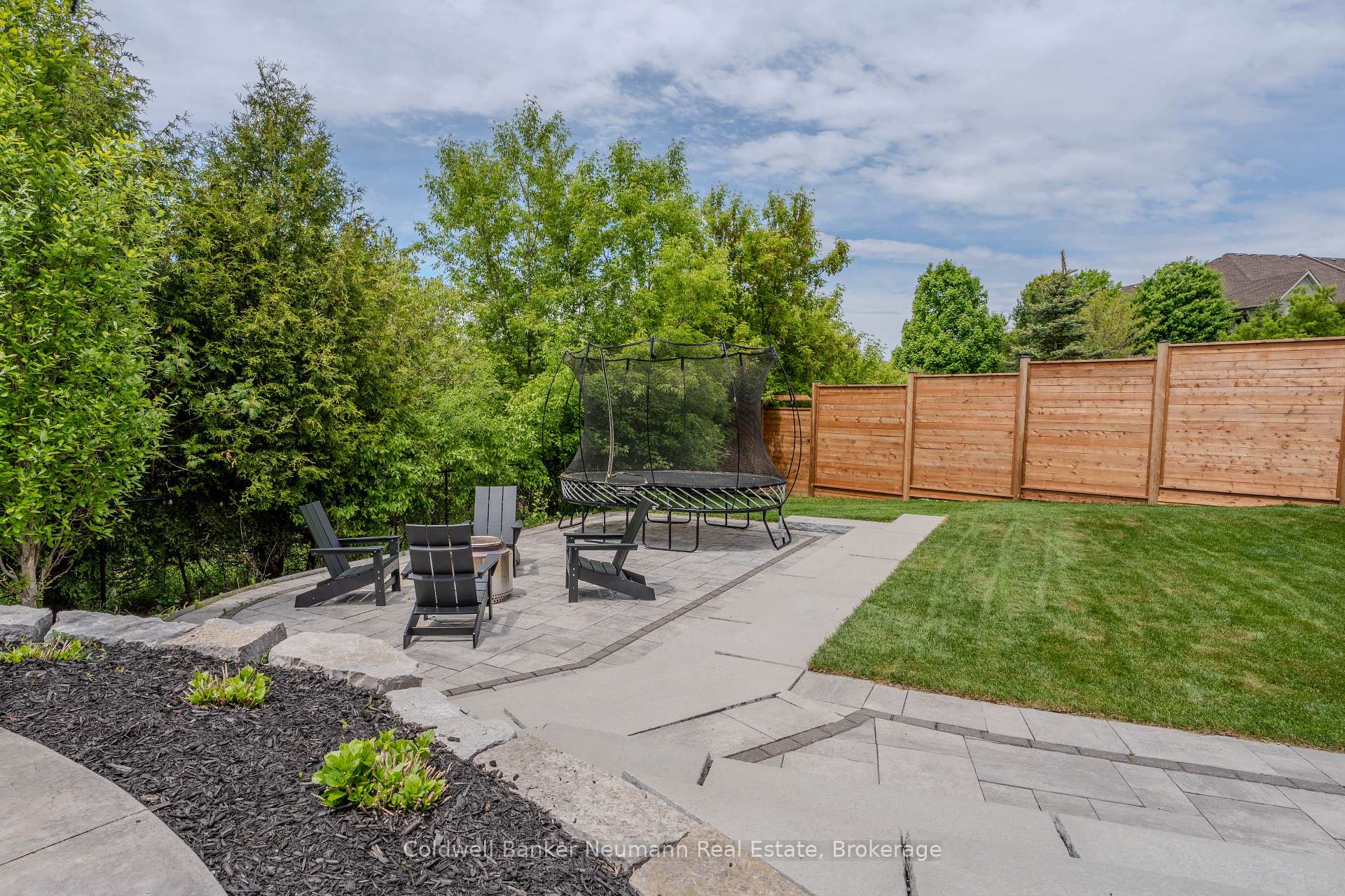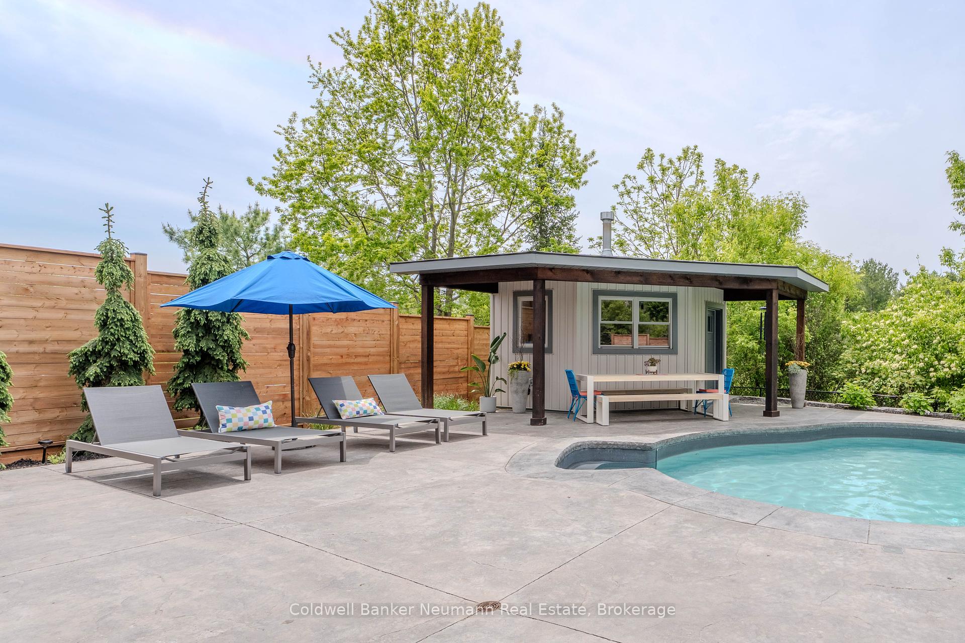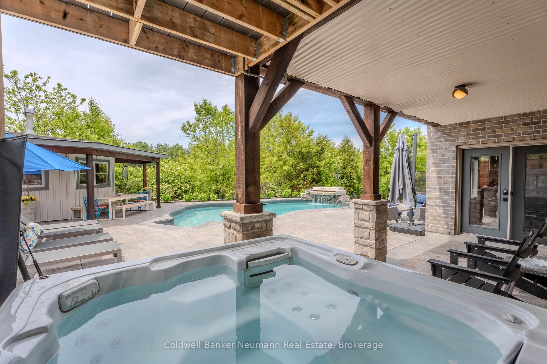 Situated on an expansive pie-shaped lot surrounded by nature, this stunning residence is thoughtfully crafted with every detail in mind. This isnt a home; its a designer resort perfect for single or multi-generational families who want to live a full life of activities and luxury. The backyard oasis features a luxurious free-form saltwater pool complete with a natural jump rock and cascading waterfall, an extensive stamped concrete patio, a grand timber-framed cabana, and a 6-person hot tub, all surrounded by professionally landscaped gardens. A stone staircase leads to a sunken interlock patio, creating multiple spaces for entertaining, alongside an activity lawn for games and sports. The bright, modern kitchen offers west-facing sunset views from the island, a functional and stylish butlers pantry, top-of-the-line appliances, and flows to the living room and balcony, creating a warm atmosphere to spend hours with your family. High ceilings and oversized windows maximize the space and light, delivering peaceful comfort as you enjoy each room. The primary bedroom feels like a five-star hotel suite with a sitting area, forest views, and an ensuite of serenity. The fully finished lower level provides secondary accommodations ideal for your family or guests, and a large space offering versatility for additional living space, or a gym/games room. With a theatre room, walkout to the stunning backyard and an additional large bedroom with ensuite, the lower level is an entertainment space friends and family will want to enjoy. Beyond your backyard is an extensive trail network for hiking, dog walking, cross country skiing or world-class mountain biking, with the entrance directly beside your home. Downtown Guelph is a 15 minute ride via bike trail, with Riverside Park and Guelph Lake a short walk away. A showcase of luxury, nature and design, this calibre of home promises to impress at every turn and is a rare turnkey offering in the Guelph luxury market.