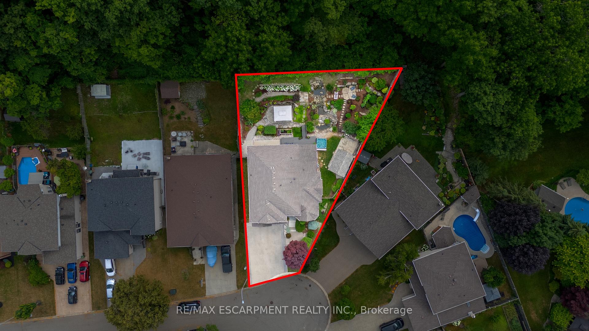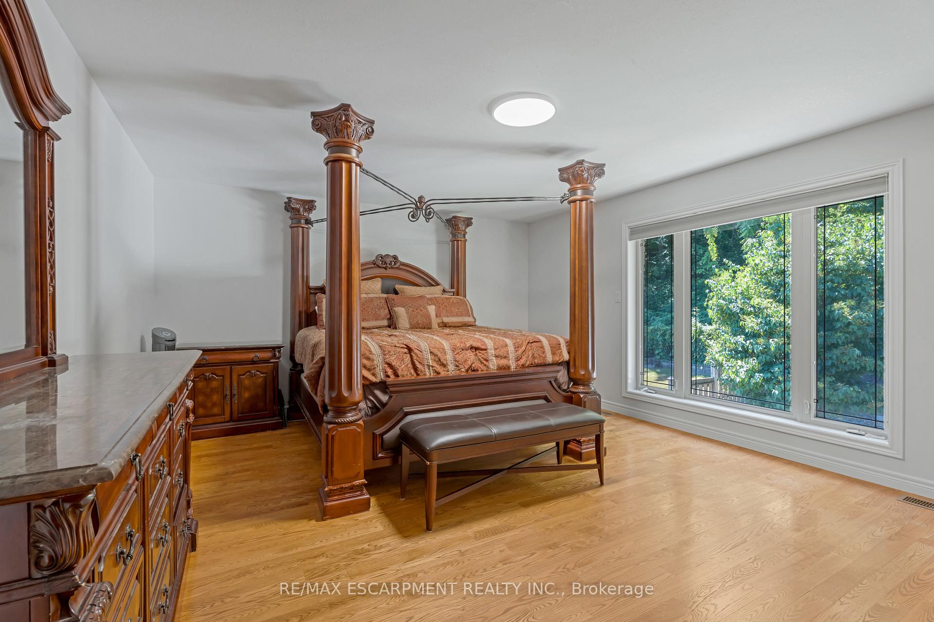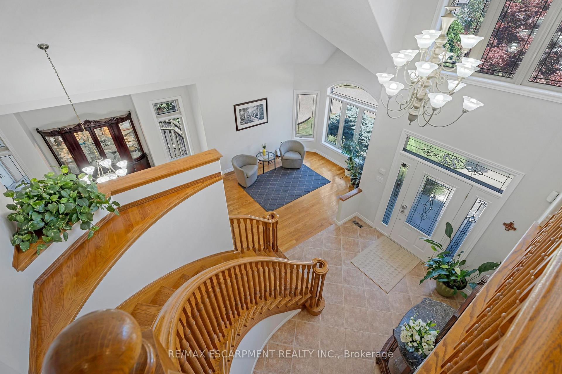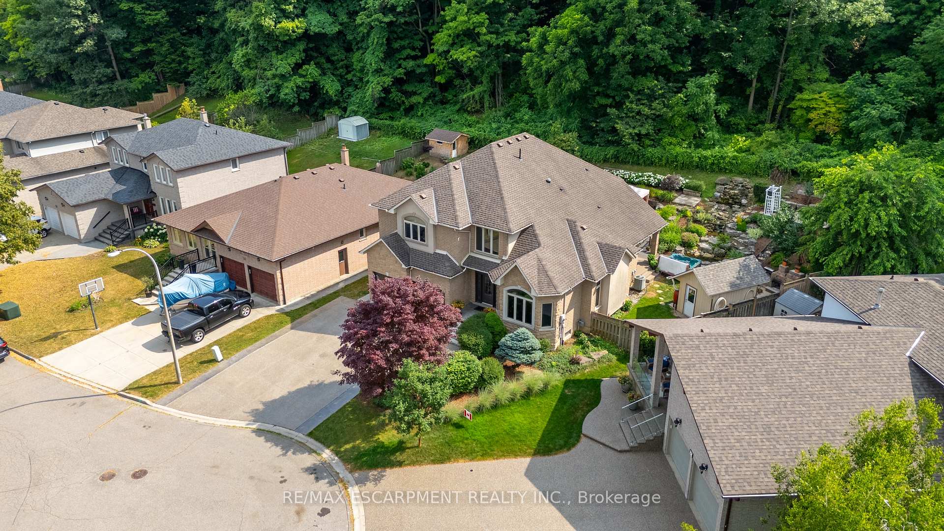 Custom built in 2003 and nestled beneath the Niagara Escarpment on a quiet crescent, this meticulously maintained 4+1 bedroom home offers breathtaking views and a tranquil, cottage-like setting. Soaring ceilings, oversized windows, and rounded corners add elegance and natural light throughout. The freshly painted interior features new kitchen appliances with gas cooktop option, all under a 5-year warranty. The spacious primary bedroom features a two-sided gas fireplace shared with the spa like ensuite creating the ultimate retreat. Walk-in closets in every bedroom, central vac, RO water at all sinks, and two fruit cellars enhance everyday living. The finished basement with 9ft ceilings, separate entrance, and roughed-in kitchen offers in-law or income potential. Step outside to a pie-shaped private lot backing onto lush green space with a multi-tiered waterfall and hot tuba true backyard oasis. The oversized exposed aggregate driveway fits 6 cars. Move-in ready and surrounded by nature, this home combines comfort, luxury, and lifestyle in one exceptional package.