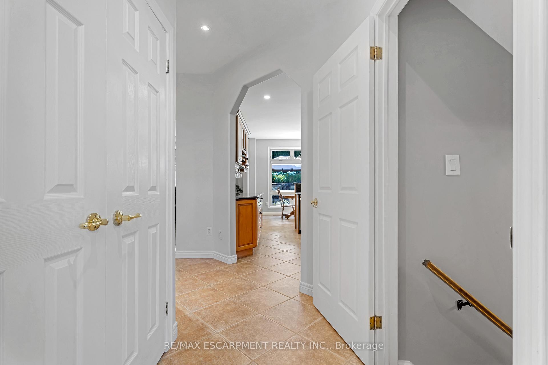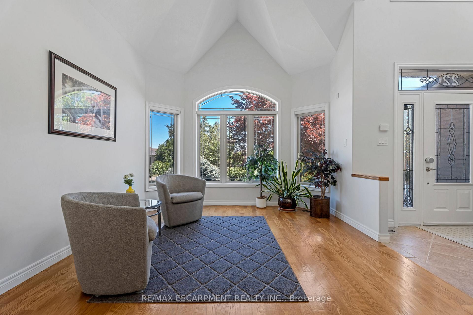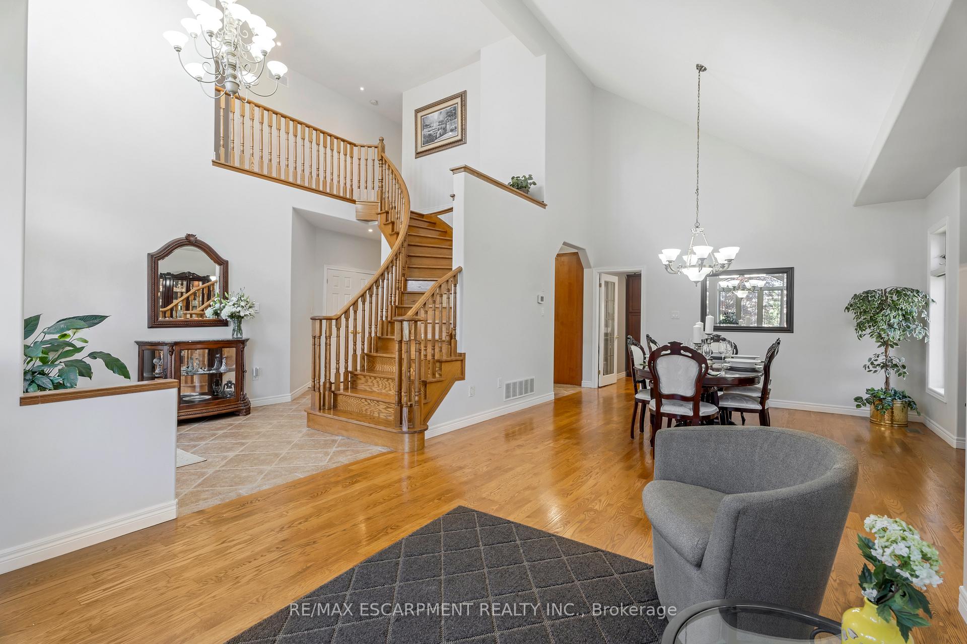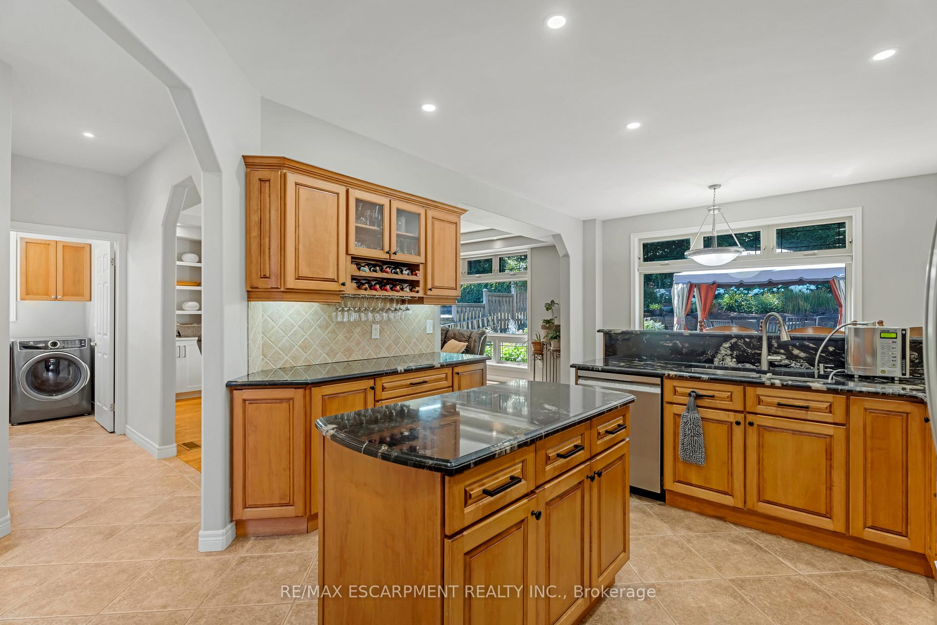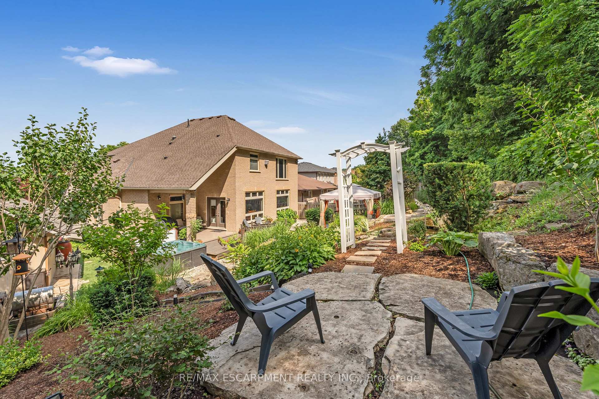 Custom built in 2003 and nestled beneath the Niagara Escarpment on a quiet crescent, this meticulously maintained 4+1 bedroom home offers breathtaking views and a tranquil, cottage-like setting. Soaring ceilings, oversized windows, and rounded corners add elegance and natural light throughout. The freshly painted interior features new kitchen appliances with gas cooktop option, all under a 5-year warranty. The spacious primary bedroom features a two-sided gas fireplace shared with the spa like ensuite creating the ultimate retreat. Walk-in closets in every bedroom, central vac, RO water at all sinks, and two fruit cellars enhance everyday living. The finished basement with 9ft ceilings, separate entrance, and roughed-in kitchen offers in-law or income potential. Step outside to a pie-shaped private lot backing onto lush green space with a multi-tiered waterfall and hot tuba true backyard oasis. The oversized exposed aggregate driveway fits 6 cars. Move-in ready and surrounded by nature, this home combines comfort, luxury, and lifestyle in one exceptional package.