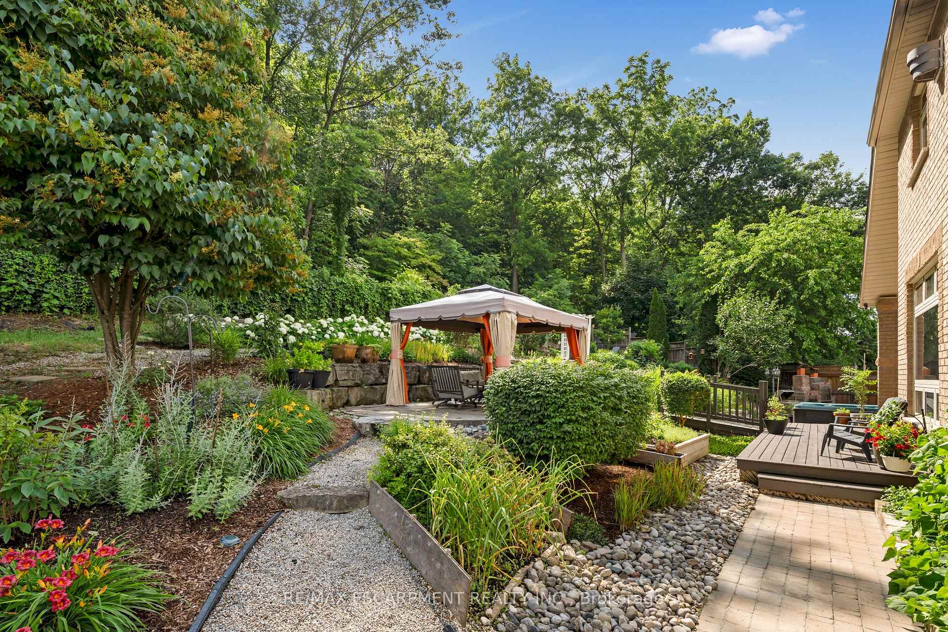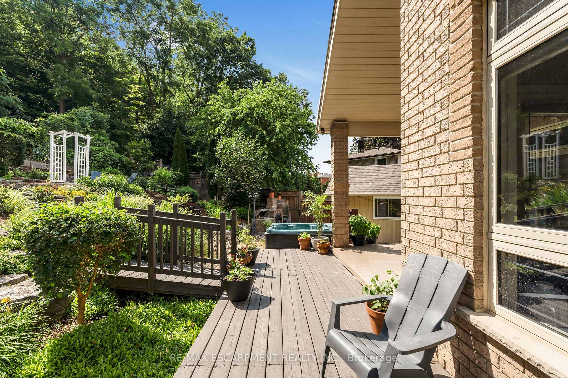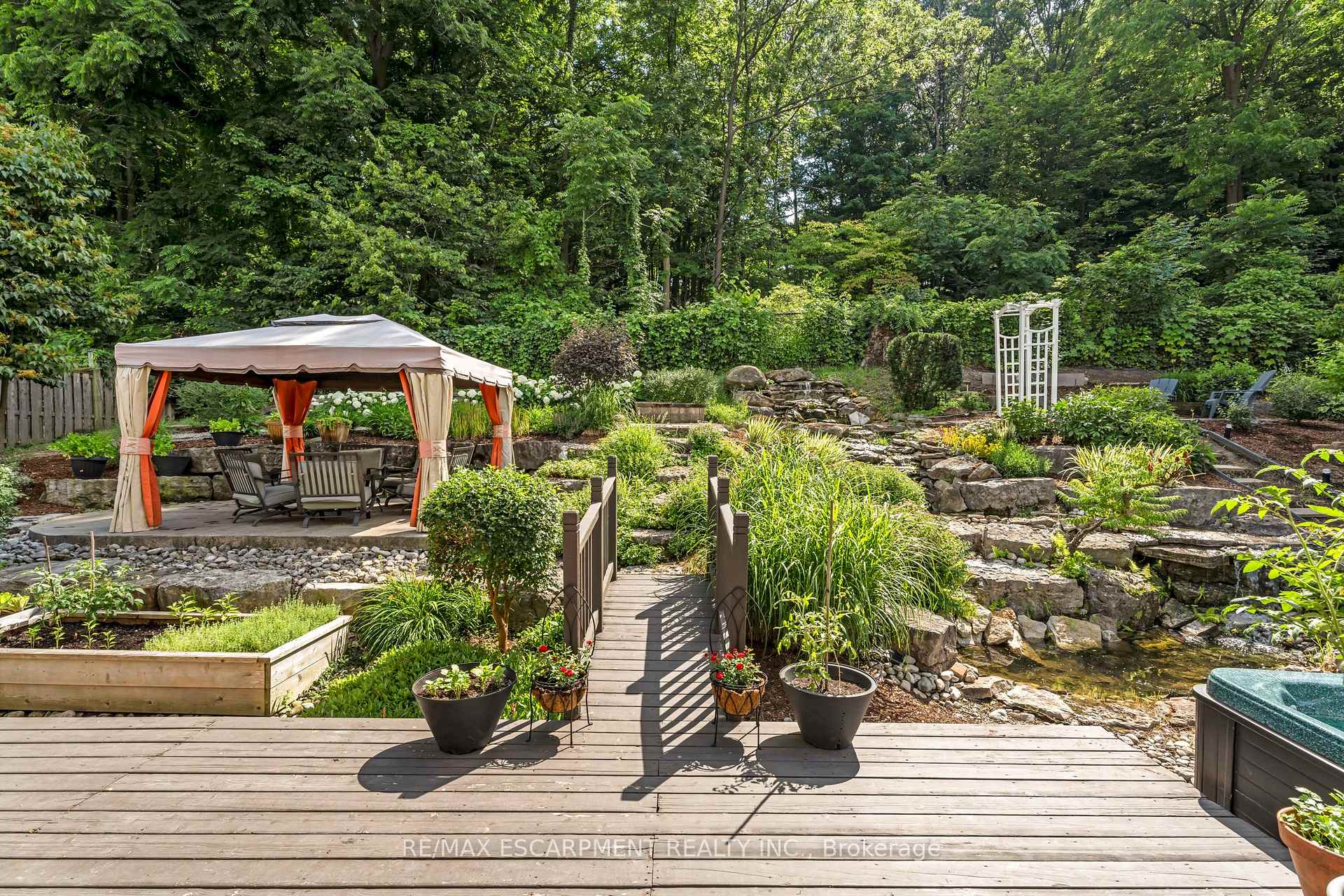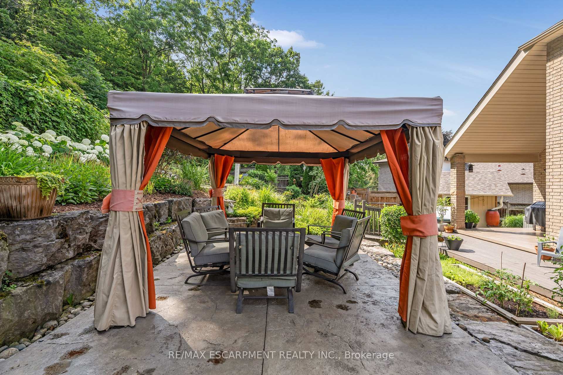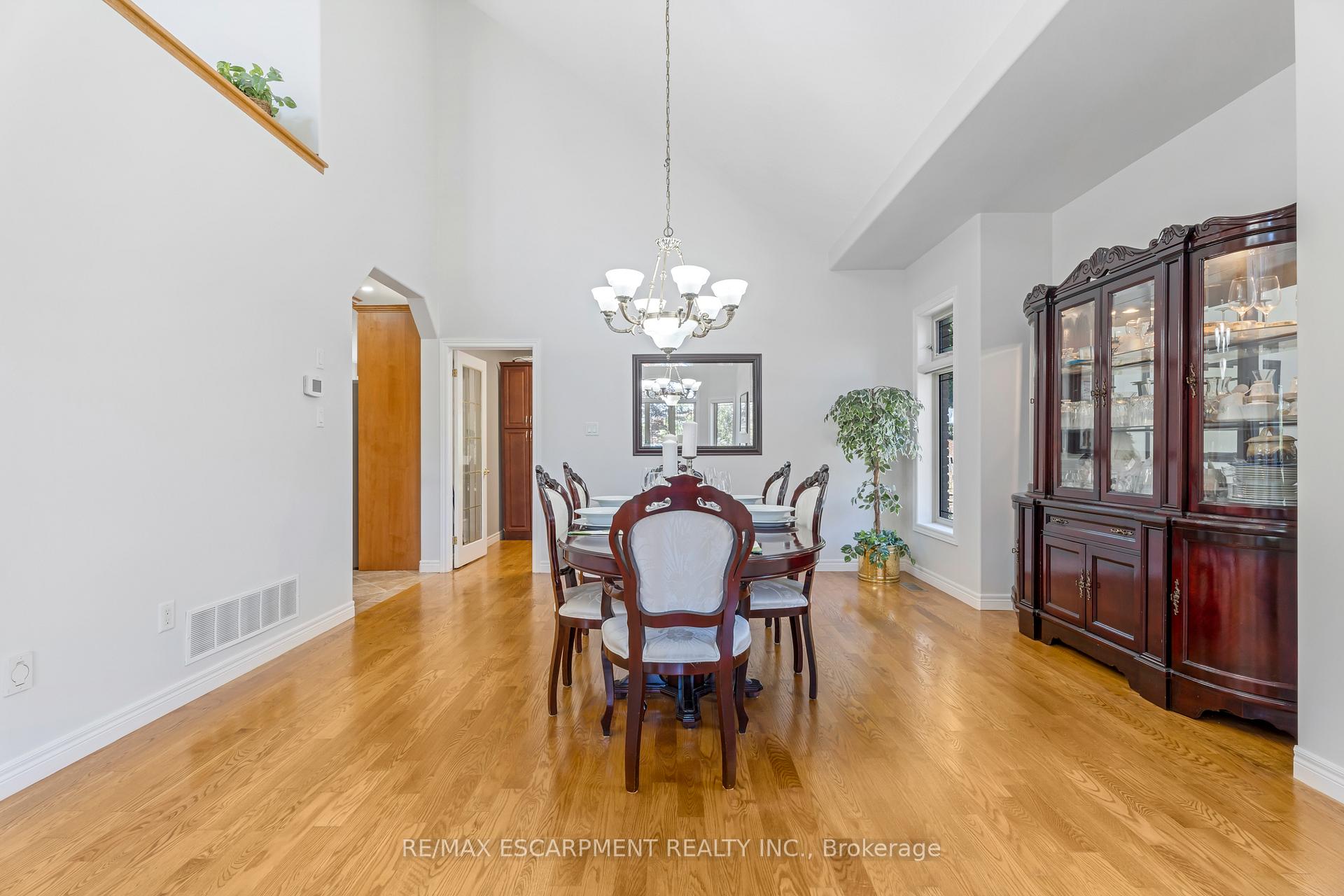 Custom built in 2003 and nestled beneath the Niagara Escarpment on a quiet crescent, this meticulously maintained 4+1 bedroom home offers breathtaking views and a tranquil, cottage-like setting. Soaring ceilings, oversized windows, and rounded corners add elegance and natural light throughout. The freshly painted interior features new kitchen appliances with gas cooktop option, all under a 5-year warranty. The spacious primary bedroom features a two-sided gas fireplace shared with the spa like ensuite creating the ultimate retreat. Walk-in closets in every bedroom, central vac, RO water at all sinks, and two fruit cellars enhance everyday living. The finished basement with 9ft ceilings, separate entrance, and roughed-in kitchen offers in-law or income potential. Step outside to a pie-shaped private lot backing onto lush green space with a multi-tiered waterfall and hot tuba true backyard oasis. The oversized exposed aggregate driveway fits 6 cars. Move-in ready and surrounded by nature, this home combines comfort, luxury, and lifestyle in one exceptional package.