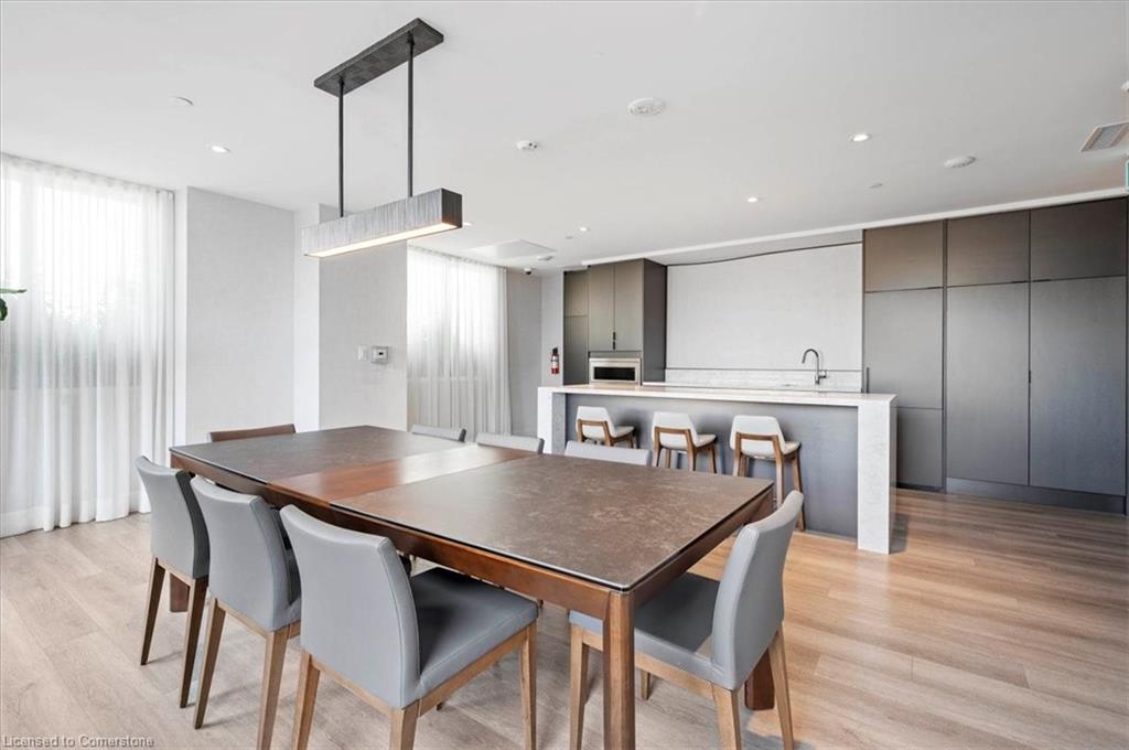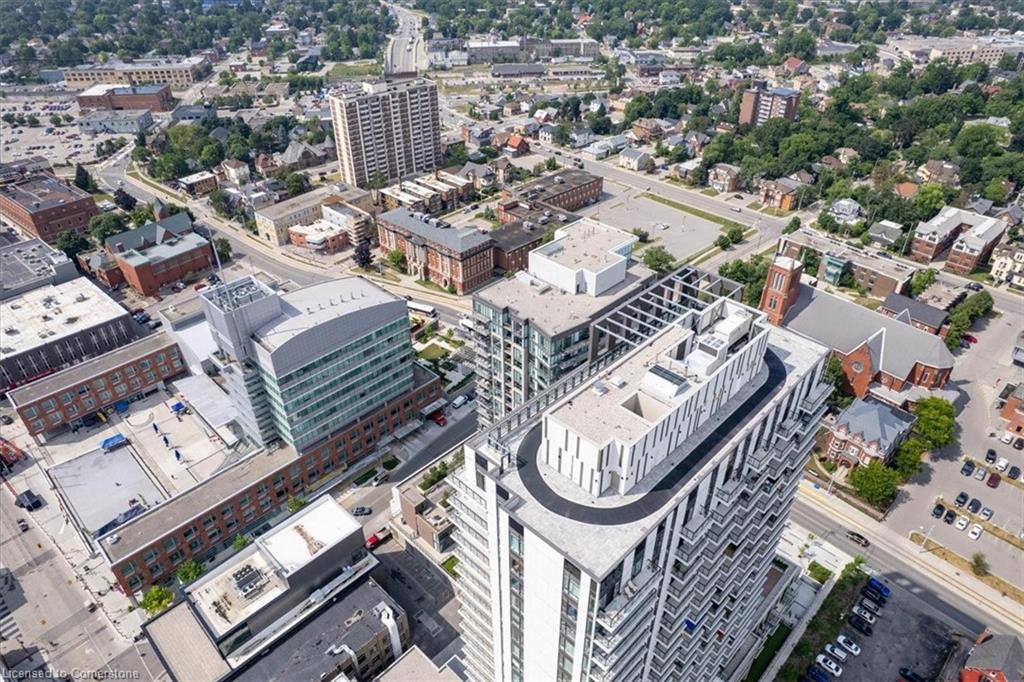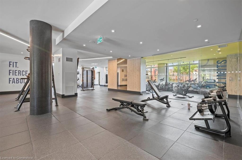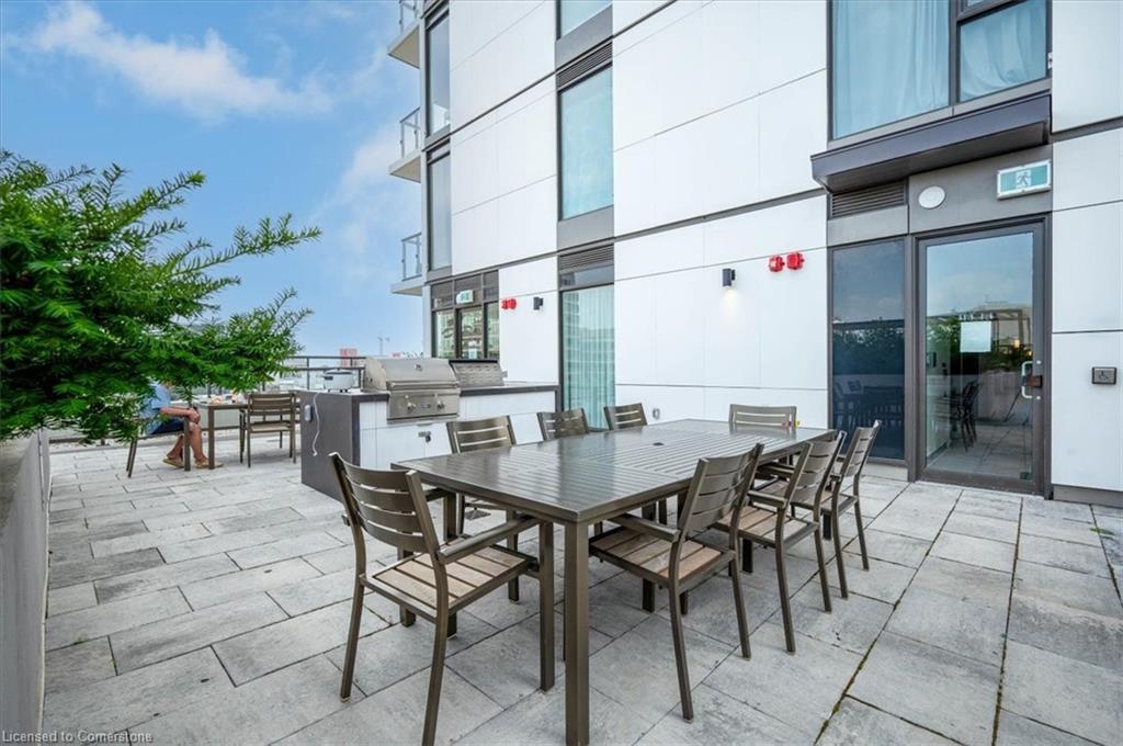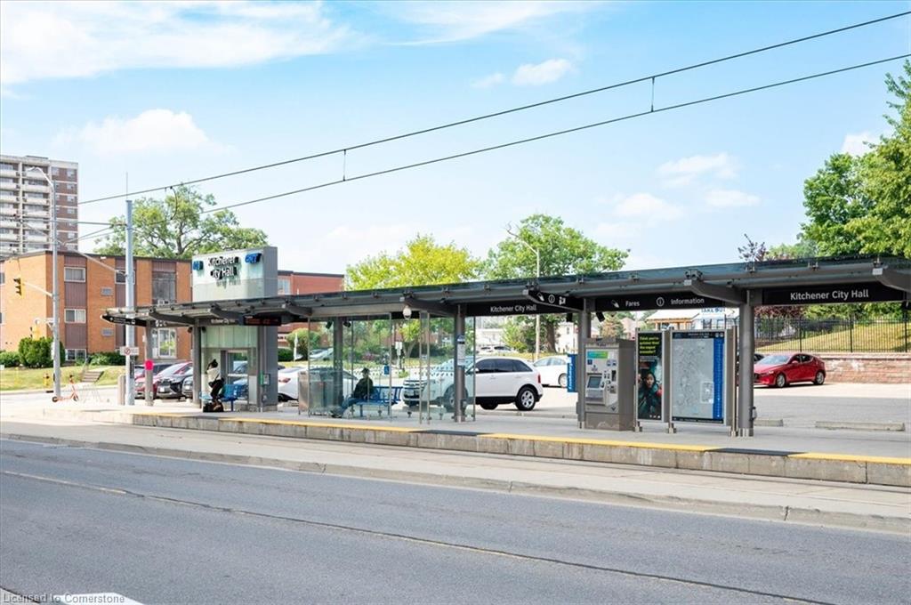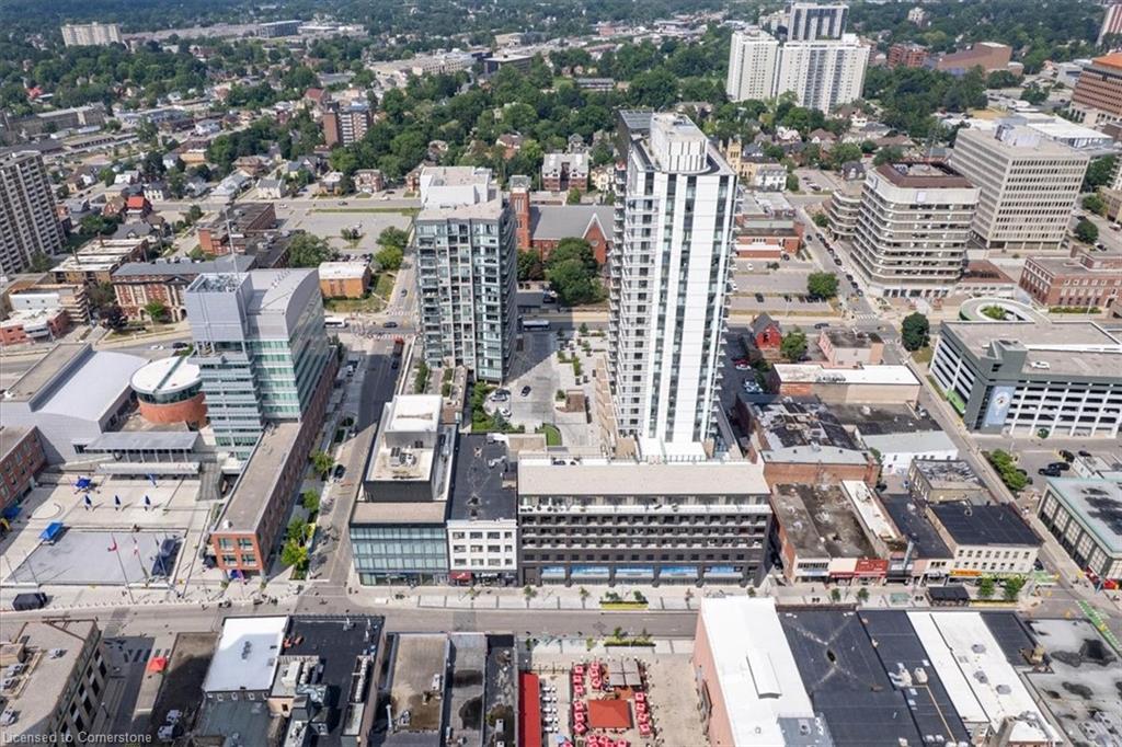 One of the most successfully integrated condo buildings in the downtown core, reconstructing the John Forsyth Shirt Company, Duke Street level façade & capturing the historic landmark while moving the city forward with urban renewal. The building amenities are impressive; a clean and modern lobby with a full time concierge service offers comfortable sitting spaces and opens up to the ground level state of the art fitness centre, complete with heavy bags and exercise bikes and surrounded by windows connecting you to the outdoors. Truly unique is your ability to take your fitness journey outside to the 25th floor, roof top running track while you enjoy the stunning 360 degree views. When its time to relax or entertain larger groups, take advantage of the 5th floor, furnished patio and party room, overlooking the Duke street forecourt. The building also includes car wash station, dog wash station, and artificial turf dog walk. This one bedroom unit layout maximizes utility of the space and achieves a grand feel with the tall ceilings, open concept, and large windows. The eat in kitchen with centre island, contemporary cabinetry, stainless steel appliances, and quartz countertops is open to the versatile dinette and living room space, which sits parallel to the bedroom and both overlook the 122 sq ft private patio; bringing the total size of the unit to 769 sq ft. The interior floor is finished in luxury vinyl plank and the patio with large pavers. The unit is located to offer a great view of the rich DTK architectural facades and Bobby O’Brien’s patio with the live entertainment. Short walking distance to Victoria park, charming cafés, popular restaurants, boutique shops, and LRT. Downtown Kitchener is changing to become a popular urban centre and now is the time to take advantage. Don’t miss out!