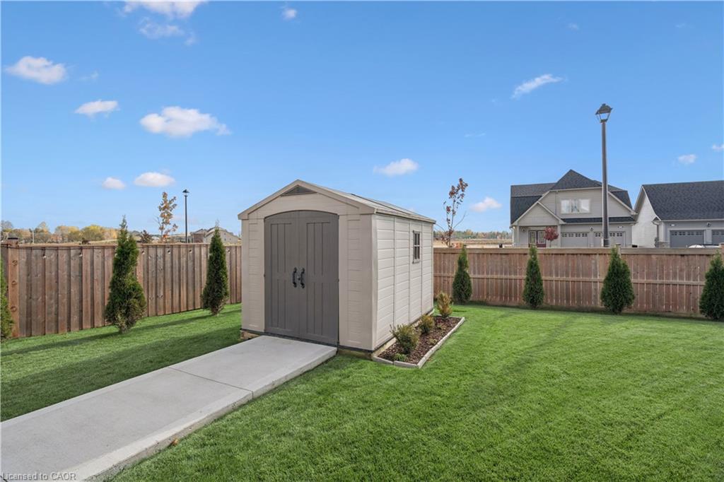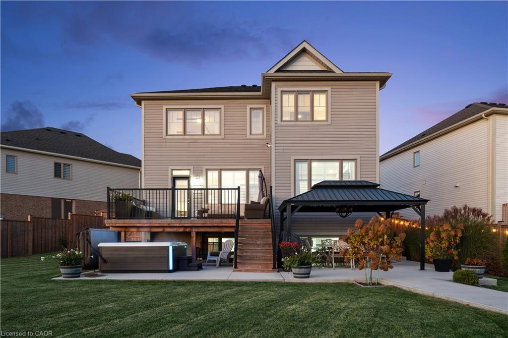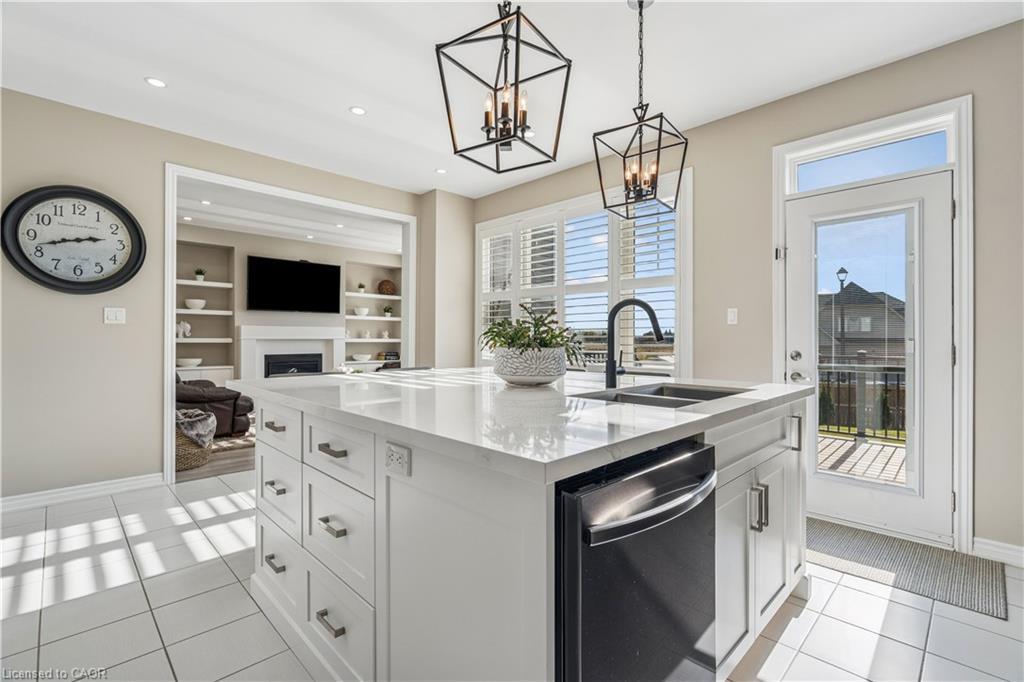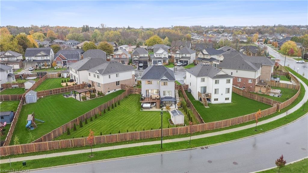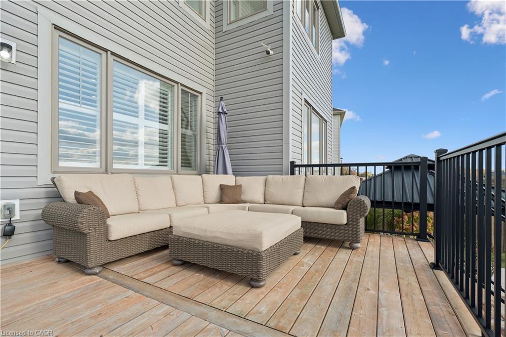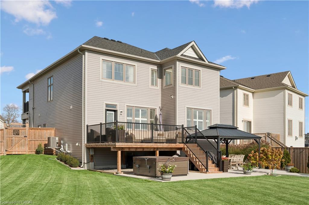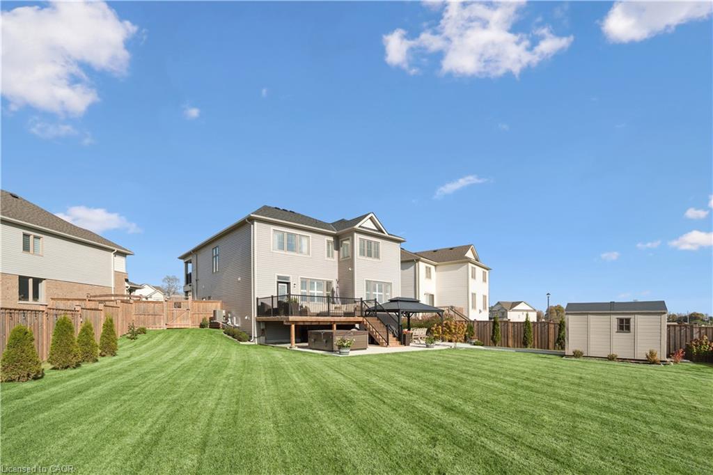 4 BEDROOMS! 4 BATHROOMS! PIE-SHAPED LOT! FINISHED BASEMENT! Welcome to 220 Harpin Way E — a beautifully appointed 4-bed, 4-bath detached home on a premium pie-shaped lot in the sought-after Storybrook subdivision of Fergus. Built in 2021 and designed with family comfort in mind, this home blends style and function across three spacious levels. Inside, 9-ft ceilings, wide-plank flooring, and California shutters set the tone. The gourmet kitchen features a large quartz island, gas stove, pot-filler, extended cabinetry, and walkout to a deck with gas BBQ hookup — perfect for entertaining. The living room includes a cozy gas fireplace and custom built-ins, complemented by a formal dining room and practical mudroom with inside garage entry. Upstairs, the luxurious primary suite boasts a walk-in closet and spa-like ensuite with a soaker tub and glass shower. Three additional spacious bedrooms, a 4-pc bath, and laundry room round out the second floor — including one room with its own private balcony, ideal for a home office. The finished basement adds a rec room with fireplace, bonus room for an office or gym, plus storage. Mechanical systems are near-new, offering peace of mind. Outside, enjoy a fully fenced, landscaped yard with room to roam — ideal for kids, pets, or future pool plans. The double garage and 4-car driveway make daily life easy. Located on a quiet cul-de-sac, you’re close to parks, trails, the Grand River, brand-new Grand River Public School, and Groves Hospital. It’s everything a growing family needs — in one move-in ready home.