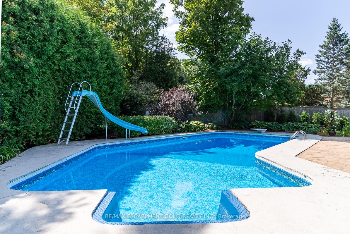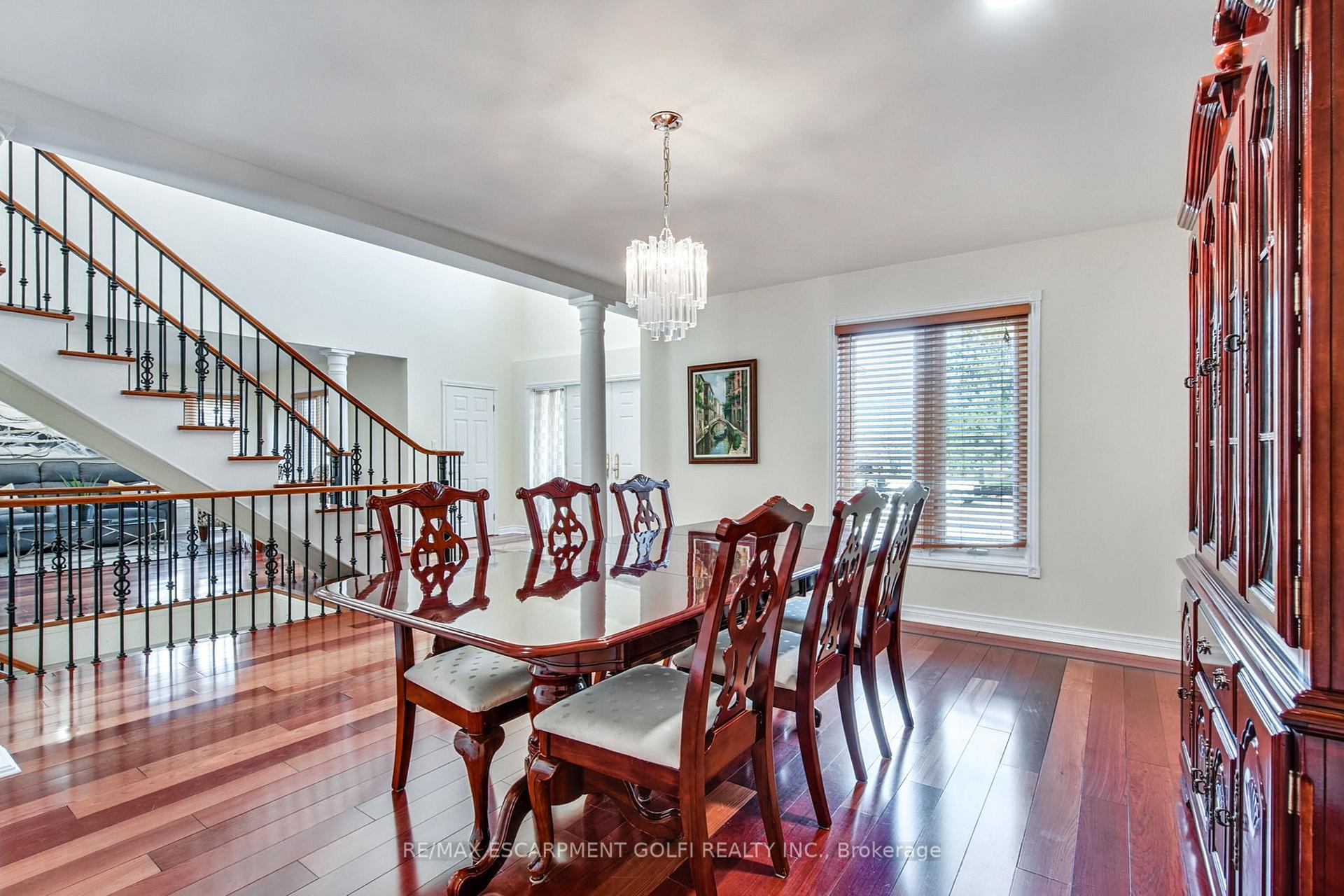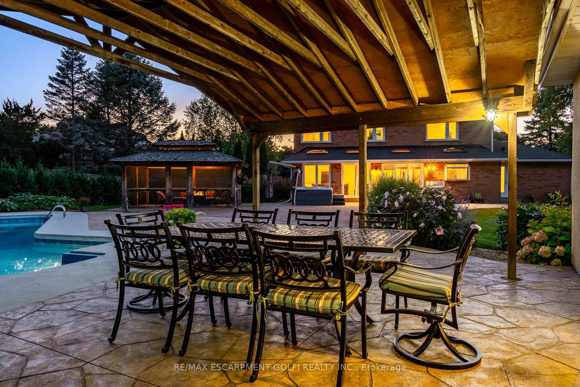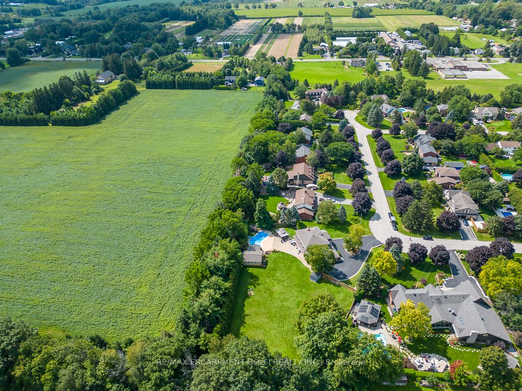 Situated on a quiet, beautifully manicured 0.99-acre lot in one of the most exclusive enclaves in the area, this impressive two-storey brick estate immediately captures attention with its elegant curb appeal, circular driveway, and landscaped centrepiece. This home has it all, offering four bedrooms, four bathrooms and over 4000 square feet of living space. No rear neighbours, an inground pool, hot tub, workshop & gazebo with a natural gas fireplace outside. The backyard is flat, unobstructed and surrounded by trees. Plenty of useable space for entertaining, family games/events and a huge ice rink. Breathtaking foyer illuminated by cascades of natural light and a stunning centre staircase. Exquisite Brazilian hardwood flooring flows seamlessly through the formal dining and entertainment spaces, where a natural gas fireplace adds a warm, ambiance ideal for both grand entertaining and intimate gatherings. The custom kitchen is a masterpiece of craftsmanship, featuring cherry maple oak soft-close cabinetry, under-cabinet lighting, heated floors, granite countertops, skylights, and a toe-kick central vacuum for effortless living. The step-down living room features large windows overlooking the private back yard, pot lights through-out and gleaming hardwood floors. The expansive primary suite impresses with two walk-in closets, custom built-in wall-to wall cabinetry, and an elegant ensuite featuring dual vanities and a walk-in shower. The fully finished basement features a spacious recreation room, a bathroom, a private office, an oversized storage room, and a separate walk-up staircase leading directly to the garage. Nestled in a prime location just five minutes from Waterdown, this location offers unrivaled access to excellent schools, parks, trails, golf courses, and fitness centers, a rare setting where every lifestyle amenity is within easy reach, yet the surroundings remain serene and exclusive.