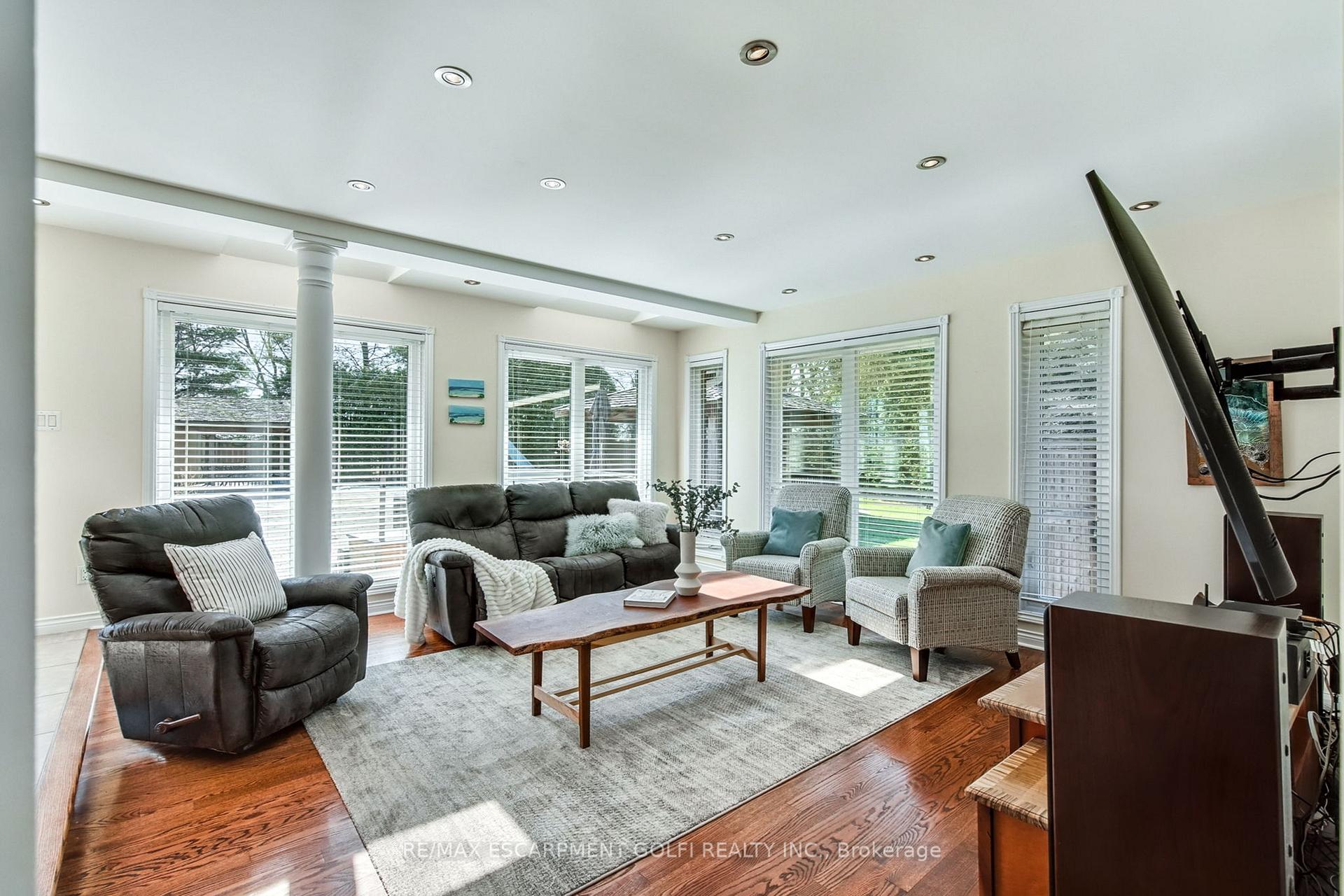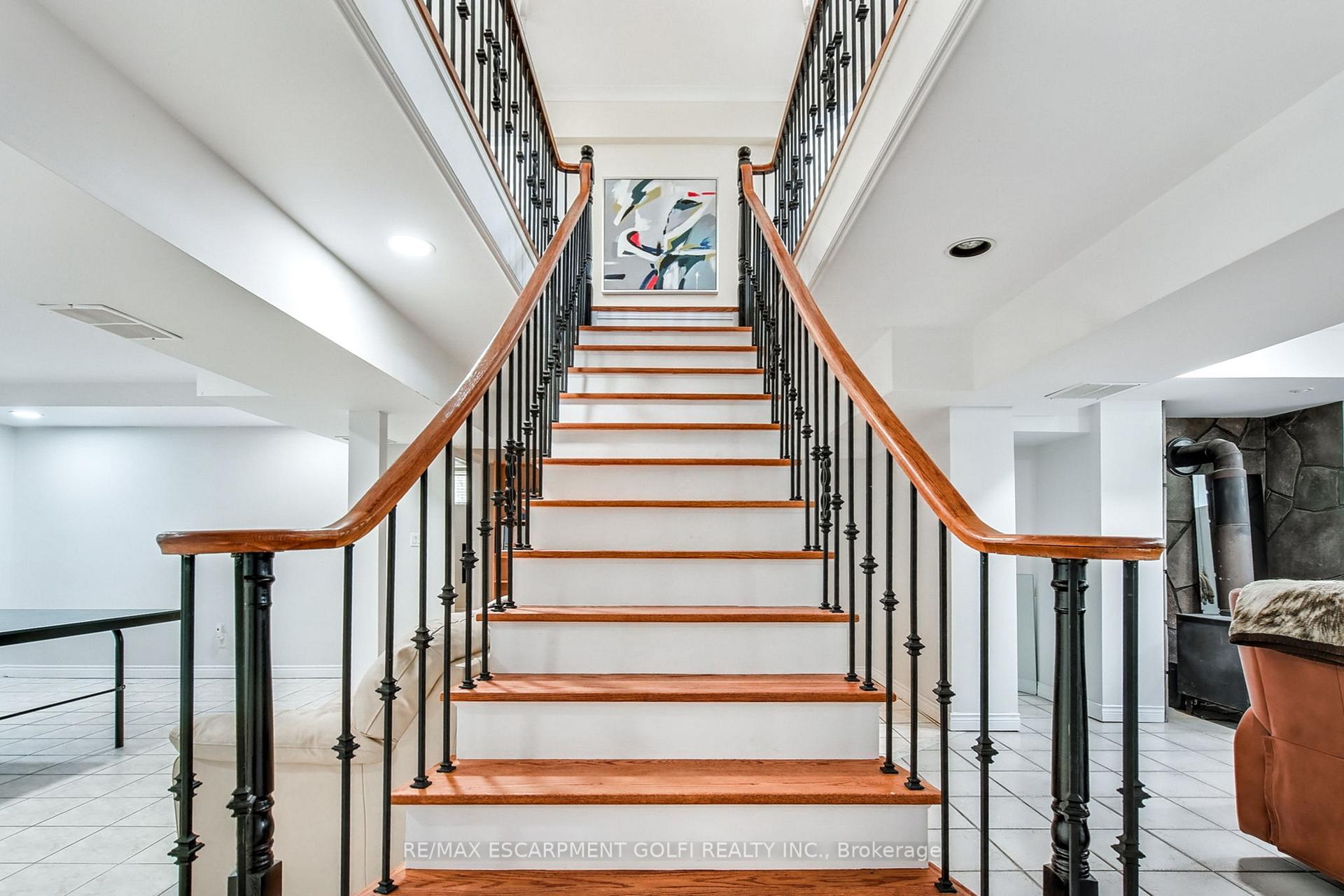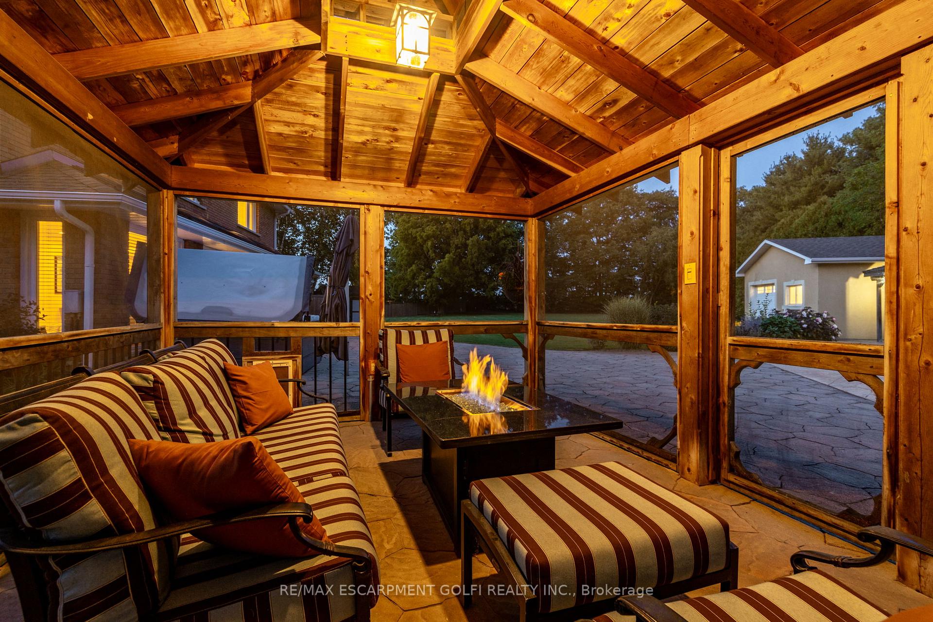 Situated on a quiet, beautifully manicured 0.99-acre lot in one of the most exclusive enclaves in the area, this impressive two-storey brick estate immediately captures attention with its elegant curb appeal, circular driveway, and landscaped centrepiece. This home has it all, offering four bedrooms, four bathrooms and over 4000 square feet of living space. No rear neighbours, an inground pool, hot tub, workshop & gazebo with a natural gas fireplace outside. The backyard is flat, unobstructed and surrounded by trees. Plenty of useable space for entertaining, family games/events and a huge ice rink. Breathtaking foyer illuminated by cascades of natural light and a stunning centre staircase. Exquisite Brazilian hardwood flooring flows seamlessly through the formal dining and entertainment spaces, where a natural gas fireplace adds a warm, ambiance ideal for both grand entertaining and intimate gatherings. The custom kitchen is a masterpiece of craftsmanship, featuring cherry maple oak soft-close cabinetry, under-cabinet lighting, heated floors, granite countertops, skylights, and a toe-kick central vacuum for effortless living. The step-down living room features large windows overlooking the private back yard, pot lights through-out and gleaming hardwood floors. The expansive primary suite impresses with two walk-in closets, custom built-in wall-to wall cabinetry, and an elegant ensuite featuring dual vanities and a walk-in shower. The fully finished basement features a spacious recreation room, a bathroom, a private office, an oversized storage room, and a separate walk-up staircase leading directly to the garage. Nestled in a prime location just five minutes from Waterdown, this location offers unrivaled access to excellent schools, parks, trails, golf courses, and fitness centers, a rare setting where every lifestyle amenity is within easy reach, yet the surroundings remain serene and exclusive.