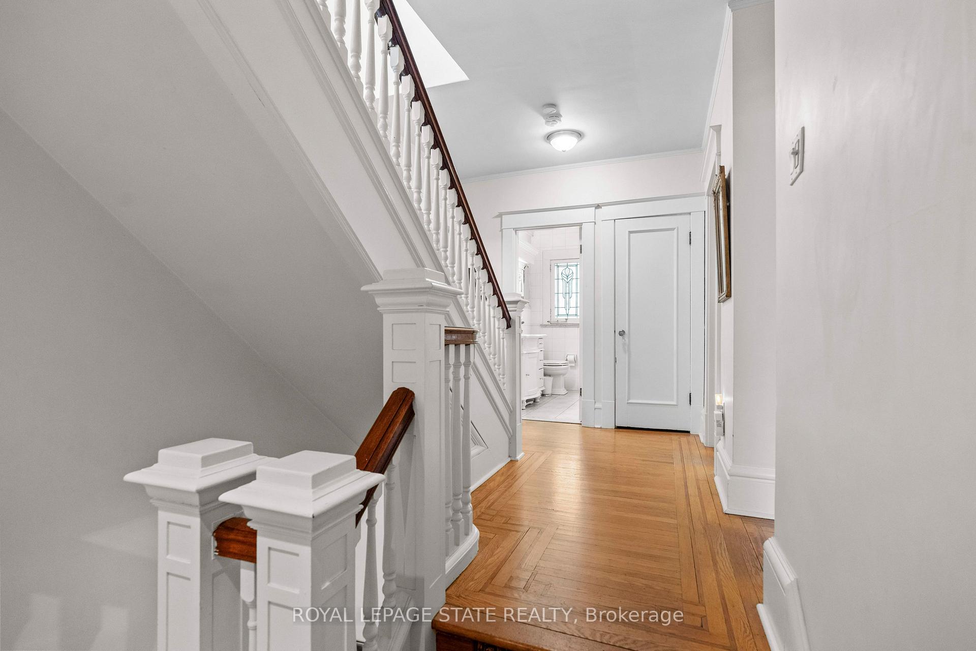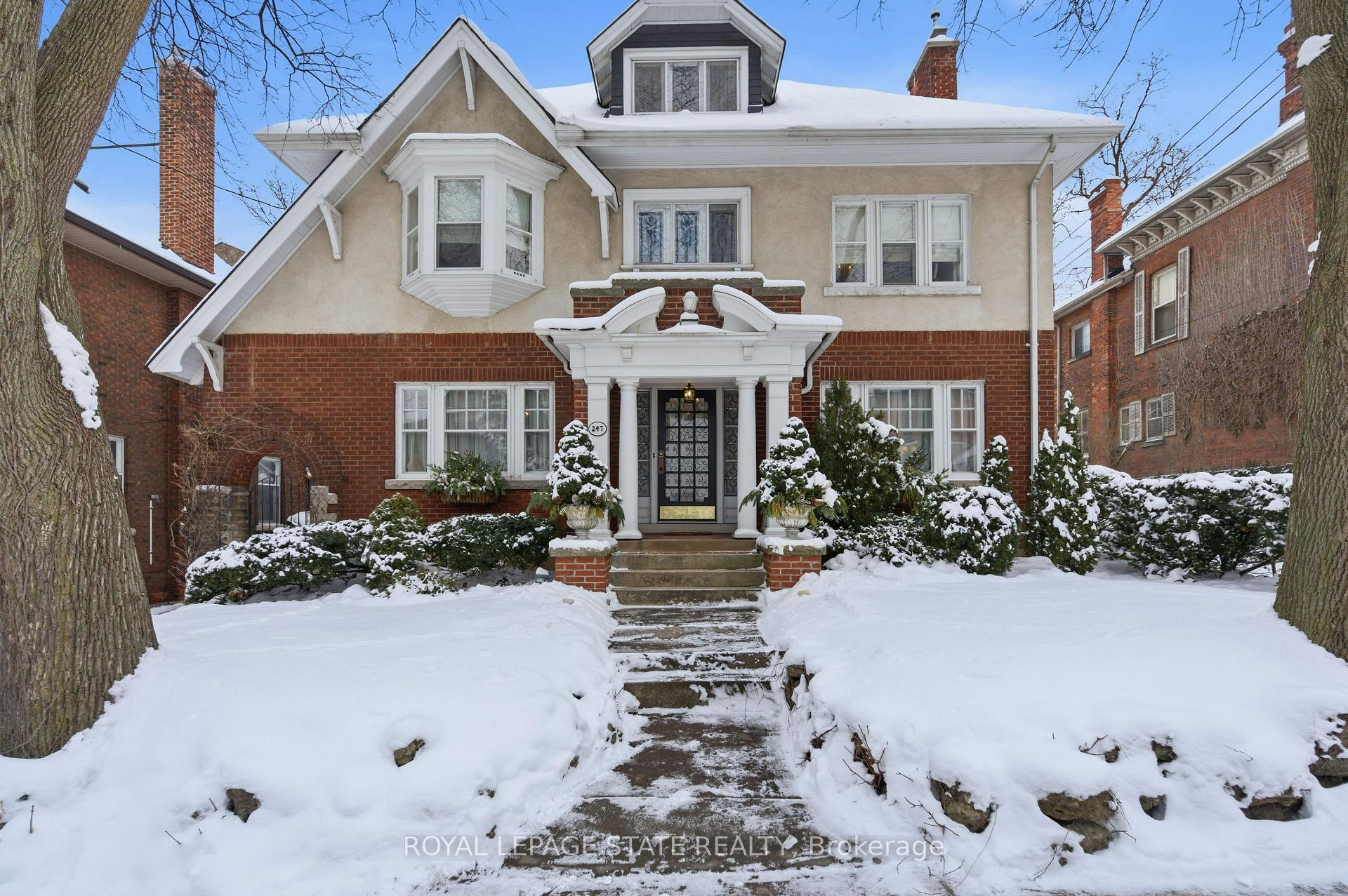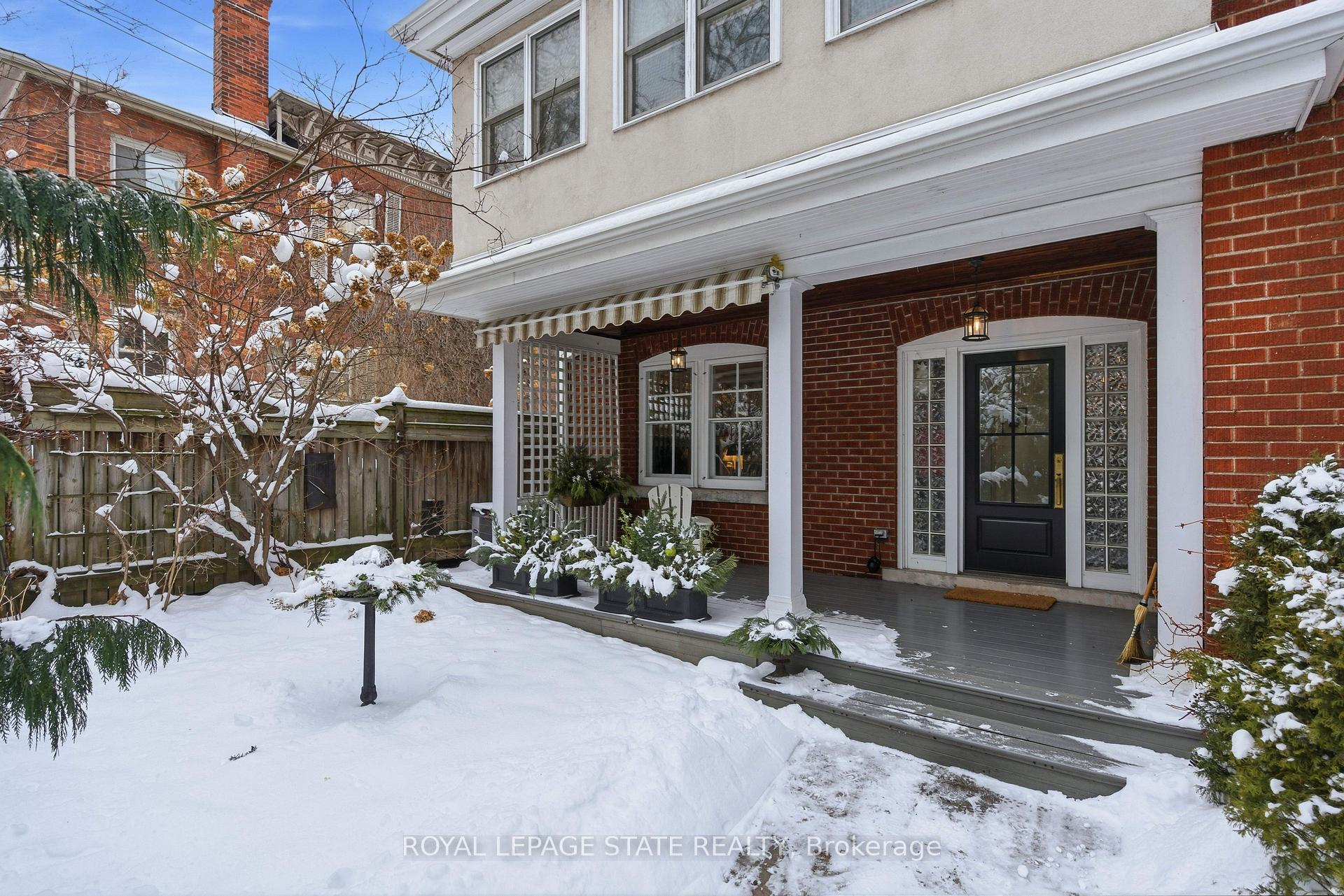 This stately 2.5-stry residence sits on a mature 46′ x 85.33′ lot in Hamilton’s prestigious Durand neighbourhood. Showcasing timeless curb appeal, the front walkway leads to a covered porch framed by Doric columns & an entry door w/ wrought-iron grillwork. Inside, a grand foyer w/ crown moulding, a sweeping staircase & French doors introduces elegant principal rms. The formal liv rm feat a gas FP, an intricate mantle w/ hidden side cabinet, & windows overlooking both gardens. The adjoining din rm impresses w/ built-in cabinetry, leaded stained glass, and rich millwork throughout. The kitchen is a showpiece, featuring heated limestone floors, custom cabinetry w/ beveled glass, marble counters, undercab lighting, pantry, & premium S/S appliances incl a Viking gas range, Sub-Zero fridge, & Miele d/w. Surrounded by windows, it opens to a covered porch w/ a Phantom screen, perfect for indoor-outdoor living. A handy mudroom w/ dbl mirrored closet completes the main lvl. Heading up the main staircase, a landing of stained glass welcomes you to the 2nd level, feat a 25.9′ x 13′ primary suite w/ sitting area, dual closets, & access to a bright den/sunroom (heated flrs). 2 add’l bdrms – one w/ a bay window & ensuite, the other with garden views – plus a 4-pc bath w/ a jetted tub, stained glass, & hand-painted murals complete this lvl. The 3rd lvl offers a private bdrm retreat w/ a 3-pc ensuite, skylights, gas FP, storage, & cozy sitting nooks. The lower lvl adds laundry w/ custom cabinetry, a 2-pc bath, storage & workshop space. Outside, enjoy a private yard w/ a fountain, covered composite porch, retractable awning, gas BBQ hookup, detached garage + surfaced parking for 2 & security lighting. Add feat incl: hardwood flrs, custom window coverings, c/air, HEPA air purifier, a security sys & more. Walkable to the Locke St cafés, boutiques, art galleries, hospitals, GO Transit, parks & trails – Durand offers historic character & an unmatched lifestyle of quiet sophistication.