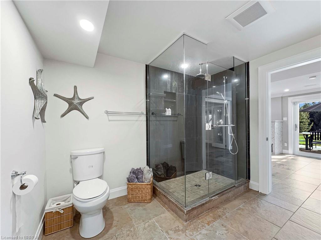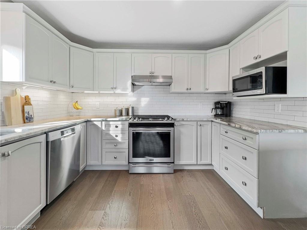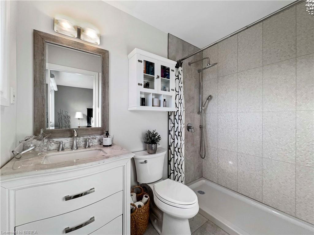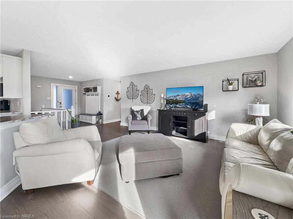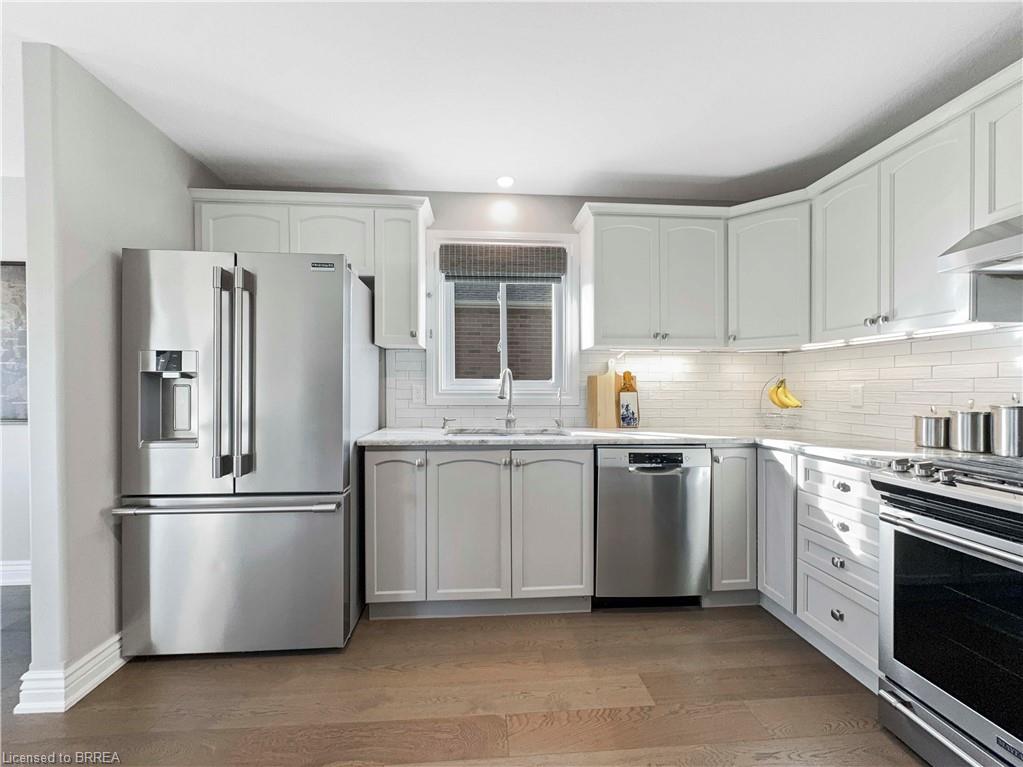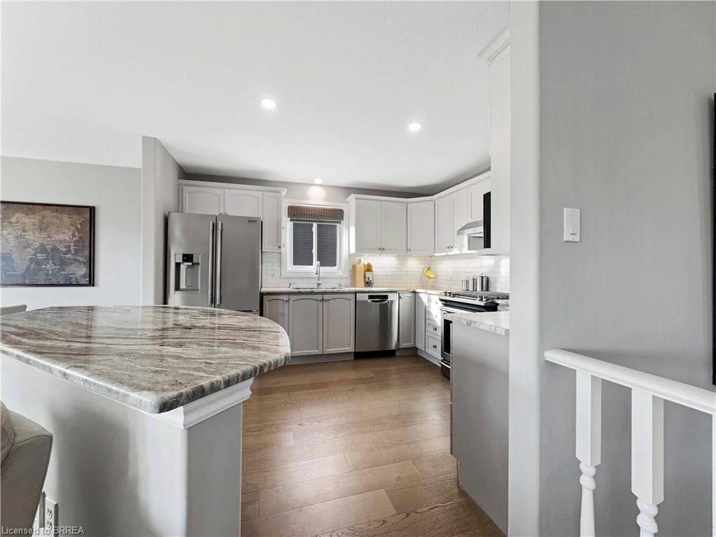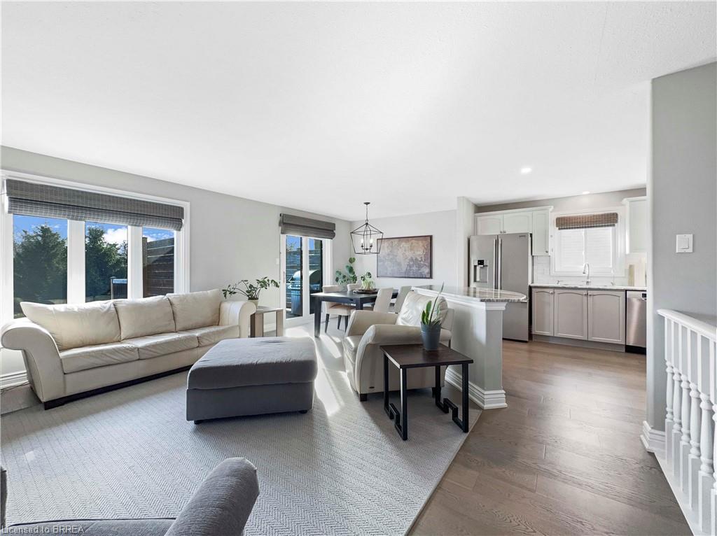 Welcome home to 25 Bradbury Crescent – a rare find in the prettiest little town of Paris. This brick bungalow offers 3+1 bedrooms and 3 bathrooms, nestled in an incredible neighbourhood. The open-concept main floor features gorgeous engineered hard wood throughout, granite countertops in the kitchen, a marble subway tile backsplash, ample cabinetry, and an island perfect for entertaining. Enjoy the convenience of main floor laundry with access to the double car garage and to the side yard. A large picture window in the living room fills the space with natural light, while patio doors off the dining area lead to an oversized deck – ideal for your morning coffee at sunrise or a glass of wine at sunset. Downstairs, the fully finished lower level opens to a breathtaking 300ft+ deep backyard filled with lush gardens, mature trees, walking trails, and forested greenery. The lower level is a standout, featuring heated floors and a fully private suite separated by double French doors. This includes a cozy sitting room with a gas fireplace, a spacious bedroom with a walk-in closet, and a stunning 3-piece bathroom with custom cabinetry and an oversized frameless glass shower. The family room offers a second gas fireplace, built-in surround sound speakers ready for your system, and walkout access to a covered patio. Additional highlights include a metal stone-finish roof, newer doors and windows throughout, custom blinds, a water softener, a reverse osmosis system, heated floors on the lower level, and a fully integrated irrigation sprinkler system. Don’t miss your chance to own this exceptional property in one of Ontario’s most charming communities.