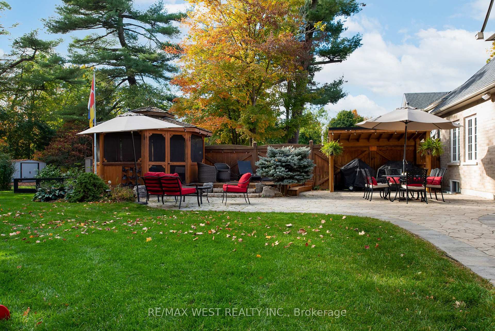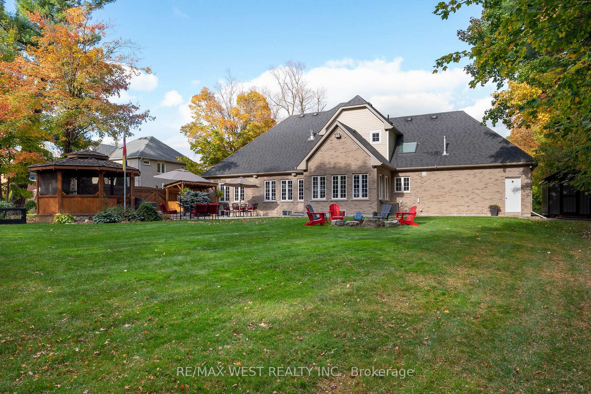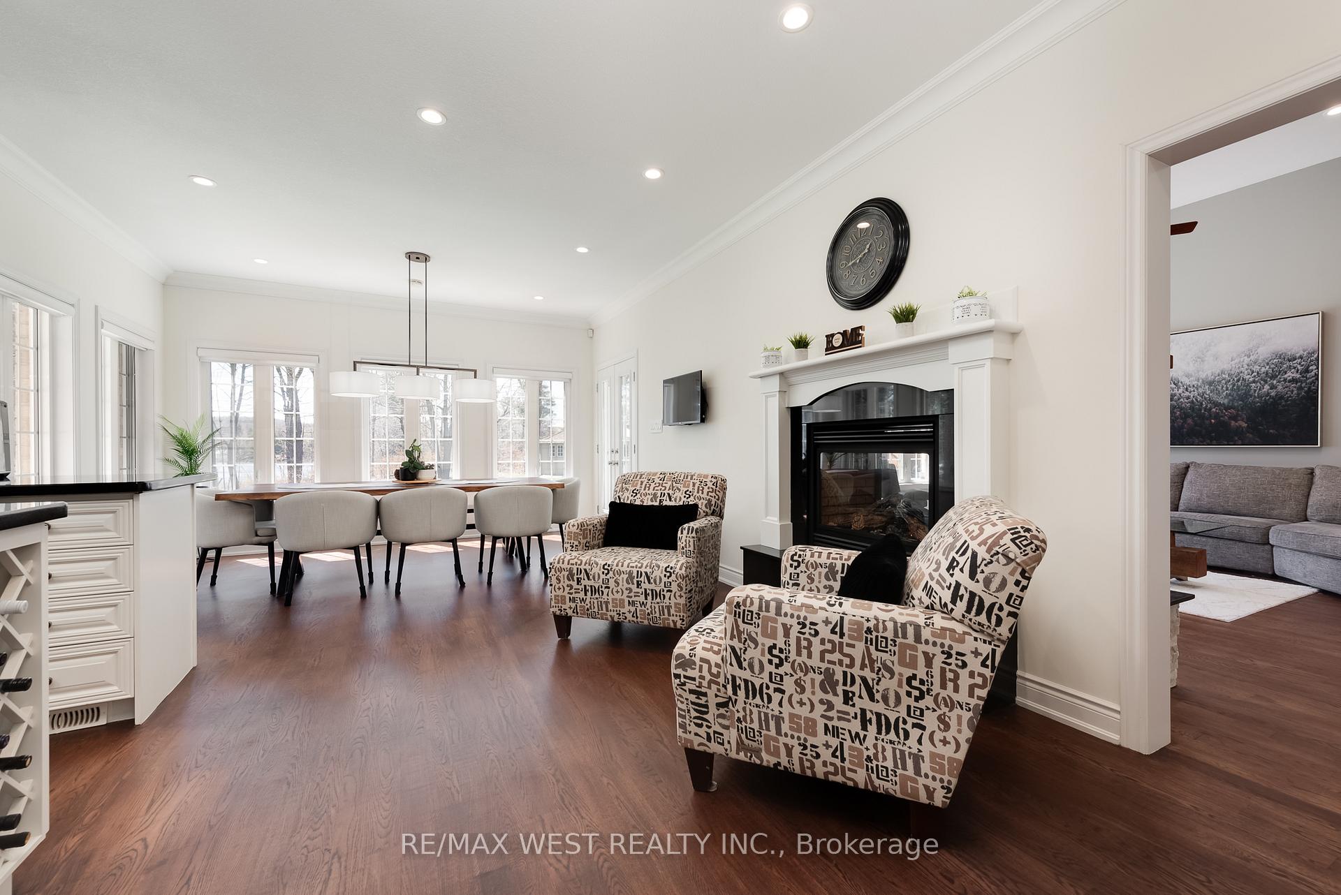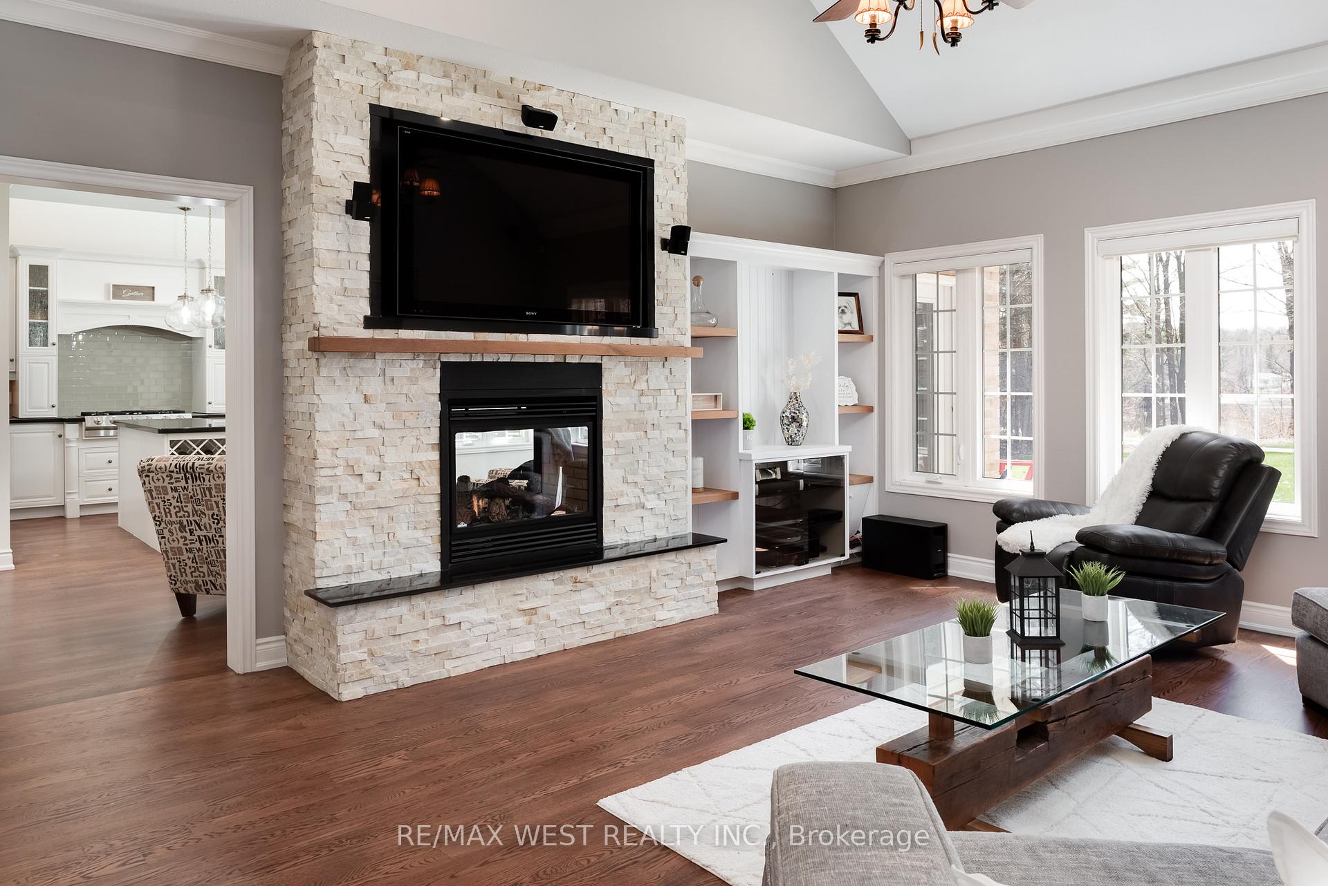 A Custom-Built Masterpiece in the Heart of Erin! This bungaloft offers over 4,300 sq ft of total living space, blending refined craftsmanship with everyday comfort. Pride of ownership is evident in every detail from the hand-stained hardwood floors to the thoughtfully designed indoor and outdoor living spaces. The chef-inspired kitchen features upgraded solid wood cabinetry, a new LG fridge, double oven, gas cooktop, wine fridge, and large centre island perfect for gathering with family & friends. The adjoining dining & sitting areas share a stunning two-way gas fireplace. Step outside to discover your private retreat complete with a sheltered BBQ area (with two gas lines), a screened-in gazebo with powered lighting and ceiling fan, multiple seating areas, elegant fence-line lighting, rough-in for a future hot tub, and a fire pit with wood storage all overlooking the tranquil pond beyond.The living room offers cathedral ceilings, a second view of the two-way fireplace, and a surround sound system that extends to the patio for effortless indoor-outdoor entertaining.The main floor primary suite is a true haven, featuring a spa-like 5-pc ensuite with soaker tub, walk-in shower, double sinks, and walk-in closet. The main level also includes a stylish home office, 2-piece bath, and convenient laundry room with access to the 4-car insulated garage divided into two sections, including a heated areaUpstairs, youll find three beautifully appointed bedrooms and a 5-pc bathideal for family or guests.The lower level is designed for year-round enjoyment, featuring a games area, wet bar, home theatre with surround sound, gym, 3-piece bath, gas fireplace, and custom lighting.his remarkable home is within walking distance to boutique shops, restaurants, the high school, parks, trails, and more. A Generac generator powers most of the home, offering peace of mind without compromise.A rare opportunity to own a home that perfectly balances luxury, functionality, and small-town charm.
