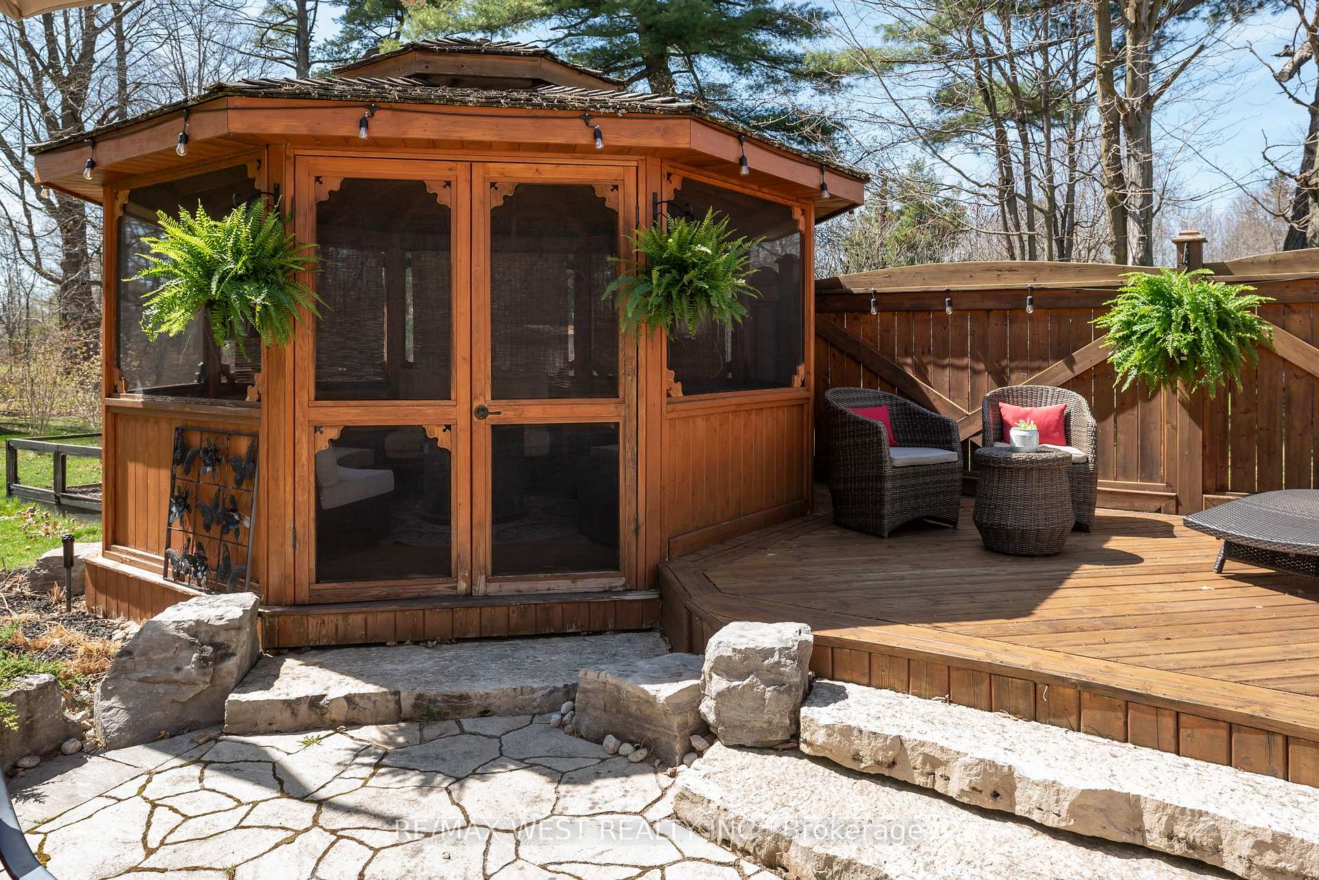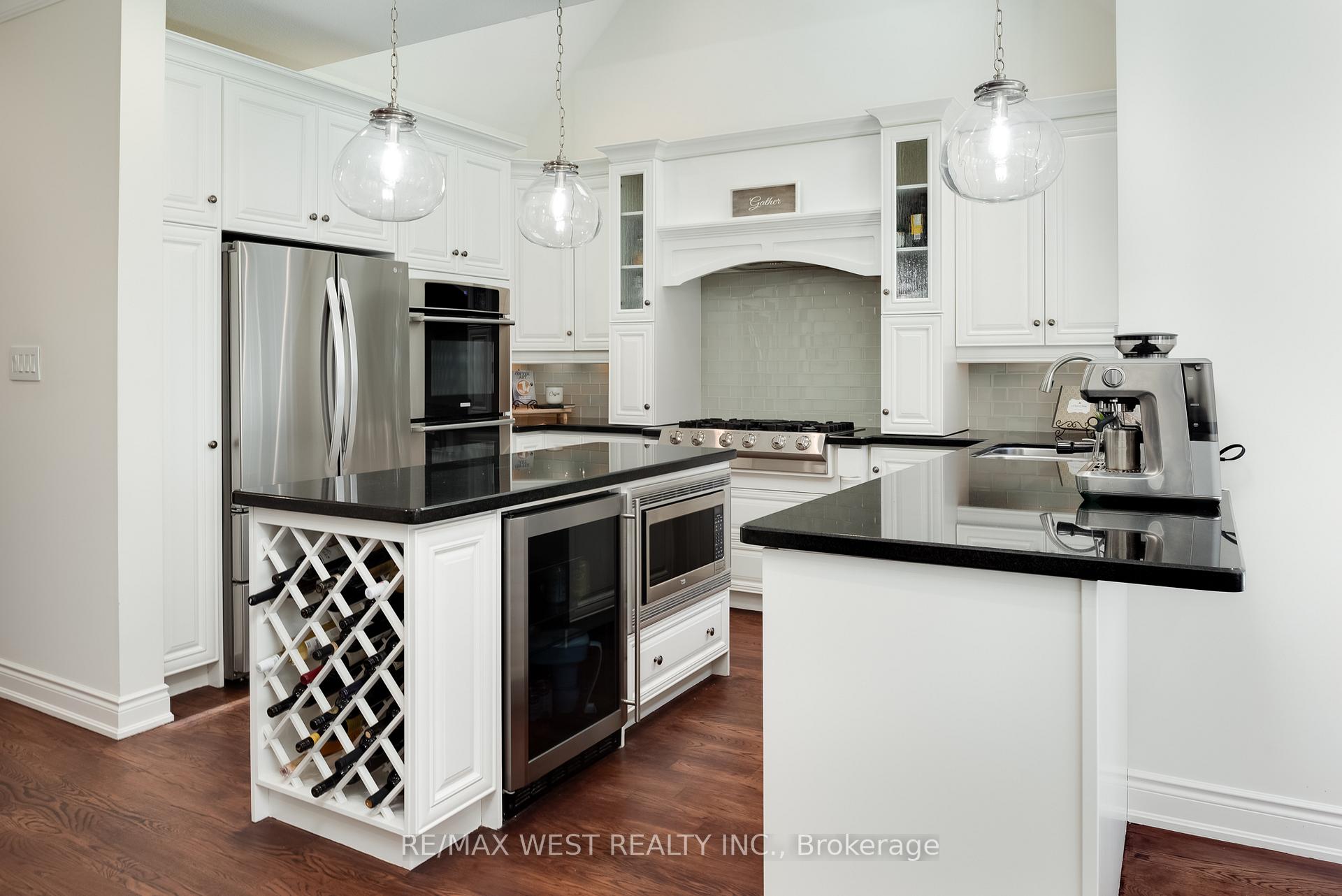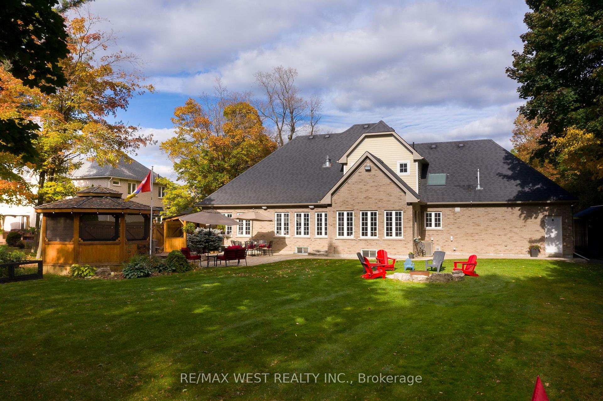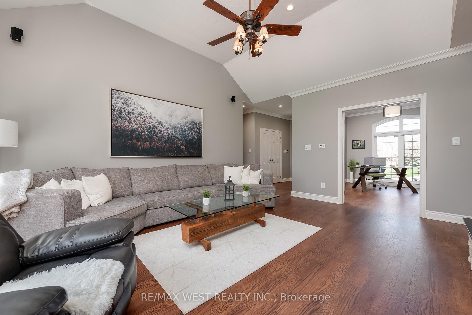 A Custom-Built Masterpiece in the Heart of Erin! This bungaloft offers over 4,300 sq ft of total living space, blending refined craftsmanship with everyday comfort. Pride of ownership is evident in every detail from the hand-stained hardwood floors to the thoughtfully designed indoor and outdoor living spaces. The chef-inspired kitchen features upgraded solid wood cabinetry, a new LG fridge, double oven, gas cooktop, wine fridge, and large centre island perfect for gathering with family & friends. The adjoining dining & sitting areas share a stunning two-way gas fireplace. Step outside to discover your private retreat complete with a sheltered BBQ area(with two gas lines), screened-in gazebo with powered lighting and ceiling fan, multiple seating areas, elegant fence-line lighting, rough-in for future hot tub, and a fire pit with wood storage all overlooking the tranquil pond beyond. The living room offers cathedral ceilings, a second view of the two-way fireplace, and surround sound system that extends to the patio for effortless indoor-outdoor entertaining. The main floor primary suite is a true haven, featuring a spa-like 5-pc ensuite with soaker tub, walk-in shower, double sinks, and walk-in closet. The main level also includes a stylish home office, 2-piece bath, and convenient laundry room with access to the 4-car insulated garage divided into two sections, including a heated area. Upstairs, you’ll find three beautifully appointed bedrooms and a 5-pc bath ideal for family or guests. The lower level is designed for year-round enjoyment, featuring a games area, wet bar, home theatre with surround sound, gym, 3-piece bath, gas fireplace, and custom lighting. This remarkable home is within walking distance to boutique shops, restaurants, the high school, parks, trails, & more. A Generac generator powers most of the home, offering peace of mind without compromise. A rare opportunity to own a home that perfectly balances luxury, functionality, and small-town charm.