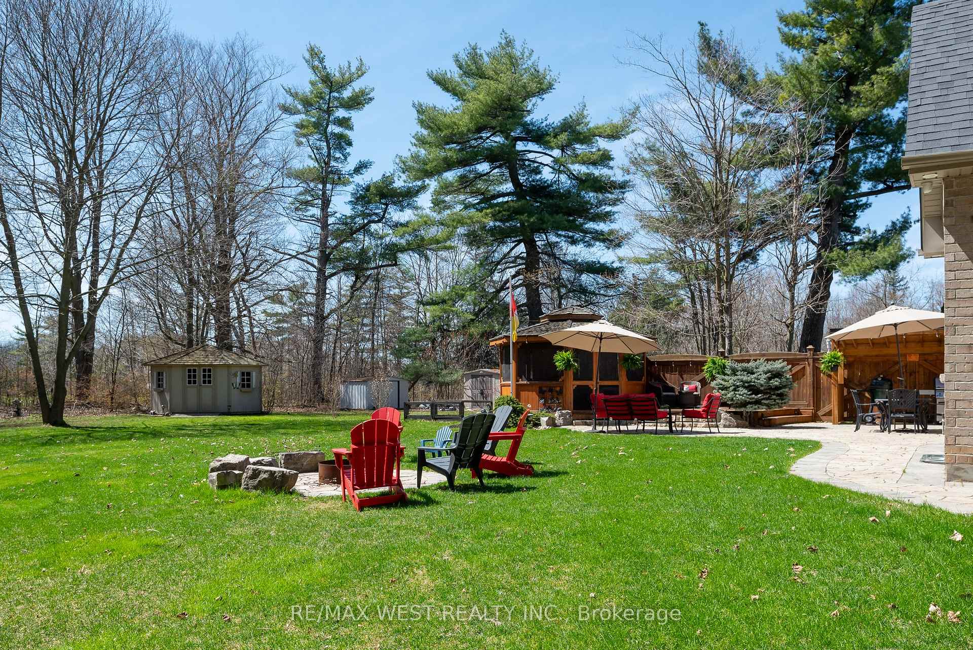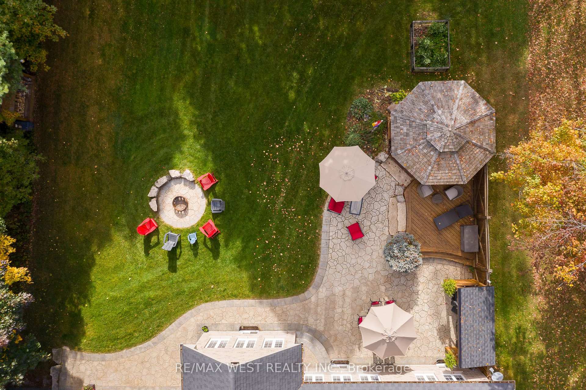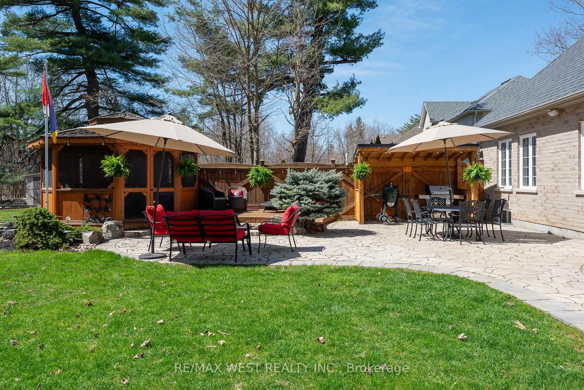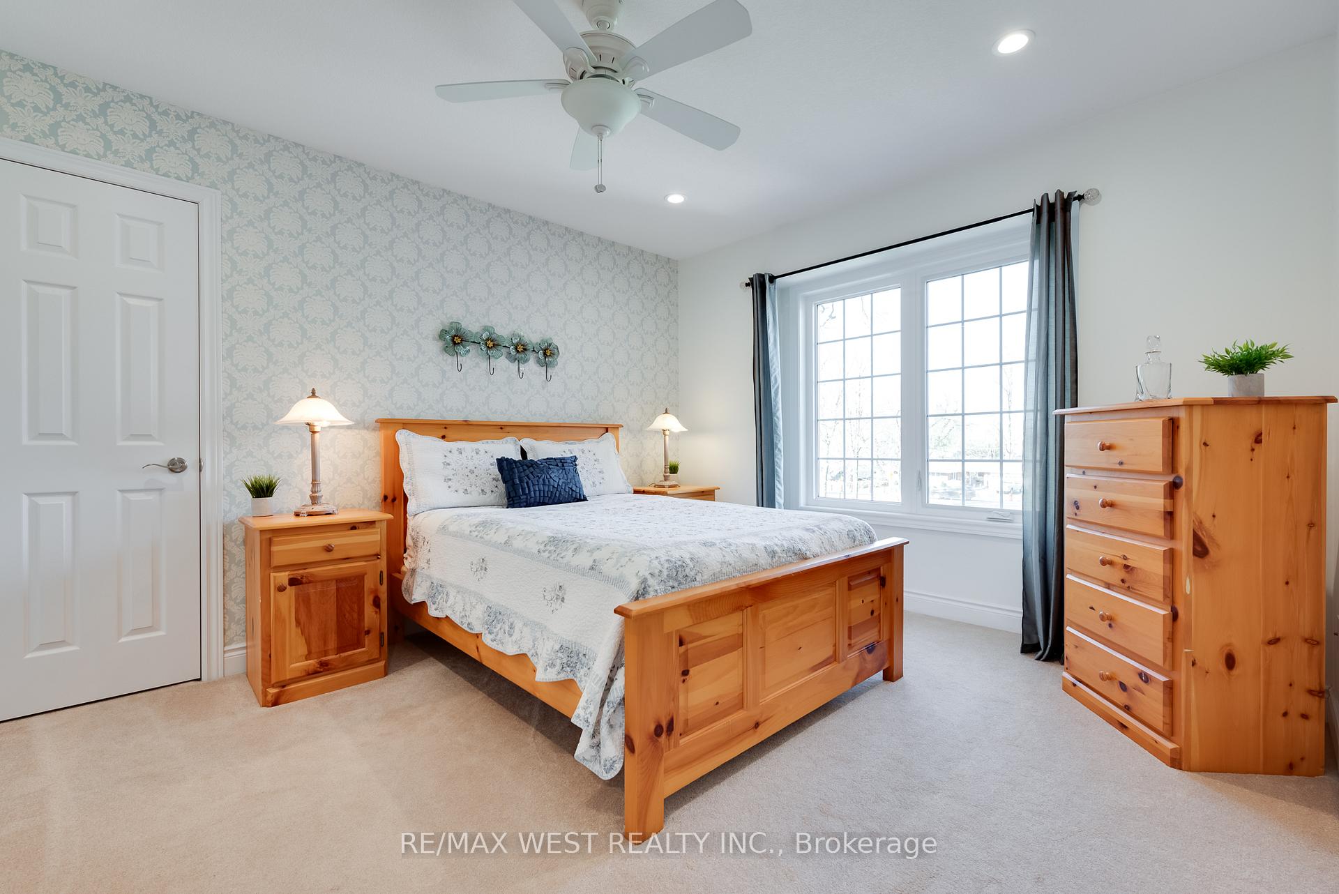 A Custom-Built Masterpiece in the Heart of Erin! This bungaloft offers over 4,300 sq ft of total living space, blending refined craftsmanship with everyday comfort. Pride of ownership is evident in every detail from the hand-stained hardwood floors to the thoughtfully designed indoor and outdoor living spaces. The chef-inspired kitchen features upgraded solid wood cabinetry, a new LG fridge, double oven, gas cooktop, wine fridge, and large centre island perfect for gathering with family & friends. The adjoining dining & sitting areas share a stunning two-way gas fireplace. Step outside to discover your private retreat complete with a sheltered BBQ area(with two gas lines), screened-in gazebo with powered lighting and ceiling fan, multiple seating areas, elegant fence-line lighting, rough-in for future hot tub, and a fire pit with wood storage all overlooking the tranquil pond beyond. The living room offers cathedral ceilings, a second view of the two-way fireplace, and surround sound system that extends to the patio for effortless indoor-outdoor entertaining. The main floor primary suite is a true haven, featuring a spa-like 5-pc ensuite with soaker tub, walk-in shower, double sinks, and walk-in closet. The main level also includes a stylish home office, 2-piece bath, and convenient laundry room with access to the 4-car insulated garage divided into two sections, including a heated area. Upstairs, you’ll find three beautifully appointed bedrooms and a 5-pc bath ideal for family or guests. The lower level is designed for year-round enjoyment, featuring a games area, wet bar, home theatre with surround sound, gym, 3-piece bath, gas fireplace, and custom lighting. This remarkable home is within walking distance to boutique shops, restaurants, the high school, parks, trails, & more. A Generac generator powers most of the home, offering peace of mind without compromise. A rare opportunity to own a home that perfectly balances luxury, functionality, and small-town charm.