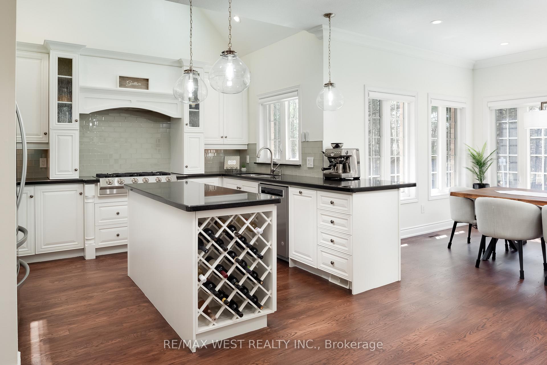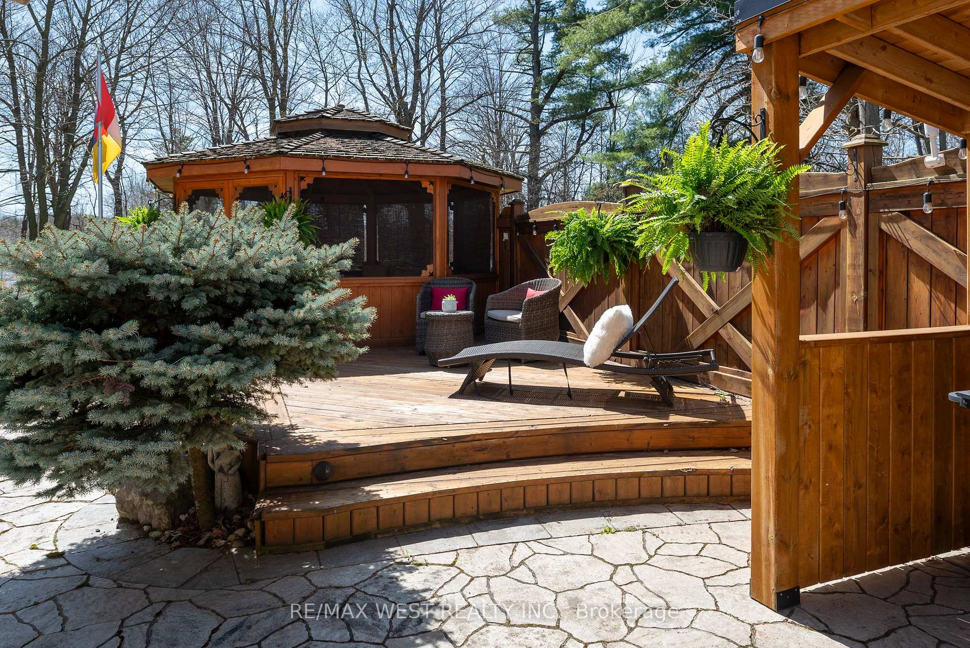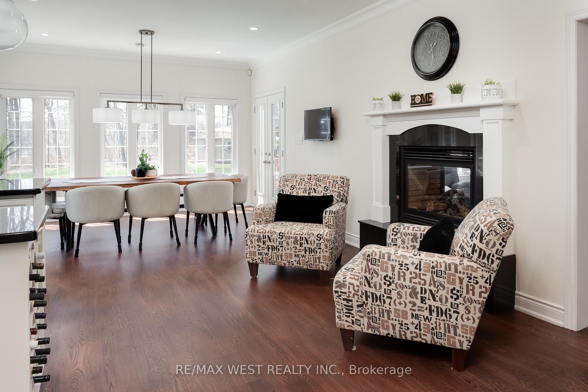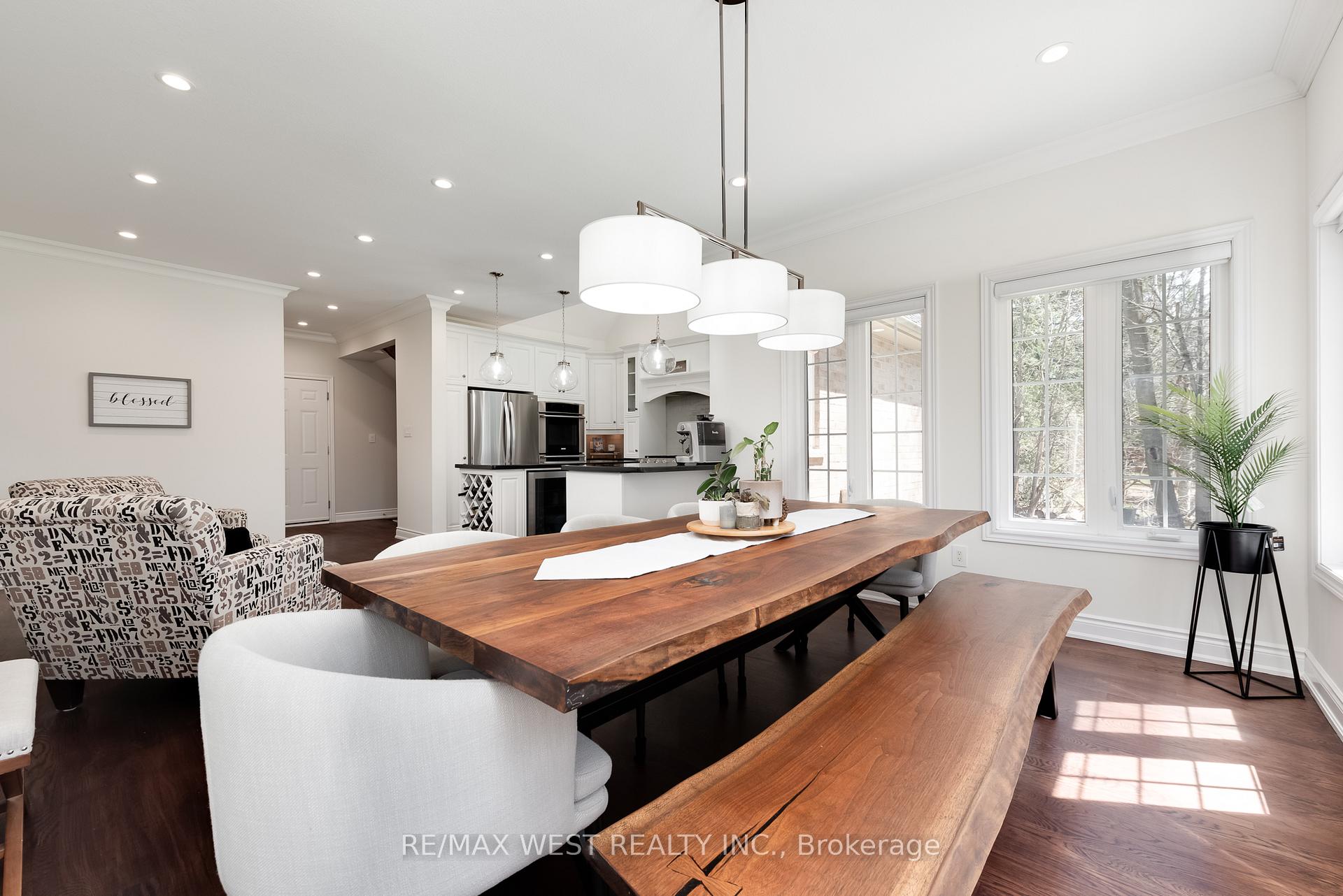 A Custom-Built Masterpiece in the Heart of Erin! This bungaloft offers over 4,300 sq ft of total living space, blending refined craftsmanship with everyday comfort. Pride of ownership is evident in every detail from the hand-stained hardwood floors to the thoughtfully designed indoor and outdoor living spaces. The chef-inspired kitchen features upgraded solid wood cabinetry, a new LG fridge, double oven, gas cooktop, wine fridge, and large centre island perfect for gathering with family & friends. The adjoining dining & sitting areas share a stunning two-way gas fireplace. Step outside to discover your private retreat complete with a sheltered BBQ area(with two gas lines), screened-in gazebo with powered lighting and ceiling fan, multiple seating areas, elegant fence-line lighting, rough-in for future hot tub, and a fire pit with wood storage all overlooking the tranquil pond beyond. The living room offers cathedral ceilings, a second view of the two-way fireplace, and surround sound system that extends to the patio for effortless indoor-outdoor entertaining. The main floor primary suite is a true haven, featuring a spa-like 5-pc ensuite with soaker tub, walk-in shower, double sinks, and walk-in closet. The main level also includes a stylish home office, 2-piece bath, and convenient laundry room with access to the 4-car insulated garage divided into two sections, including a heated area. Upstairs, you’ll find three beautifully appointed bedrooms and a 5-pc bath ideal for family or guests. The lower level is designed for year-round enjoyment, featuring a games area, wet bar, home theatre with surround sound, gym, 3-piece bath, gas fireplace, and custom lighting. This remarkable home is within walking distance to boutique shops, restaurants, the high school, parks, trails, & more. A Generac generator powers most of the home, offering peace of mind without compromise. A rare opportunity to own a home that perfectly balances luxury, functionality, and small-town charm.