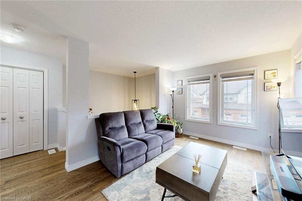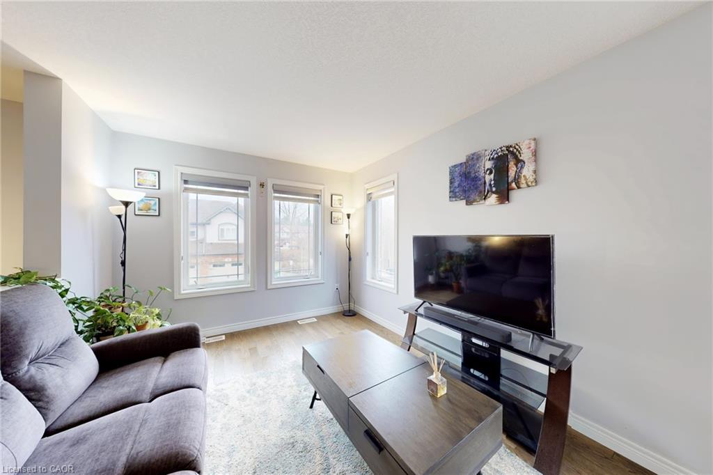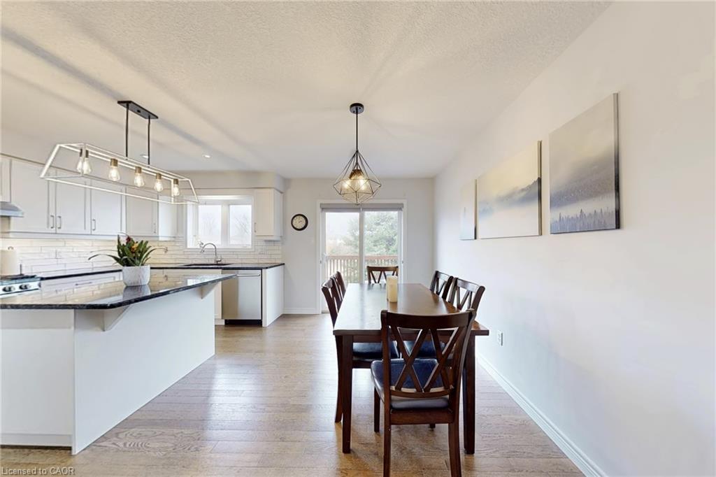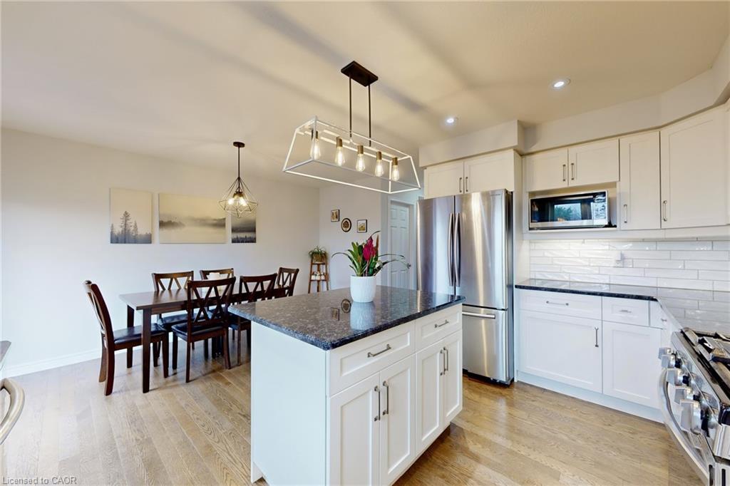 Executive condo townhouse in the modern Natura complex, offering move in ready living with clear pride of ownership. Built in 2016, this home features a spacious eat in kitchen with granite countertops, upgraded backsplash, stainless steel appliances, and a new 2025 gas stove. The dinette opens to a lovely deck overlooking the backyard. The bright living room includes hardwood floors and large windows, with a convenient powder room on the main level. Upstairs is a spacious, carpet-free primary bedroom with a walk in closet, massive windows, hardwood floors, and a 4 pc ensuite, plus two additional bedrooms and a 4 pc main bath. The finished walkout basement adds a bright recreation room with access to the fenced yard. Recent upgrades include zebra blinds (2025) and a new water heater (2025). Located on a quiet, family oriented street near parks, schools, grocery stores, LCBO, Victoria Road Rec Centre, East Guelph Medical Clinic, Guelph Lake, and transit routes 13, 17, and 18.