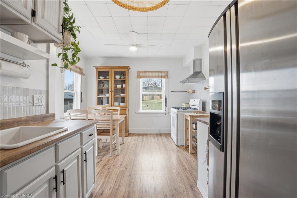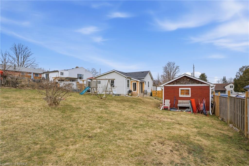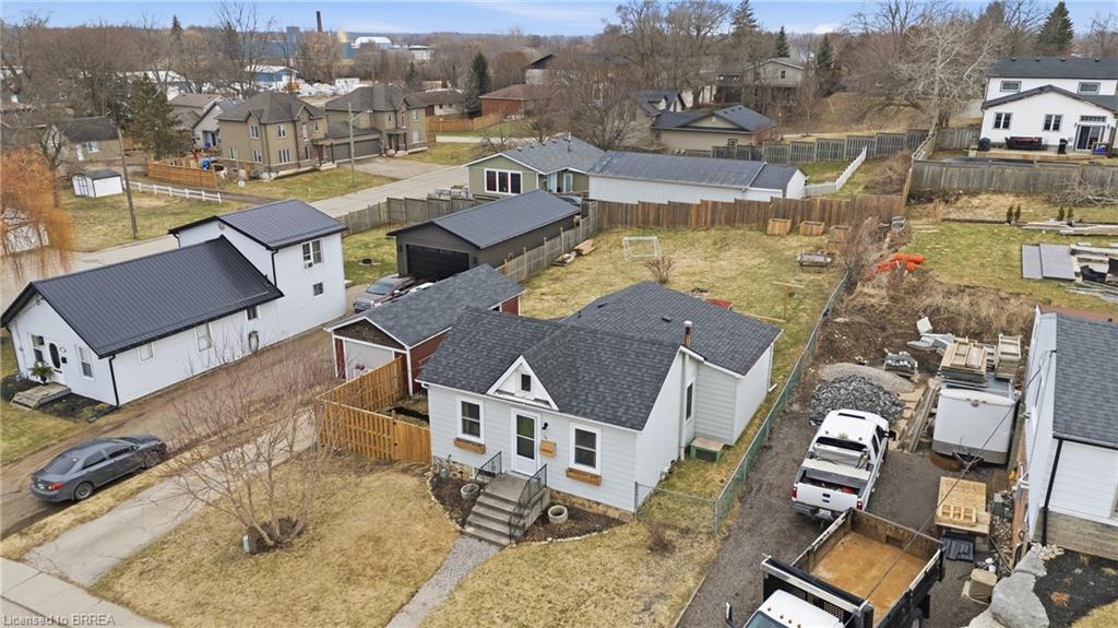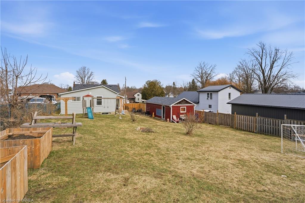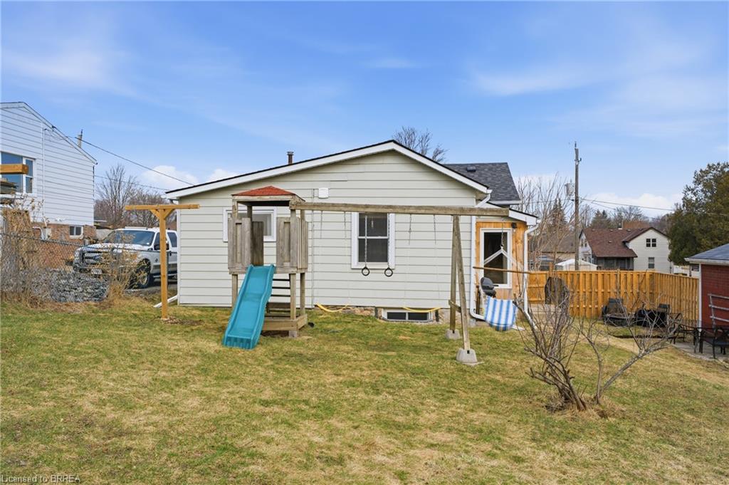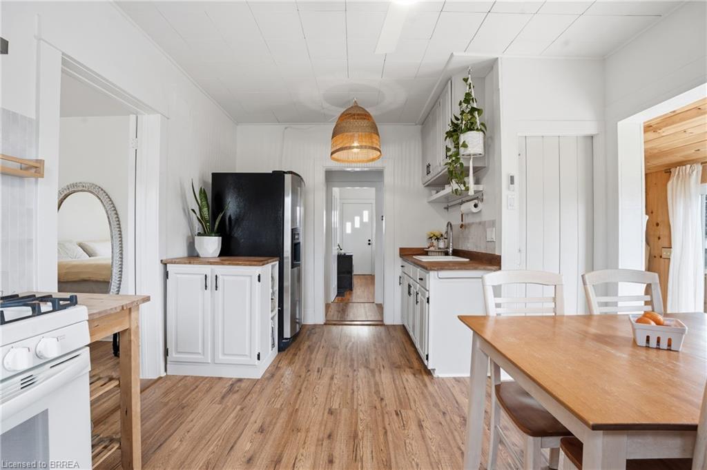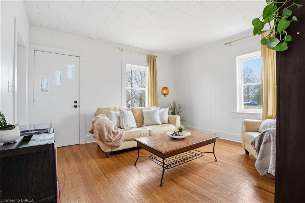 Welcome to this adorable detached bungalow nestled in the pretty little town of Paris. This warm and inviting home offers 3 comfortable bedrooms and is filled with natural light, warm wood tones, fresh paint and trim and nearly 9 foot ceilings throughout. The updated eat-in-kitchen features stylish butcher block countertops and modern hardware. Enjoy the convenience of the practical mudroom, ideal for keeping jackets, shoes, and backpacks organized year-round. A functional one level layout makes this home move in ready for both families or retirees, while the unfinished basement offers potential for storage or future living space. Step outside to enjoy a spacious, fenced backyard, perfect for relaxing, gardening, or summer gatherings. The detached garage provides excellent space for storage, a workshop, or hobby area. Located on a quiet and safe street, just minutes from schools, the fairgrounds, parks, scenic trails and green space. Take a quick bike ride to the vibrant shops and restaurants of downtown. This home offers the perfect blend of comfort, character, and small-town charm. (Stove, Washer Dryer 2023) (Flooring 2023)