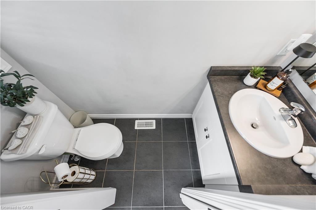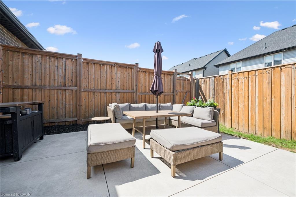 The bright main floor features an open-concept kitchen and dining area designed for everyday living and entertaining. Sliding doors lead directly to a fully fenced backyard garden, creating a private outdoor retreat ideal for summer barbecues, relaxing evenings, or space for children and pets to play. A welcoming living room provides the perfect place to unwind, while a convenient two-piece bathroom completes the main level.