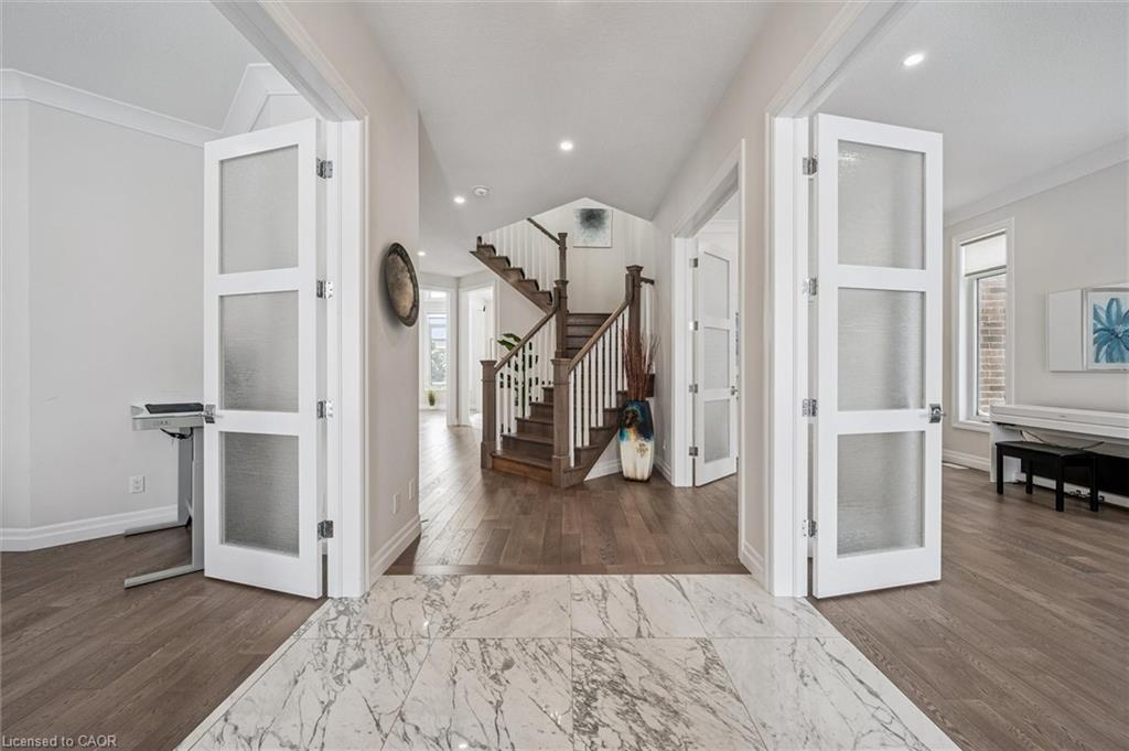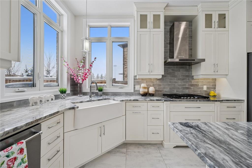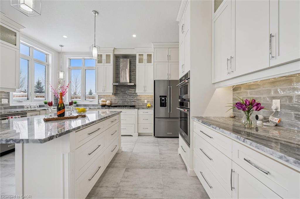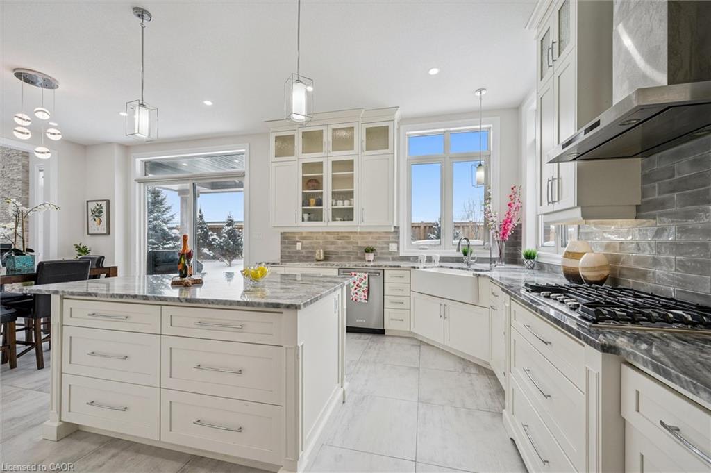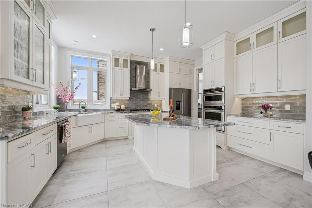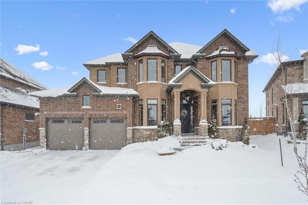 Nearly 4,000 sq ft Luxurious Executive Home Backing onto Grey Silo Golf Club, nestled in the prestigious Carriage Crossing subdivision. Rare tandem garage parks up to 3 cars, impressive 10’ ceilings on the main floor & 9’ ceilings on the 2nd level. The main floor showcases a stunning custom gourmet kitchen featuring a large island & a walk-in pantry. The elegant open to above great room is highlighted by a coffered ceiling, bright windows overlooking the backyard, & a two-storey stone gas fireplace. A large formal dining / living room with French doors, while a 5th bedrm / office off the spacious foyer provides an ideal main floor living option. The breakfast area opens to a covered patio. A rare 3pc bathrm on the main floor, along with a mudrm featuring custom locker-style cubbies. Upstairs, the spacious primary retreat features high cathedral ceiling, a luxurious 5pc ensuite & walk-in closet. Three additional bedrms include one with a private 3pc ensuite & two connected by a 5pc Jack & Jill bathroom. An upper laundry room & a loft overlooking the great room add both function & architectural interest. High-end finishes including premium doors & windows, granite & quartz countertops, hardwood flooring, ceramic tile, & extensive pot lighting. The large unspoiled basement will easily fit multiple uses including a home gym & an entertainment hub. The exterior impresses with brick & stone construction, an interlock driveway, & professionally designed landscaping. This one of Waterloo’s most desirable neighbourhoods is adjacent to the famous Rim Park Sportsplex with various indoor or outdoor sports facilities such as hockey rinks & soccer fields etc. The Grey Silo’s golf course or the Eastside Public Library, also the great natural environment with paved trails along the Grand River, be prepared to enjoy your life here & meet wildlife such as geese or deer etc. Within walking distance to Blackberry tech sector & bus route, a short drive to Universities & Conestoga Mall.