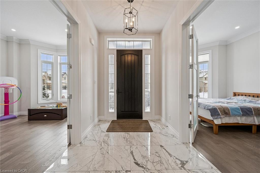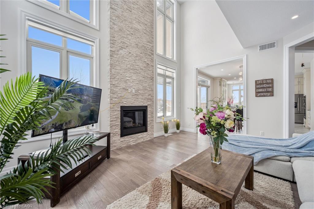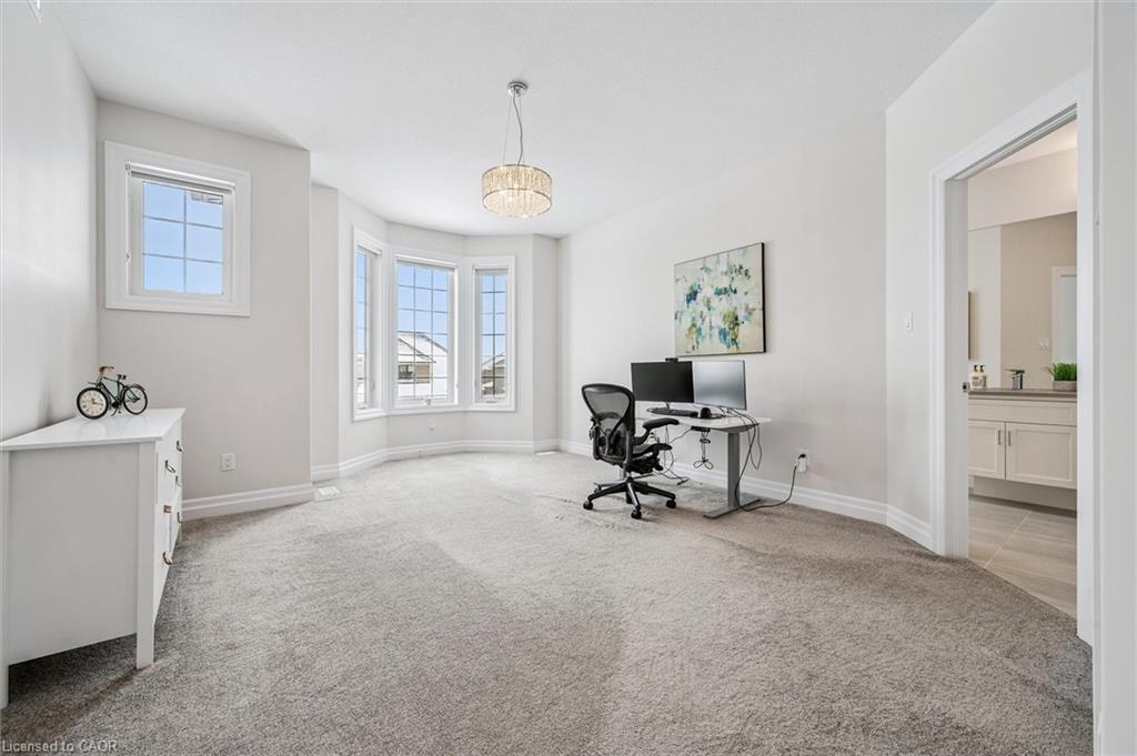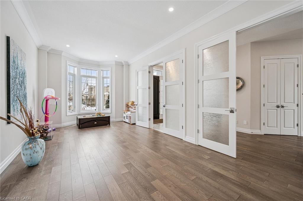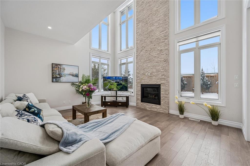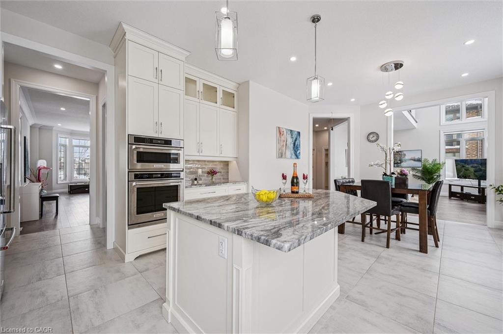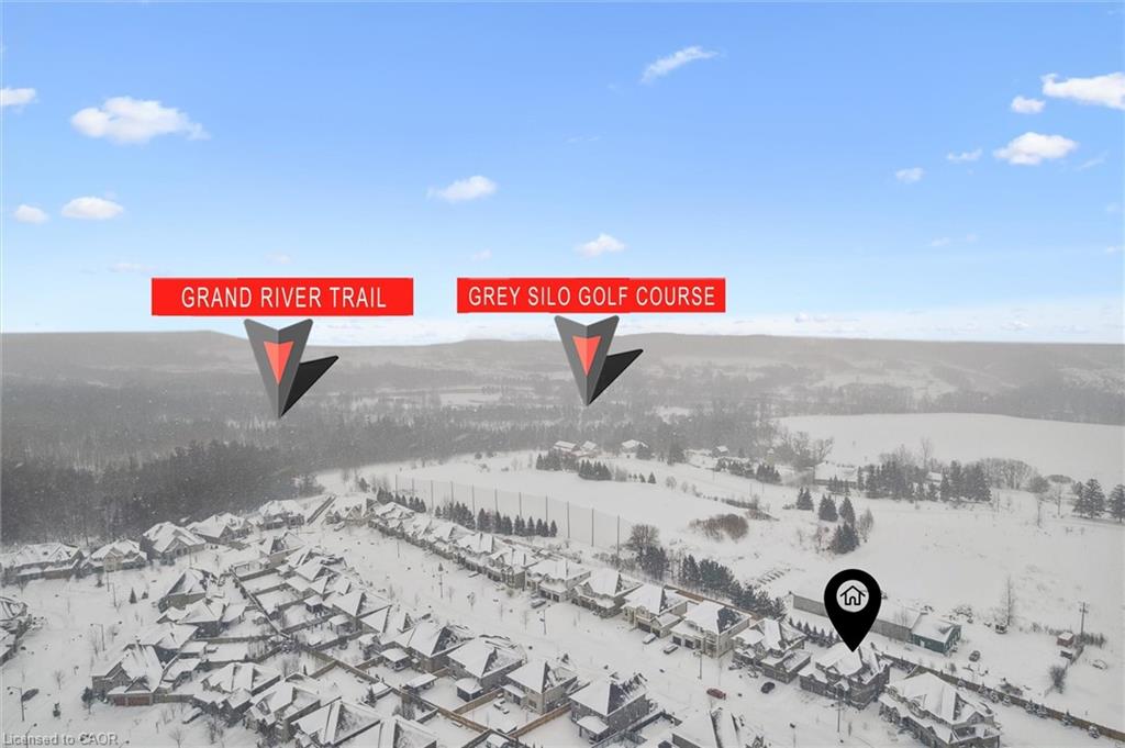 Nearly 4,000 sq ft Luxurious Executive Home Backing onto Grey Silo Golf Club, nestled in the prestigious Carriage Crossing subdivision. Rare tandem garage parks up to 3 cars, impressive 10’ ceilings on the main floor & 9’ ceilings on the 2nd level. The main floor showcases a stunning custom gourmet kitchen featuring a large island & a walk-in pantry. The elegant open to above great room is highlighted by a coffered ceiling, bright windows overlooking the backyard, & a two-storey stone gas fireplace. A large formal dining / living room with French doors, while a 5th bedrm / office off the spacious foyer provides an ideal main floor living option. The breakfast area opens to a covered patio. A rare 3pc bathrm on the main floor, along with a mudrm featuring custom locker-style cubbies. Upstairs, the spacious primary retreat features high cathedral ceiling, a luxurious 5pc ensuite & walk-in closet. Three additional bedrms include one with a private 3pc ensuite & two connected by a 5pc Jack & Jill bathroom. An upper laundry room & a loft overlooking the great room add both function & architectural interest. High-end finishes including premium doors & windows, granite & quartz countertops, hardwood flooring, ceramic tile, & extensive pot lighting. The large unspoiled basement will easily fit multiple uses including a home gym & an entertainment hub. The exterior impresses with brick & stone construction, an interlock driveway, & professionally designed landscaping. This one of Waterloo’s most desirable neighbourhoods is adjacent to the famous Rim Park Sportsplex with various indoor or outdoor sports facilities such as hockey rinks & soccer fields etc. The Grey Silo’s golf course or the Eastside Public Library, also the great natural environment with paved trails along the Grand River, be prepared to enjoy your life here & meet wildlife such as geese or deer etc. Within walking distance to Blackberry tech sector & bus route, a short drive to Universities & Conestoga Mall.