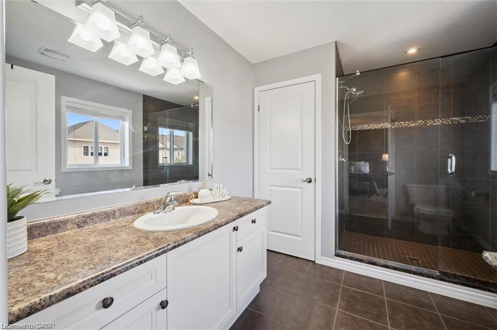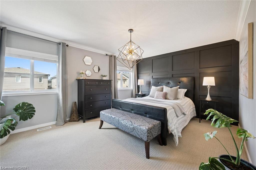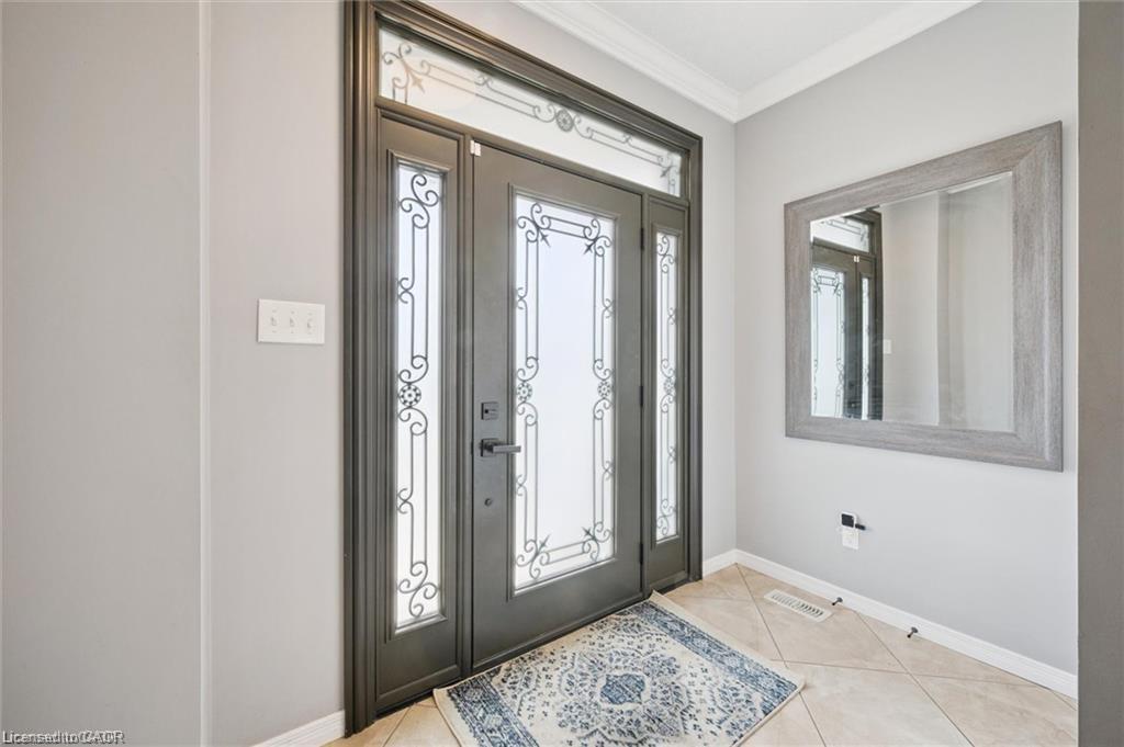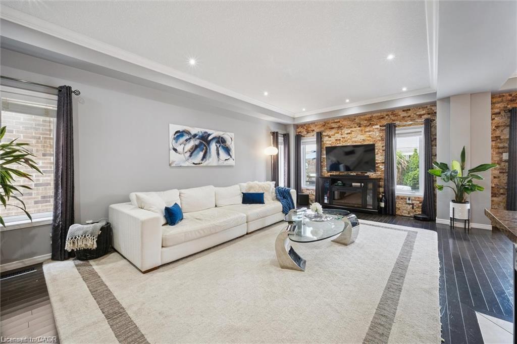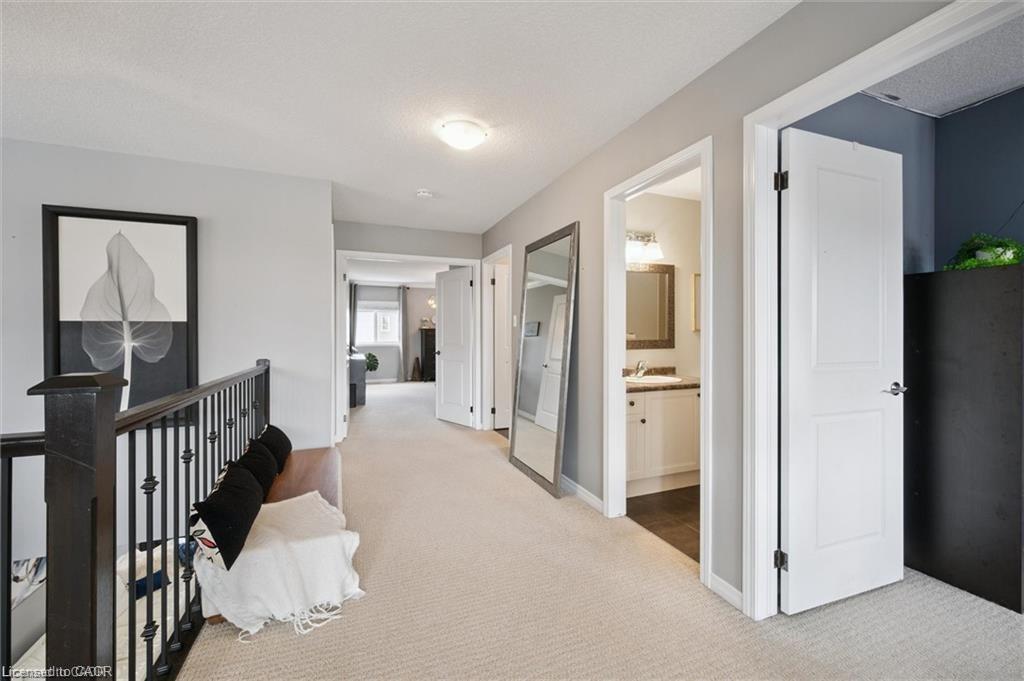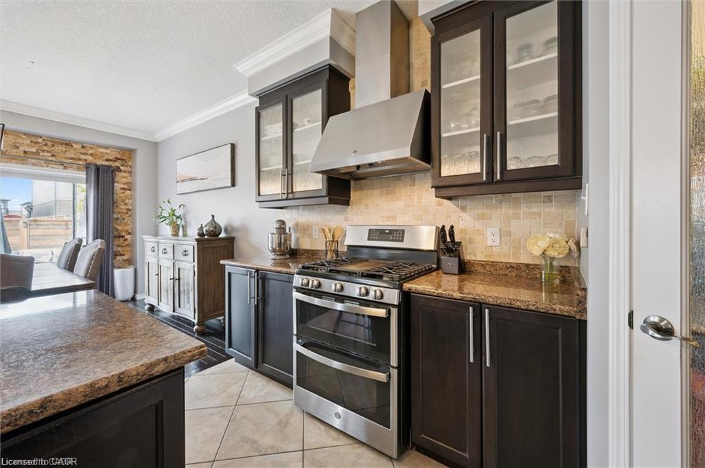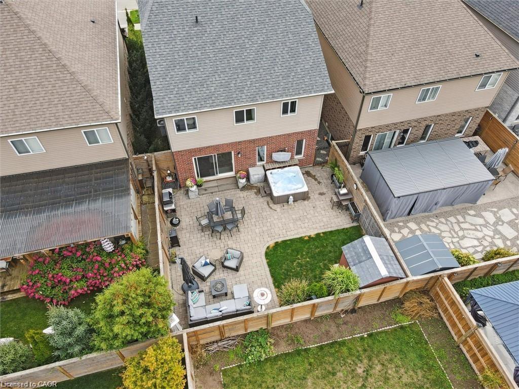 Welcome to Highland Ridge in West Galt! This 3-bedroom, 3-bathroom home offers over 2,279 sq. ft. of living space on a 36 x 105 ft. lot, combining comfort and style inside and out. The redesigned front exterior features a custom front door with upgraded inserts, tumbled stone columns, armour stone steps leading to the covered porch, and perennial gardens framed by interlock french curbs. Step inside to find 9 ft. ceilings, crown molding, pot lighting, and a mix of hardwood and oversized ceramic flooring. The upgraded dark maple kitchen is a standout with extended cabinetry, a walk-in pantry with french door, sit-up island and stainless-steel range hood. The open living and dining area is anchored by a stone accent wall and oversized sliders leading to the fully fenced backyard. Outside, enjoy a low-maintenance space with interlock patio, hot tub, wrought iron gates, and a shed with hydro. Upstairs, a spacious family room with bright windows and wrought iron railings offers the perfect gathering spot. The primary suite features a walk-in closet, crown molding, and a private 3-piece ensuite. Two additional bedrooms, a 4-piece bath, laundry, and large linen closet complete the second floor. Located minutes from downtown Galt, schools, parks, trails, shopping, and golf.