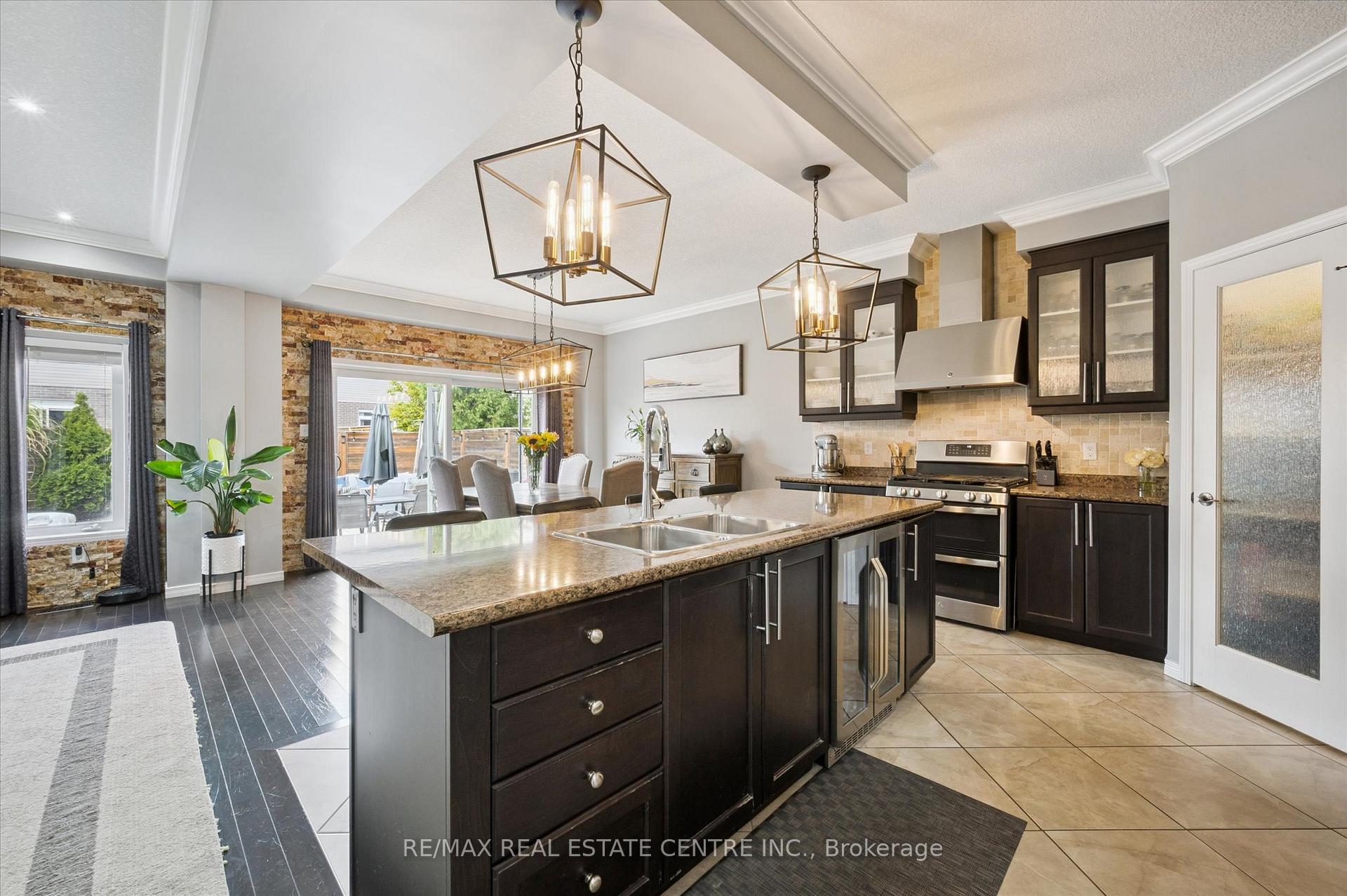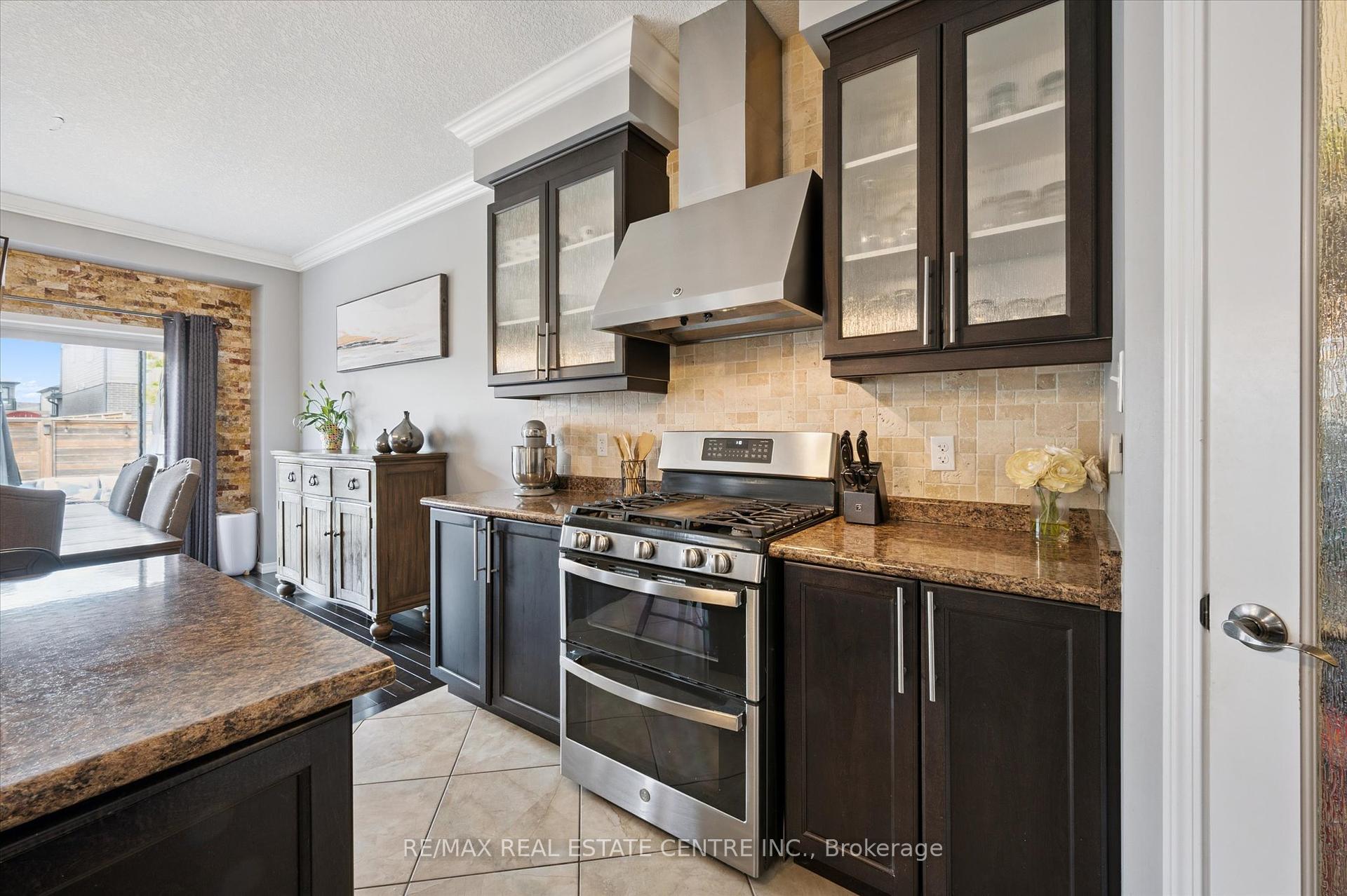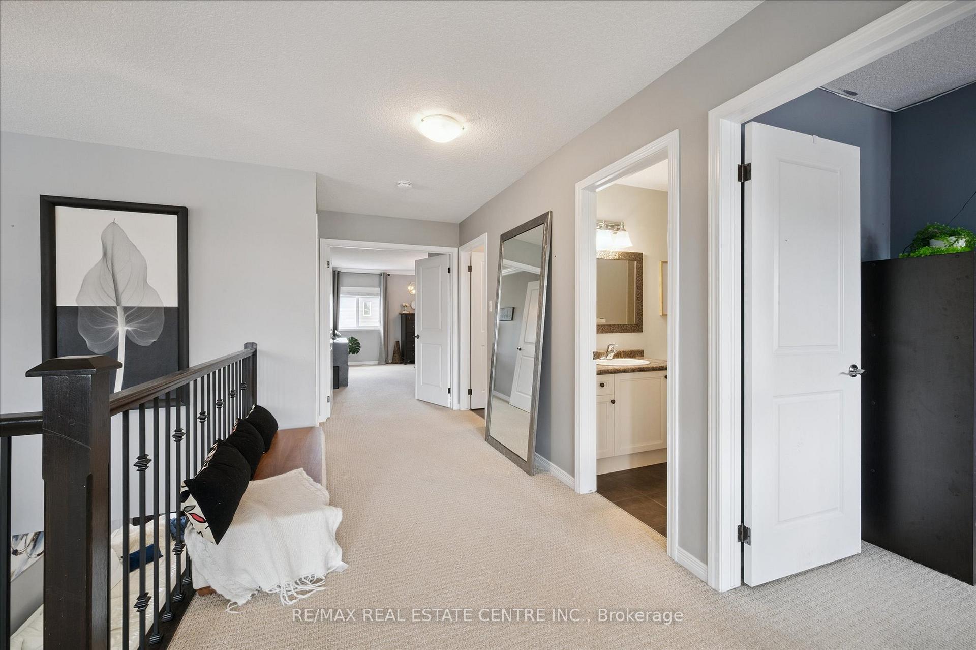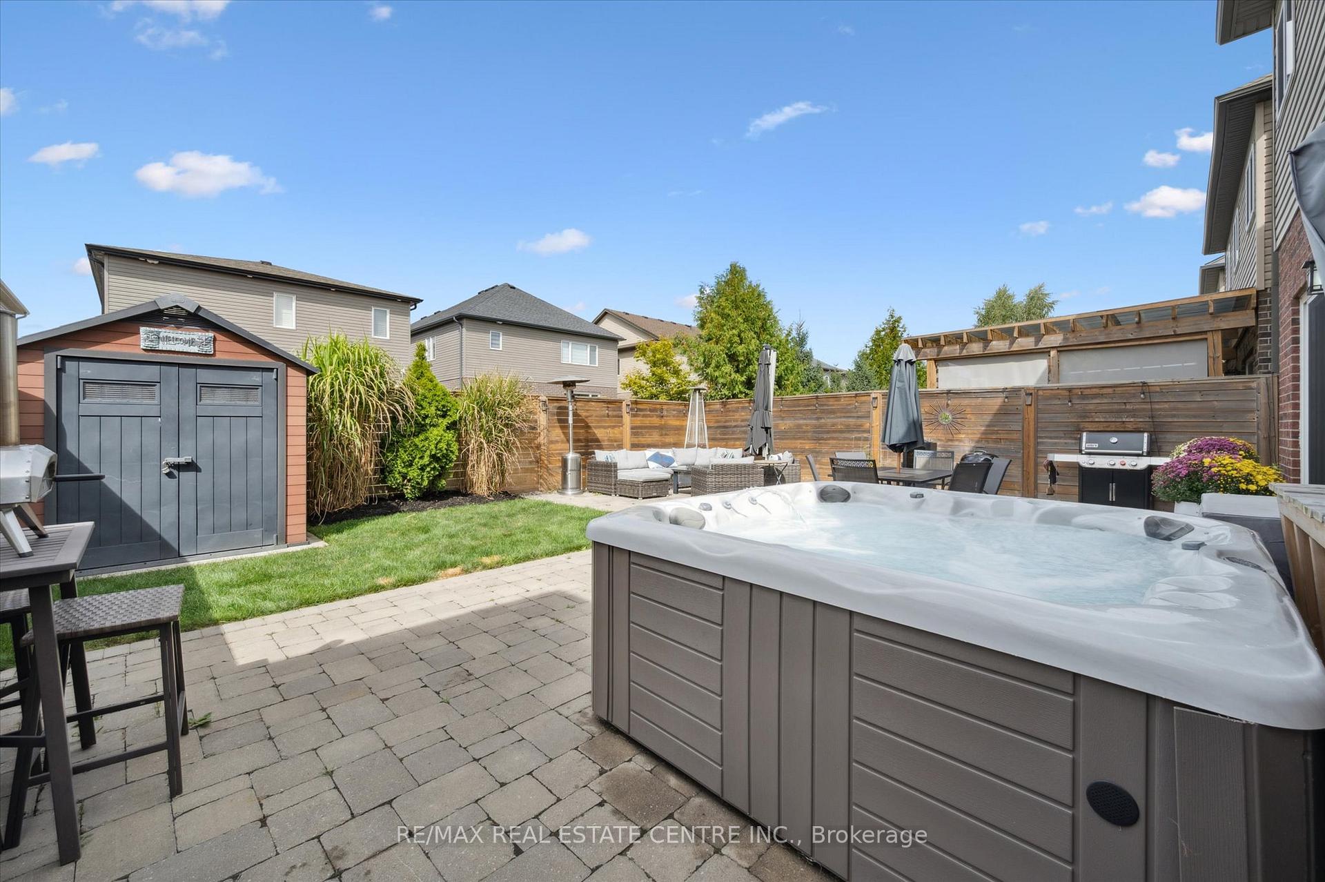 Welcome to Highland Ridge in West Galt! This 3-bedroom, 3-bathroom home offers over 2,279 sq. ft. of living space on a 36 x 105 ft. lot, combining comfort and style inside and out. The redesigned front exterior features a custom front door with upgraded inserts, tumbled stone columns, armour stone steps leading to the covered porch, and perennial gardens framed by interlock french curbs. Step inside to find 9 ft. ceilings, crown molding, pot lighting, and a mix of hardwood and oversized ceramic flooring. The upgraded dark maple kitchen is a standout with extended cabinetry, a walk-in pantry with french door, sit-up island and stainless-steel range hood. The open living and dining area is anchored by a stone accent wall and oversized sliders leading to the fully fenced backyard. Outside, enjoy a low-maintenance space with interlock patio, hot tub, wrought iron gates, and a shed with hydro. Upstairs, a spacious family room with bright windows and wrought iron railings offers the perfect gathering spot. The primary suite features a walk-in closet, crown molding, and a private 3-piece ensuite. Two additional bedrooms, a 4-piece bath, laundry, and large linen closet complete the second floor. Located minutes from downtown Galt, schools, parks, trails, shopping, and golf.