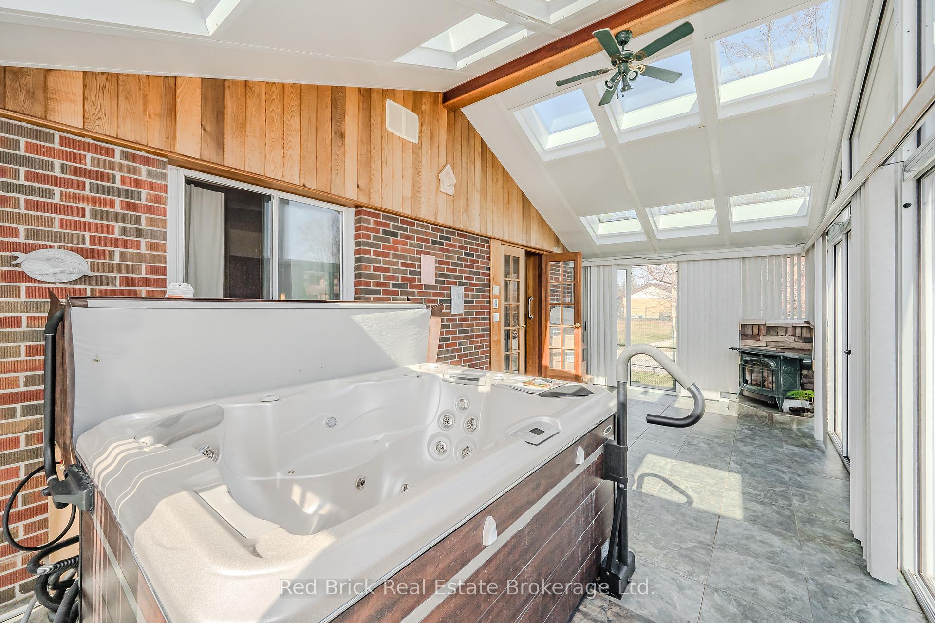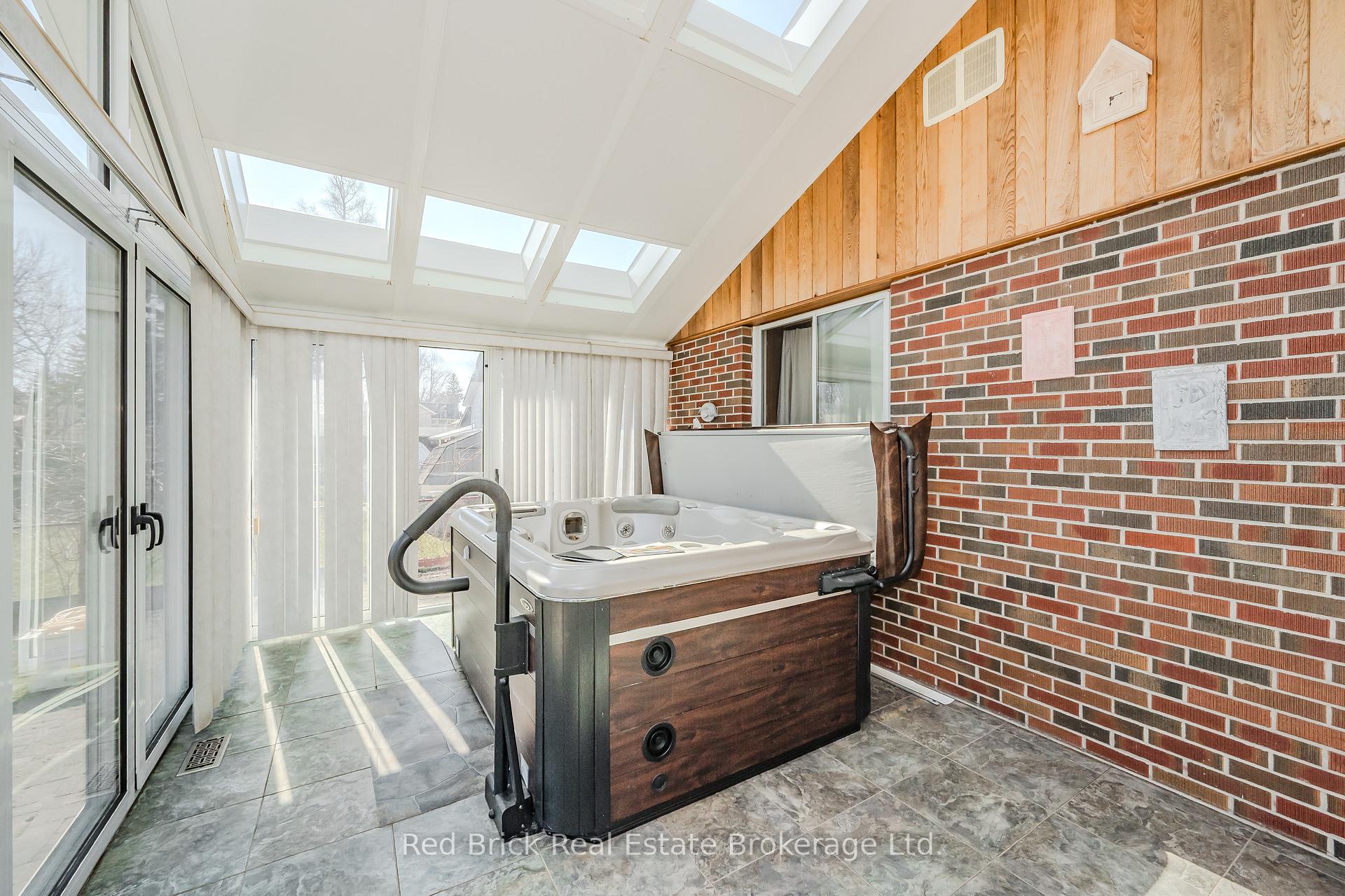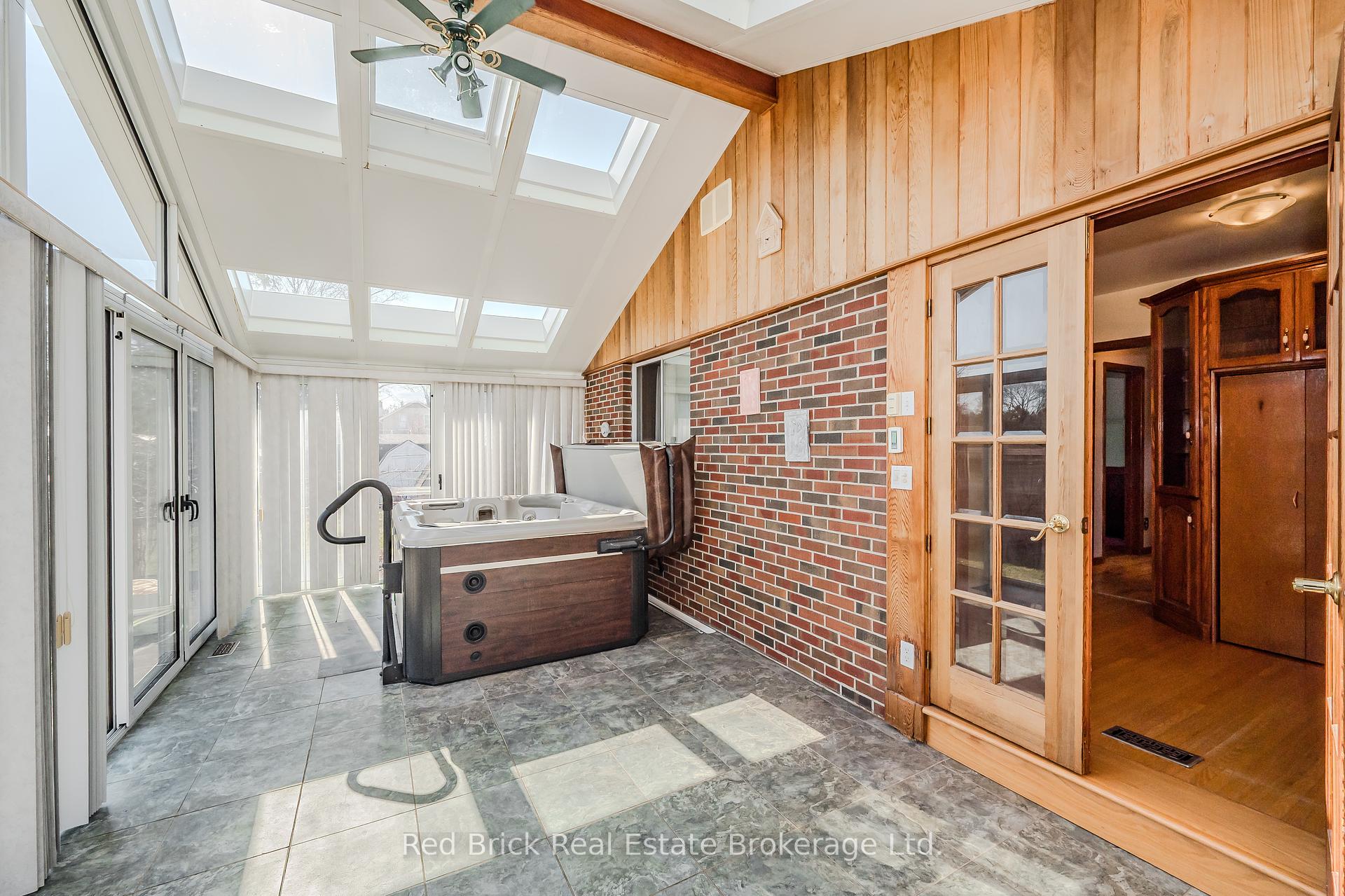 LOCATION: Welcome to your family-friendly brick bungalow in the friendly neighborhood close to shopping, hospital, schools, church, plus more. Two bedrooms plus an office and a lovely sunroom with a gas fireplace and hot tub for your time to relax after a hard day at work. Main floor features newer cupboards, granite countertop, original hardwood floors, plaster construction. New 4 pc bath with ceramic heated floors. Basement finished with family room, fireplace, central vacuum plus a room that could be used as a bedroom. Single attached garage. The home is equipped with stair lift at front and also one for the basement. BOTH STAIR LIFTS CAN BE REMOVED.