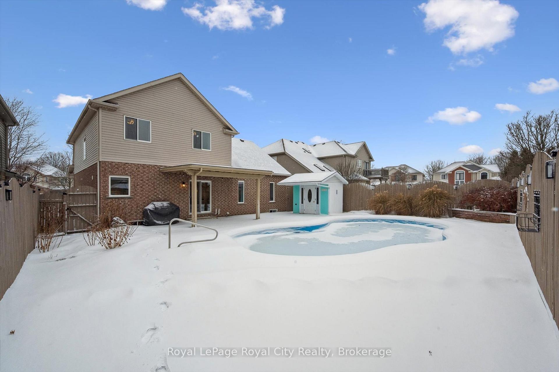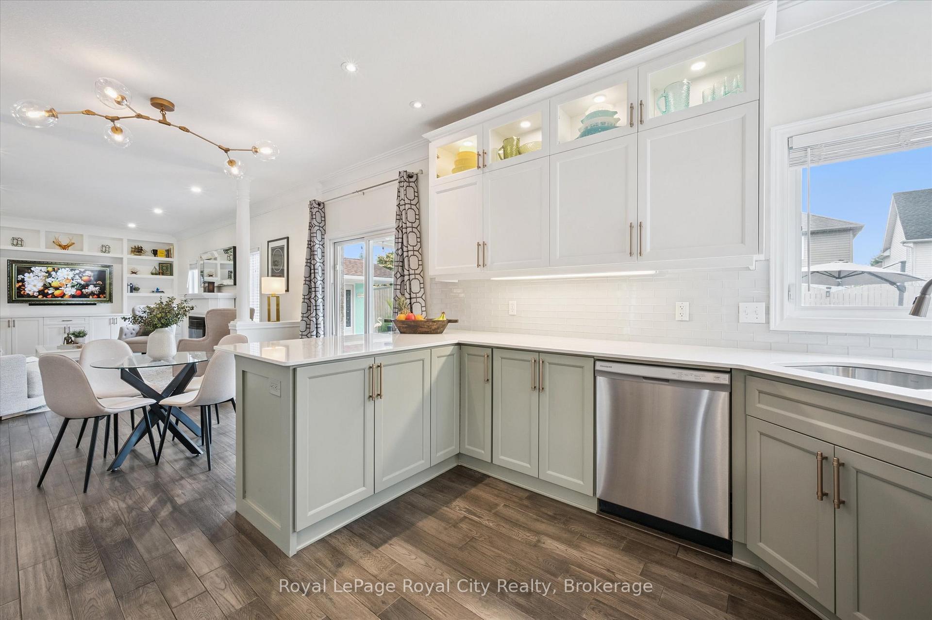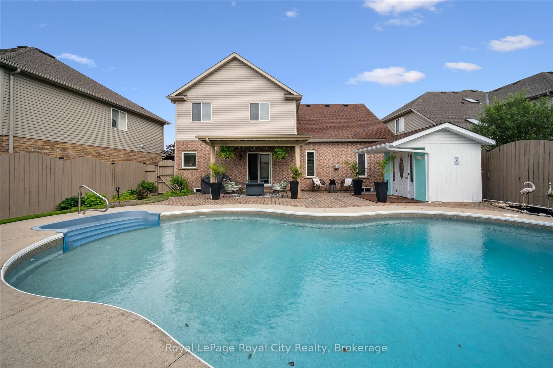 Stylishly Updated for Modern Living! Located in Guelphs sought-after south end, this beautifully upgraded home offers over 3,000 sqft of finished living space, including 3 bedrooms and 4 bathrooms perfect for todays busy family. With undeniable curb appeal, the home welcomes you with a charming covered porch and double-door entry into a bright, inviting foyer. The first floor boasts soaring 9-foot ceilings and hardwood floors, which continue throughout the second level. The formal dining room sets the tone for elegant entertaining, featuring full-height paneling, crown molding, and a striking contemporary chandelier.The heart of the home is the showstopping eat-in kitchen, complete with two-tone cabinetry, quartz countertops, stainless steel appliances, and a sunny breakfast area with walkout to the backyard. A cozy family room anchored by a gas fireplace and custom built-in bookshelves is the perfect space to unwind. Upstairs, rich hardwood flooring continues throughout, leading to the luxurious primary suite with a bay window, walk-in closet, and a spa-like 5-piece ensuite featuring a jetted Jacuzzi tub.The fully finished basement offers exceptional flexibility ideal for a home office, gym, playroom, or guest suite, complete with a full bathroom. Outside, the fully fenced yard is your private retreat, featuring an in-ground pool, mature landscaping, covered patio area, and an insulated pool house with hydro. Recent updates include a new pool liner, cover, heater, and equipment, as well as updated windows, furnace, AC, staircase, flooring, kitchen cabinetry, and much more! Located in a fantastic school district including St. Ignatius, Westminster Woods, St. Paul’s, Sir Issac Brock, and Bishop Mac. The house is near parks, amenities, and the 401, this home truly has it all.