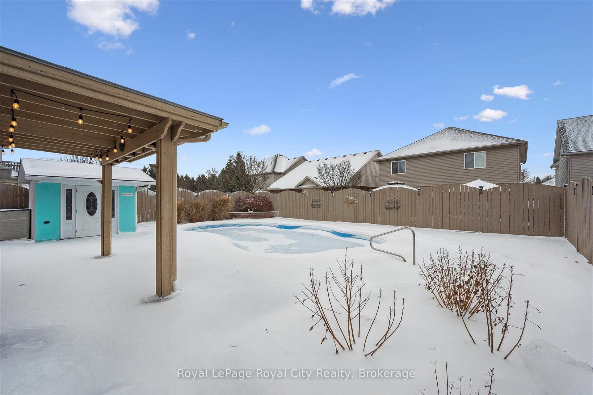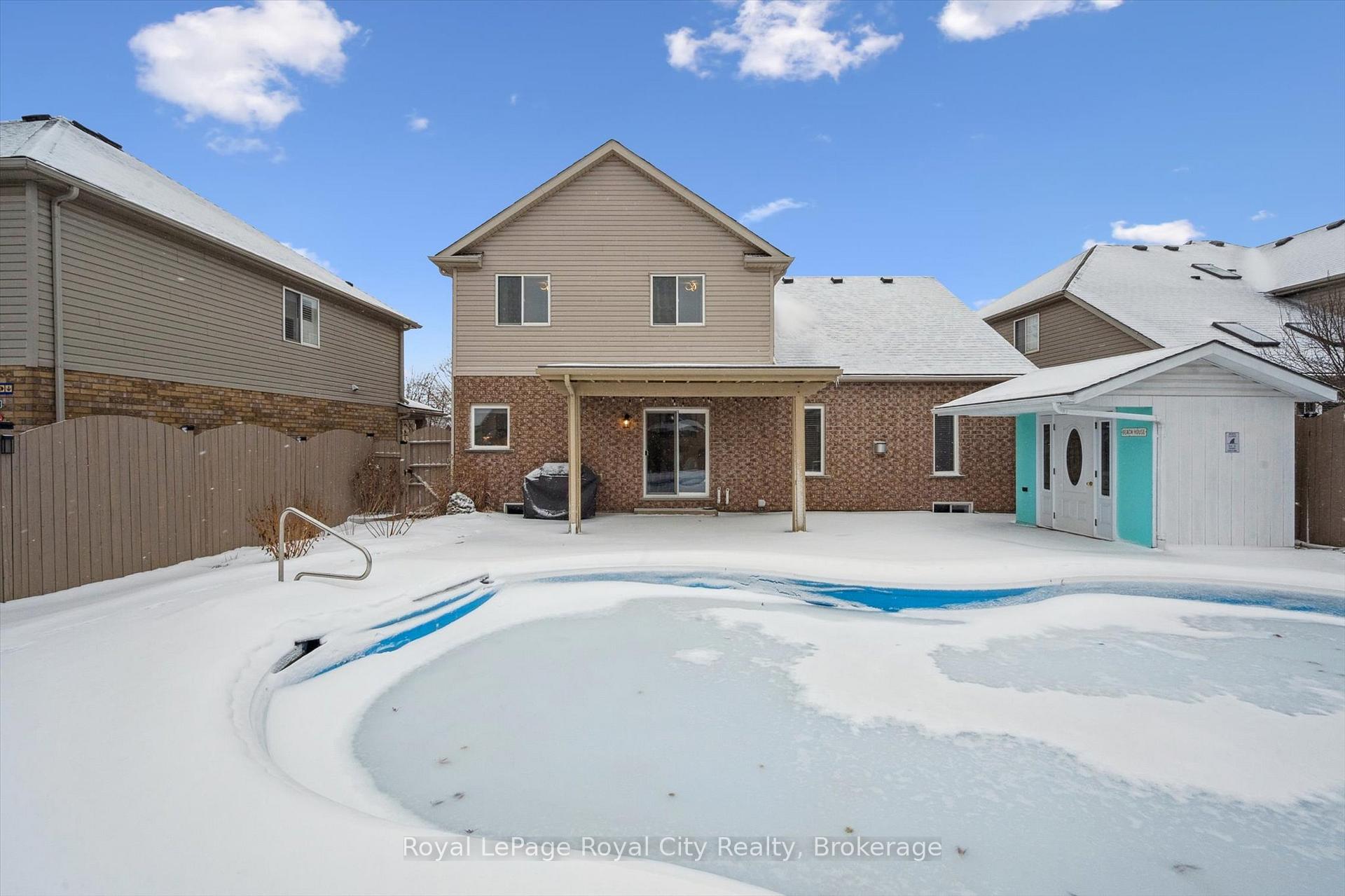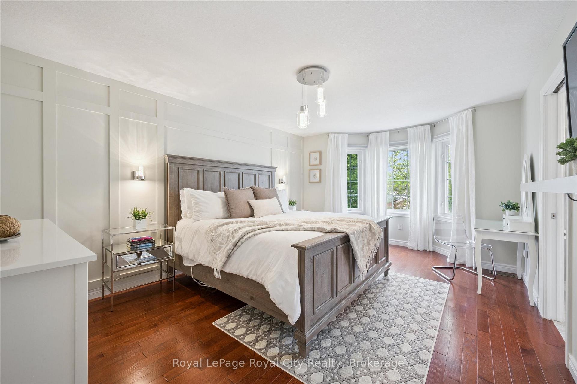 Stylishly Updated for Modern Living! Located in Guelphs sought-after south end, this beautifully upgraded home offers over 3,000 sqft of finished living space, including 3 bedrooms and 4 bathrooms perfect for todays busy family. With undeniable curb appeal, the home welcomes you with a charming covered porch and double-door entry into a bright, inviting foyer. The first floor boasts soaring 9-foot ceilings and hardwood floors, which continue throughout the second level. The formal dining room sets the tone for elegant entertaining, featuring full-height paneling, crown molding, and a striking contemporary chandelier.The heart of the home is the showstopping eat-in kitchen, complete with two-tone cabinetry, quartz countertops, stainless steel appliances, and a sunny breakfast area with walkout to the backyard. A cozy family room anchored by a gas fireplace and custom built-in bookshelves is the perfect space to unwind. Upstairs, rich hardwood flooring continues throughout, leading to the luxurious primary suite with a bay window, walk-in closet, and a spa-like 5-piece ensuite featuring a jetted Jacuzzi tub.The fully finished basement offers exceptional flexibility ideal for a home office, gym, playroom, or guest suite, complete with a full bathroom. Outside, the fully fenced yard is your private retreat, featuring an in-ground pool, mature landscaping, covered patio area, and an insulated pool house with hydro. Recent updates include a new pool liner, cover, heater, and equipment, as well as updated windows, furnace, AC, staircase, flooring, kitchen cabinetry, and much more! Located in a fantastic school district including St. Ignatius, Westminster Woods, St. Paul’s, Sir Issac Brock, and Bishop Mac. The house is near parks, amenities, and the 401, this home truly has it all.