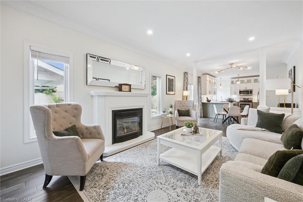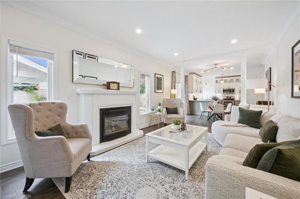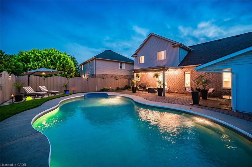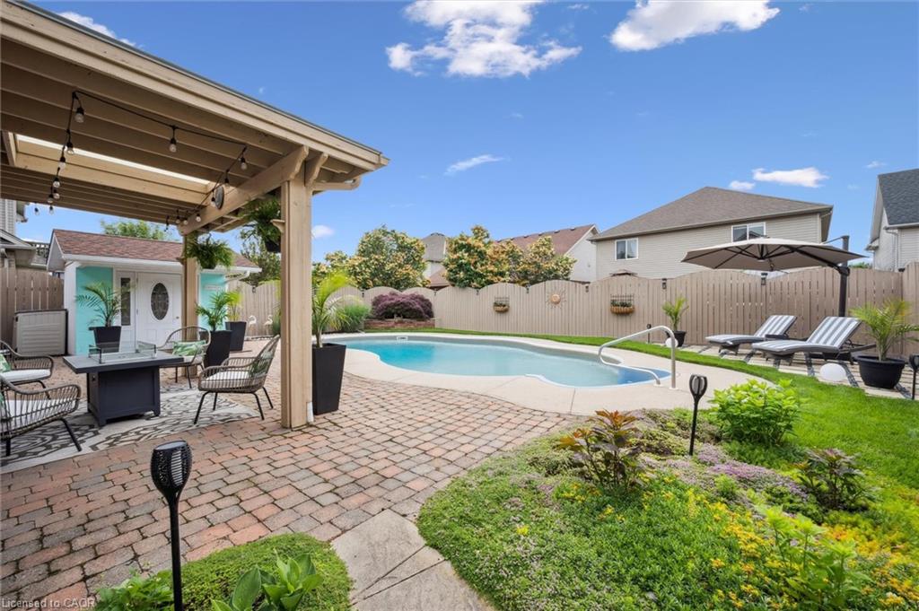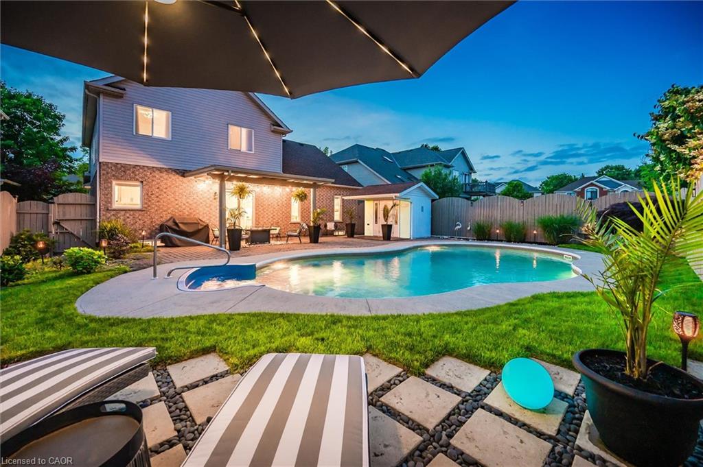 Stylishly Updated for Modern Living! Located in Guelphs sought-after south end, this beautifully upgraded home offers over 3,000 sqft of finished living space, including 3 bedrooms and 4 bathrooms perfect for todays busy family. With undeniable curb appeal, the home welcomes you with a charming covered porch and double-door entry into a bright, inviting foyer. The first floor boasts soaring 9-foot ceilings and hardwood floors, which continue throughout the second level. The formal dining room sets the tone for elegant entertaining, featuring full-height paneling, crown molding, and a striking contemporary chandelier.The heart of the home is the showstopping eat-in kitchen, complete with two-tone cabinetry, quartz countertops, stainless steel appliances, and a sunny breakfast area with walkout to the backyard. A cozy family room anchored by a gas fireplace and custom built-in bookshelves is the perfect space to unwind. Upstairs, rich hardwood flooring continues throughout, leading to the luxurious primary suite with a bay window, walk-in closet, and a spa-like 5-piece ensuite featuring a jetted Jacuzzi tub.The fully finished basement offers exceptional flexibility ideal for a home office, gym, playroom, or guest suite, complete with a full bathroom. Outside, the fully fenced yard is your private retreat, featuring an in-ground pool, mature landscaping, covered patio area, and an insulated pool house with hydro. Recent updates include a new pool liner, cover, heater, and equipment, as well as updated windows, furnace, AC, staircase, flooring, kitchen cabinetry, and much more! Located in a fantastic school district including St. Ignatius, Westminster Woods, St. Paul’s, Sir Issac Brock, and Bishop Mac. The house is near parks, amenities, and the 401, this home truly has it all.