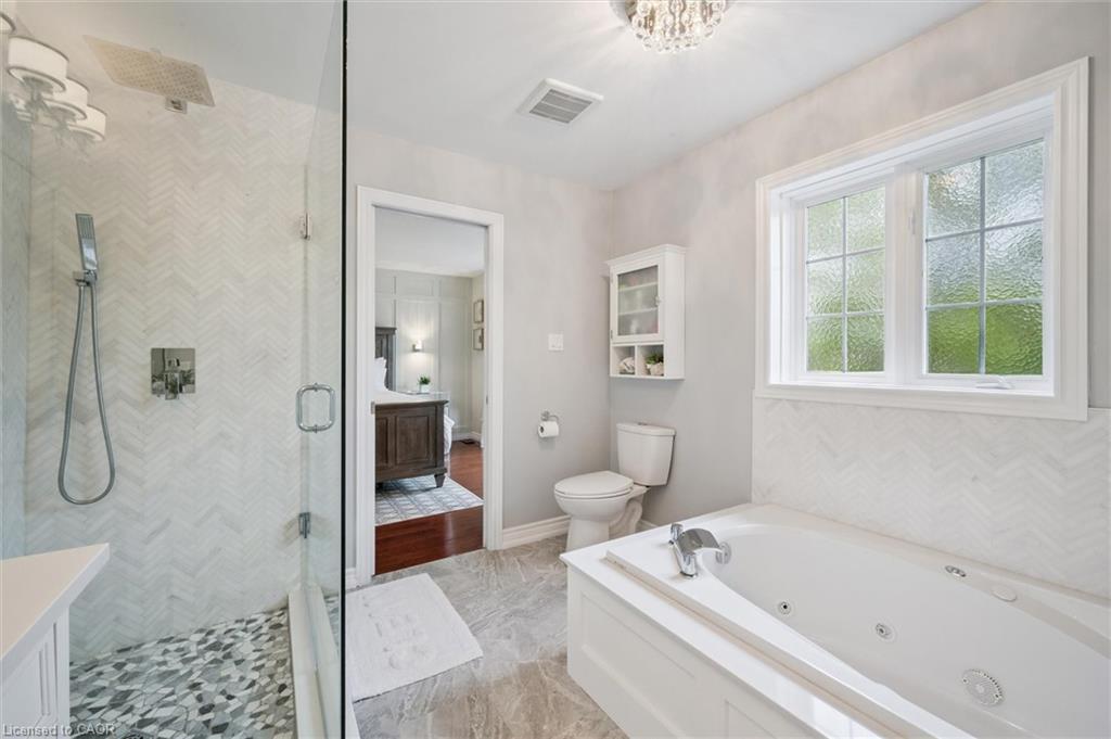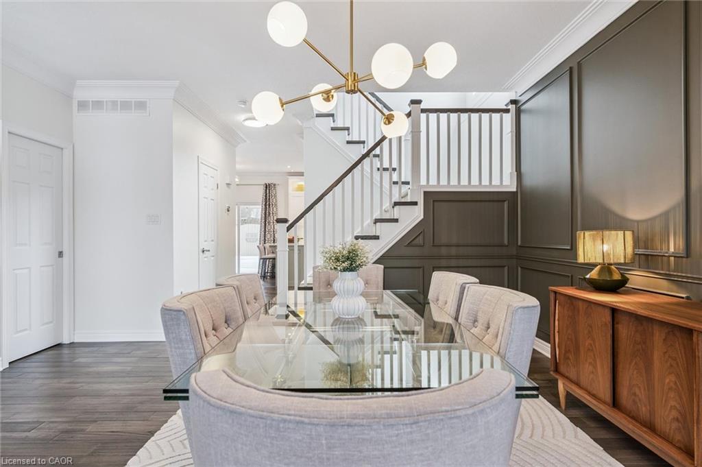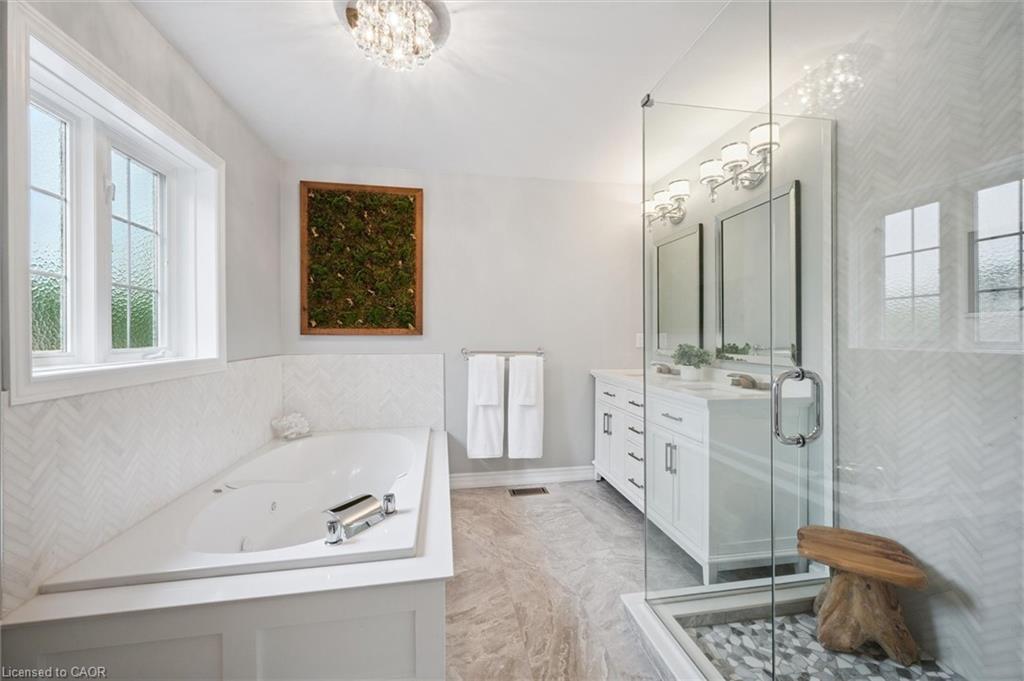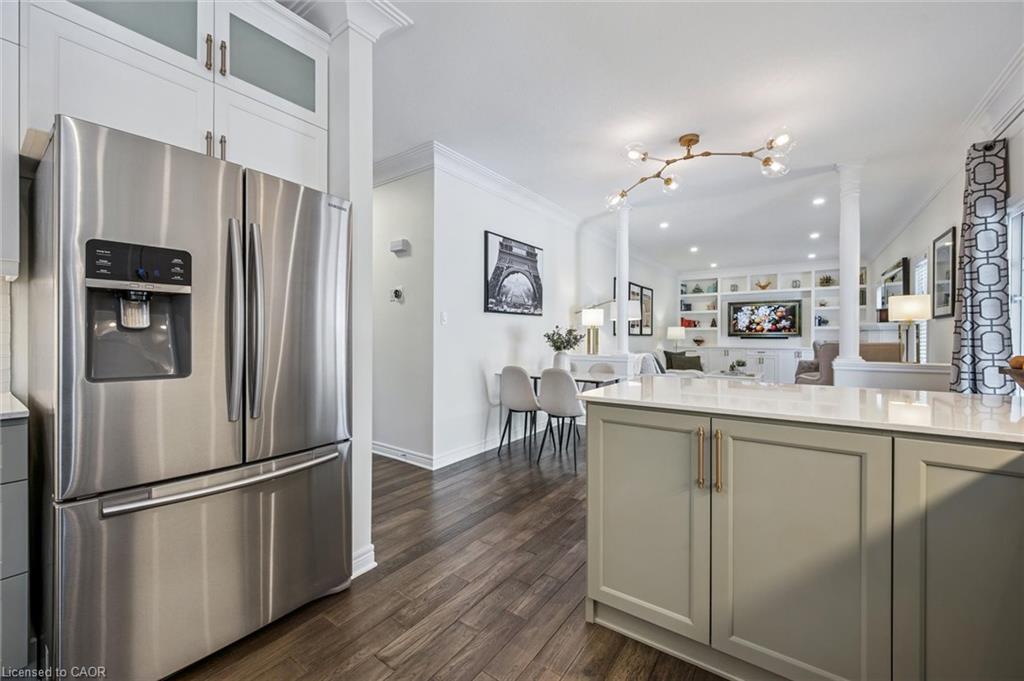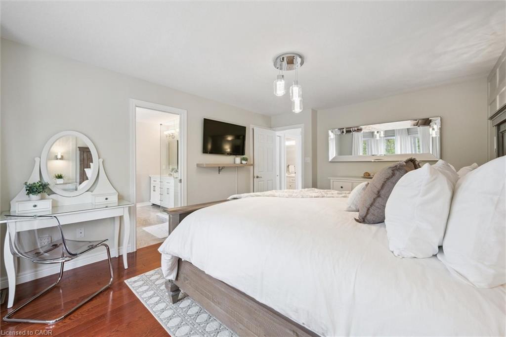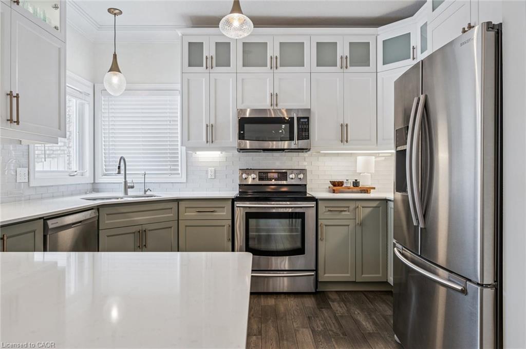 Stylishly Updated for Modern Living! Located in Guelphs sought-after south end, this beautifully upgraded home offers over 3,000 sqft of finished living space, including 3 bedrooms and 4 bathrooms perfect for todays busy family. With undeniable curb appeal, the home welcomes you with a charming covered porch and double-door entry into a bright, inviting foyer. The first floor boasts soaring 9-foot ceilings and hardwood floors, which continue throughout the second level. The formal dining room sets the tone for elegant entertaining, featuring full-height paneling, crown molding, and a striking contemporary chandelier.The heart of the home is the showstopping eat-in kitchen, complete with two-tone cabinetry, quartz countertops, stainless steel appliances, and a sunny breakfast area with walkout to the backyard. A cozy family room anchored by a gas fireplace and custom built-in bookshelves is the perfect space to unwind. Upstairs, rich hardwood flooring continues throughout, leading to the luxurious primary suite with a bay window, walk-in closet, and a spa-like 5-piece ensuite featuring a jetted Jacuzzi tub.The fully finished basement offers exceptional flexibility ideal for a home office, gym, playroom, or guest suite, complete with a full bathroom. Outside, the fully fenced yard is your private retreat, featuring an in-ground pool, mature landscaping, covered patio area, and an insulated pool house with hydro. Recent updates include a new pool liner, cover, heater, and equipment, as well as updated windows, furnace, AC, staircase, flooring, kitchen cabinetry, and much more! Located in a fantastic school district including St. Ignatius, Westminster Woods, St. Paul’s, Sir Issac Brock, and Bishop Mac. The house is near parks, amenities, and the 401, this home truly has it all.