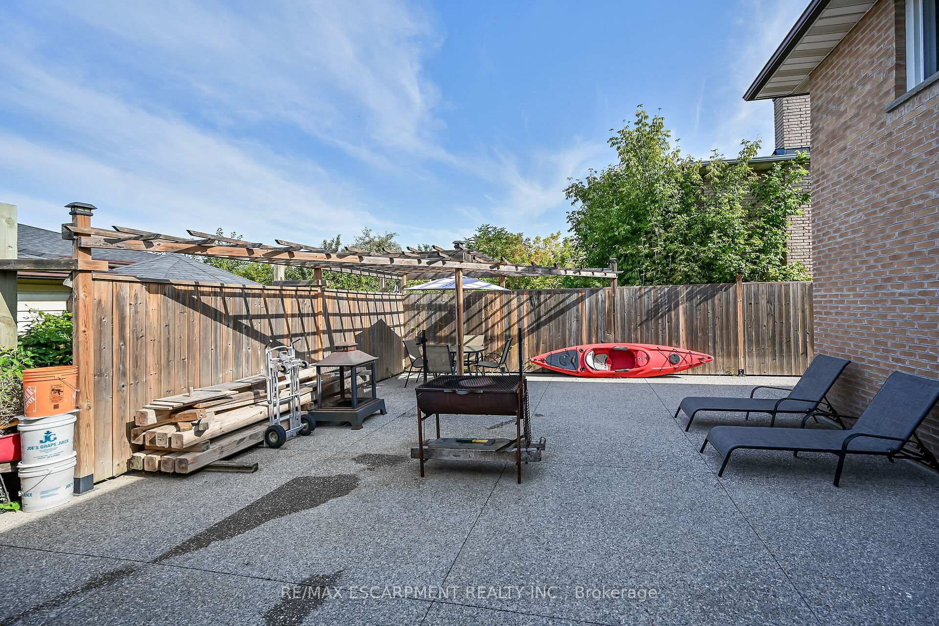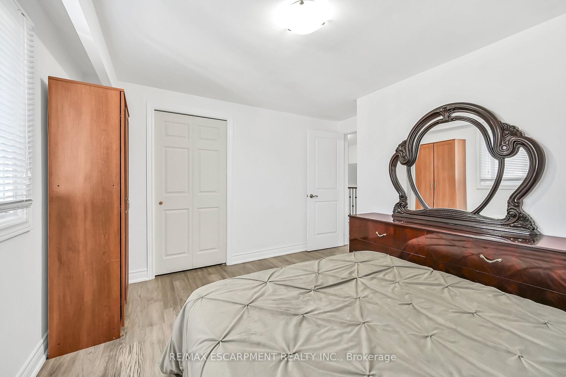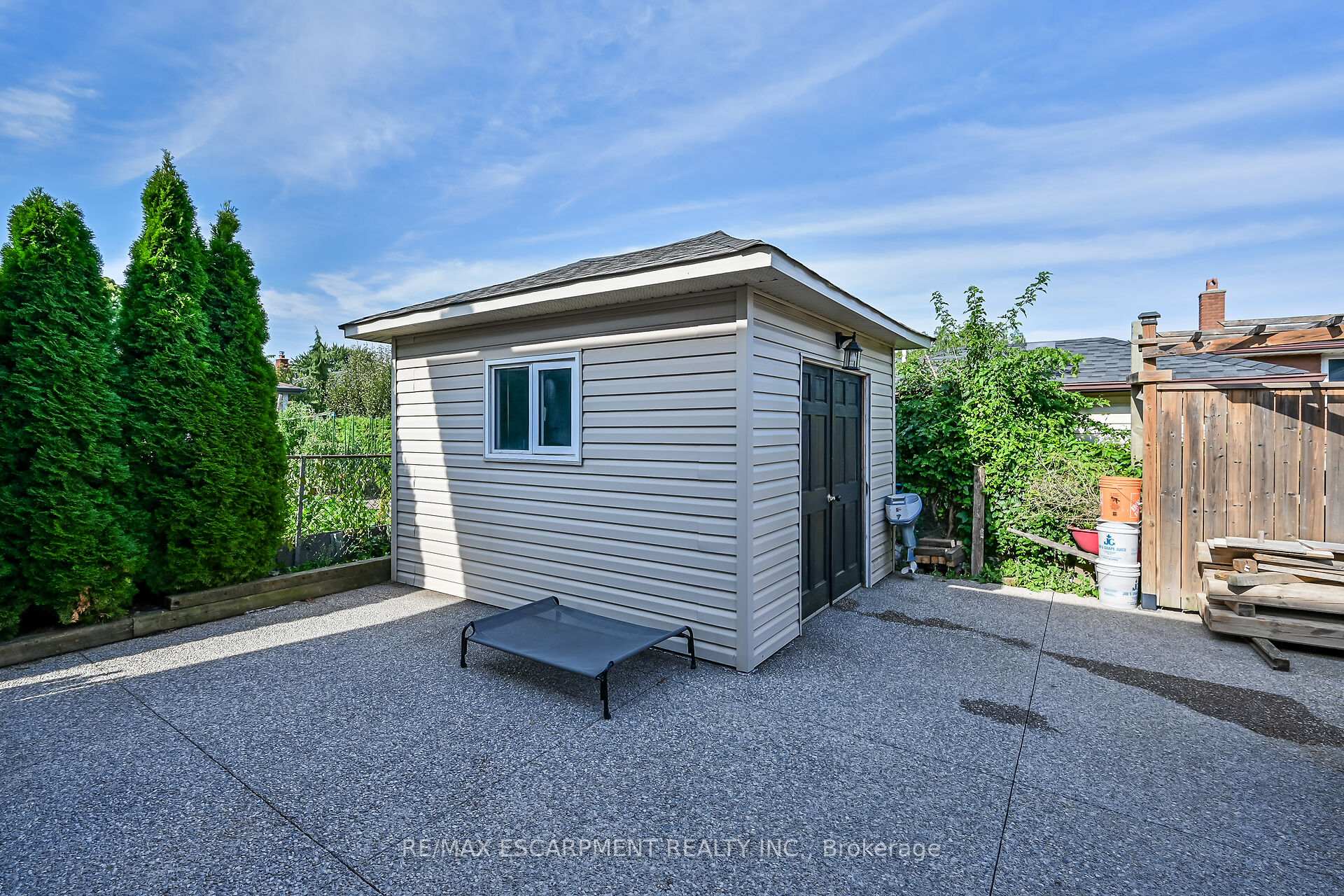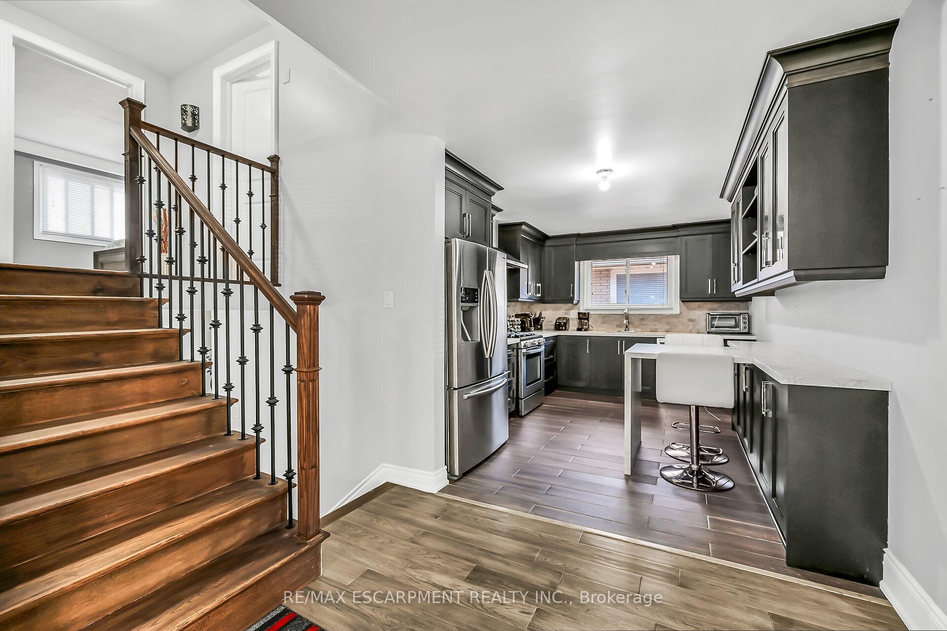 This spacious 4 level back-split has been renovated inside and out with quality finishes and attention to detail. Bright, open-concept main level with hardwood floors, spacious living/dining room, and custom kitchen with quartz counters, backsplash, and stainless steel appliances including gas stove. The upper level offers 3 bedrooms and a stunning 5-pc bath. Lower level features a family room with walkout to yard, side door entrance, bedroom, and 3-pc bath. The finished basement includes a rec room, laundry, cold room, and storage. Updated furnace, AC, roof, windows & electrical. The exterior boasts exposed aggregate driveway, walkways, porch with glass railings, fenced yard, and large shed with hydro. Located in a quiet cul-de-sac location with escarpment views, close to parks, trails, schools, and easy Red Hill/highway access.