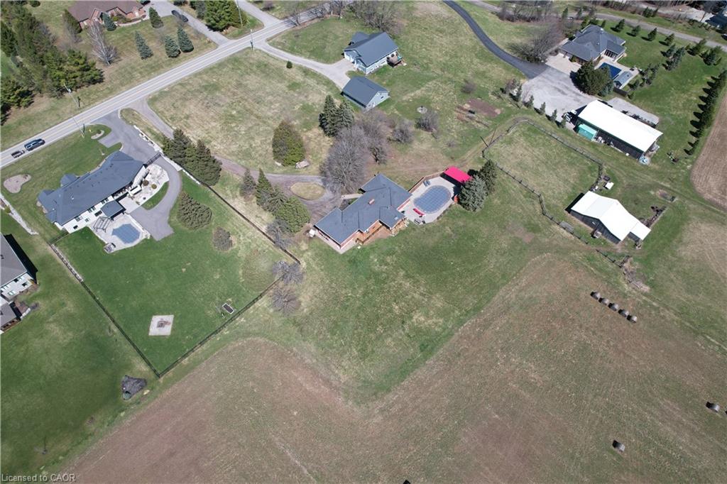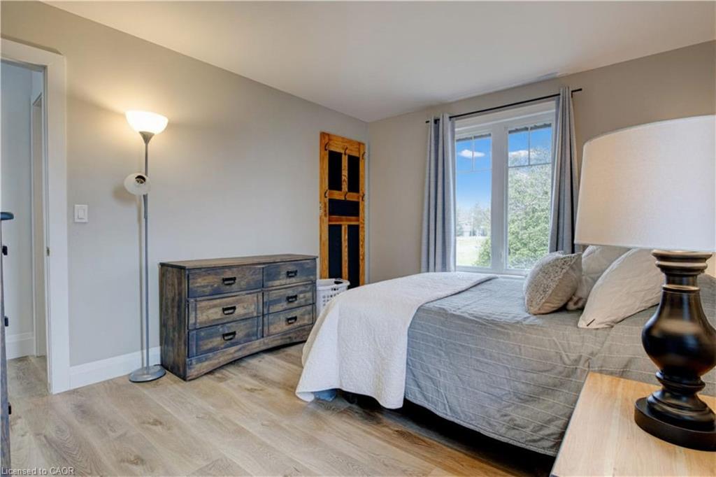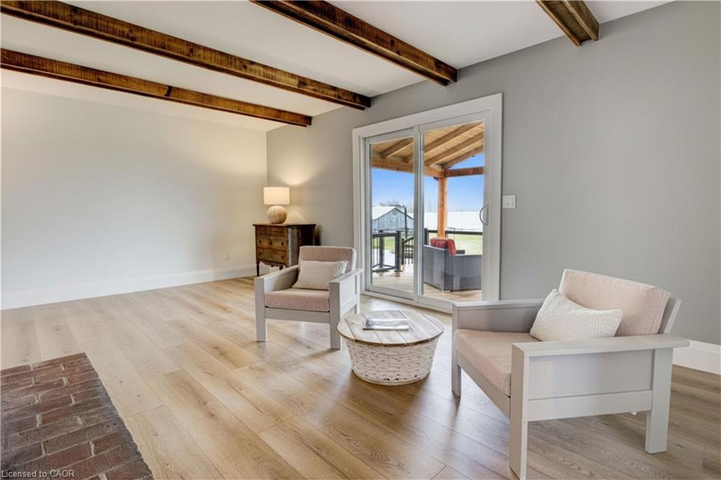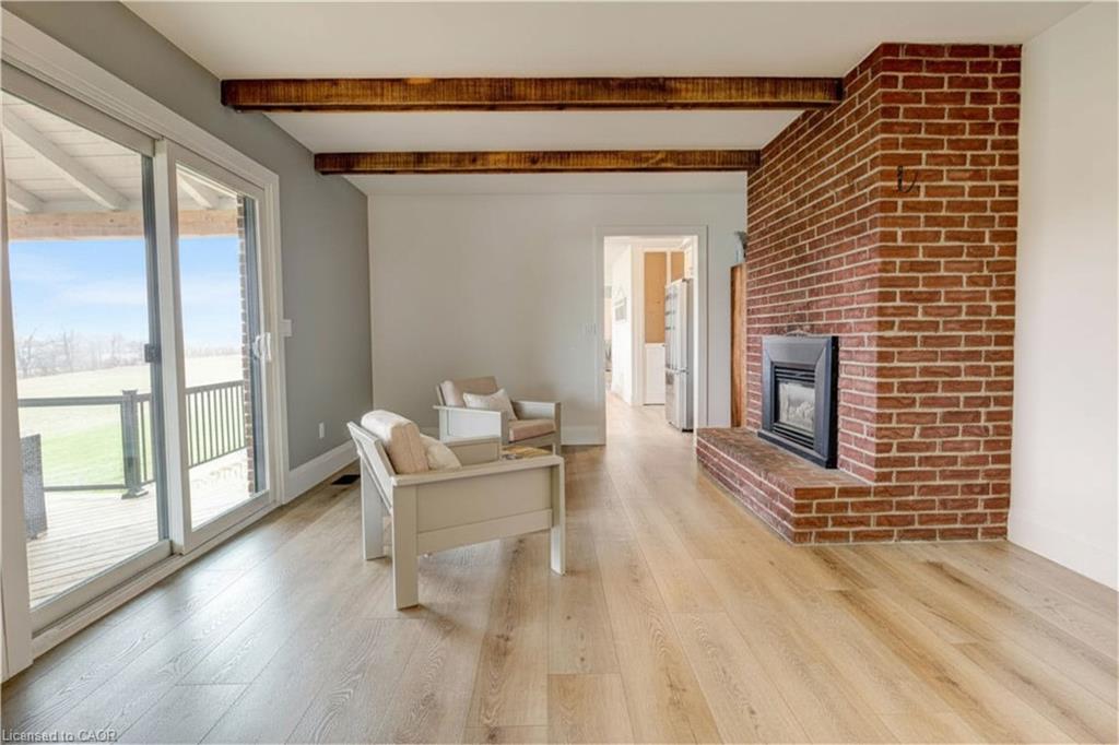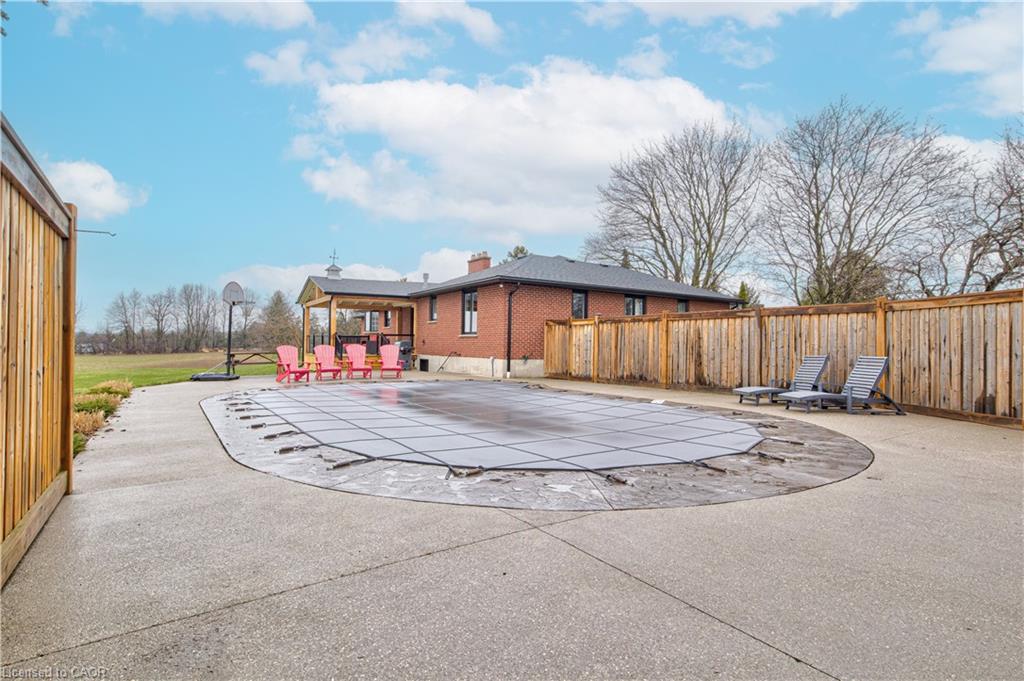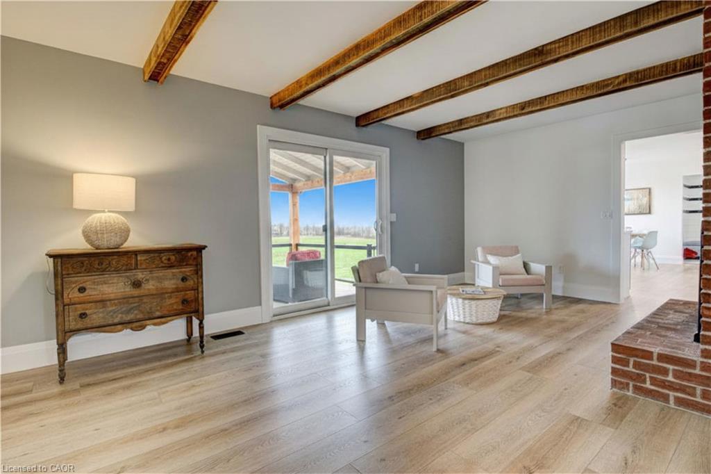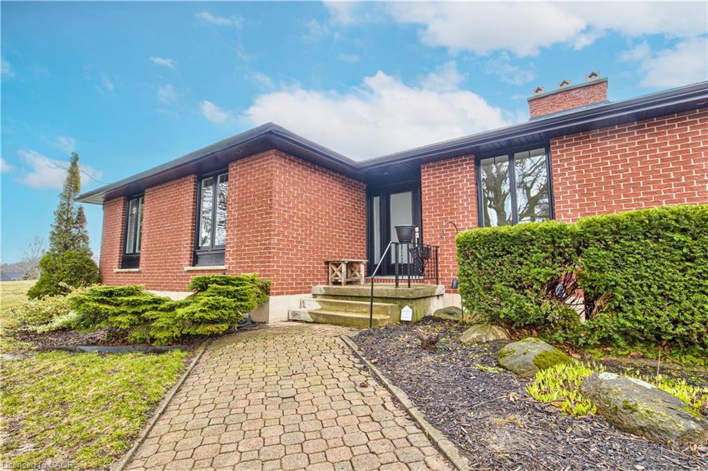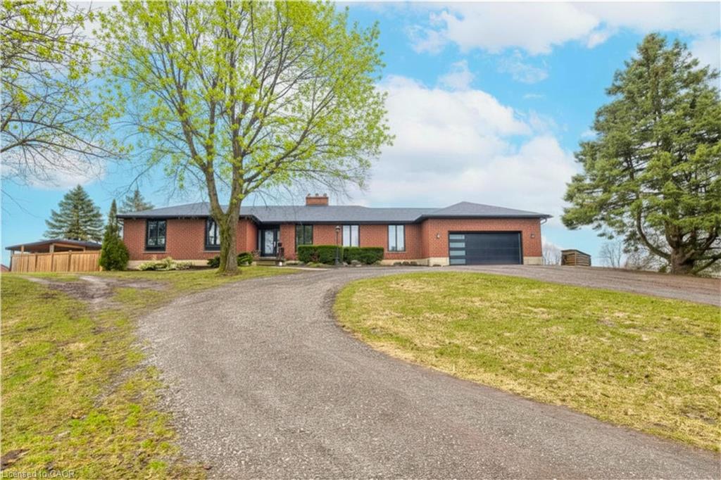 Set back from the road with a circular driveway offering parking for 20+, this renovated all-brick bungalow sits on 16 acres of scenic countryside. With 5 bedrooms and 3 bathrooms, including a private ensuite, the home offers space for the whole family. The main floor features wide plank luxury vinyl flooring, new oversized windows, new doors, and a bright, functional layout. Enjoy a spacious living room, a separate dining area, and a large dine-in kitchen with updated countertops and backsplash. A mudroom off the double garage includes a powder room and refreshed laundry space for everyday convenience. The beamed ceiling family room with a gas fireplace opens to a new covered deck, an ideal spot to take in panoramic views stretching across open fields to the forest edge. Downstairs, the partially finished basement includes a fifth bedroom and plenty of space for future development, along with ample storage. Outside, the fully updated inground pool (liner, pump, filter, heater, and safety cover) is ready for summer, complemented by a bar cabana. The barn offers three horse stalls and a grazing area, currently used for storage. Rarely found in a rural setting, this property features municipal water and gas heating, with easy access to St. George, Cambridge, Paris, and Brantford. With potential for land severance at the front, this is a unique opportunity to enjoy peaceful country living with added flexibility for the future. A home like this doesn’t come along often.