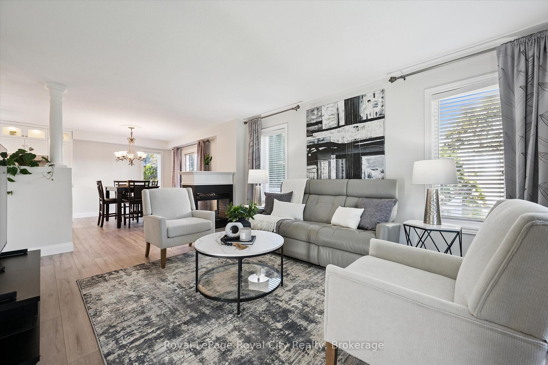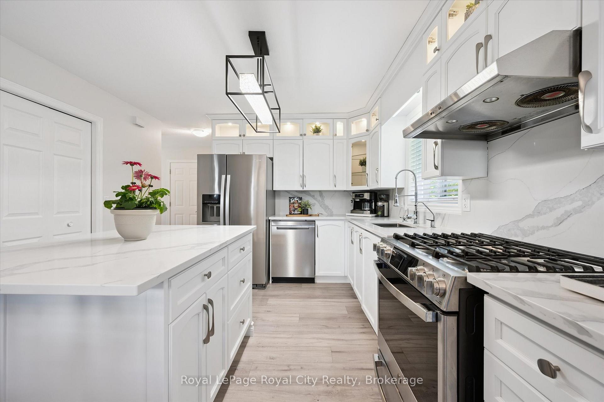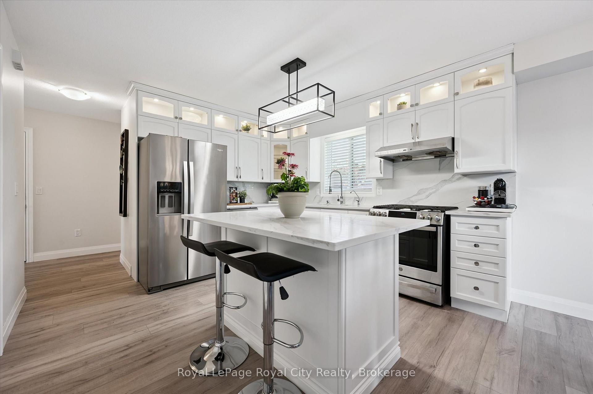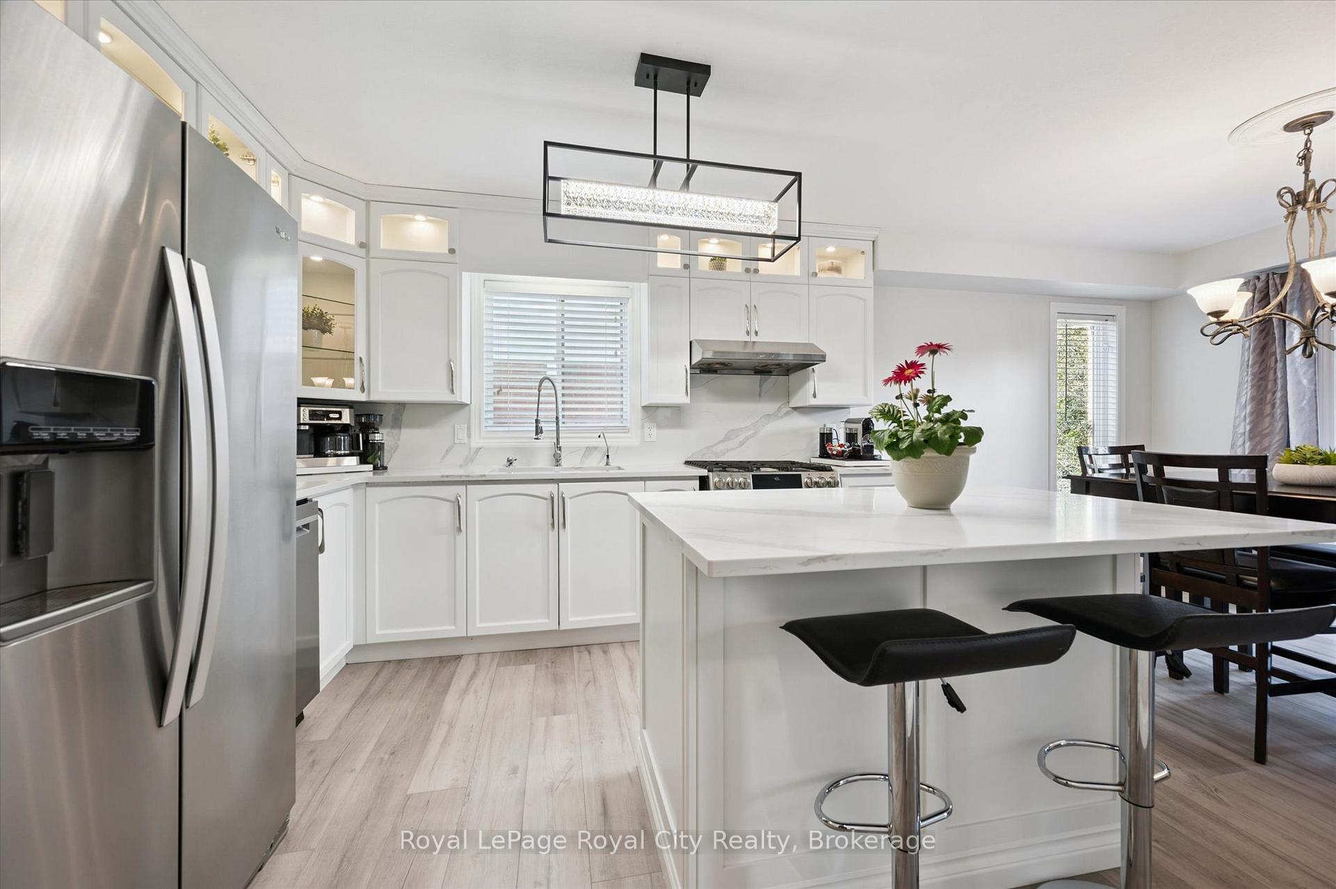 Transformed inside and out, this stunning south-end home is a showcase of quality craftsmanship, thoughtful design, and extensive upgrades. Located in one of Pine Ridge’s most desirable neighbourhoods, it offers exceptional curb appeal and a truly move-in-ready experience. Purchased in 2017 and extensively reimagined since, nearly every inch has been upgraded. The redesigned driveway, hardscape, and professional landscaping complement the home’s distinctive architecture. Inside, brand-new vinyl flooring (2025) anchors the open-concept main level. The fully renovated kitchen features quartz countertops, full-height cabinetry with glass accents, a walk-in pantry, centre island, and stainless steel appliances (2020-21). A three-sided fireplace connects the kitchen and living room, while patio doors open to a spacious deck ideal for entertaining. Upstairs, hardwood flooring replaces all carpet, including the staircase. The primary suite offers engineered hardwood, a walk-in closet, replaced arched windows, and an updated ensuite with quartz vanity and jetted tub. Two additional bedrooms with hardwood floors share a fully renovated main bath. The finished basement adds a rec room, laundry with cabinetry and sink, built-in shelving in the cold room, generous storage, a bathroom rough-in, and a rare attic-style loft for additional storage. Major system upgrades include furnace, A/C, and tankless water heater (2018), metal roof, replaced windows, owned water softener, refreshed paint, and built-in garage shelving. This is not simply a well-cared-for home – it is a thoroughly renovated residence where the investment has already been made for you! Located on a quiet street in Guelph’s sought-after south end, just steps to conservation lands, scenic trails, excellent schools, parks, and everyday amenities, this home delivers location, luxury, and lasting value. This is more than an upgrade – it’s a complete transformation!