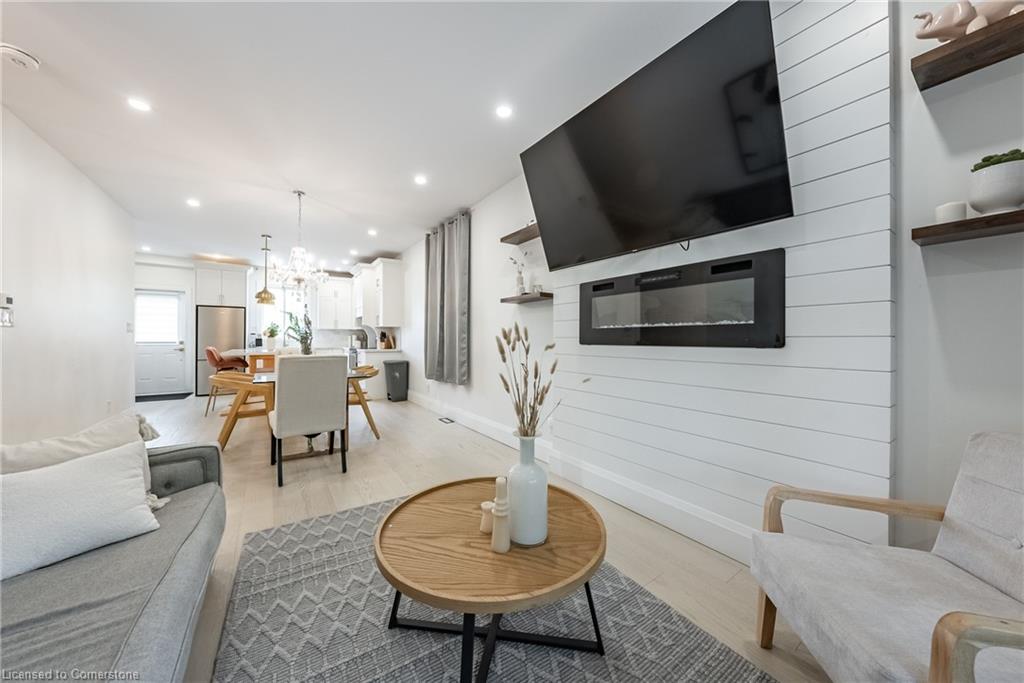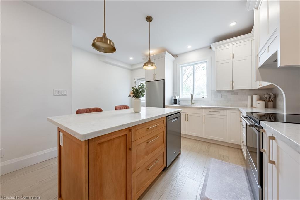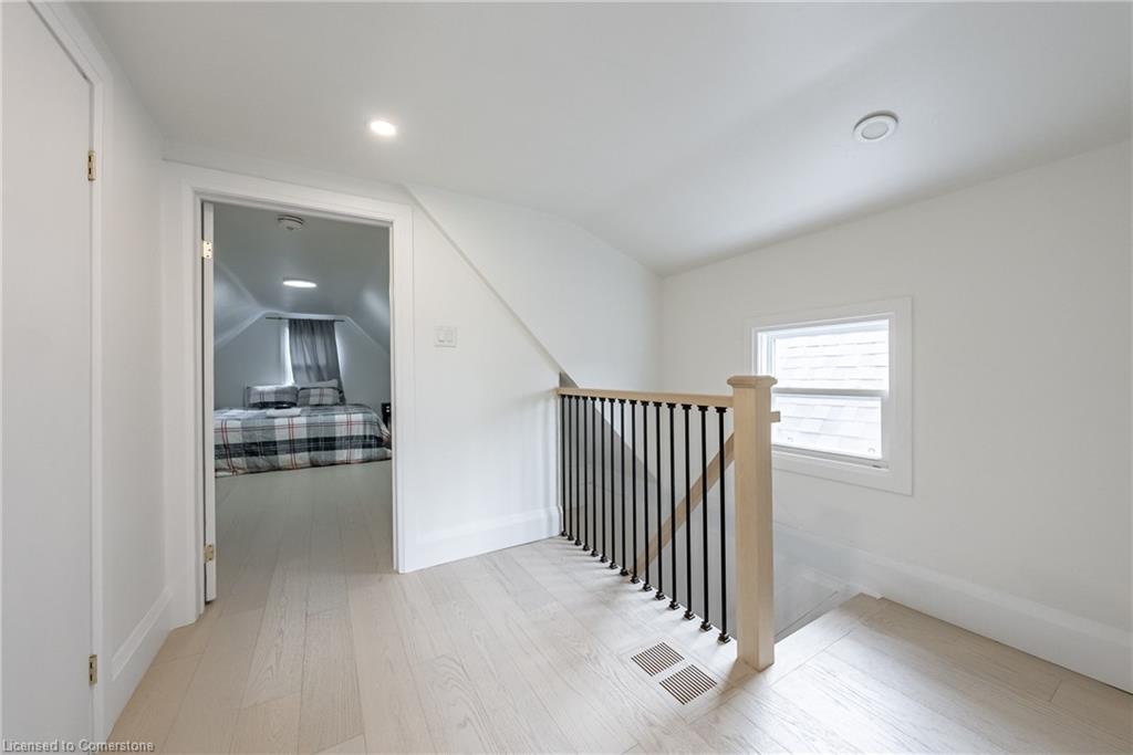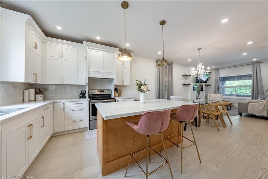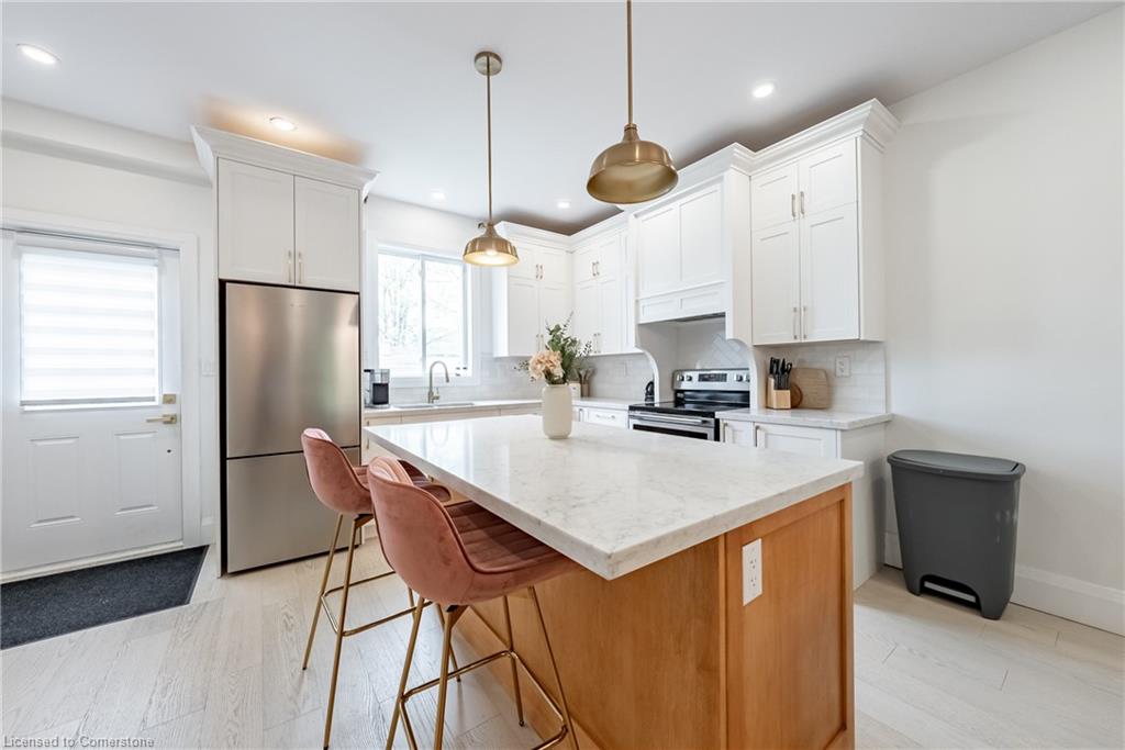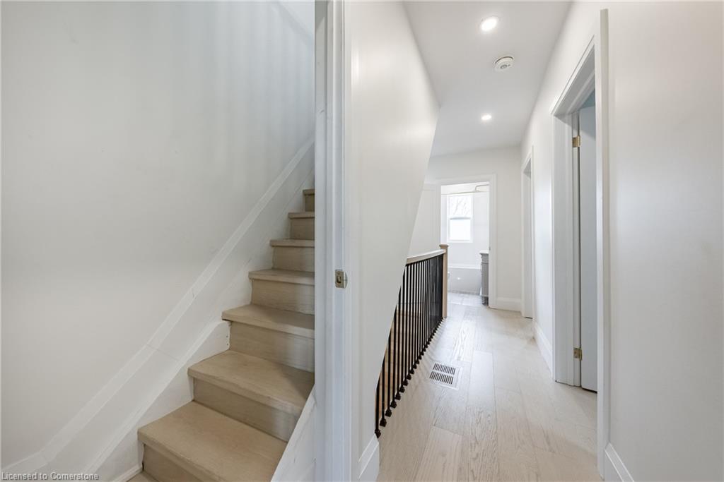 A truly breathtaking, fully renovated century home offering 5 spacious bedrooms and 2 beautifully appointed bathrooms! With its stunning and private curb appeal, this home exudes elegance and charm. Inside, you’ll be captivated by the high-quality finishes, including engineered hardwood flooring, custom cabinetry, and a stunning quartz countertop with an oak-wood island complemented by stylish pendant lighting. The top-of-the-line stainless steel appliances, pot lighting, and built-in electric fireplace with shiplap surround elevate the space to a whole new level. On the second floor, you’ll find 3 generously sized bedrooms, each featuring large windows and ample closet space. A luxurious 4-piece bathroom adds to the sense of sophistication. The second and third floors showcase black spindles and a modern railing, with 2 additional bedrooms that can easily double as a home office, recreation area, or exercise rooms, perfect for versatile living spaces. The full, partially finished basement features a separate entrance, large windows that fill the space with natural light, freshly updated flooring, a convenient laundry area, and a gorgeous 2-piece bathroom.