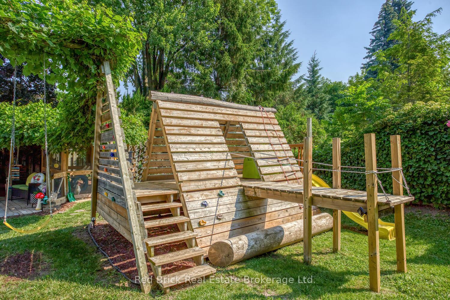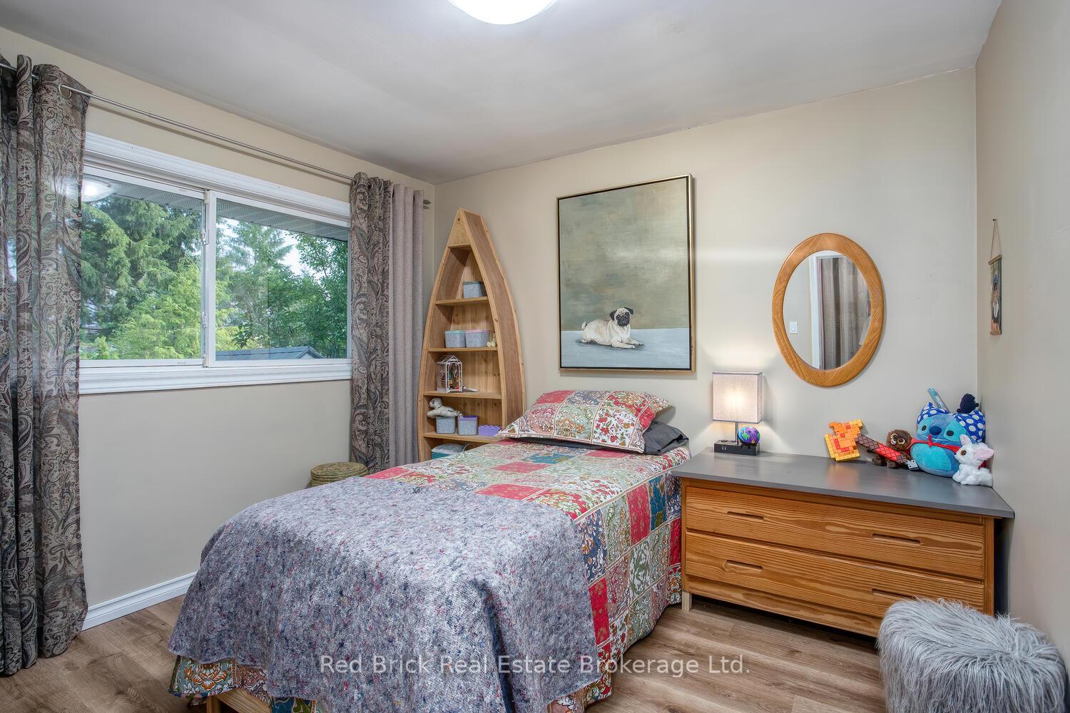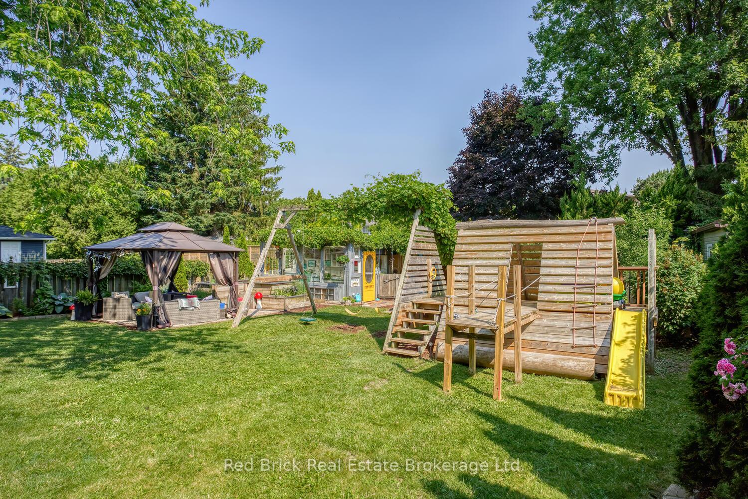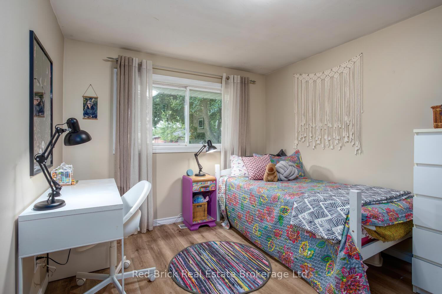 Updated 3 Bedroom SideSplit in Stanley Park with backyard oasis! Perfectly located in the leafy, friendly Stanley Park neighborhood, walk to schools, parks, shopping and conservation area. This updated 3 bedroom sidesplit has a bright, open main floor layout, a huge eat in kitchen with new sliding glass doors, 3 generous bedrooms (the principle bedroom fits a king size bed!), an updated bathroom, and ample closet and storage spaces. The basement is nice and bright thanks to two big windows and has a large finished rec room big enough to also be an office, gym or guest bedroom. The unfinished portion has great storage ( a fabulous crawl storage space under the kitchen) and a huge built in work bench. This home boasts a glorious 56×134 ft lot, fully fenced with delightful play structure, greenhouse, chicken coop and sheds surrounded by mature perennial gardens. Many places to sit and enjoy your privacy or host friends and family for a bbq, picnic or garden party. You may never want to leave your backyard! Furnace and AC 2018, sliding glass doors 2025, luxury vinyl plank flooring 2025, freshly painted throughout. Come and see it today!