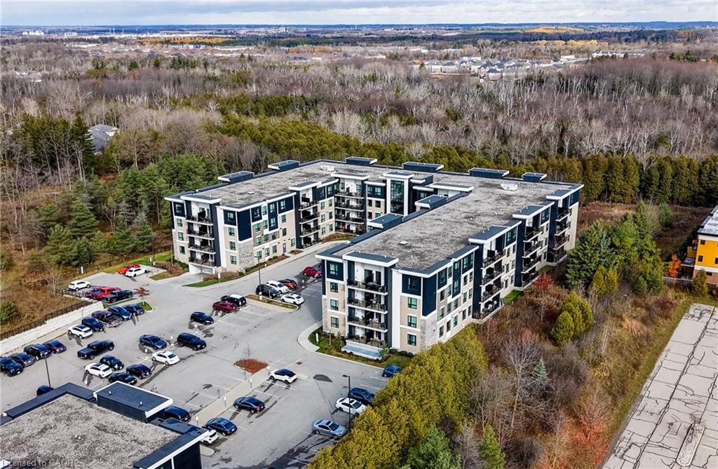 A MODERN RETREAT IN GUELPH’S SOUGHT-AFTER SOUTH END. This condo blends everyday convenience with modern style and peaceful, natural surroundings. Bright, spacious, and thoughtfully designed, this 2-bedroom, 2-bathroom home is the perfect opportunity for first-time buyers, downsizers, or savvy investors seeking low-maintenance living in a prime location. Step inside and immediately feel at home in the open, sunlit layout, completely carpet-free and freshly painted in calm, contemporary tones. The well-planned floor plan offers a comfortable balance of connection and privacy. The stylish kitchen features sleek granite countertops and flows seamlessly into the living area—ideal for hosting friends, relaxing with a movie, or unwinding after a long day. Each bedroom is generously sized and has direct access—or just steps—to its own full bathroom, making this an excellent setup for roommates, guests, or tenants. When you’re craving a moment of quiet, step out onto your private balcony and take in the peaceful forest views. No parking lots, no buildings—just a calming natural backdrop and warm afternoon light. Life at Liberty Square offers comfort and ease with low condo fees, a storage locker, and one dedicated parking space. A bus stop right outside the building makes commuting simple, while the University of Guelph, Highway 401, Preservation Park, restaurants, groceries, and everyday amenities are all just minutes away. Move-in ready, beautifully maintained, and perfectly positioned—this is smart, stylish living in the heart of Guelph’s South End. Photos are virtually staged.