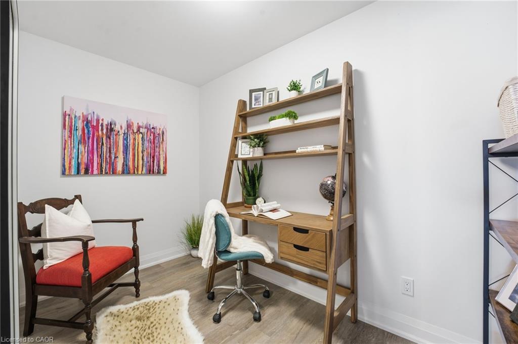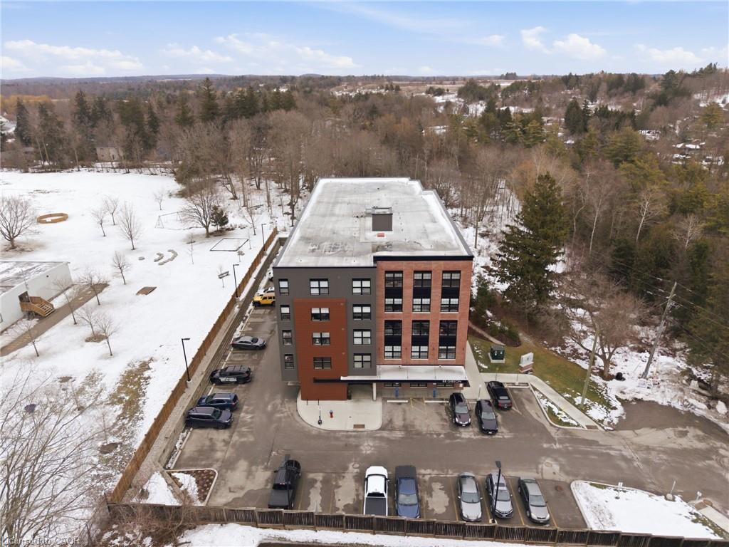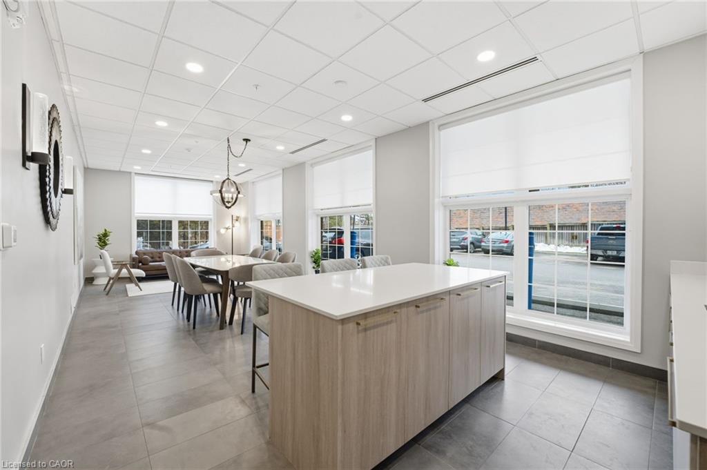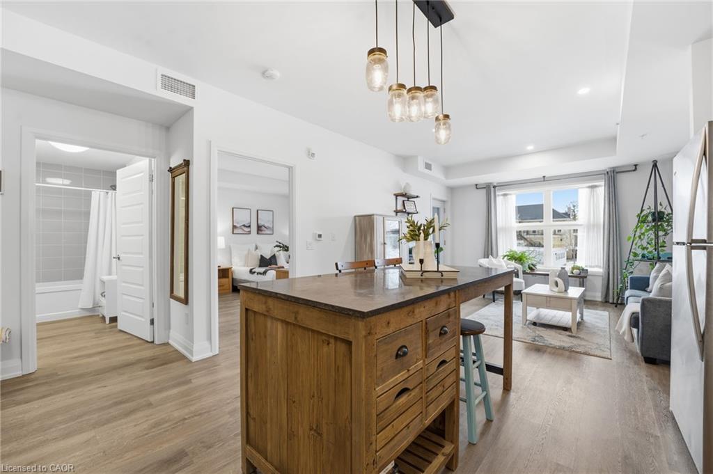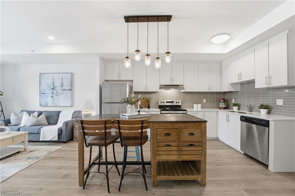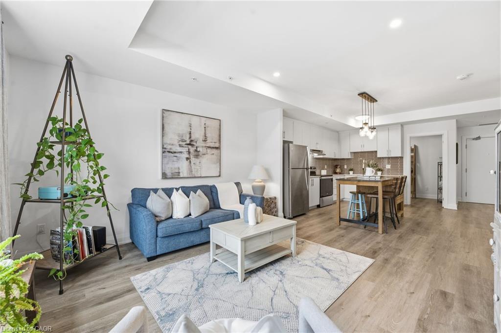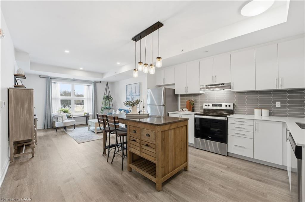 Welcome to condo living in Ayr at Piper’s Grove! This modern mid-rise community offers an ideal opportunity for first-time buyers, downsizers, or savvy investors looking for a low-maintenance lifestyle in a growing, well-connected town. This bright and spacious suite features 1 bedroom plus a versatile den, 1 bathroom, and 885 sq ft of thoughtfully designed living space, along with a private 84 sq ft balcony – perfect for enjoying your morning coffee or unwinding at the end of the day. The open-concept kitchen, dining, and living area is flooded with natural light and showcases contemporary finishes throughout. The kitchen is both stylish and functional, featuring sleek white cabinetry extending to the ceiling, a neutral backsplash, quartz countertops and a striking designer lighting over the dining area. The primary bedroom offers convenient access to the 4-piece bathroom, creating a comfortable and efficient layout. Additional highlights include luxury vinyl plank flooring throughout and in-suite laundry for everyday convenience. Residents enjoy a secure building entrance with intercom system, as well as a welcoming main-level amenity room complete with a kitchenette and washroom – ideal for gatherings or entertaining. One parking space is included. Located at the end of Gibson Street in downtown Ayr, Piper’s Grove is just steps from parks and walking trails and offers easy access to Cambridge, Kitchener, Paris, Brantford, and Woodstock. Combining modern finishes, smart design, and a friendly community atmosphere, this is condo living at its best.