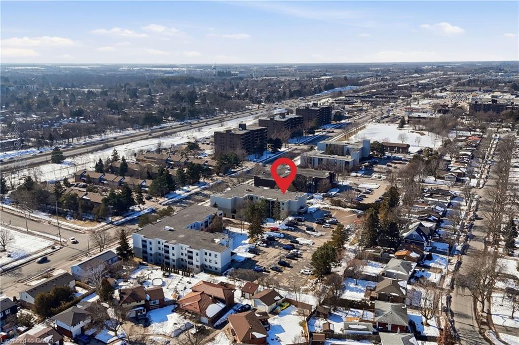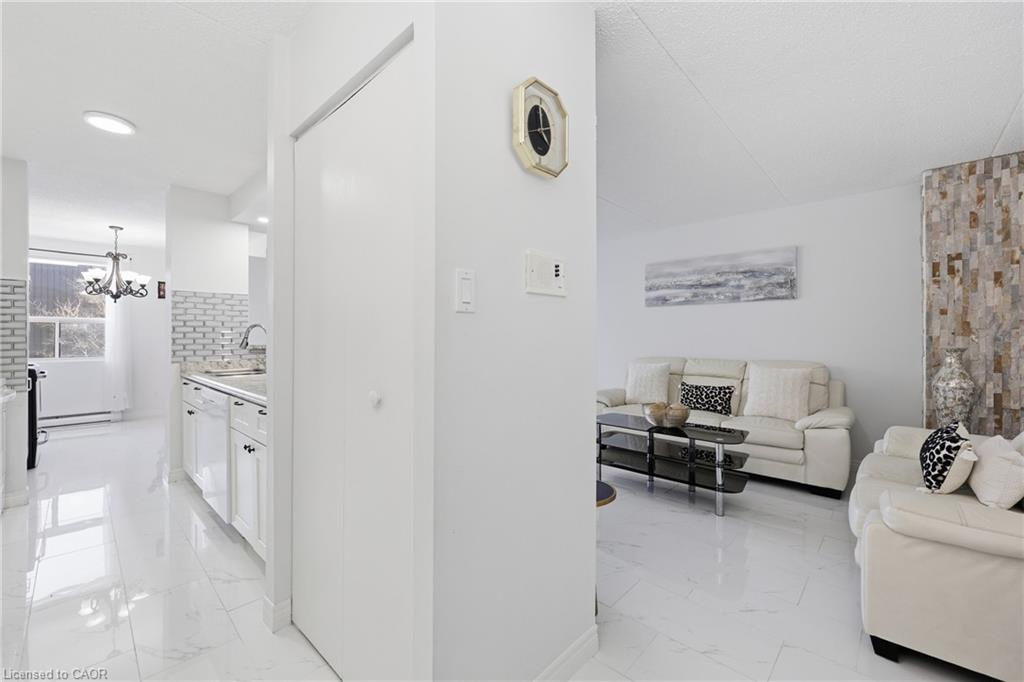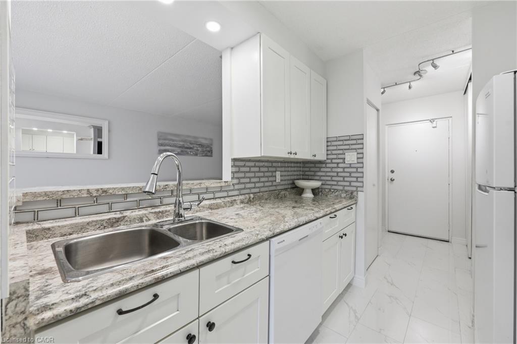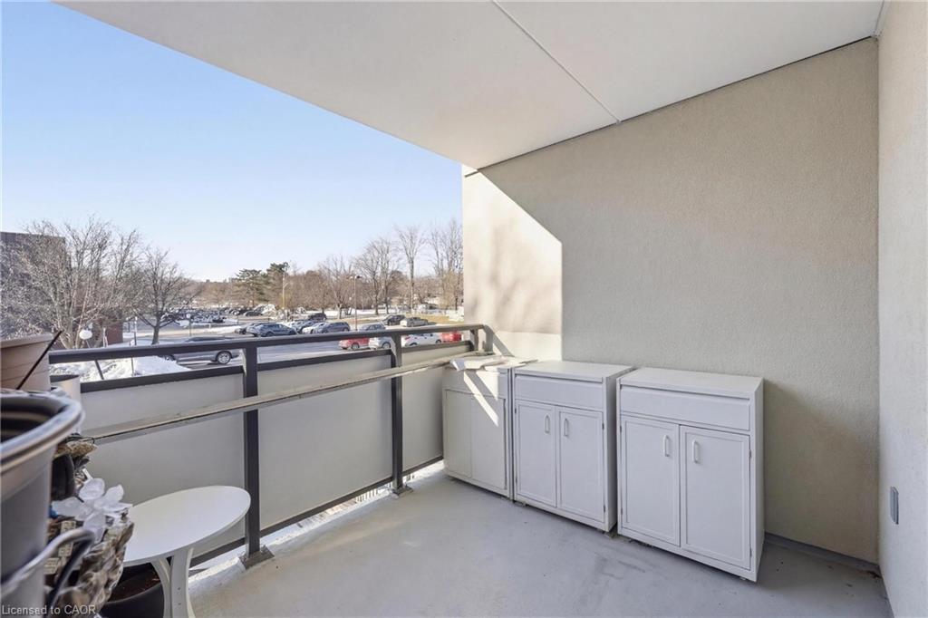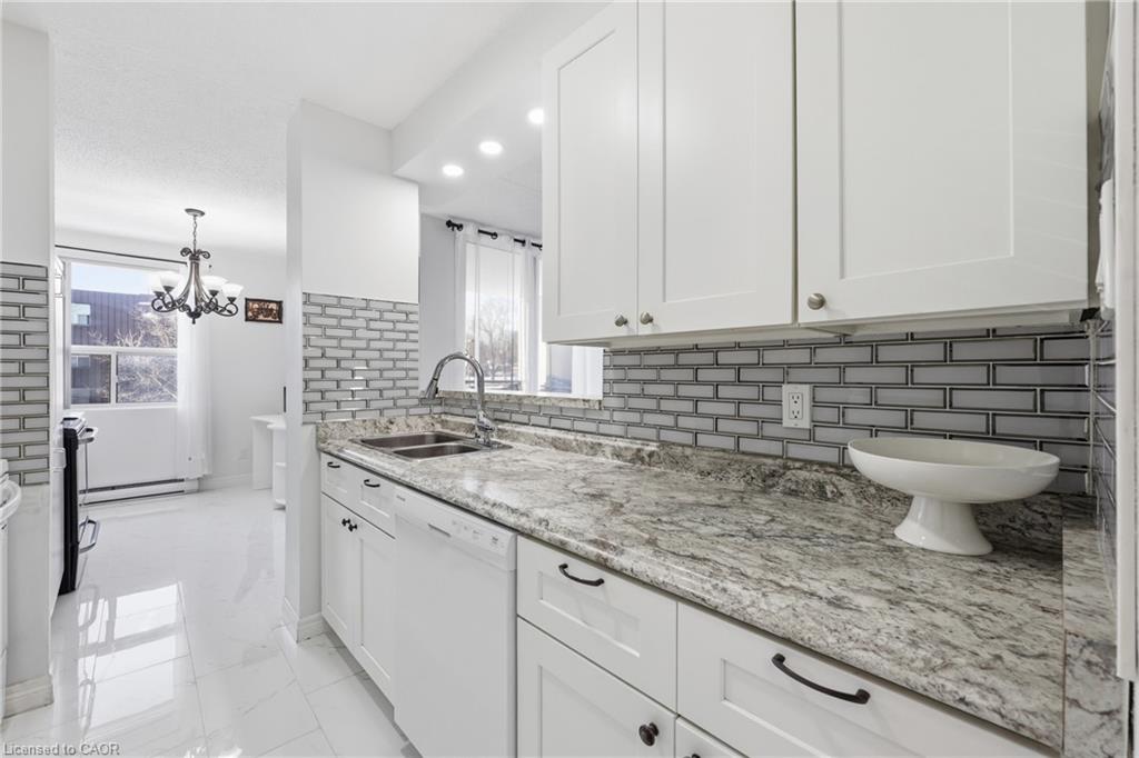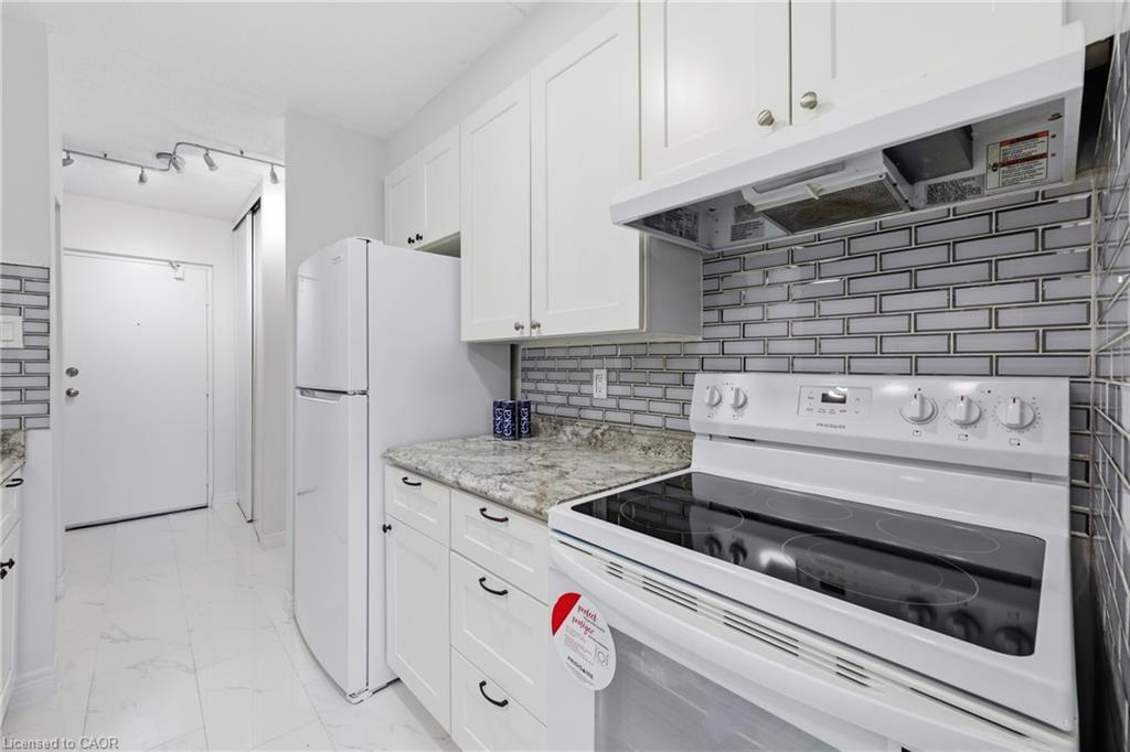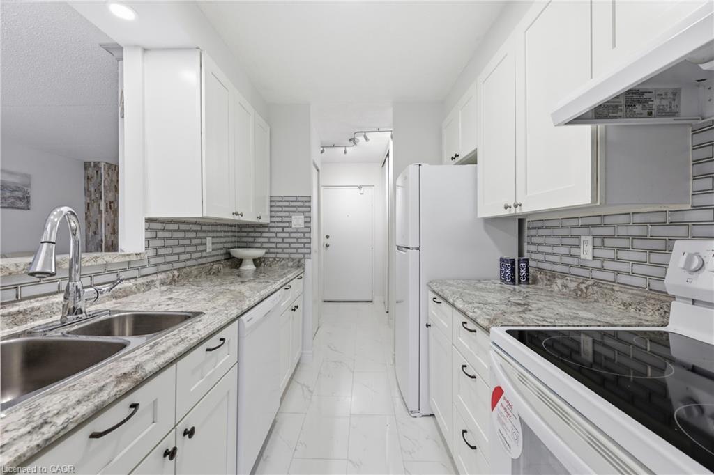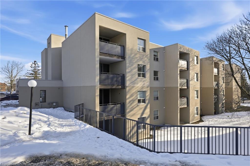This bright, spacious, and updated corner unit is move-in ready. The two-bedroom, one-bathroom home features a fresh neutral paint palette and carpet-free living with luxurious vinyl plank and tile flooring throughout. The large living room leads to a private covered balcony with sliding doors, and large windows in every room provide ample natural light. The kitchen offers a sleek, contemporary design with pot lights, abundant cabinetry, a beautiful tile backsplash, and recently updated appliances (2024/2025). The kitchen flows seamlessly into the dining room, perfect for family dinners and entertaining.The primary bedroom includes a walk-in closet, and this unit offers plenty of storage throughout. For added convenience, the unit is located near the elevator and includes a dedicated parking spot close to the building entrance, along with ample visitor parking.Ideally situated near schools, parks, restaurants, the Hanlon Parkway, and the University of Guelph, this property is an excellent opportunity for first-time buyers, young families, investors or those looking to downsize.This is one unit not to be missed!