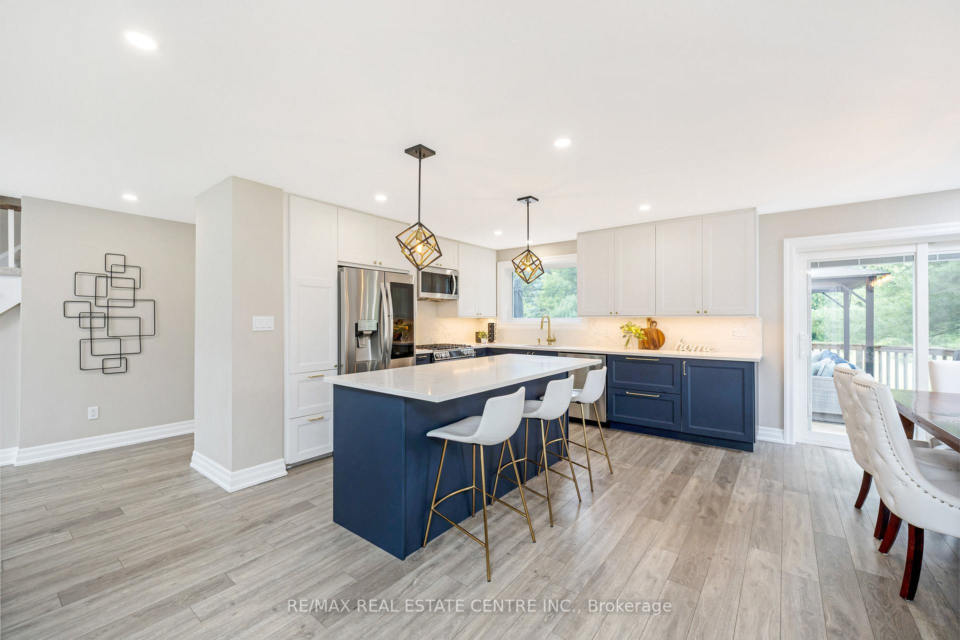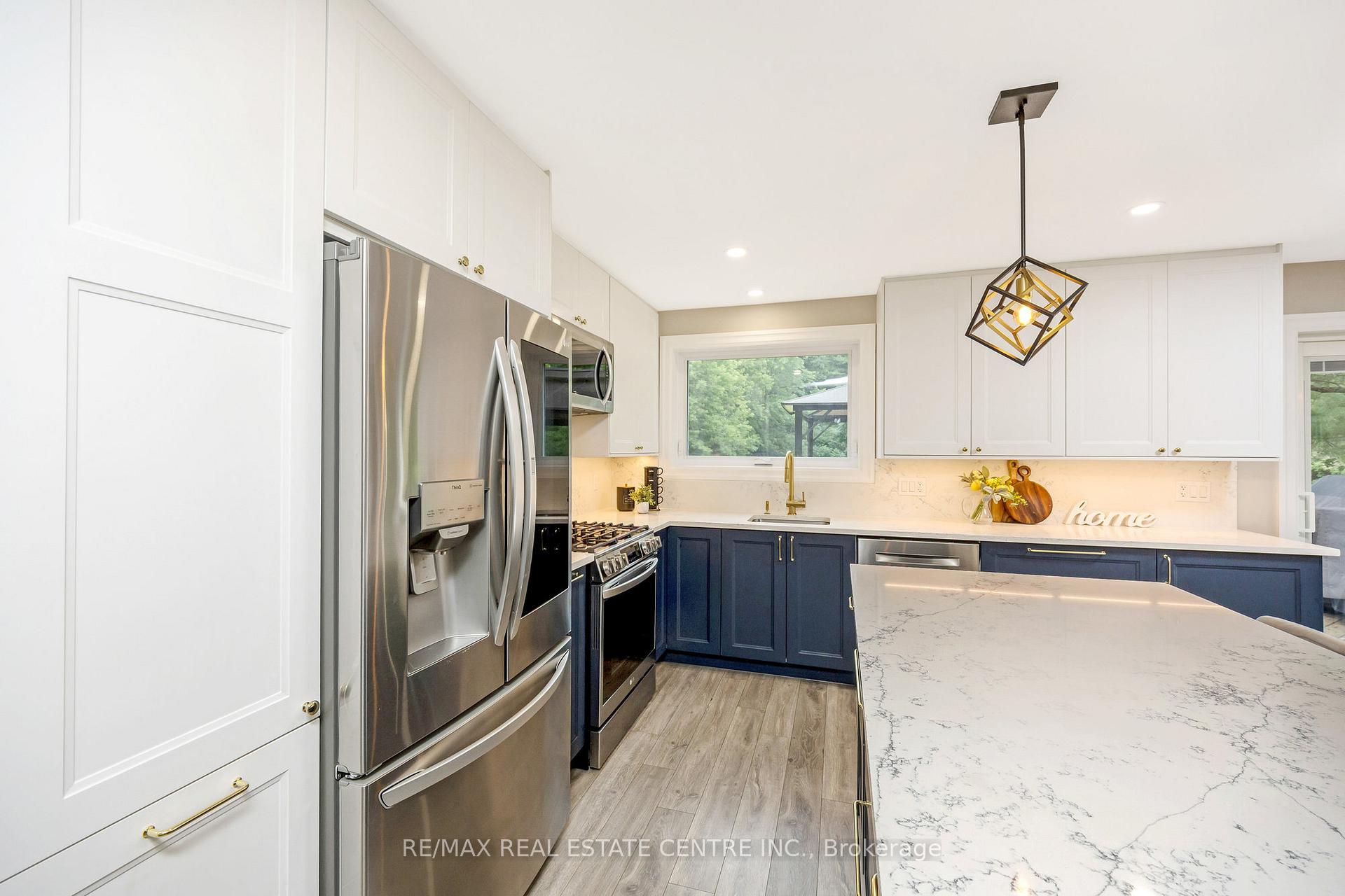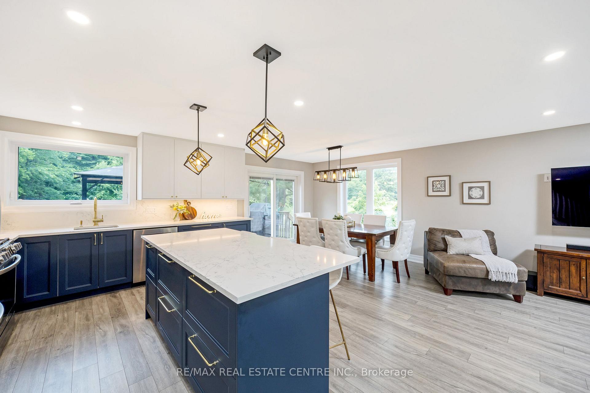 You will fall in love with this SERENE PARK-LIKE SETTING and wonderfully RENOVATED 4-BEDROOM FOREVER HOME, nestled on a PRIVATE ONE ACRE LOT backing onto woodland in sought-after Campbellville. It has been beautifully updated w/$350K in recent PROFESSIONAL RENOS. Enjoy your drive home along tree-lined Limestone Rd and take in the beautiful curb appeal w/stately new stone facade (2024), new garage door (2023), new soffits, eaves and gutters (2024). Enter the OPEN CONCEPT main level to the large living/dining room, w/WO to deck, gorgeous WHITE EI KITCHEN w/quartz counters, SS appliances (2022), massive island w/ breakfast bar, undercabinet lighting … you will never want to leave this space! There is a main level powder room, family room w/ WO to the 3-season SUNROOM and laundry w/garage access. The upper level has a beautifully reno’d 4-pc bathroom and FOUR LARGE BEDROOMS, one being the primary w/ lovely 3-pc ensuite. The lower level has large above-grade windows, massive rec room, gym/office, cold cellar and 100 amp breaker. Addt’l Features: Parking for 20+ in driveway, a 1.5 car garage w/more parking in workshop, spray foam insulation (2022), epoxy floor in garage, updated light fixtures, FULL-HOME GENERAC GENERATOR. Unlike many rural properties, this home is heated w/NATURAL GAS and has HI-SPEED INTERNET. The property is beautiful … WIDE OPEN SPACE for the kids, tall mature trees for privacy and a putting green! 2nd driveway to the insulated workshop w/electricity at back of the property. Ideally located SOUTH of the 401 close to Milton, Burlington & Guelph and minutes to Campbellville’s quaint downtown – restaurants, post office, pharmacy, grocery, LCBO, spa, coffee, parks. Easy hwy access, conservation areas/skiing, golf, 25 min drive to Pearson Airport and in the highly desirable Brookville PS catchment. This type of property is highly sought-after but rarely offered for sale.