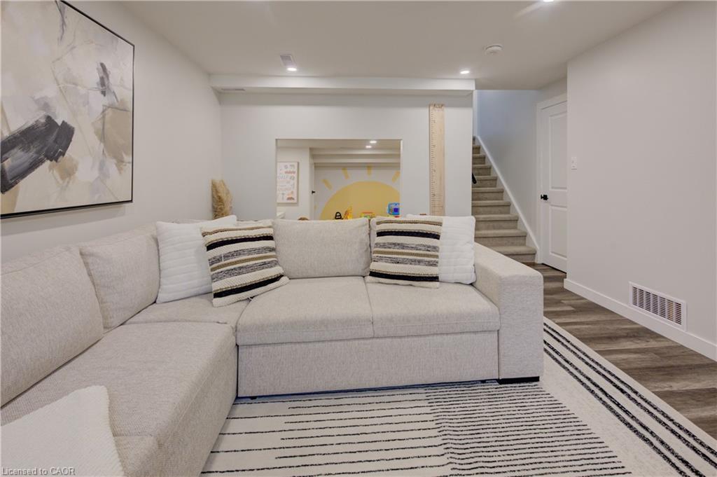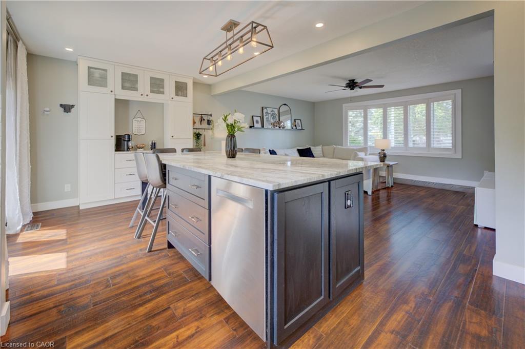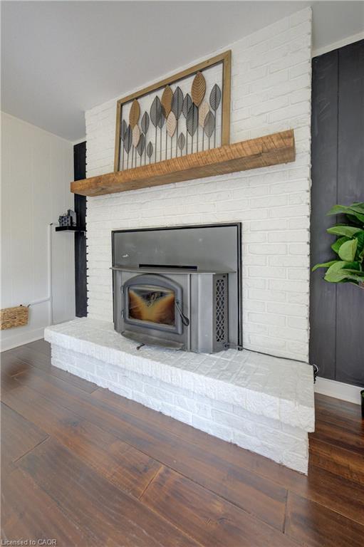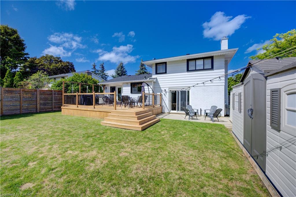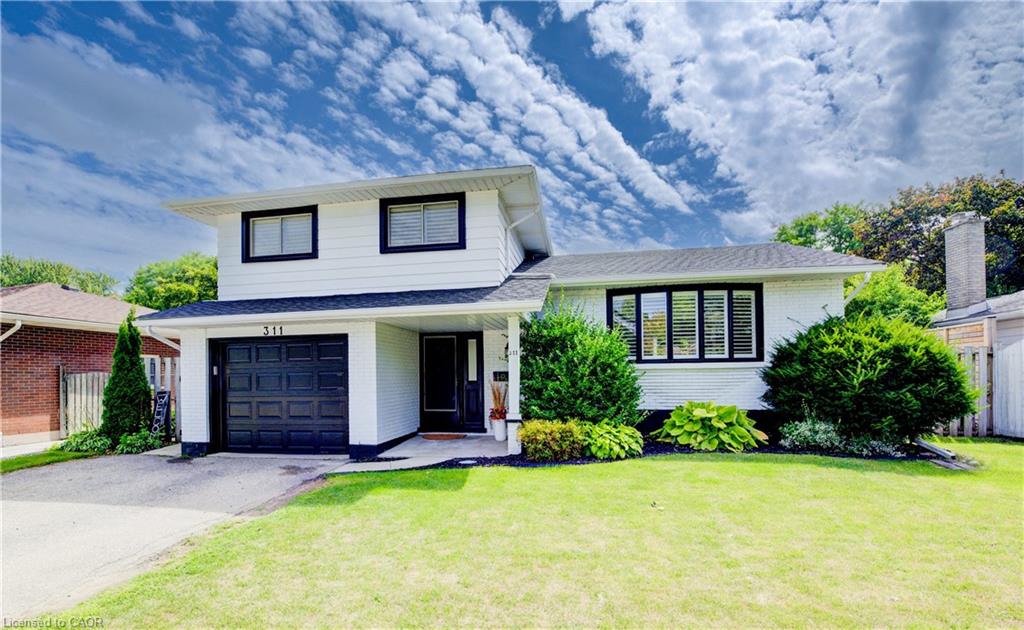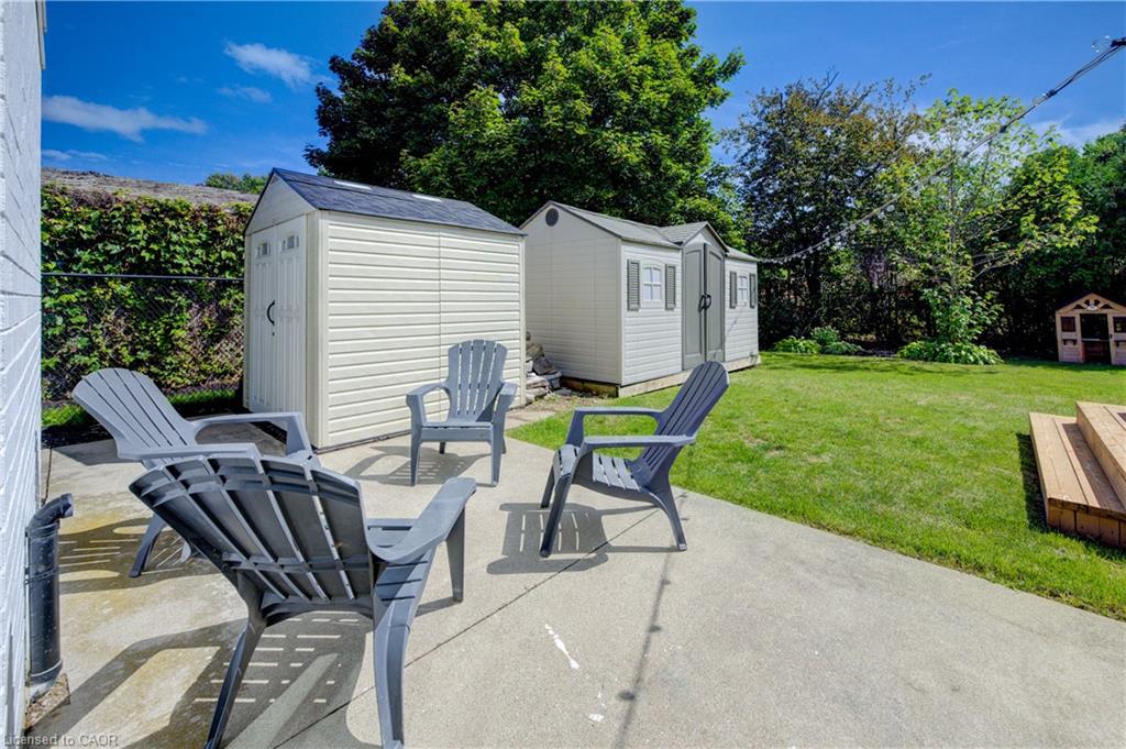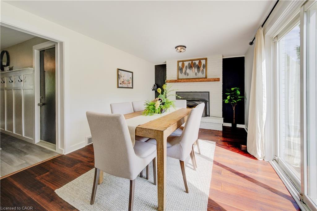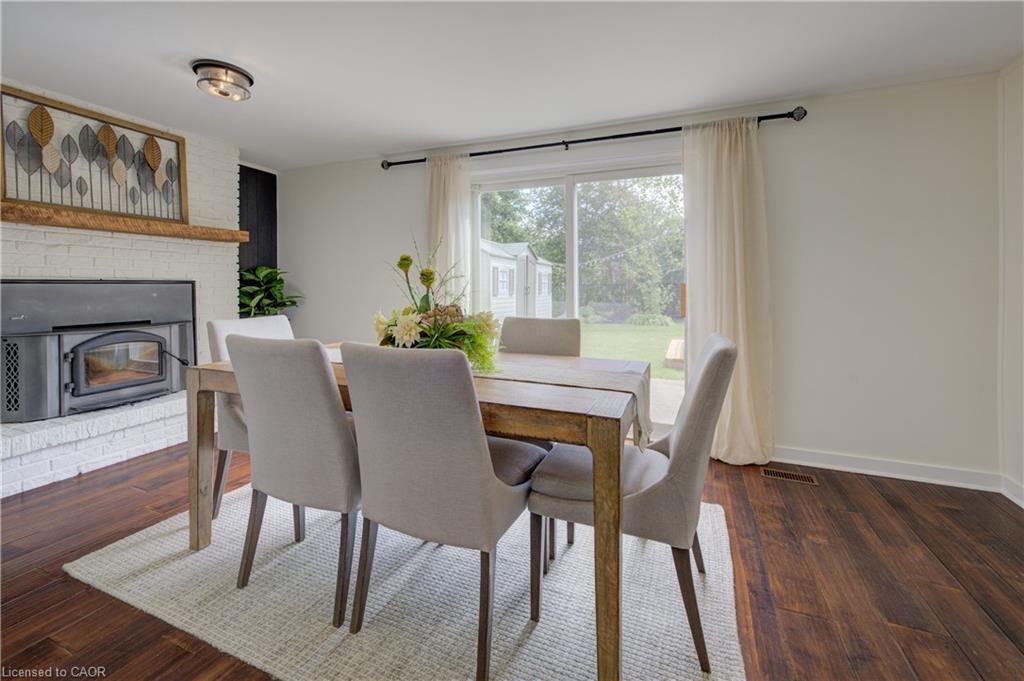 Stunning, Move-In Ready Sidesplit! This beautifully updated sidesplit combines stylish design with smart functionality, offering the perfect blend of comfort and convenience for modern family living. Step inside to find engineered hardwood flooring throughout the main living spaces and a bright, open-concept layout. The heart of the home is the stunning kitchen, featuring a 10-ft island with quartz counters, stainless steel appliances, white subway tile backsplash, a coffee bar, and a shiplap accent wall — all open to the spacious living area, perfect for entertaining or relaxing with family. Just a few steps down, the lower-level dining room boasts a gorgeous white brick surround wood-burning fireplace and direct access to the fully fenced backyard through patio doors. The yard includes two sheds, one with full electricity and lighting (Live Electric, 2021), making it ideal for a workshop or studio. Upstairs, you’ll find three generously sized bedrooms — all with ceiling fans and new pot lights (2025) — and a beautifully renovated 5-piece bathroom (2021) featuring a new double vanity, updated flooring, and fresh paint. One bedroom also includes custom wainscoting (2024) for a stylish touch. The fully finished basement (2022) adds versatile living space with a cozy electric fireplace, built-in entertainment cabinetry, and a stunning 3-piece bathroom with a glass shower and modern finishes. A finished crawl space offers a perfect kids’ playroom or quiet reading nook. Additional updates and features include: New carpet on stairs (2020), family-friendly layout with multiple living areas, full electrical update including new panel (Live Electric, 2022), exterior brick stained and trim/doors painted (180 Transformations, 2023), new roof (Panda Roofing, 2023), fresh sod in front and back yards (2021), and a spacious laundry room with sink, cabinetry, and ample storage. This home is move-in ready with all the major updates already completed — just unpack and enjoy!