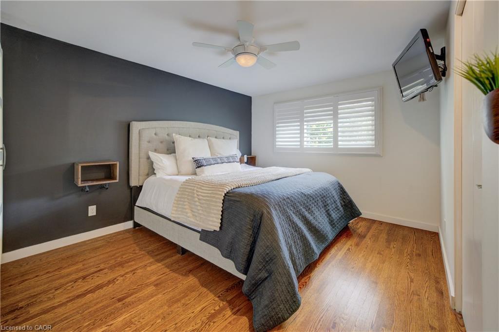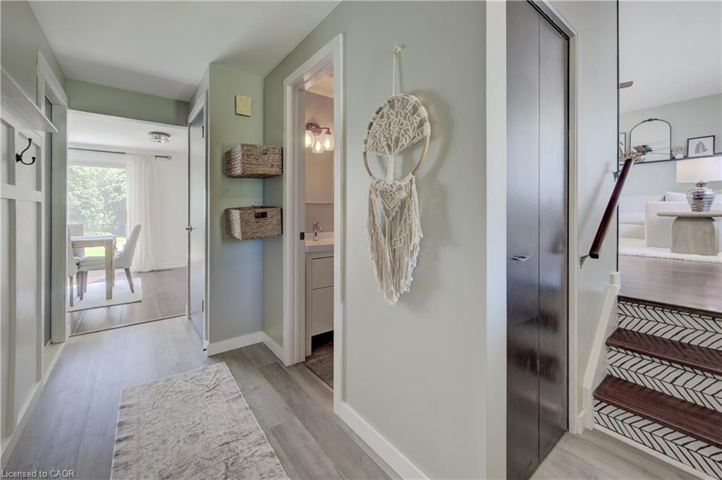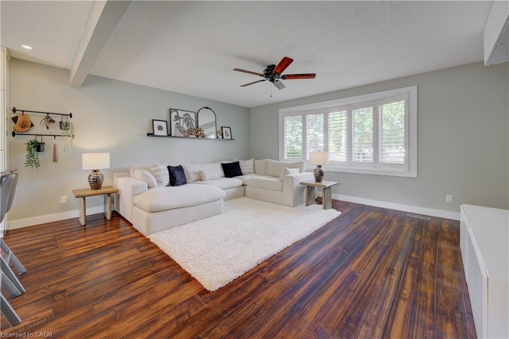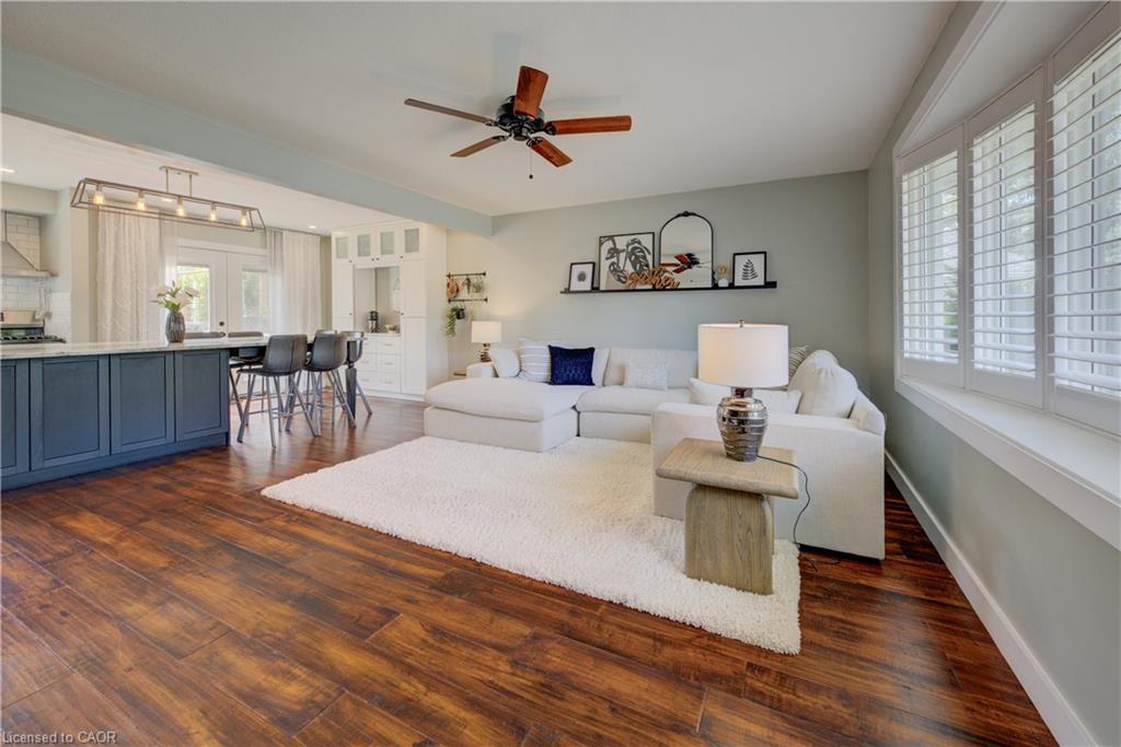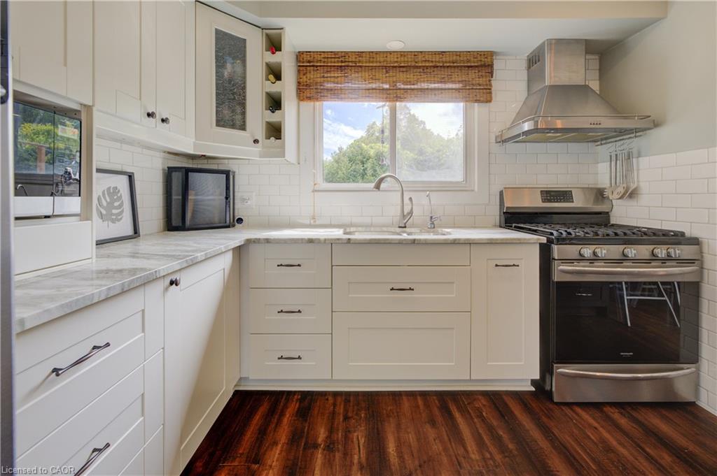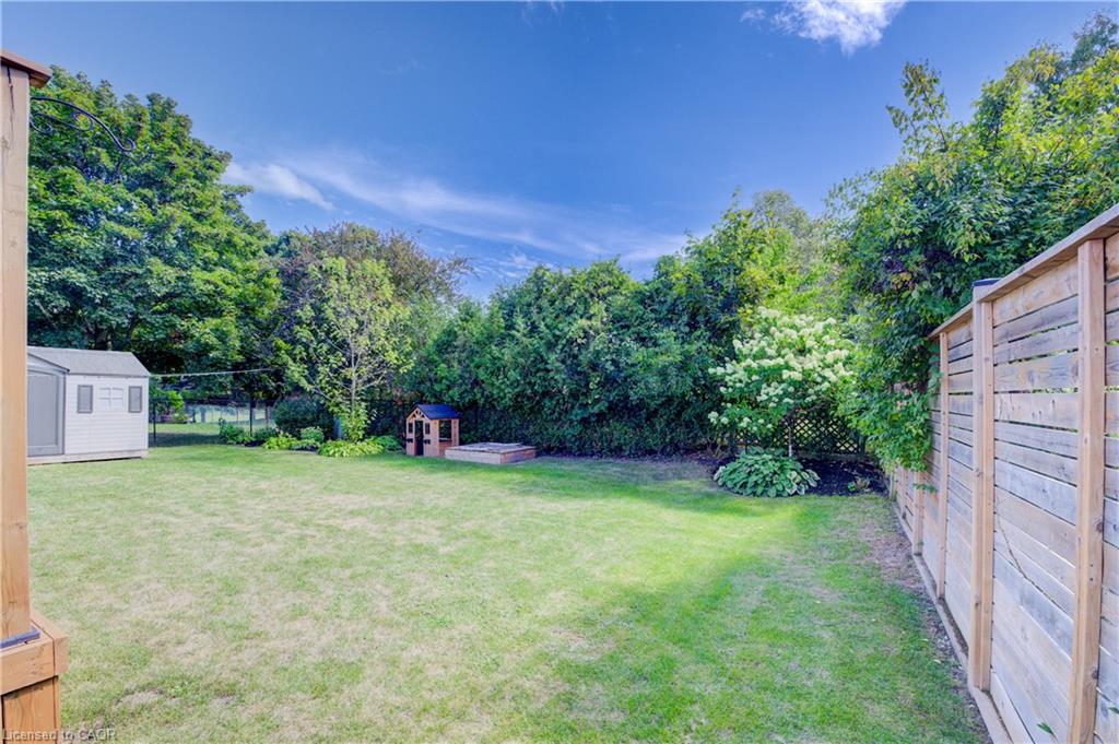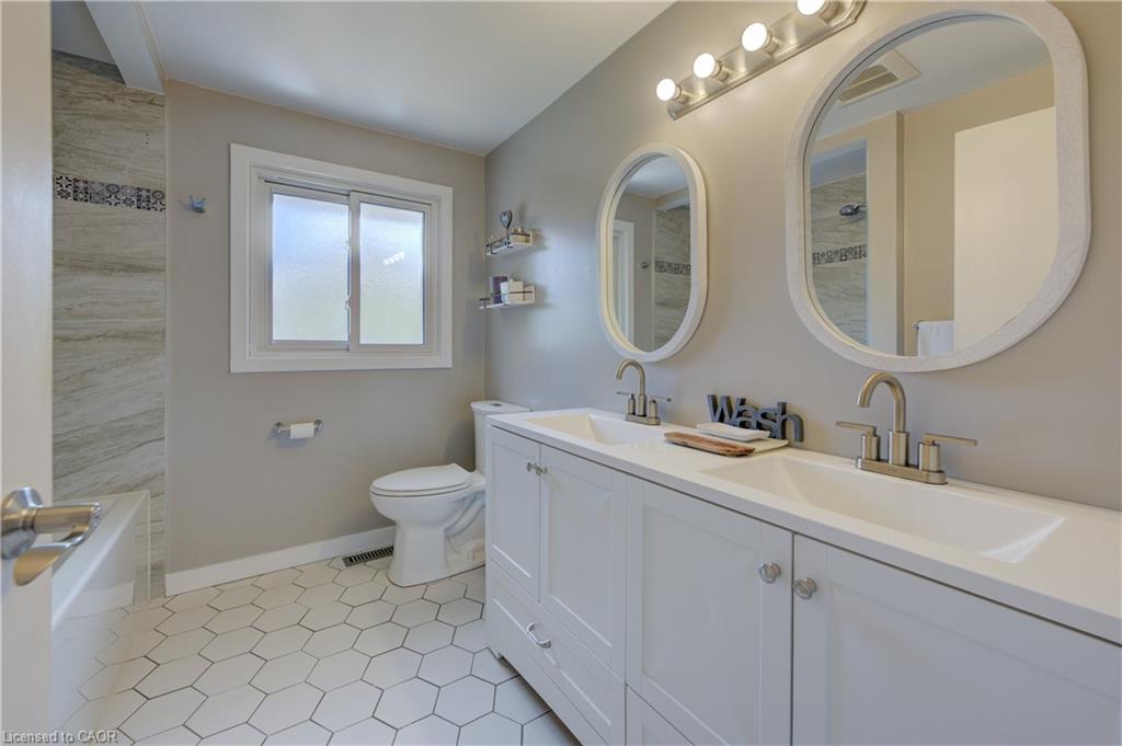 Stunning, Move-In Ready Sidesplit! This beautifully updated sidesplit combines stylish design with smart functionality, offering the perfect blend of comfort and convenience for modern family living. Step inside to find engineered hardwood flooring throughout the main living spaces and a bright, open-concept layout. The heart of the home is the stunning kitchen, featuring a 10-ft island with quartz counters, stainless steel appliances, white subway tile backsplash, a coffee bar, and a shiplap accent wall — all open to the spacious living area, perfect for entertaining or relaxing with family. Just a few steps down, the lower-level dining room boasts a gorgeous white brick surround wood-burning fireplace and direct access to the fully fenced backyard through patio doors. The yard includes two sheds, one with full electricity and lighting (Live Electric, 2021), making it ideal for a workshop or studio. Upstairs, you’ll find three generously sized bedrooms — all with ceiling fans and new pot lights (2025) — and a beautifully renovated 5-piece bathroom (2021) featuring a new double vanity, updated flooring, and fresh paint. One bedroom also includes custom wainscoting (2024) for a stylish touch. The fully finished basement (2022) adds versatile living space with a cozy electric fireplace, built-in entertainment cabinetry, and a stunning 3-piece bathroom with a glass shower and modern finishes. A finished crawl space offers a perfect kids’ playroom or quiet reading nook. Additional updates and features include: New carpet on stairs (2020), family-friendly layout with multiple living areas, full electrical update including new panel (Live Electric, 2022), exterior brick stained and trim/doors painted (180 Transformations, 2023), new roof (Panda Roofing, 2023), fresh sod in front and back yards (2021), and a spacious laundry room with sink, cabinetry, and ample storage. This home is move-in ready with all the major updates already completed — just unpack and enjoy!