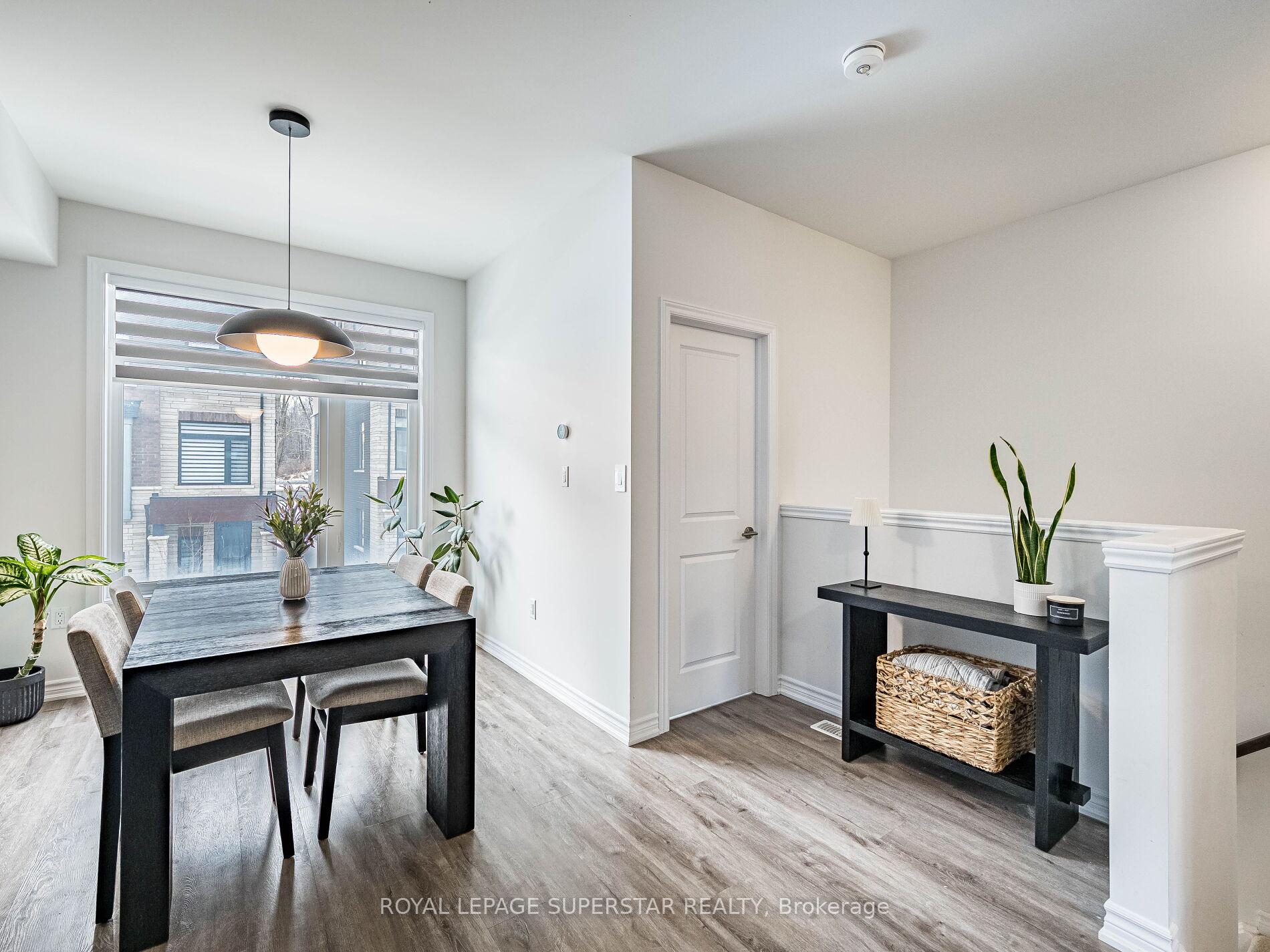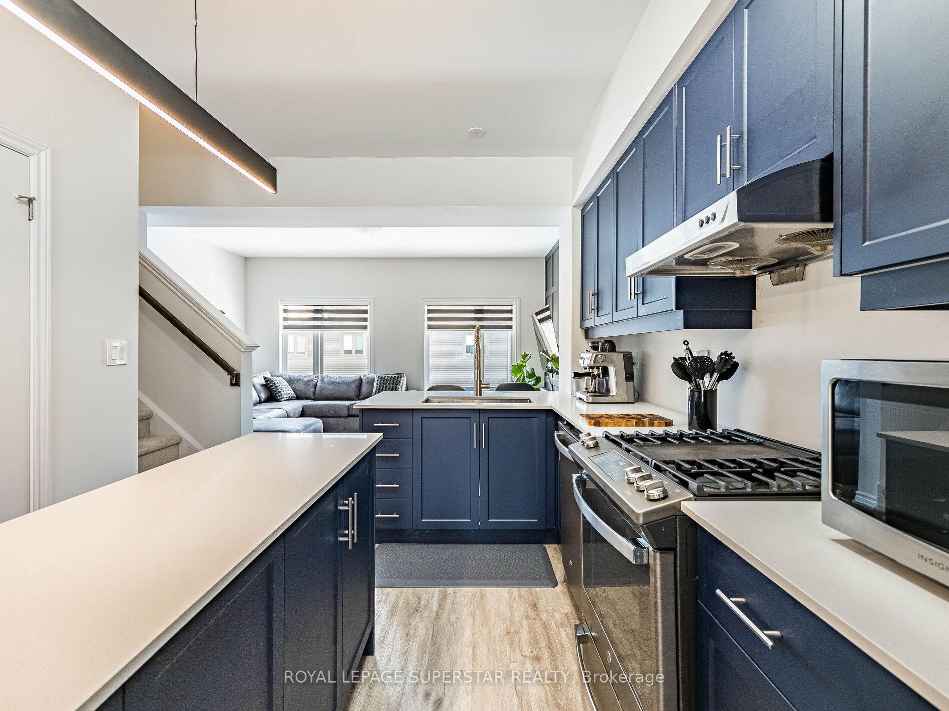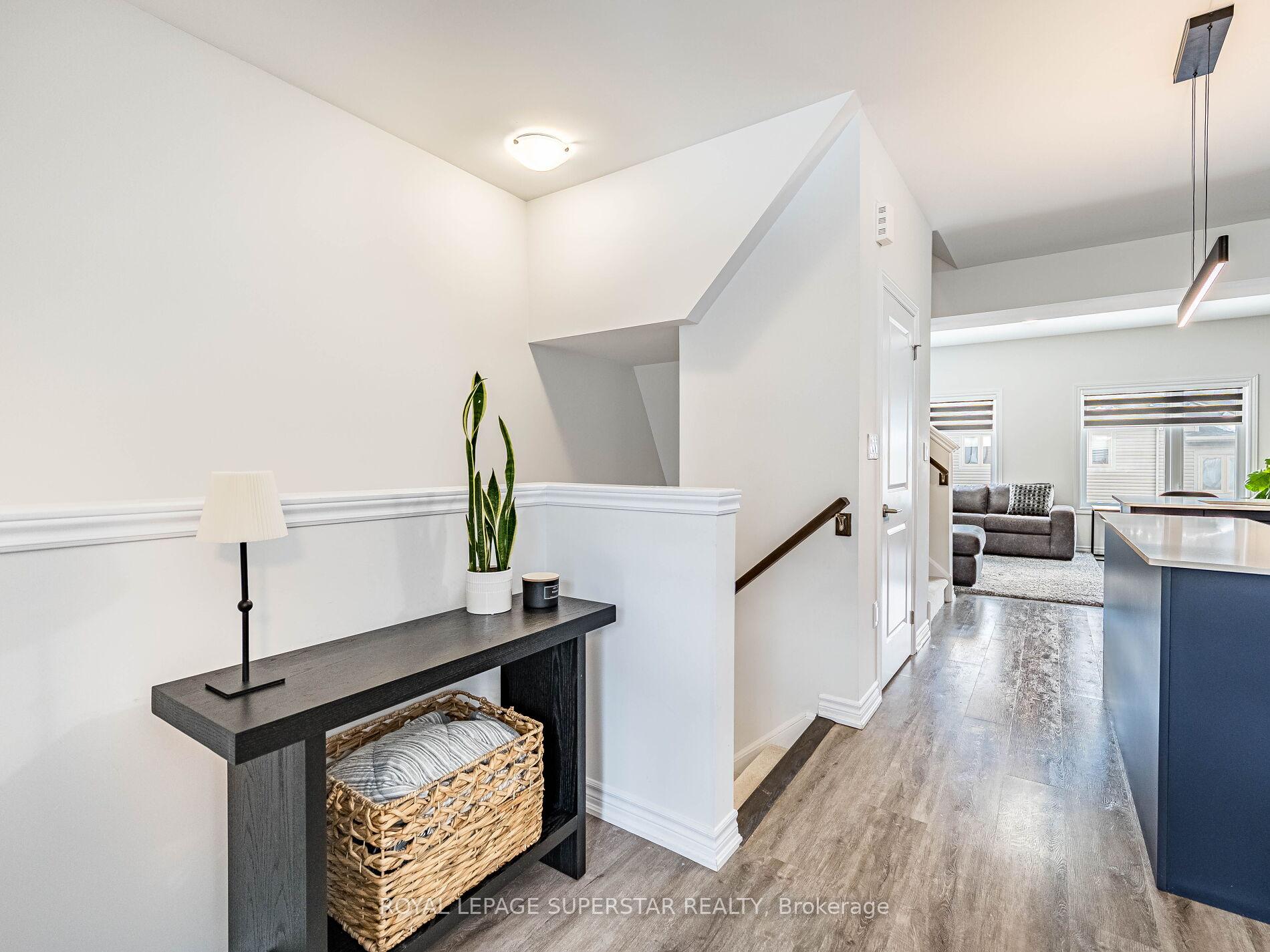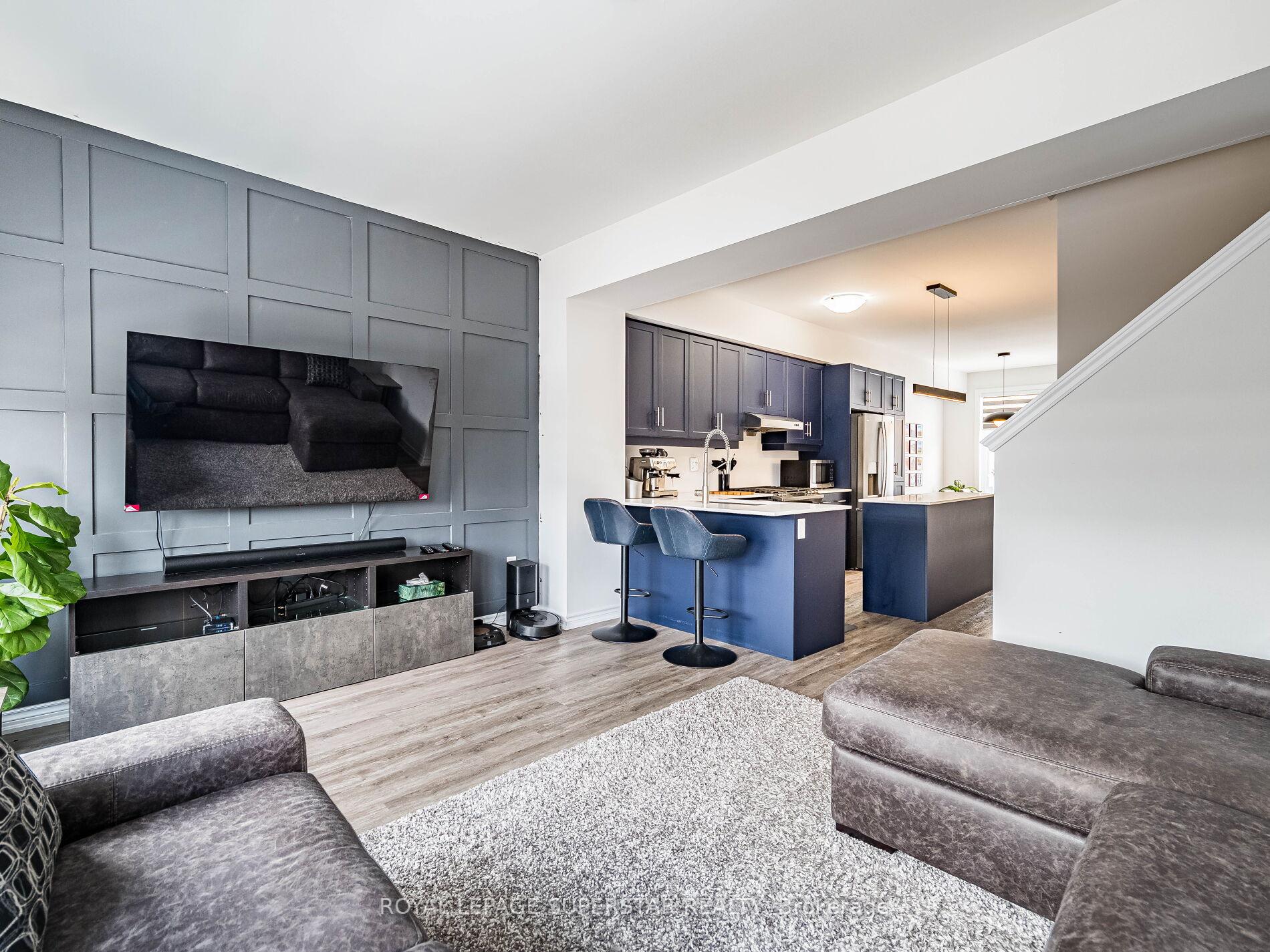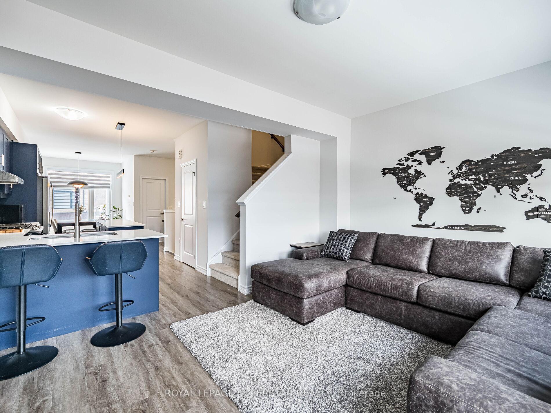 Welcome to this beautifully upgraded, modern-style 3-bedroom plus den townhome that is truly move-in ready and offers exceptional value for families. The main floor features a versatile den that can be used as a home office or entertainment room. The second floor showcases a bright open-concept layout with a stunning upgraded kitchen complete with hard-surface countertops, a large island, gas stove, stainless steel appliances, ample cabinetry, and an eat-in area, flowing into a spacious living room highlighted by a custom media wall and a convenient large size powder room. The third floor offers a generous primary bedroom with a walk-in closet and upgraded ensuite, along with two other well-sized bedrooms and another full bathroom. Recent upgrades include smart switches and dimmers, upgraded carpet, and upgraded tiles in the washrooms. With its beautiful exterior curb appeal and prime location close to amenities, schools, and highway access, this home is a must-see home ideal for young families and first-time buyers.