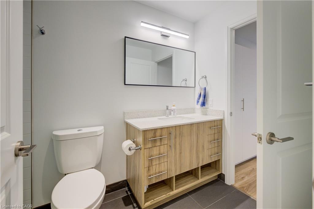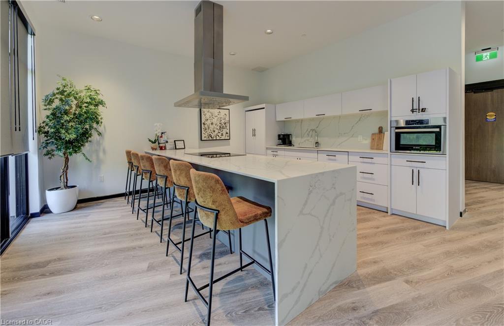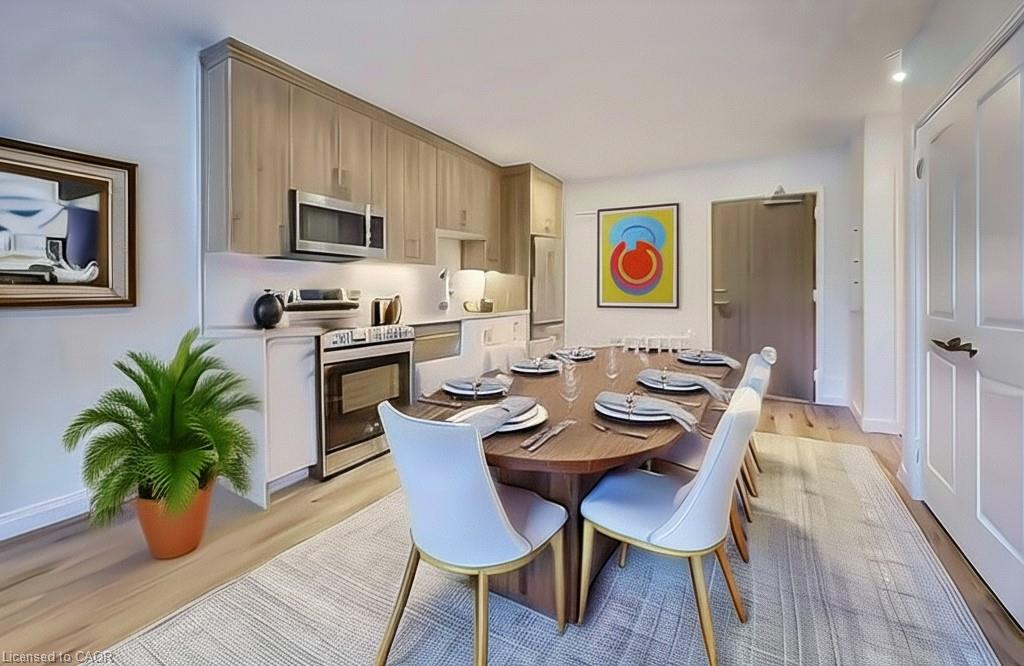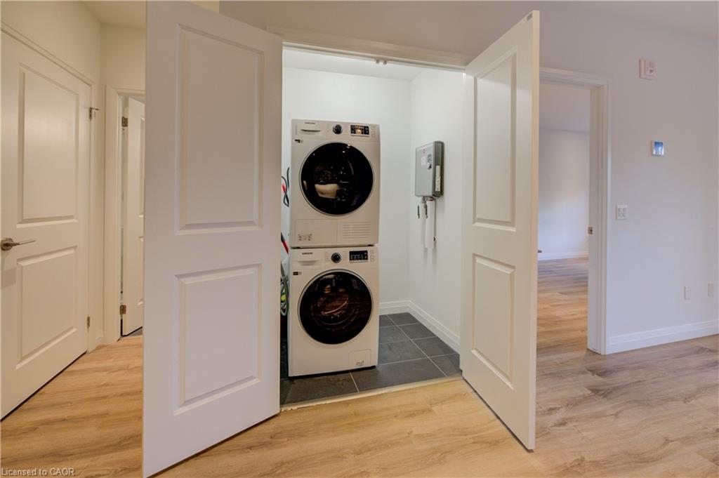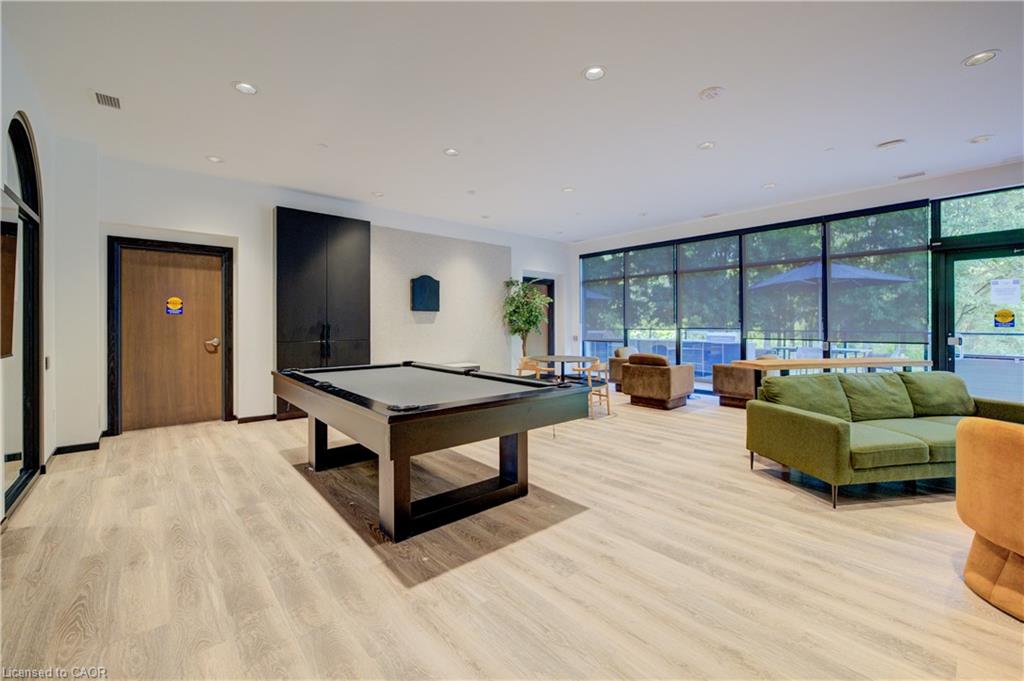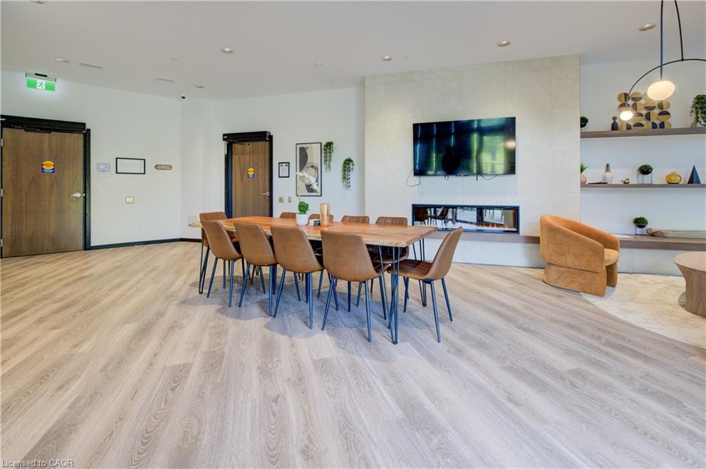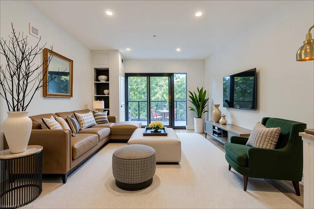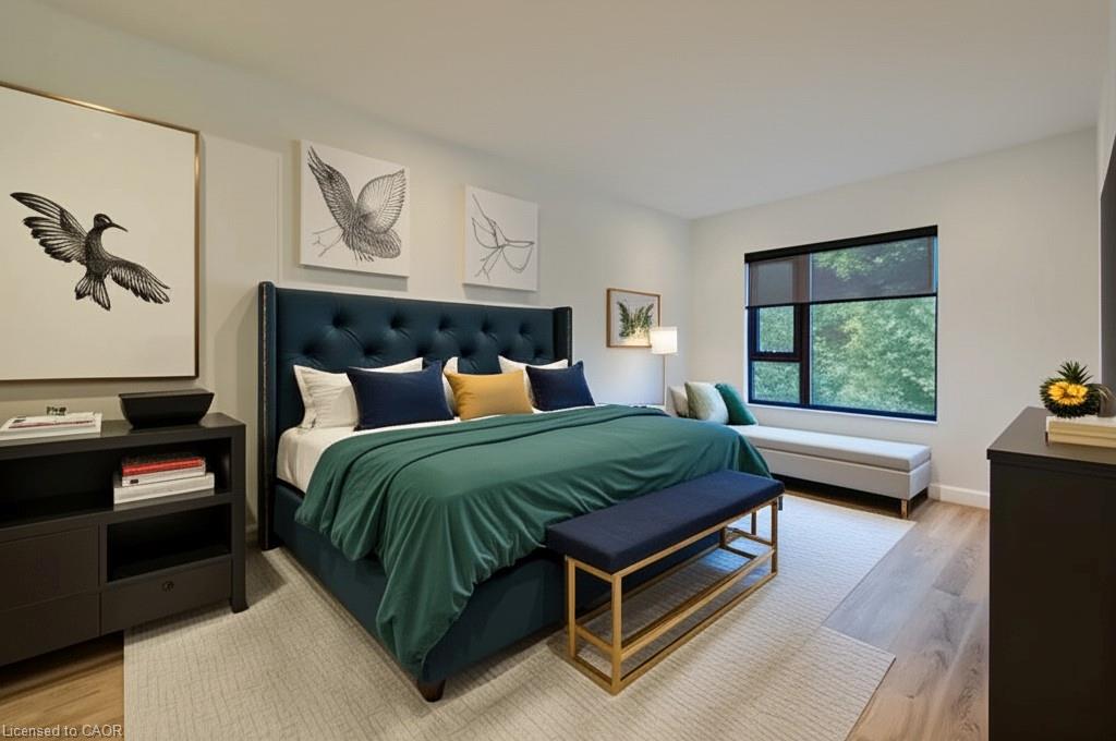 Welcome to this stunning 1-bedroom, 1-bathroom condo offering 679 sq ft of stylish living space, plus a serene outdoor balcony overlooking trees and scenic walking paths. Located just minutes from Highway 401, this beautifully maintained unit features an open-concept layout with a modern kitchen, dining area, and living room perfect for entertaining or relaxing. The generously sized bedroom is complemented by a sleek 3-piece bathroom and convenient in-unit private laundry. Enjoy the exceptional amenities this well-managed building has to offer, including a welcoming lobby lounge, elevator access, a fully equipped gym, yoga room, sauna, library, pet wash station and multiple party rooms with kitchen, TV, pool table, and direct access to a patio with BBQs. Situated beside picturesque Rainbow Lake, you’ll enjoy easy access to the waterfront via the scenic trails right outside your door. This unit includes a private parking spot. Don’t miss out, call your REALTOR today to book a private showing! Photos show unit Digitally Staged.