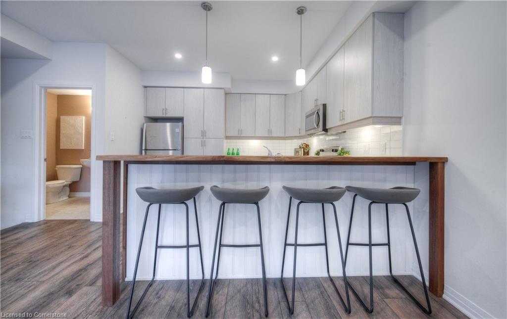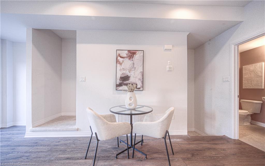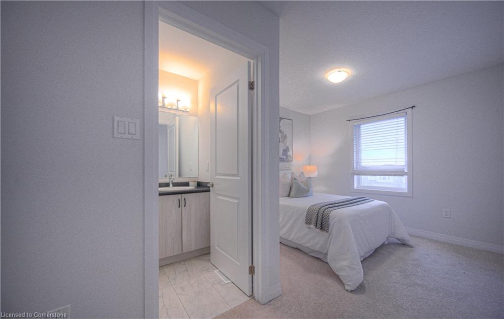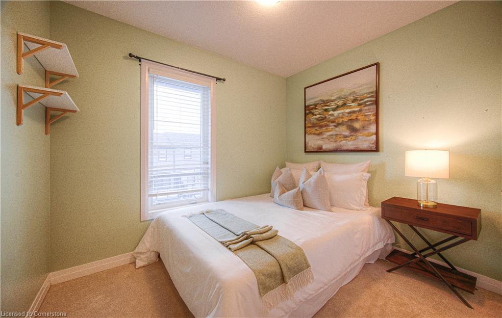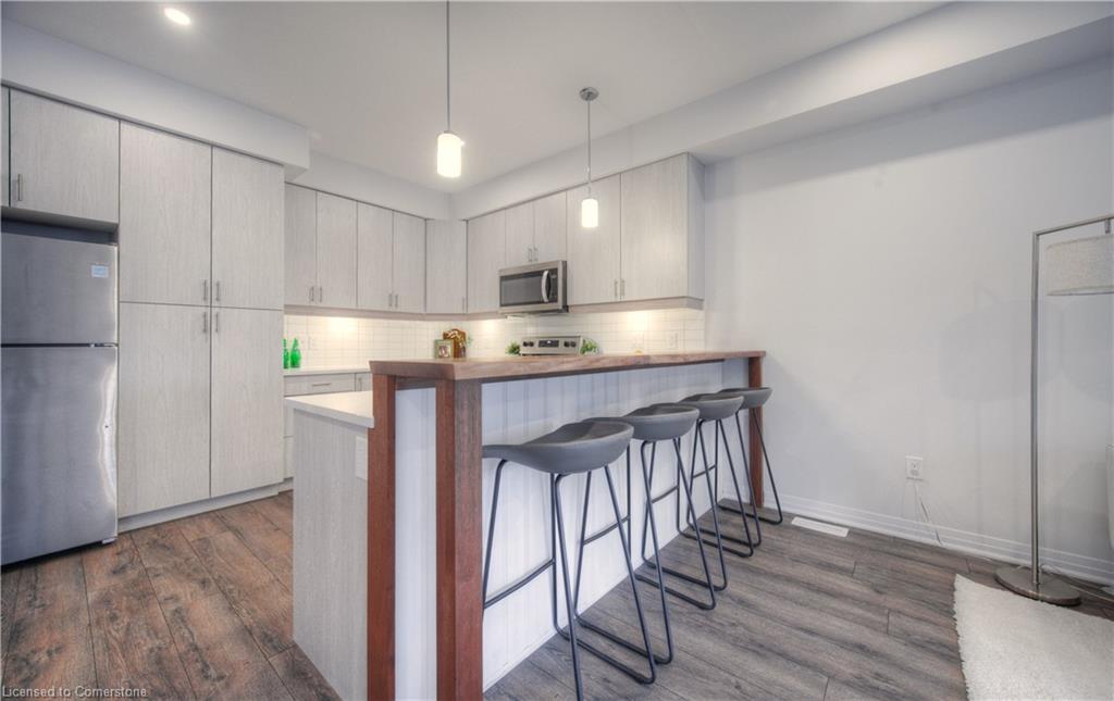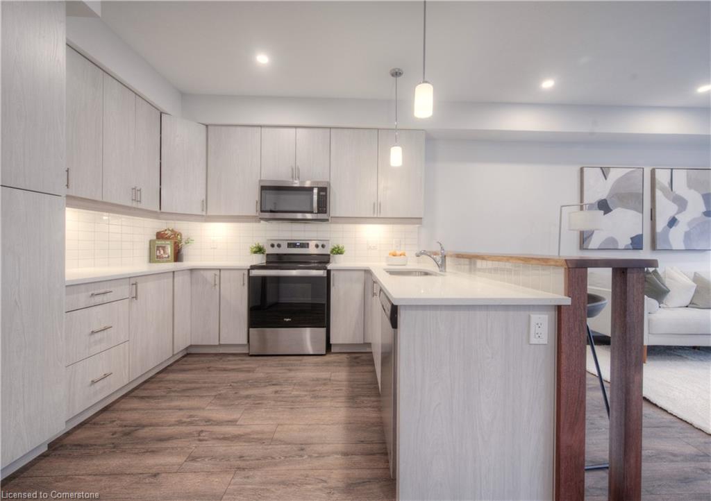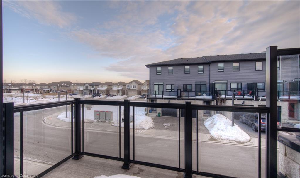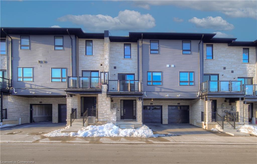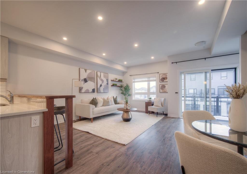 MODERN LIVING. This modern townhome is located in East Galt, a highly sought-after family-friendly neighbourhood. It offers easy access to various amenities and is conveniently situated close to schools and Green Gate Park. The main floor features an open-concept layout, creating a bright and airy atmosphere. The kitchen is equipped with ample counter space and a breakfast bar with seating. It seamlessly flows into the dining area and living room, which has sliders leading to the balcony. Additionally, there is a convenient main floor powder room. On the upper level, you will find 2 bedrooms, along with a 3rd bedroom or den with a skylight. The primary bedroom boasts a 3-pc ensuite bathroom. There is also a 4-pc bathroom and a laundry area on this level for added convenience. With over 1400 sqft, this townhome offers plenty of room for your family. It provides parking for two vehicles and includes stainless steel appliances, a garage door opener with remotes, additional above-head storage in the garage, and visitor parking. The functional layout and contemporary finishes throughout the home contribute to its modern appeal. There are several builder upgrades, such as pot lights, and quartz counters. For outdoor enthusiasts, the Valens Lake Conservation Area is just a short 14-minute drive away. The convenient location of the townhome also provides easy access to Highway 8, making commuting and exploring the surrounding areas convenient.