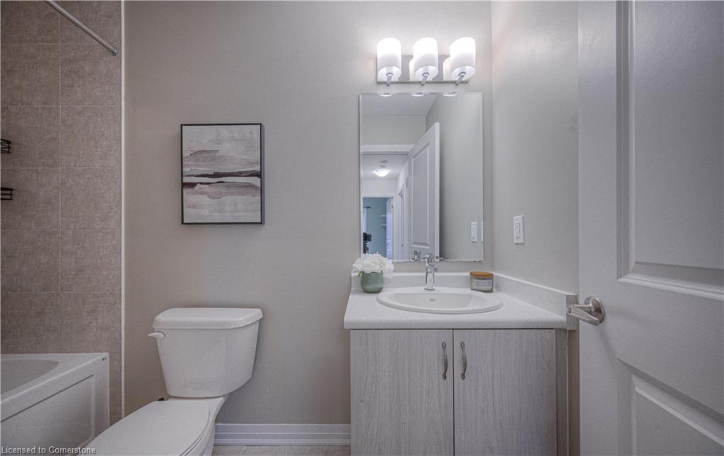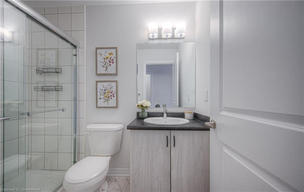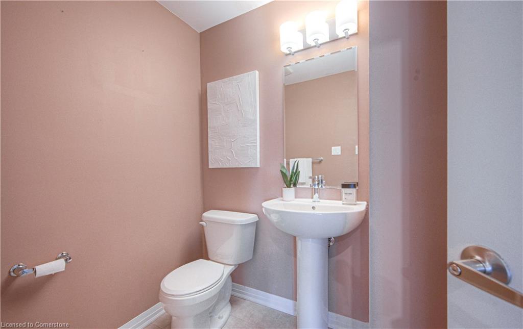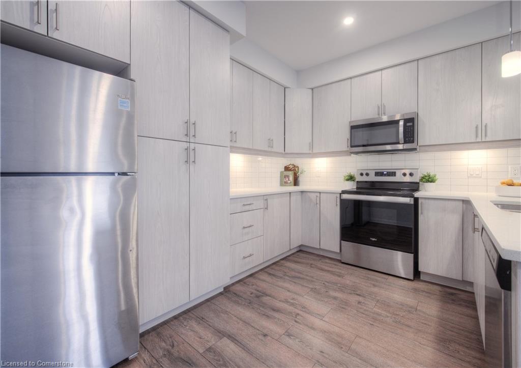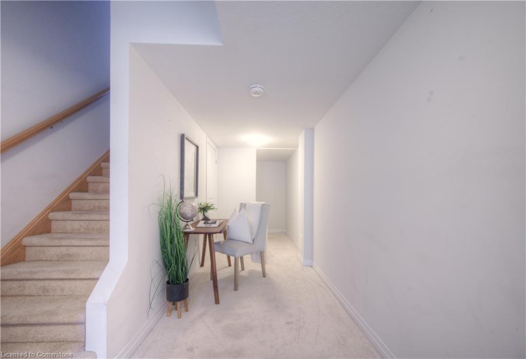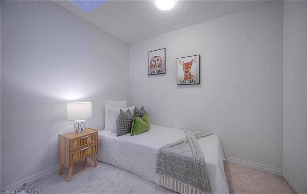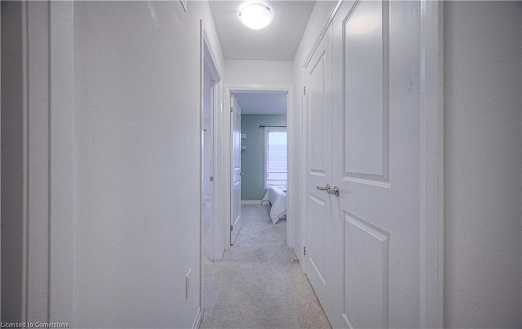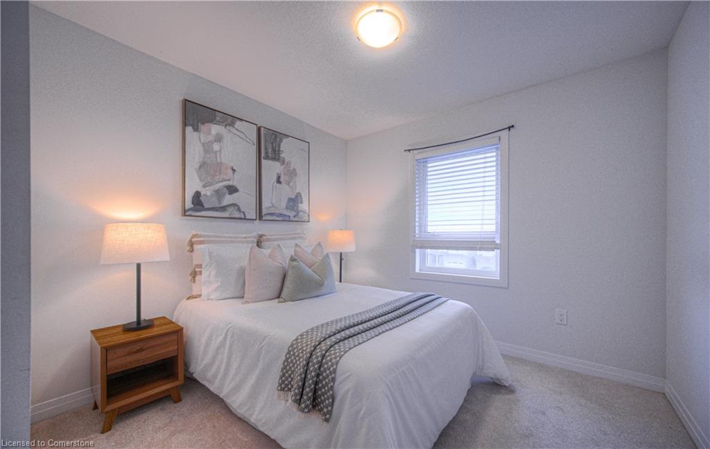 MODERN LIVING. This modern townhome is located in East Galt, a highly sought-after family-friendly neighbourhood. It offers easy access to various amenities and is conveniently situated close to schools and Green Gate Park. The main floor features an open-concept layout, creating a bright and airy atmosphere. The kitchen is equipped with ample counter space and a breakfast bar with seating. It seamlessly flows into the dining area and living room, which has sliders leading to the balcony. Additionally, there is a convenient main floor powder room. On the upper level, you will find 2 bedrooms, along with a 3rd bedroom or den with a skylight. The primary bedroom boasts a 3-pc ensuite bathroom. There is also a 4-pc bathroom and a laundry area on this level for added convenience. With over 1400 sqft, this townhome offers plenty of room for your family. It provides parking for two vehicles and includes stainless steel appliances, a garage door opener with remotes, additional above-head storage in the garage, and visitor parking. The functional layout and contemporary finishes throughout the home contribute to its modern appeal. There are several builder upgrades, such as pot lights, and quartz counters. For outdoor enthusiasts, the Valens Lake Conservation Area is just a short 14-minute drive away. The convenient location of the townhome also provides easy access to Highway 8, making commuting and exploring the surrounding areas convenient.