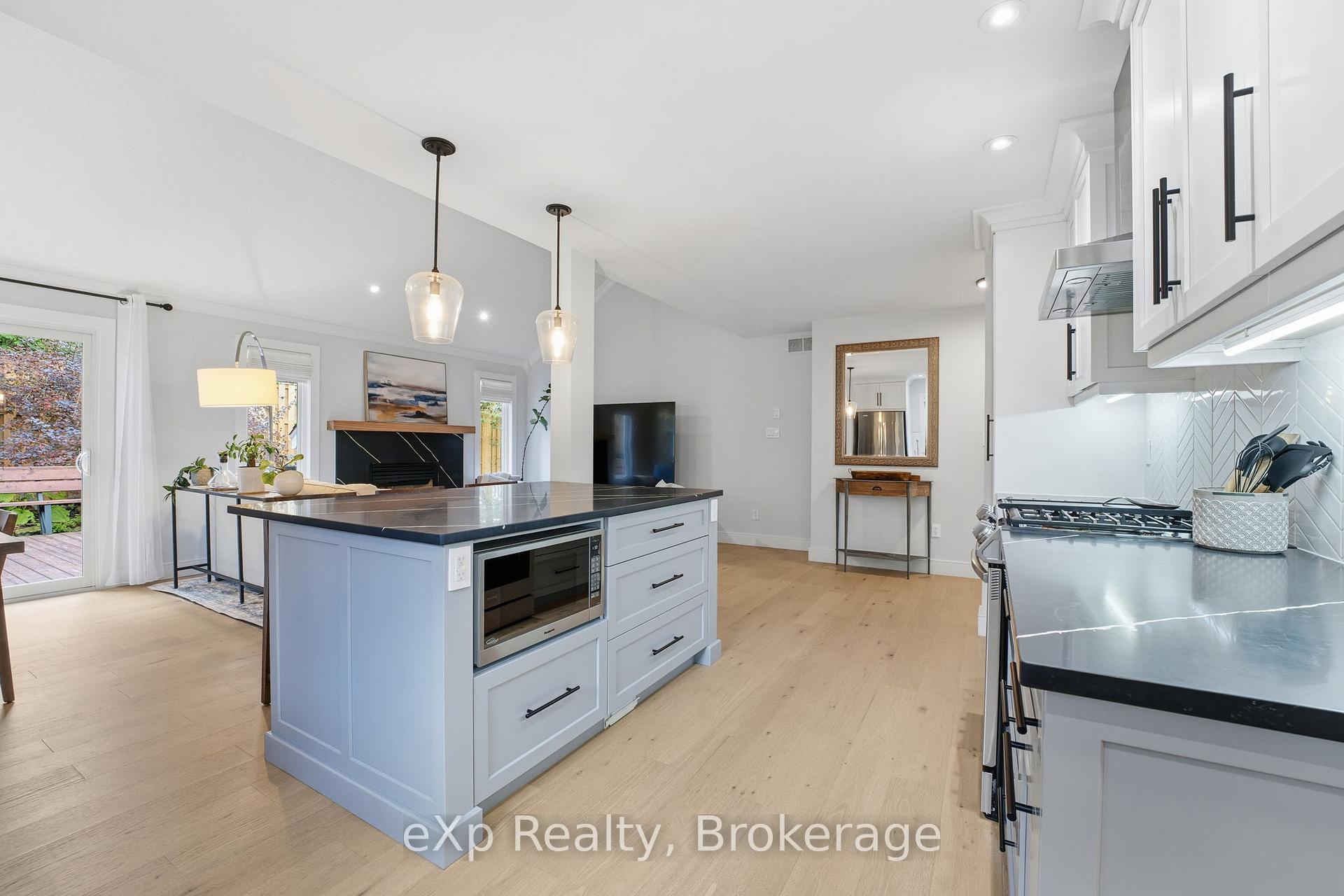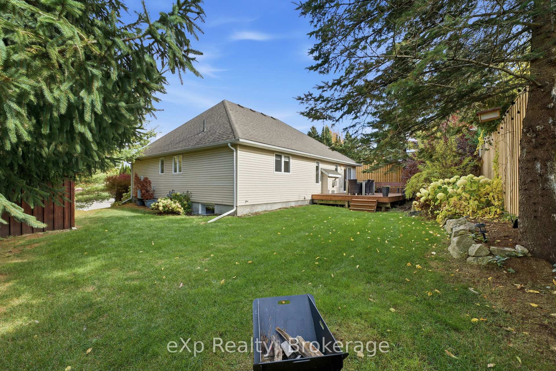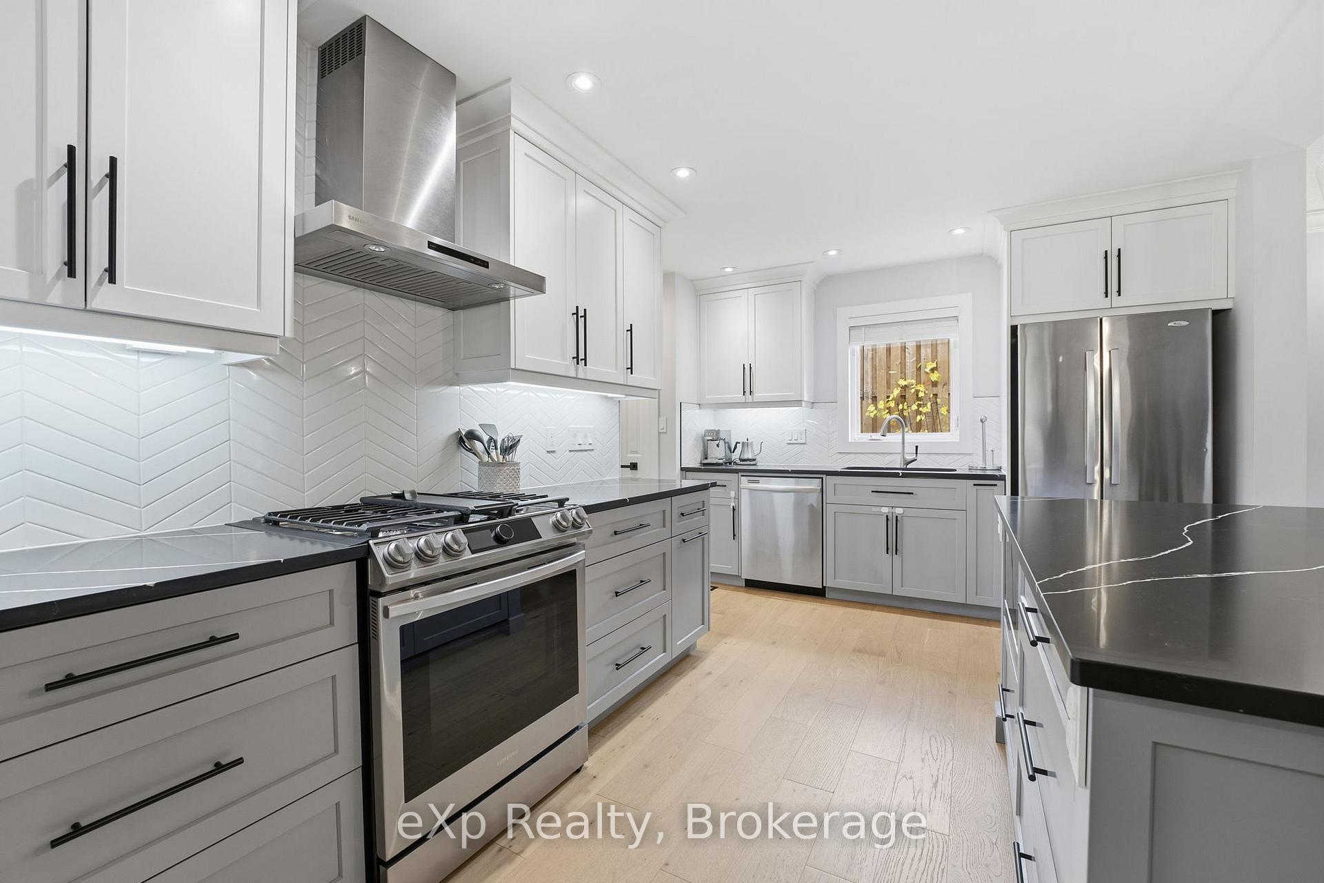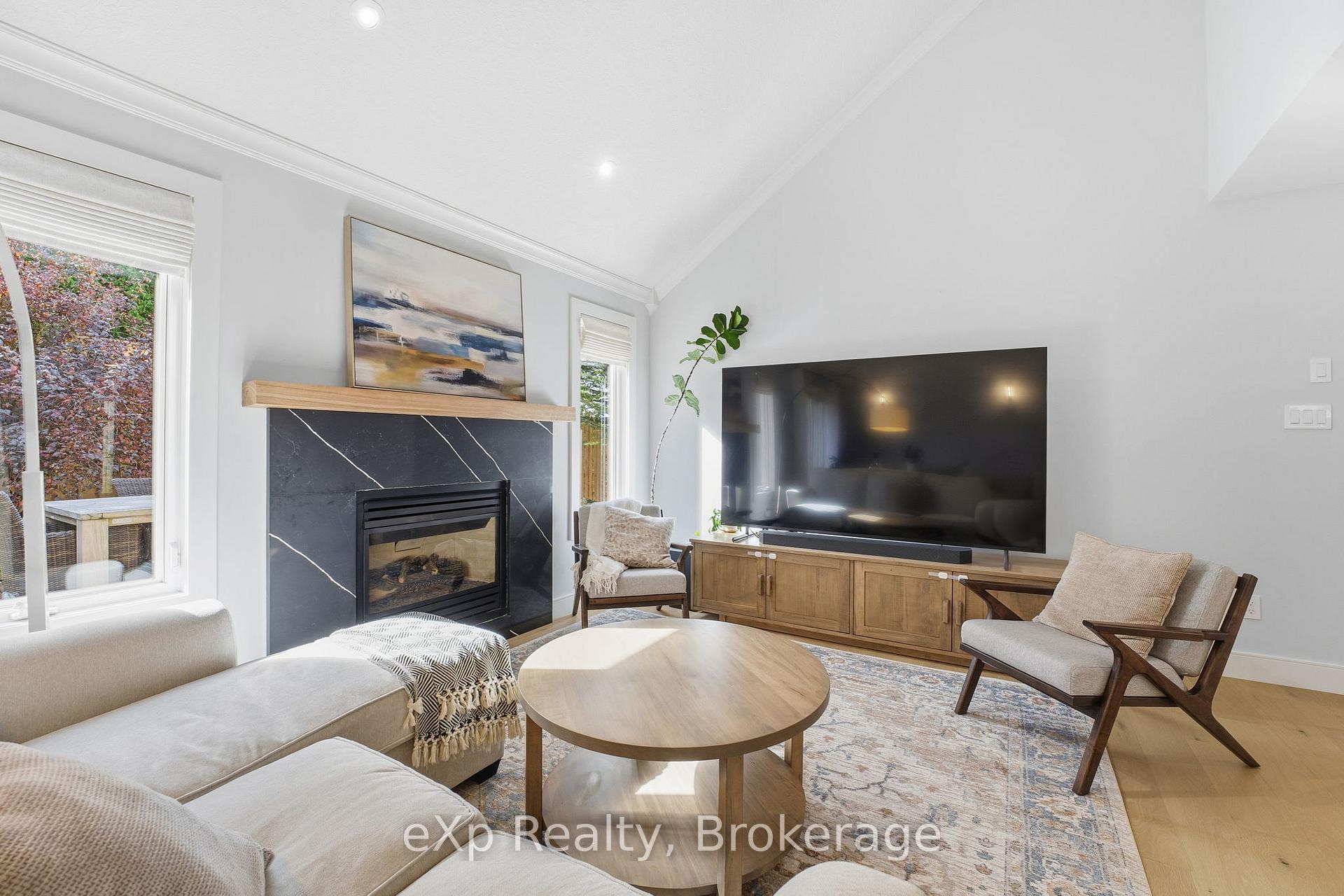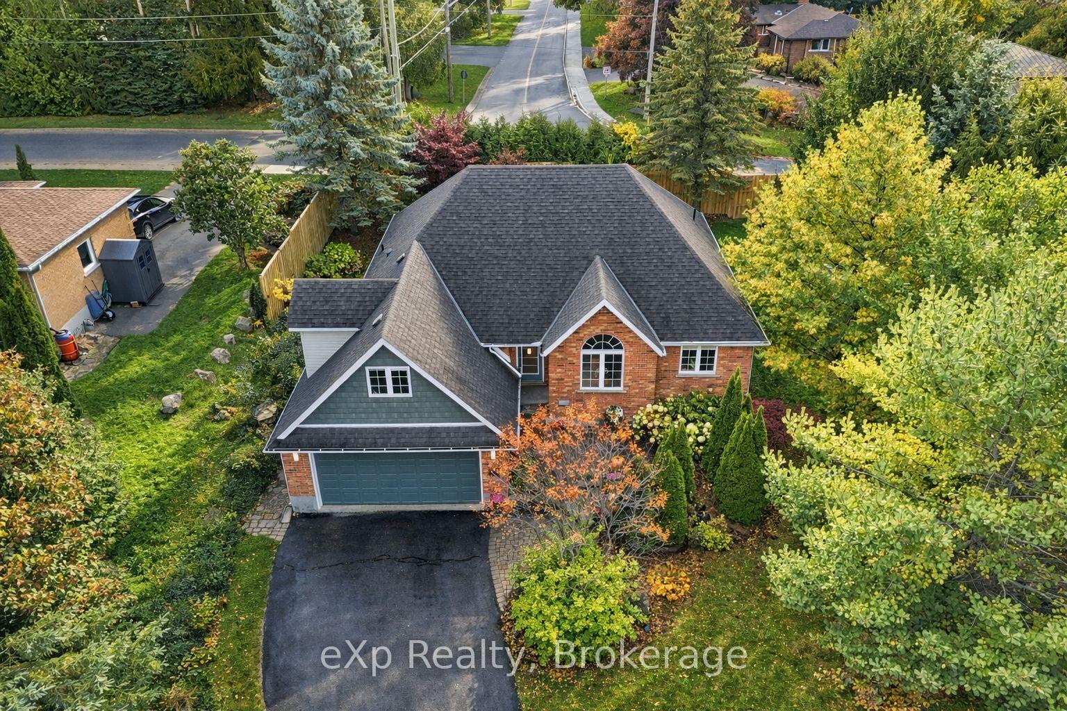 This elegant, fully upgraded raised bungaloft offers over 3,000 sq ft of finished living space, ideally situated on a quiet cul-de-sac in the desirable south end of Elora. Set on a private, mature lot with 108′ of frontage and surrounded by established trees, this home delivers the perfect blend of comfort, space, and location.The open-concept main floor features a modern kitchen with quartz countertops, wide-plank engineered hardwood flooring, and elevated ceilings, all anchored by a cozy gas fireplace (2021). The main level includes three spacious bedrooms, highlighted by a stunning primary suite complete with a 5-piece ensuite, soaker tub, and heated floors.The fully finished lower level offers exceptional versatility with two additional bedrooms, a 3-piece bathroom with heated floors, and generous space for entertaining, a home gym, or family retreat.A bright and functional loft provides endless possibilities, ideal as a sixth bedroom, home office, playroom, or creative space. Professionally landscaped in 2024, the backyard features a lush lawn, a spacious deck (2023), elegant flagstone pathways, custom fencing, and natural stone steps leading toward the pedestrian bridge and downtown. All of this within walking distance to scenic trails, shops, and the charm of downtown Elora.