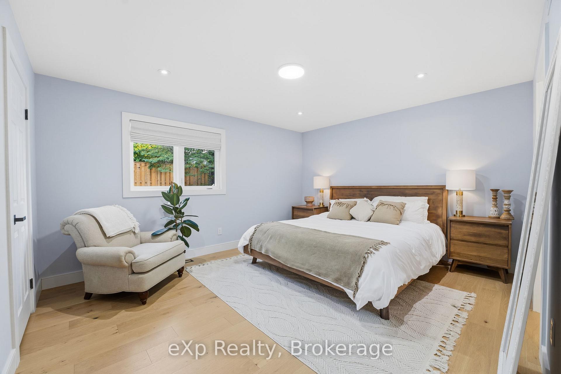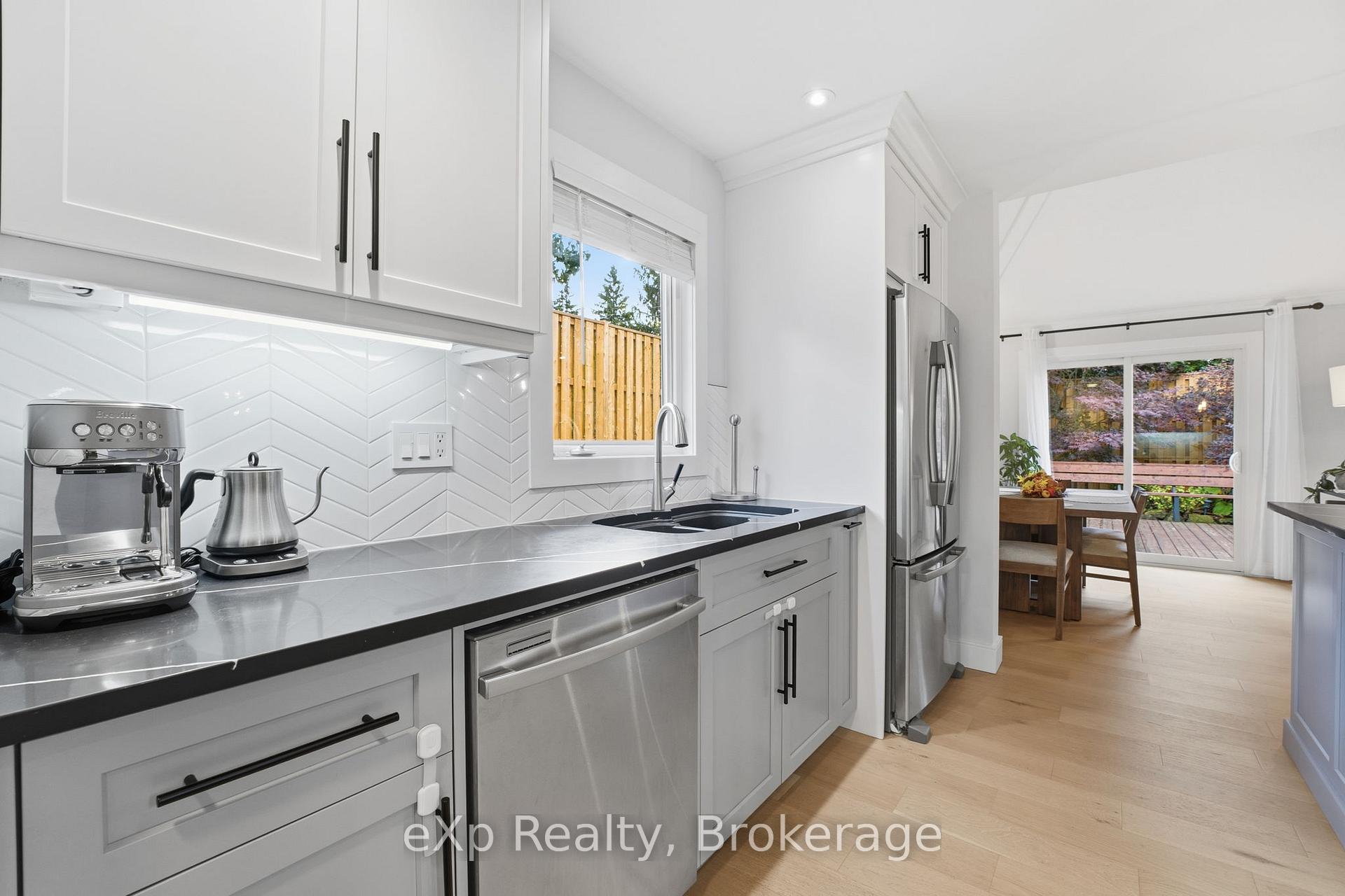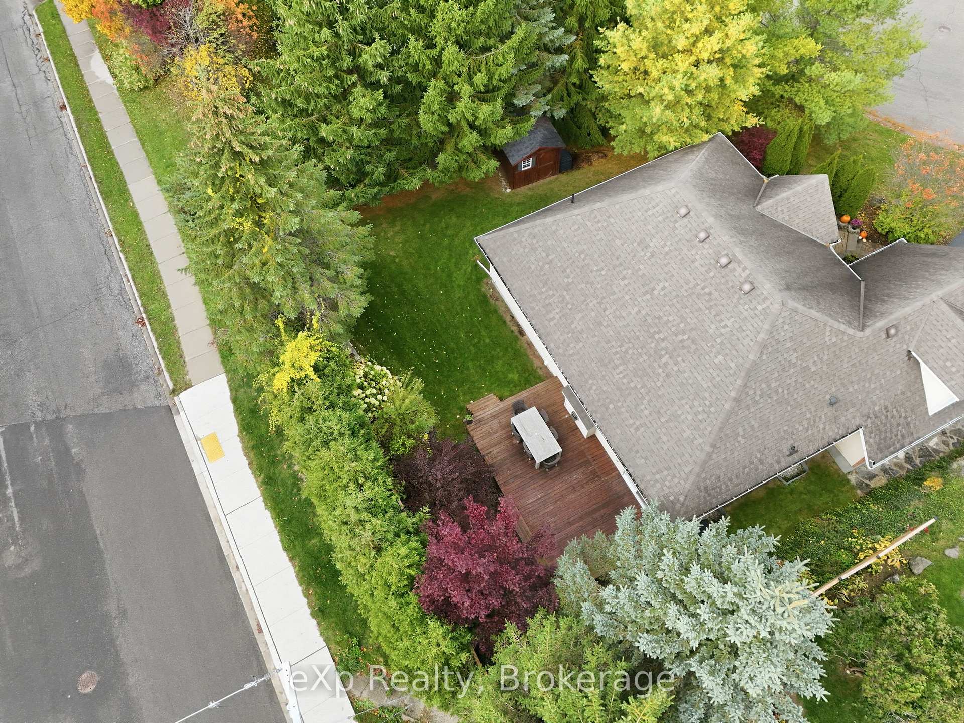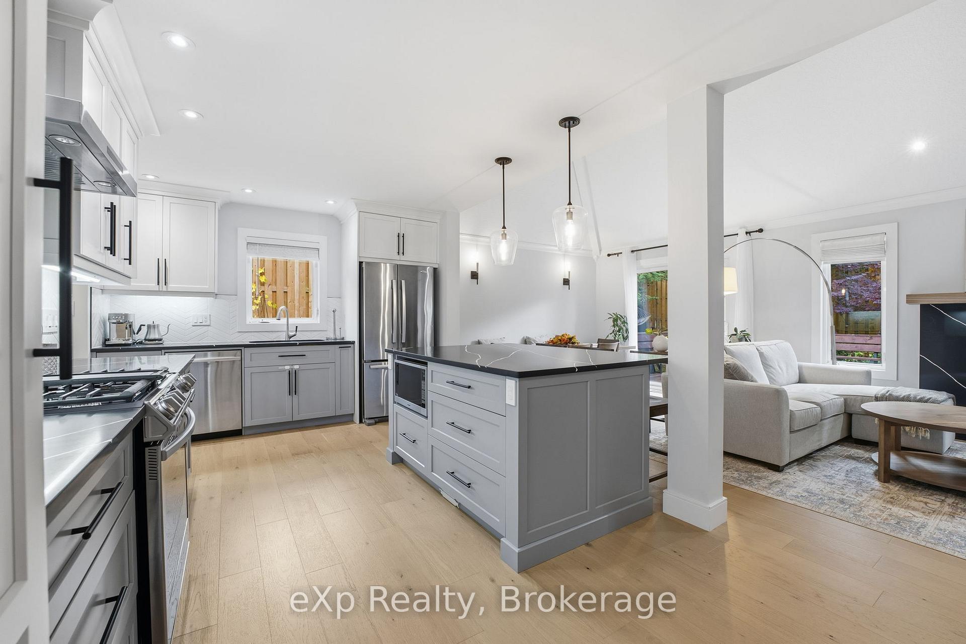 This elegant, fully upgraded raised bungaloft offers over 3,000 sq ft of finished living space, ideally situated on a quiet cul-de-sac in the desirable south end of Elora. Set on a private, mature lot with 108′ of frontage and surrounded by established trees, this home delivers the perfect blend of comfort, space, and location.The open-concept main floor features a modern kitchen with quartz countertops, wide-plank engineered hardwood flooring, and elevated ceilings, all anchored by a cozy gas fireplace (2021). The main level includes three spacious bedrooms, highlighted by a stunning primary suite complete with a 5-piece ensuite, soaker tub, and heated floors.The fully finished lower level offers exceptional versatility with two additional bedrooms, a 3-piece bathroom with heated floors, and generous space for entertaining, a home gym, or family retreat.A bright and functional loft provides endless possibilities, ideal as a sixth bedroom, home office, playroom, or creative space. Professionally landscaped in 2024, the backyard features a lush lawn, a spacious deck (2023), elegant flagstone pathways, custom fencing, and natural stone steps leading toward the pedestrian bridge and downtown. All of this within walking distance to scenic trails, shops, and the charm of downtown Elora.