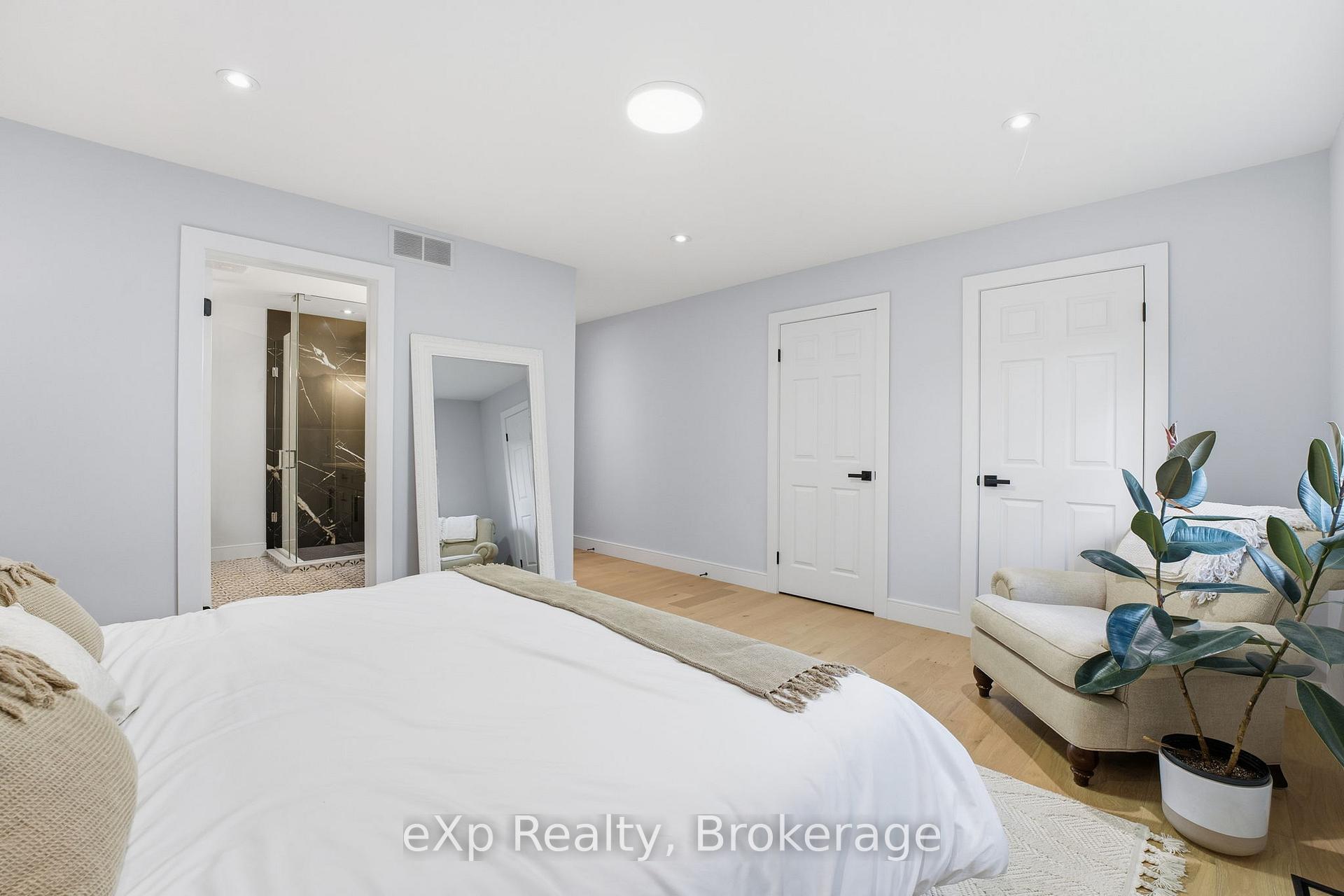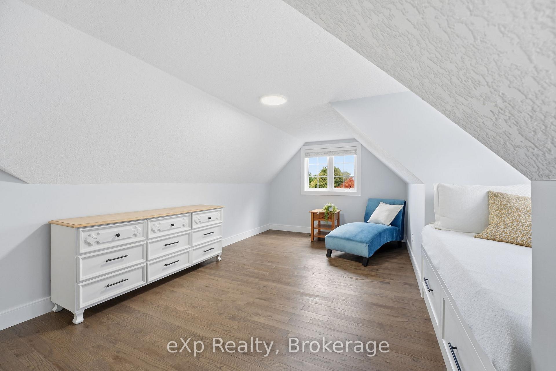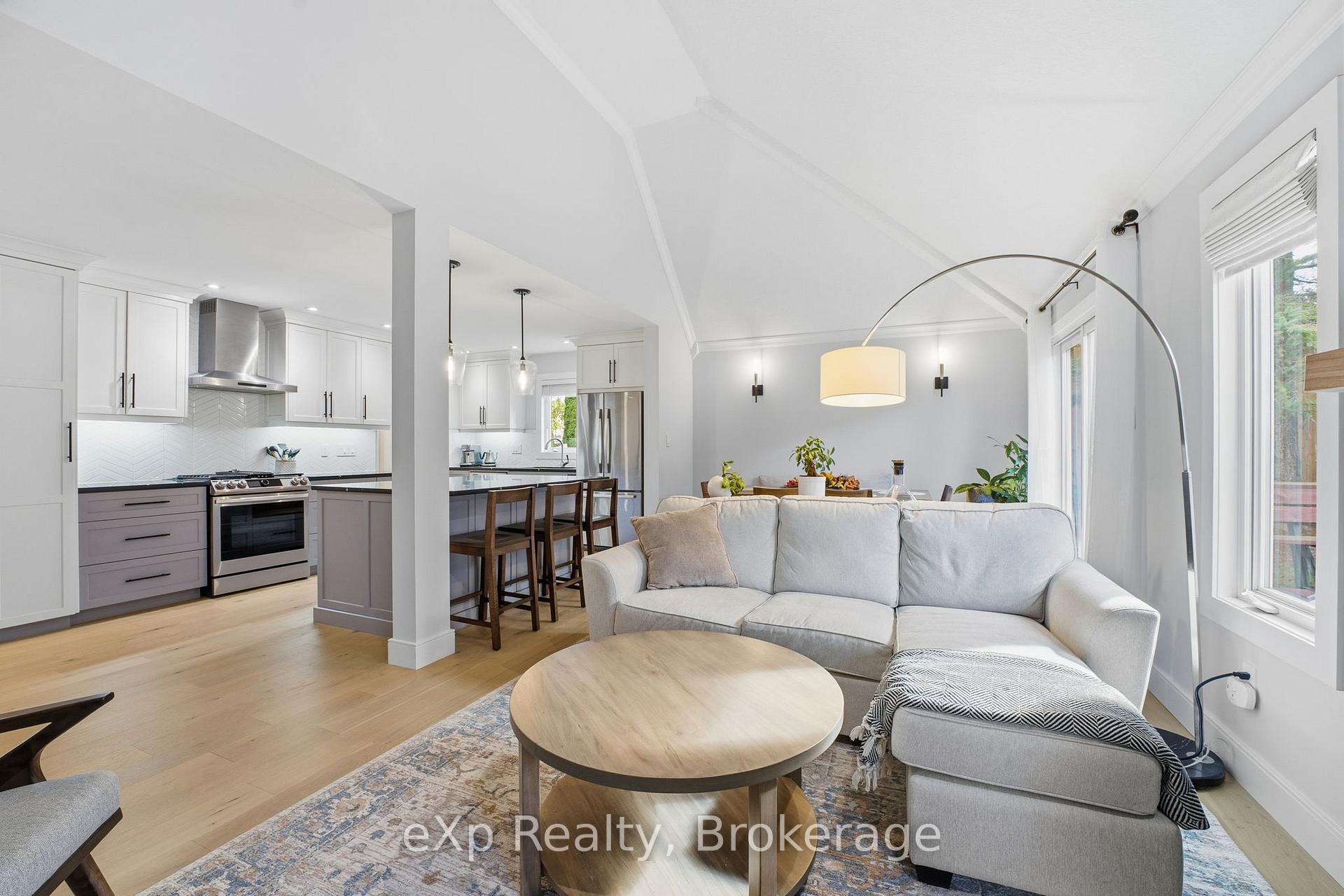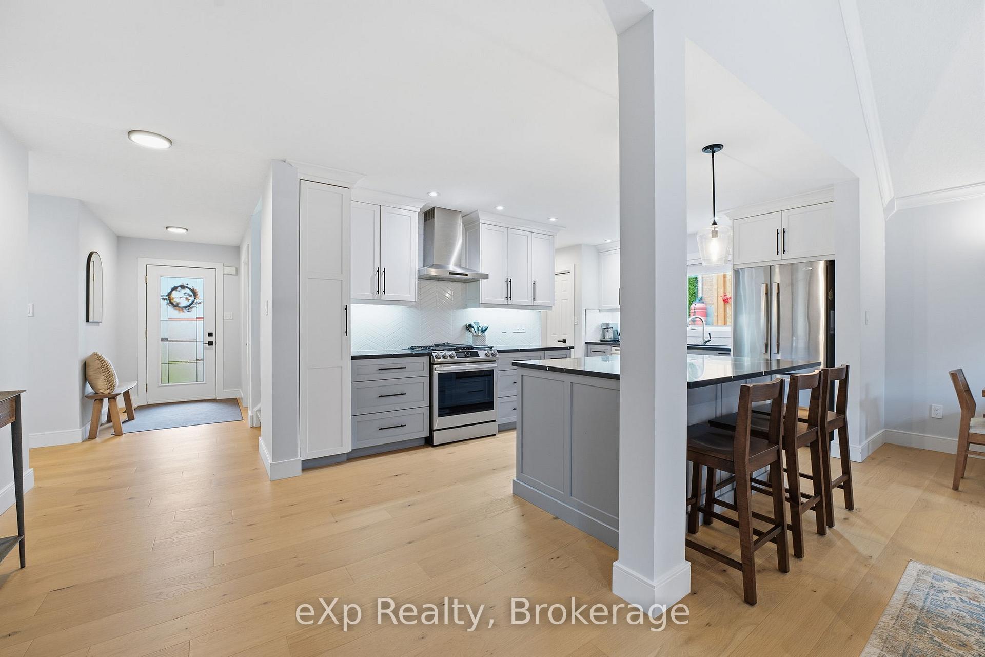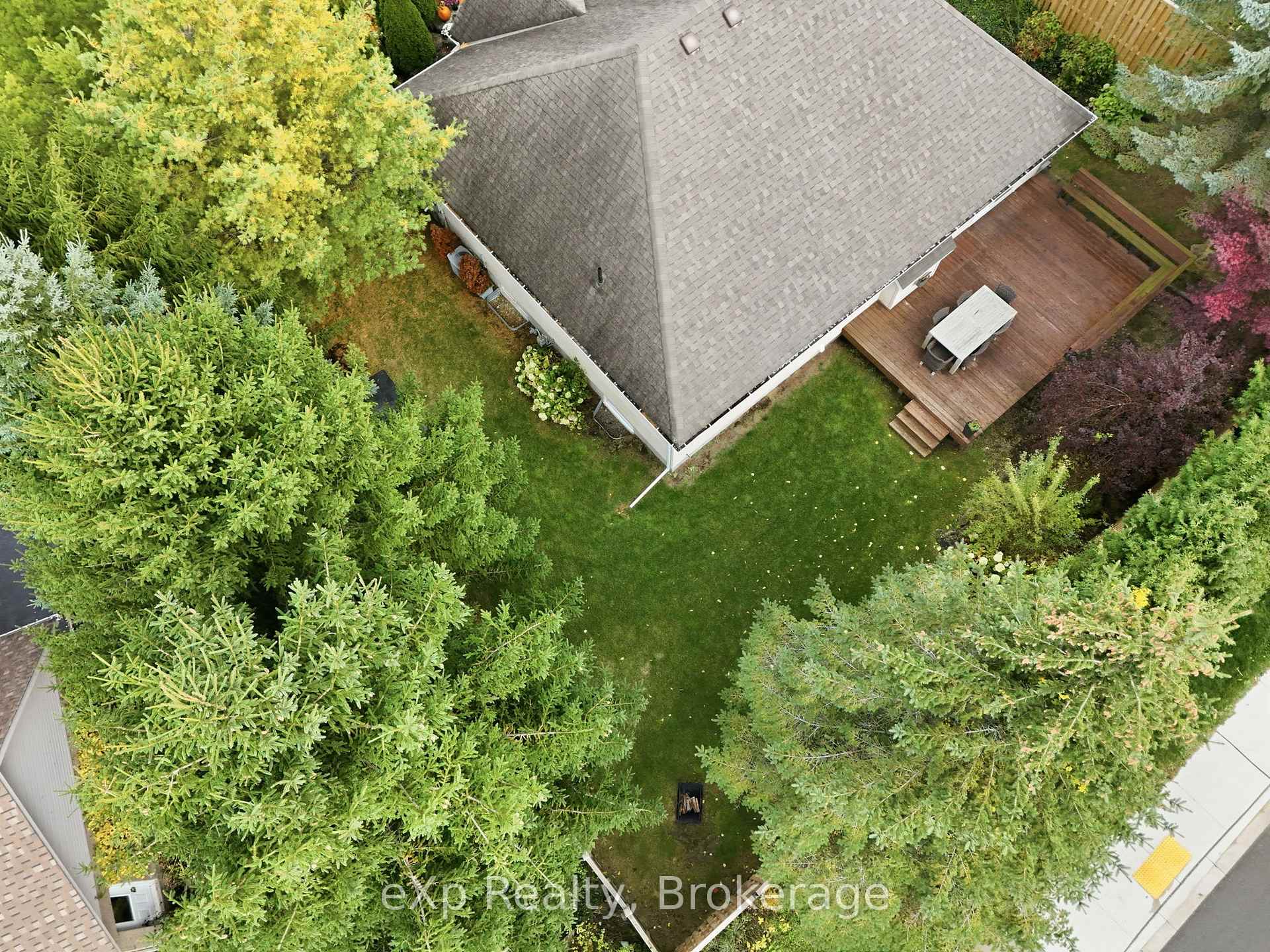 This elegant, fully upgraded raised bungaloft offers over 3,000 sq ft of finished living space, ideally situated on a quiet cul-de-sac in the desirable south end of Elora. Set on a private, mature lot with 108′ of frontage and surrounded by established trees, this home delivers the perfect blend of comfort, space, and location.The open-concept main floor features a modern kitchen with quartz countertops, wide-plank engineered hardwood flooring, and elevated ceilings, all anchored by a cozy gas fireplace (2021). The main level includes three spacious bedrooms, highlighted by a stunning primary suite complete with a 5-piece ensuite, soaker tub, and heated floors.The fully finished lower level offers exceptional versatility with two additional bedrooms, a 3-piece bathroom with heated floors, and generous space for entertaining, a home gym, or family retreat.A bright and functional loft provides endless possibilities, ideal as a sixth bedroom, home office, playroom, or creative space. Professionally landscaped in 2024, the backyard features a lush lawn, a spacious deck (2023), elegant flagstone pathways, custom fencing, and natural stone steps leading toward the pedestrian bridge and downtown. All of this within walking distance to scenic trails, shops, and the charm of downtown Elora.