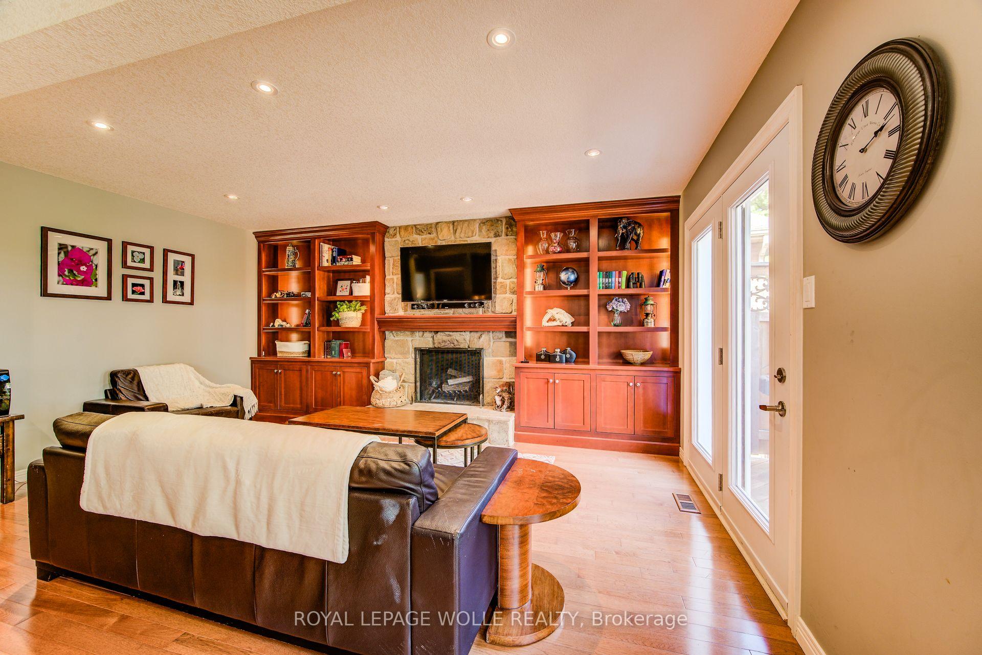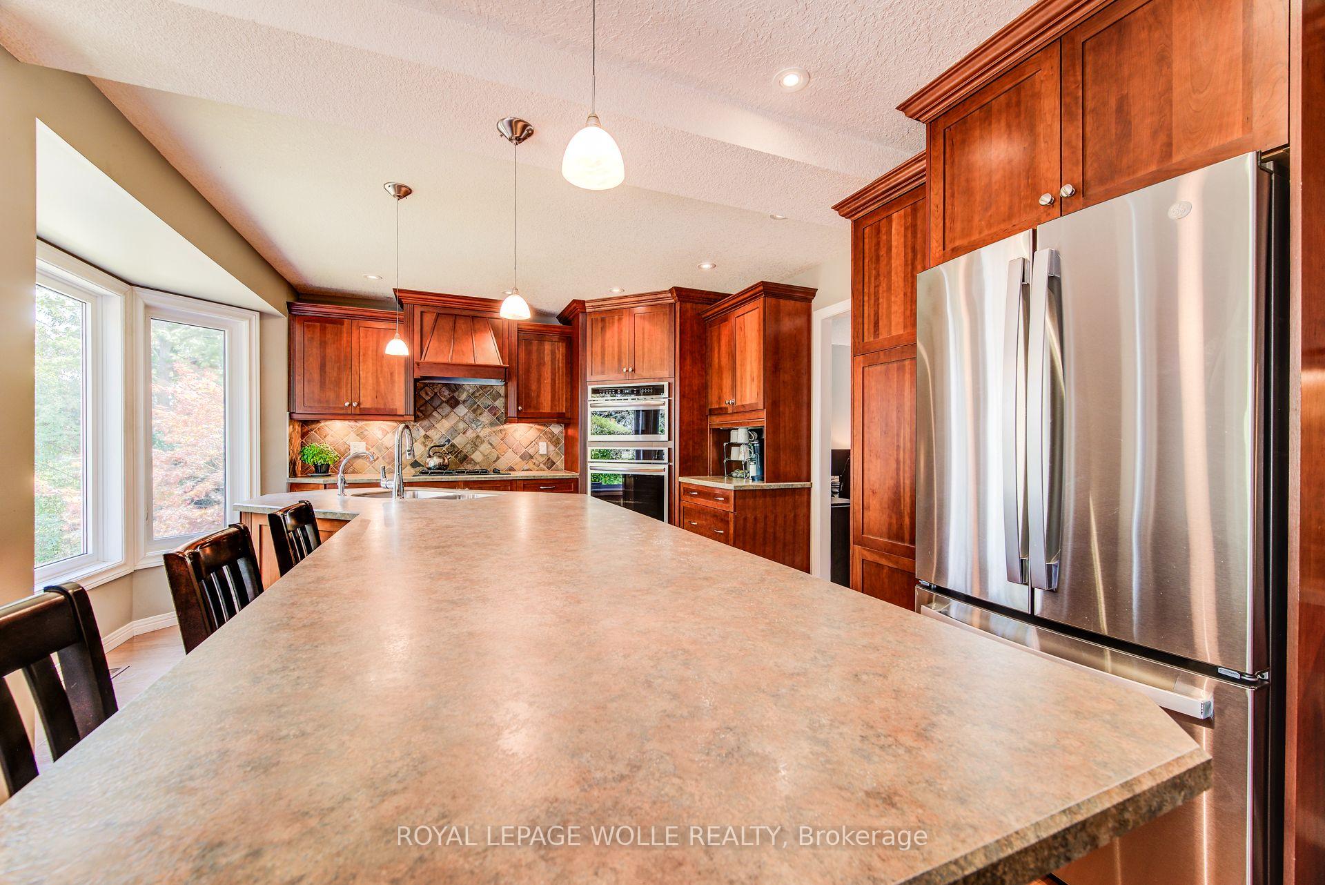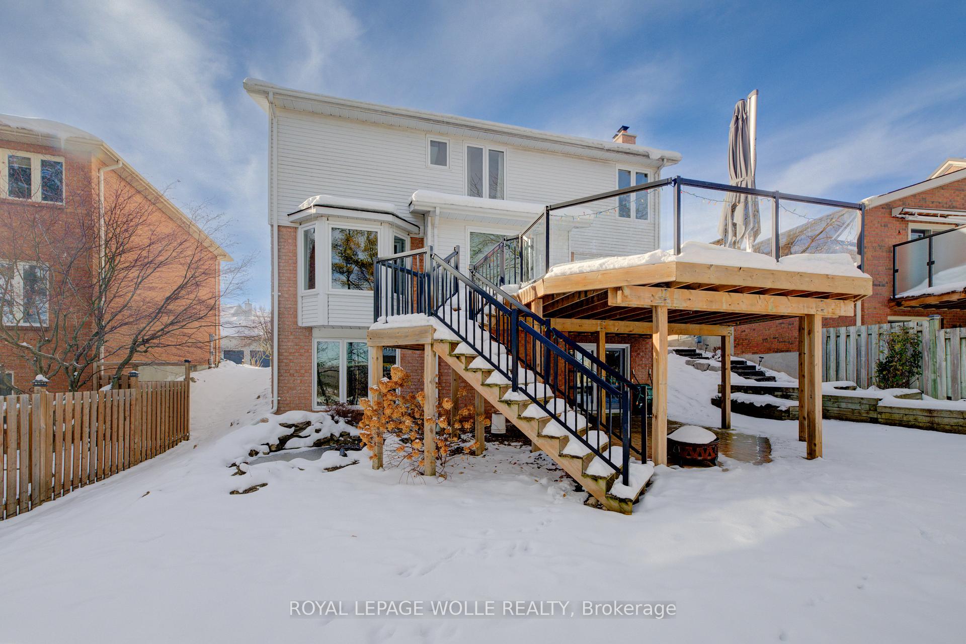 Prime, Chicopee Court Executive Home backing onto Nature, Walter Bean Trail! Welcome to this tastefully decorated home nestled on a quiet, family-friendly, choice court in Kitchener. This beautifully maintained property offers picturesque views of the mature treed greenbelt and the Grand River, with direct access to the Walter Bean Trail, making it a nature lover’s dream. Inside, you’ll find a renovated kitchen featuring high end cabinetry, built-ins, and gleaming hardwood floors, seamlessly connected to a spacious eat-in area and open-concept family room adorned with built in cabinetry. Step out from the family room with wood fireplace through French doors and onto the extra-large deck (six years young) with elegant glass panels, perfect for entertaining or relaxing while enjoying the tranquil surroundings. Upstairs, the oversized primary bedroom (20′ x 12′) serves as a luxurious retreat, complete with a modernized ensuite boasting a soaker jet tub, contemporary tiling and glass shower enclosure all beneath a skylight for the ultimate spa-like experience. Note primary bedroom’s spacious walk in closet featuring an organization system by California Closets. The finished walkout basement features oversized windows and French doors, offering abundant natural light and flexible living space. Wet bar and large, open rec room provide additional entertaining options. The home is professionally landscaped, enhancing its curb appeal and outdoor enjoyment. Note the shed in back yard – ideal for additional storage with mezzanine level perfect for children adventures. This is a rare opportunity to own a home that combines comfort, style, and stunning natural beauty in one of Kitchener’s most desirable neighbourhoods.