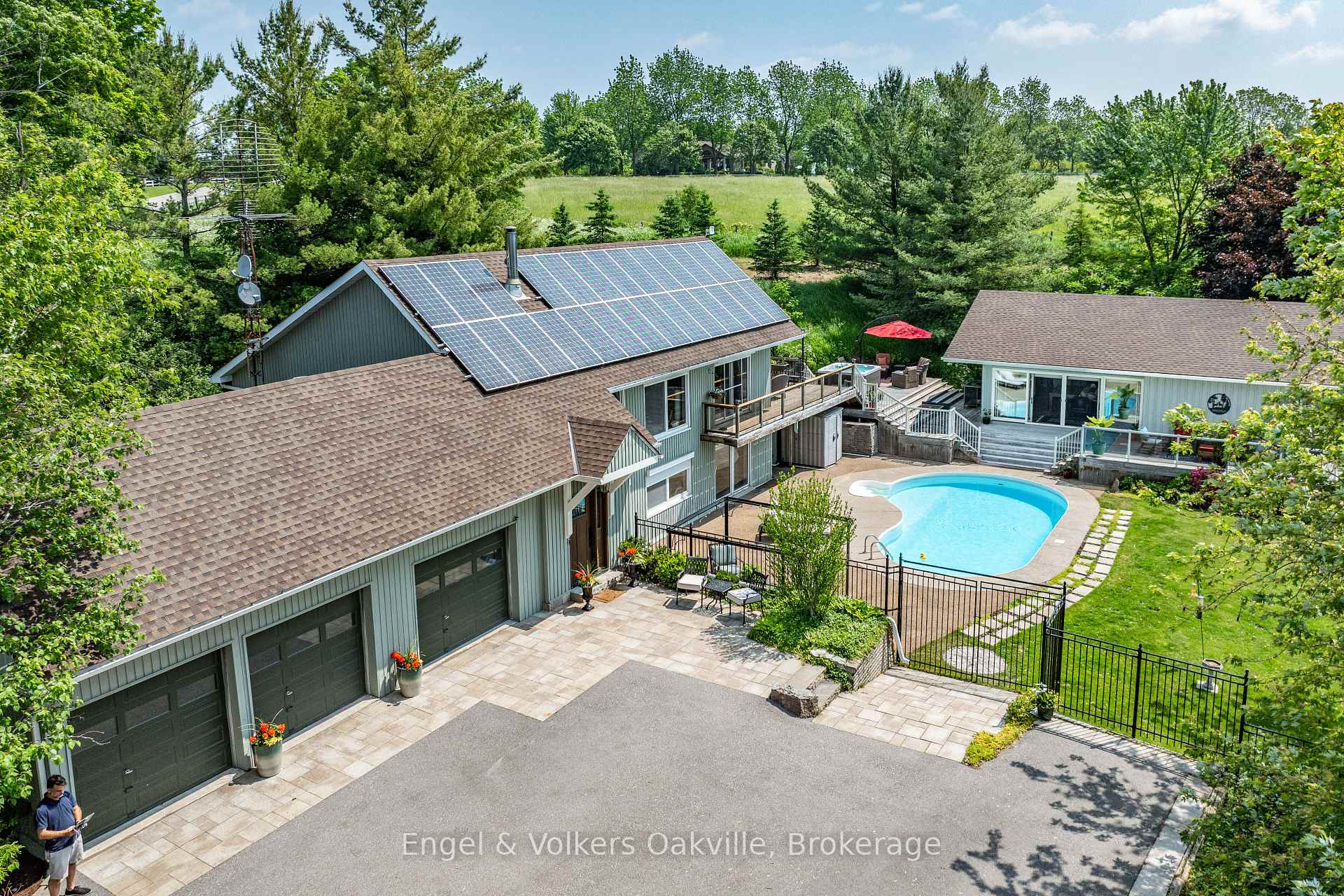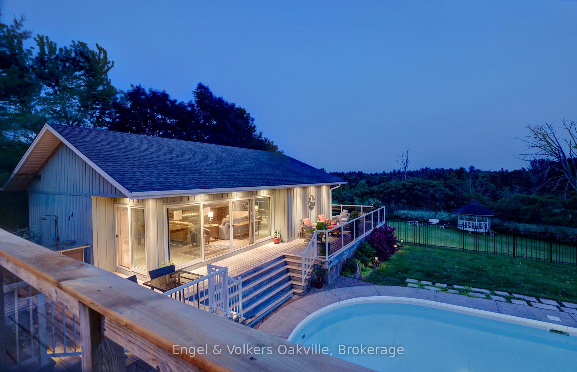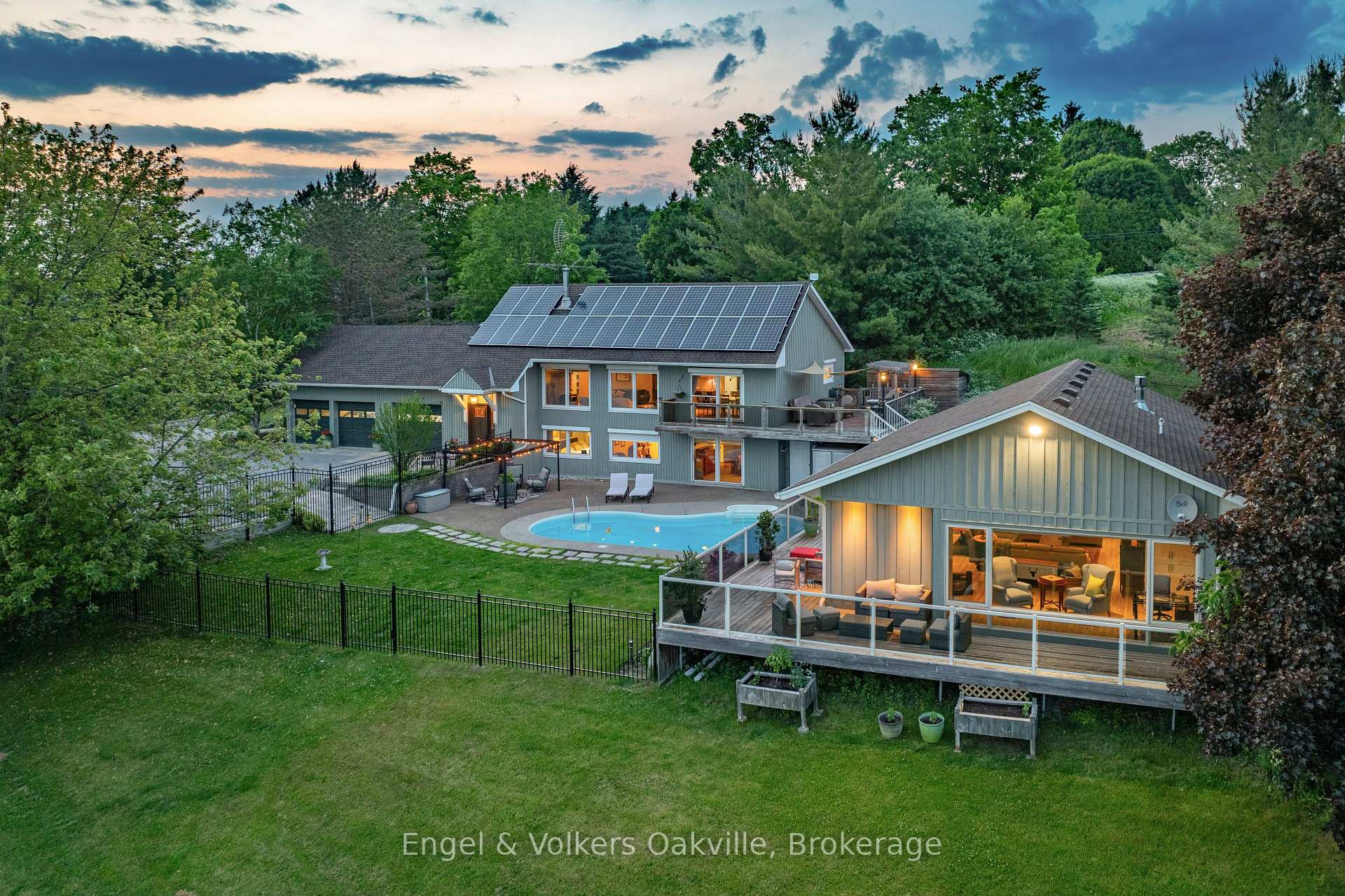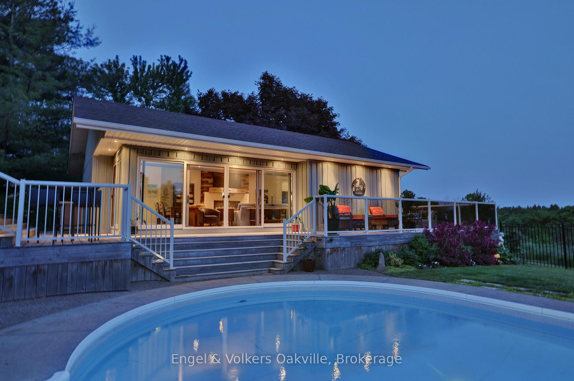 Experience country living on over 1 acre, just 40 min from Pearson Airport, with close proximity to the GTA & all amenities. This stunning 3 bed, 3 bath home + separate pool house with almost 3,700 sq ft of living space, offers panoramic southwestern exposure with spectacular elevated views & infinite countryside from oversized windows on all levels. Abundant natural light floods the open-concept top floor living & dining areas, creating a serene atmosphere year-round. The heart of the home is the expansive chefs kitchen. Ideal for entertaining; offering ample counters for food prep, a separate pantry for storage, & seamless flow for gatherings, both large & small. Want some quiet time, simply open the secret bookcase door & discover a sumptuous den to relax in, or watch your favourite movie. The above grade lower level provides flexibility with 3 bedrooms, 5 piece bath with soaker tub, walk-out to the inground pool from the primary bedroom, & generous storage spaces. Step outside the main house on any level & you will find extensive multi-level cedar decking & rubaroc patio poolside as you make your way to a newly built fully winterized pool/guest house with kitchenette, 3 piece bath & walkouts to hot-tub, pool & deck overlooking the gazebo & firepit. Whether you’re hosting summer soirées or enjoying cozy seclusion in winter, this property offers the ultimate in lifestyle & comfort. Don’t miss this rare opportunity.