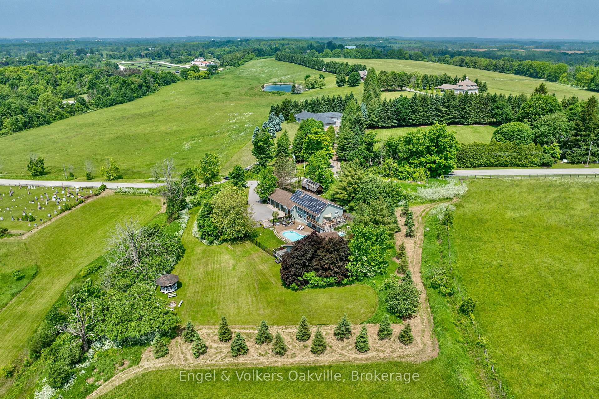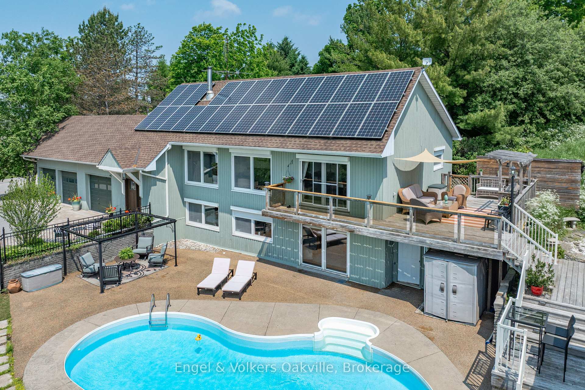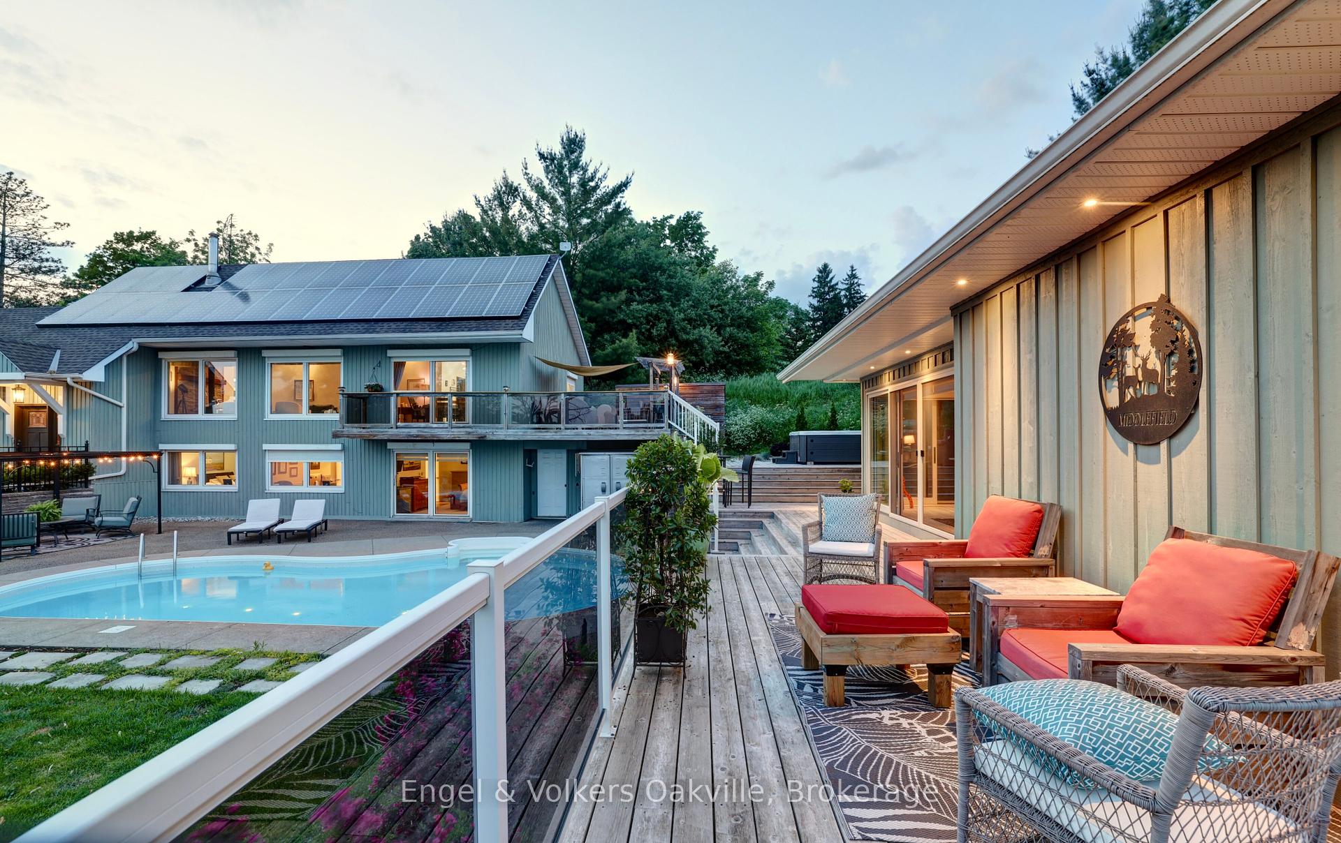 Experience country living on over 1 acre, just 40 min from Pearson Airport, with close proximity to the GTA & all amenities. This stunning 3 bed, 3 bath home + separate pool house with almost 3,700 sq ft of living space, offers panoramic southwestern exposure with spectacular elevated views & infinite countryside from oversized windows on all levels. Abundant natural light floods the open-concept top floor living & dining areas, creating a serene atmosphere year-round. The heart of the home is the expansive chefs kitchen. Ideal for entertaining; offering ample counters for food prep, a separate pantry for storage, & seamless flow for gatherings, both large & small. Want some quiet time, simply open the secret bookcase door & discover a sumptuous den to relax in, or watch your favourite movie. The above grade lower level provides flexibility with 3 bedrooms, 5 piece bath with soaker tub, walk-out to the inground pool from the primary bedroom, & generous storage spaces. Step outside the main house on any level & you will find extensive multi-level cedar decking & rubaroc patio poolside as you make your way to a newly built fully winterized pool/guest house with kitchenette, 3 piece bath & walkouts to hot-tub, pool & deck overlooking the gazebo & firepit. Whether you’re hosting summer soirées or enjoying cozy seclusion in winter, this property offers the ultimate in lifestyle & comfort. Don’t miss this rare opportunity.