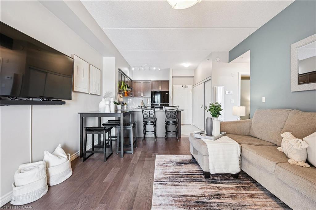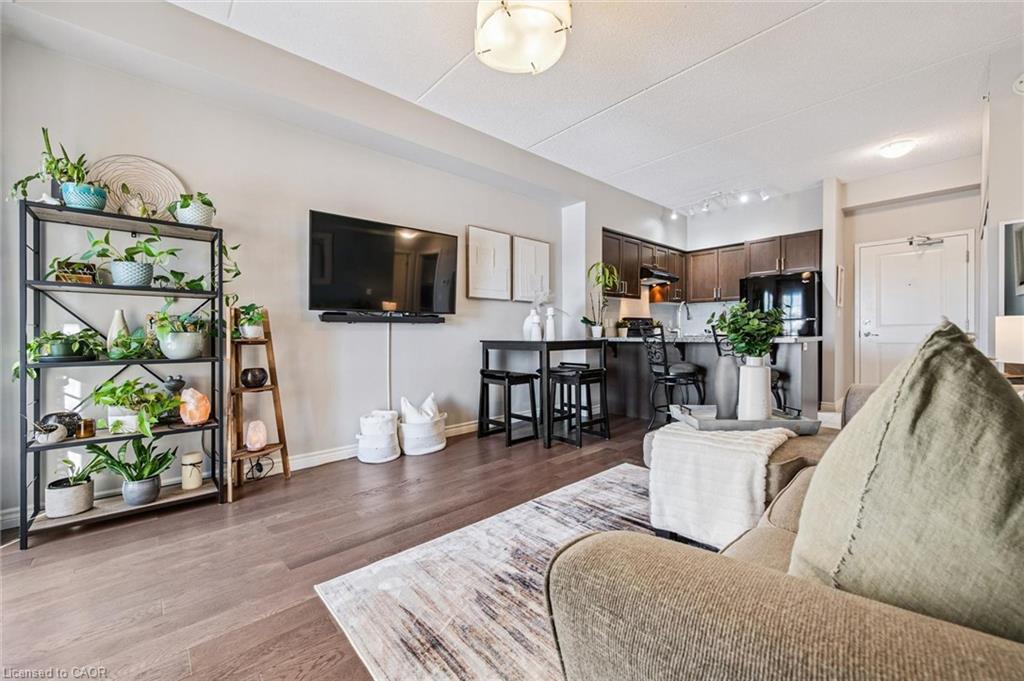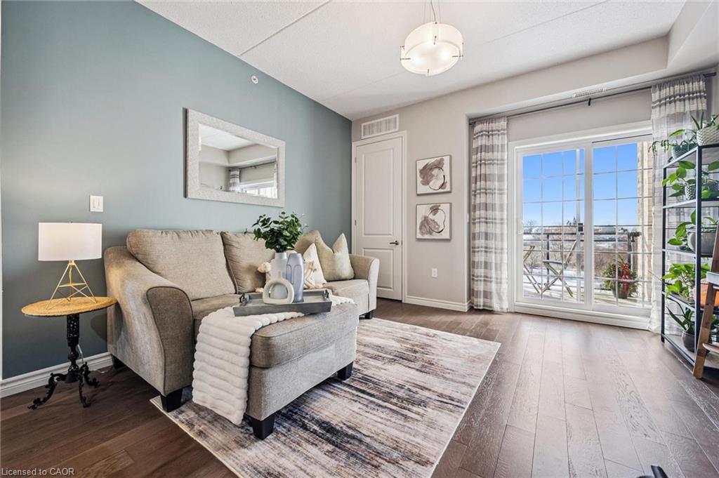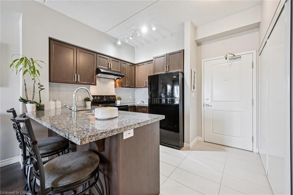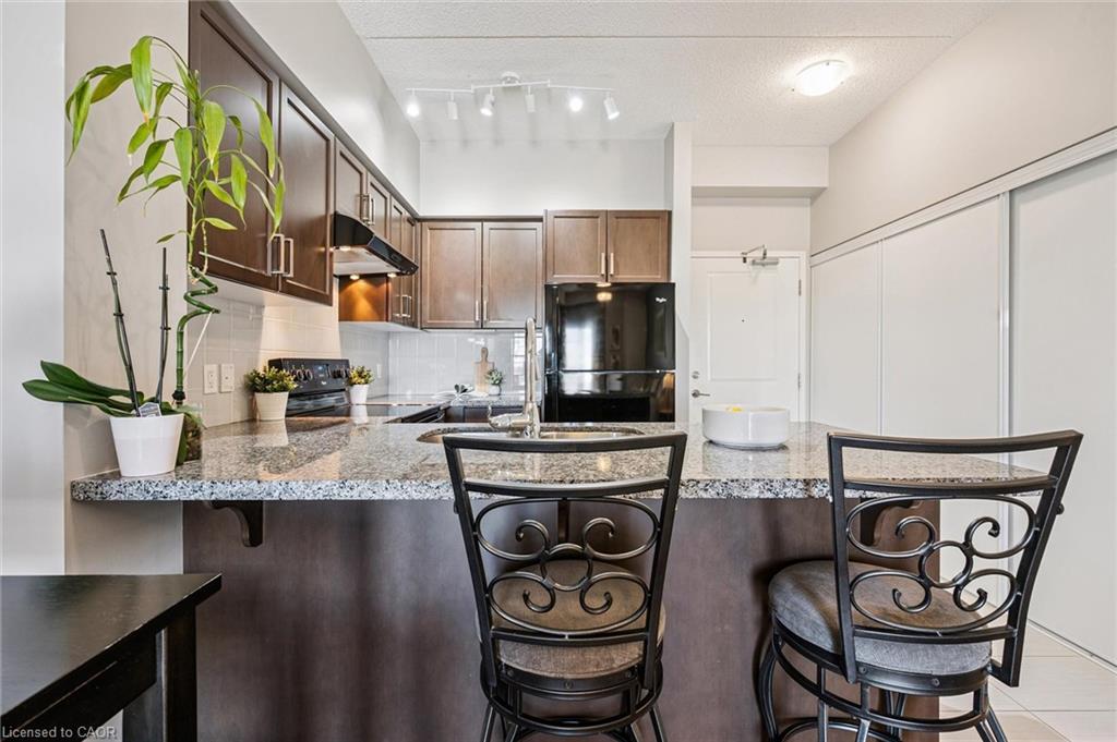 Welcome to this stunning and meticulously maintained one bedroom plus den condo in Guelph’s sought-after south end, complete with a dedicated parking space and a convenient storage locker located on the same floor. This sunlit unit boasts 9 ft ceilings, oversized windows, and tastefully updated hardwood flooring in the living area and carpet in the bedroom creating a bright and welcoming atmosphere. The open concept layout is flooded with natural light, making the space feel airy and spacious. The versatile den offers endless possibilities as a home office, study, or guest room, catering to your specific needs. The modern kitchen offers plenty of space and is fitted with granite countertops, a breakfast bar, updated appliances, backsplash, and seamless access to the stackable laundry closet. Enjoy your morning coffee or unwind after a long day on the private balcony that overlooks serene green space, providing a peaceful retreat right at home. The prime location is unbeatable, just minutes away from the University of Guelph, Stone Road Mall, grocery stores, restaurants, and the bus station, with easy access to the 401 for commuters. Whether you’re a first-time buyer, downsizing, or investing, this well-appointed condo offers a fantastic opportunity in a highly desirable south-end location, with every convenience at your fingertips. Don’t miss your chance to call this beautiful condo your new home!